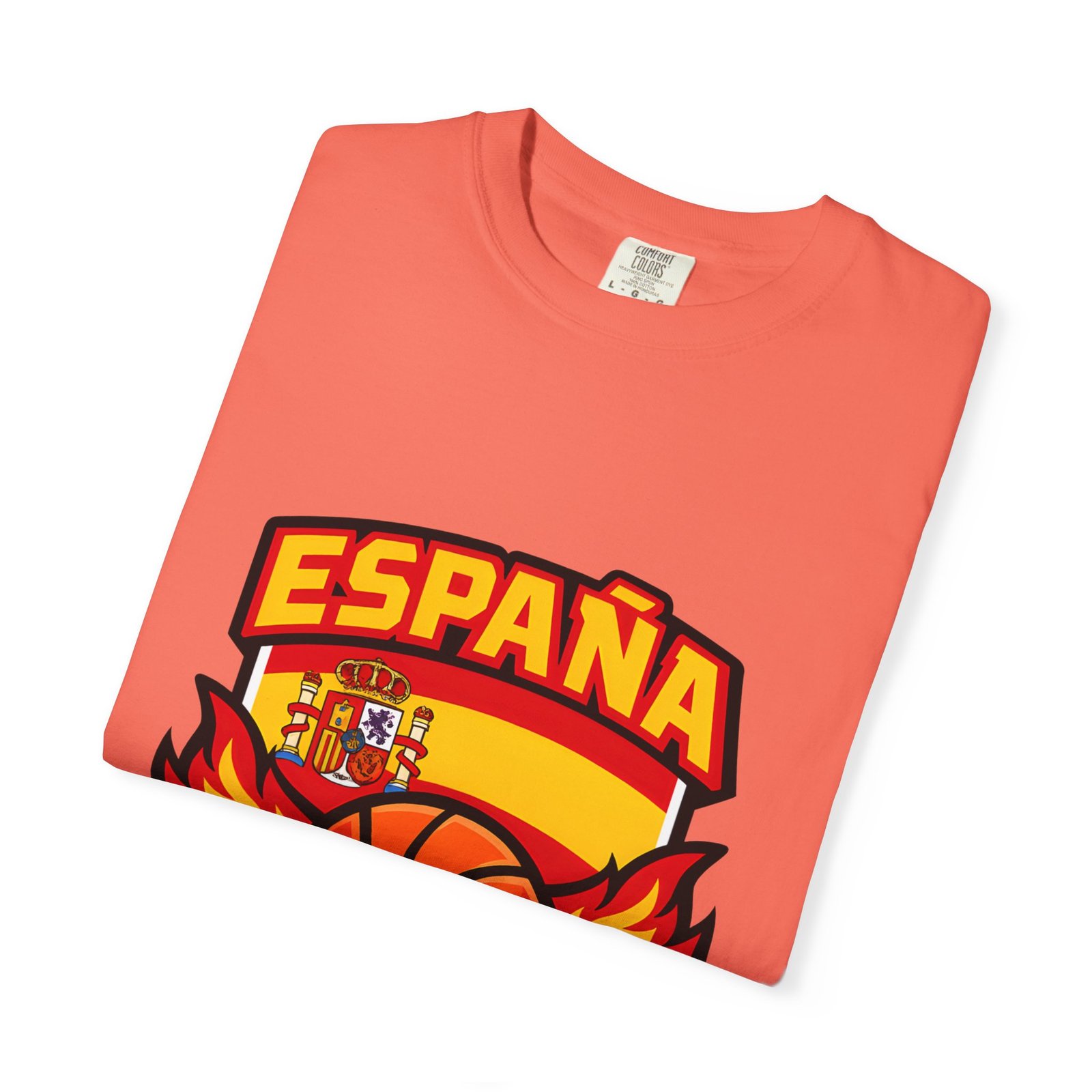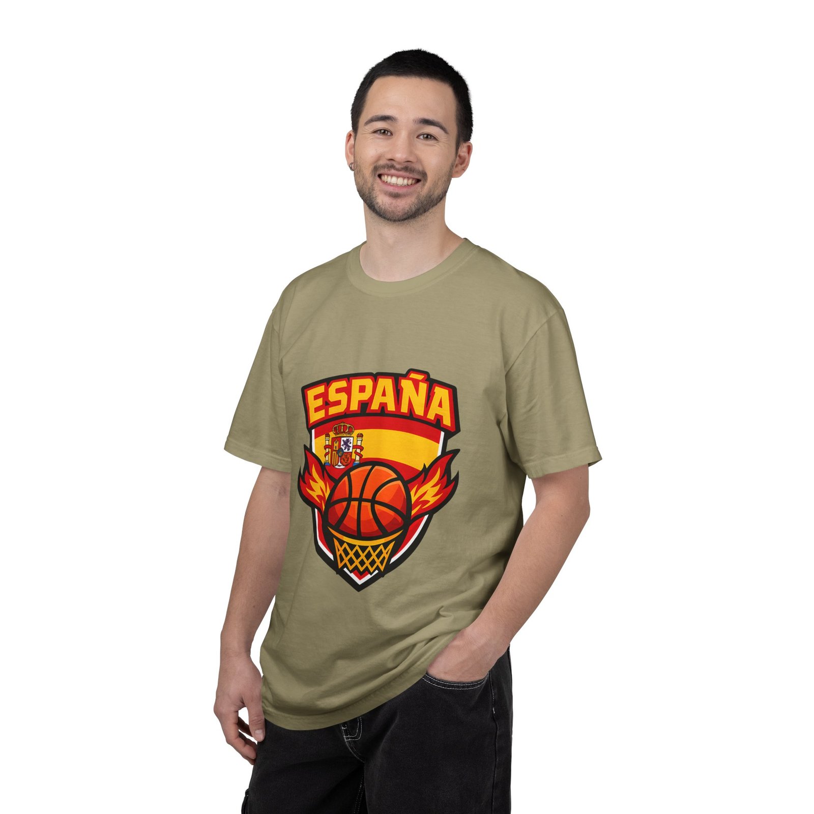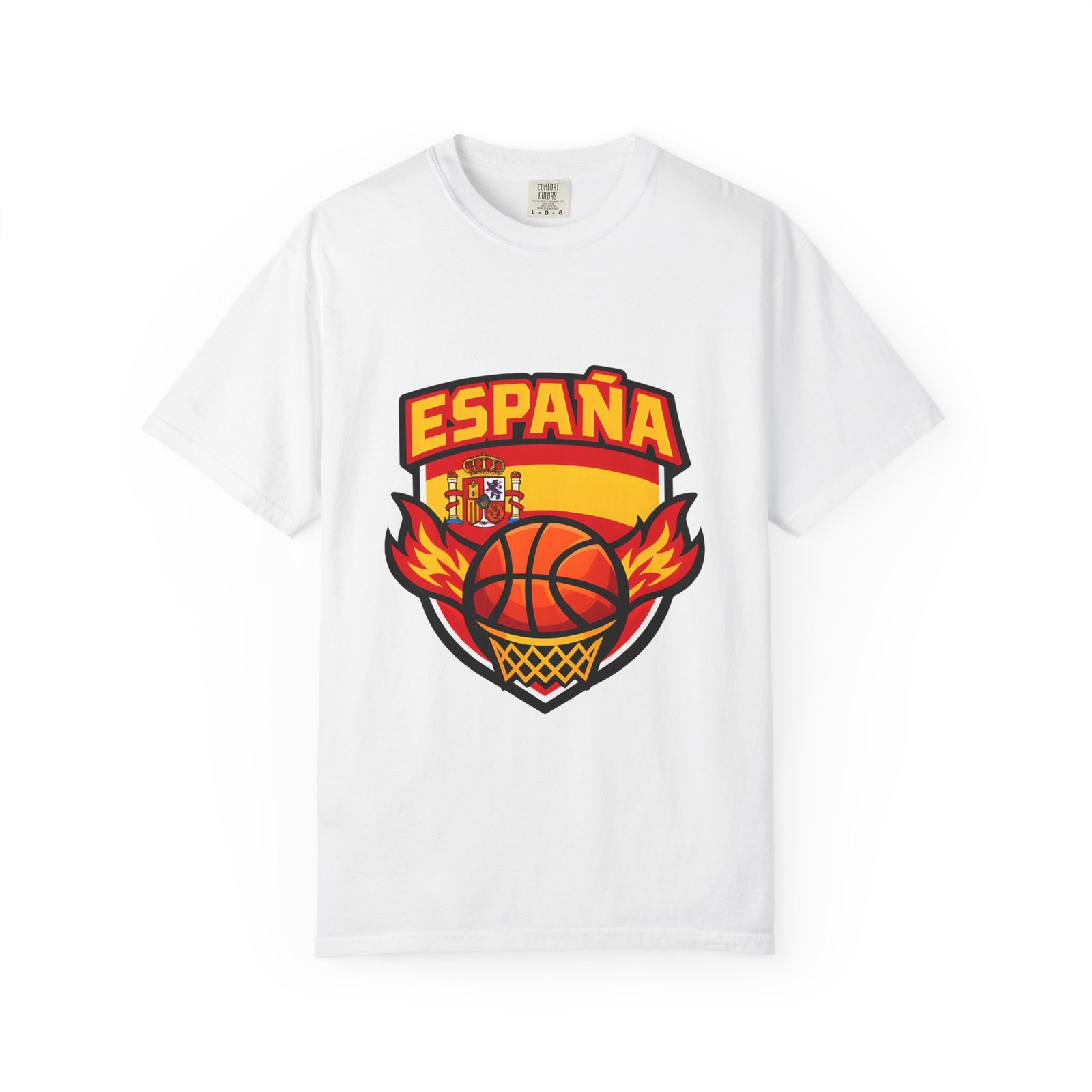 This garment-dyed tee brings warm, lived-in color and a bold Spanish basketball emblem to everyday wear. The heavy, 6.1 oz cotton feels substantial and soft after dyeing, so the shirt drapes with a relaxed, broken-in comfort that welcomes hours on the court, at a rally, or cheering from the stands. The fiery basketball crest and “España” banner read loud and proud, adding sporty energy to a casual wardrobe. Sizes run S–4XL and the tubular knit means clean lines with no side seams — a simple silhouette that showcases the graphic front and ages beautifully with wash after wash. Wear it to watch a match, for pickup games, or layered under a jacket when the evening cools; it’s built to feel like an old favorite from day one.