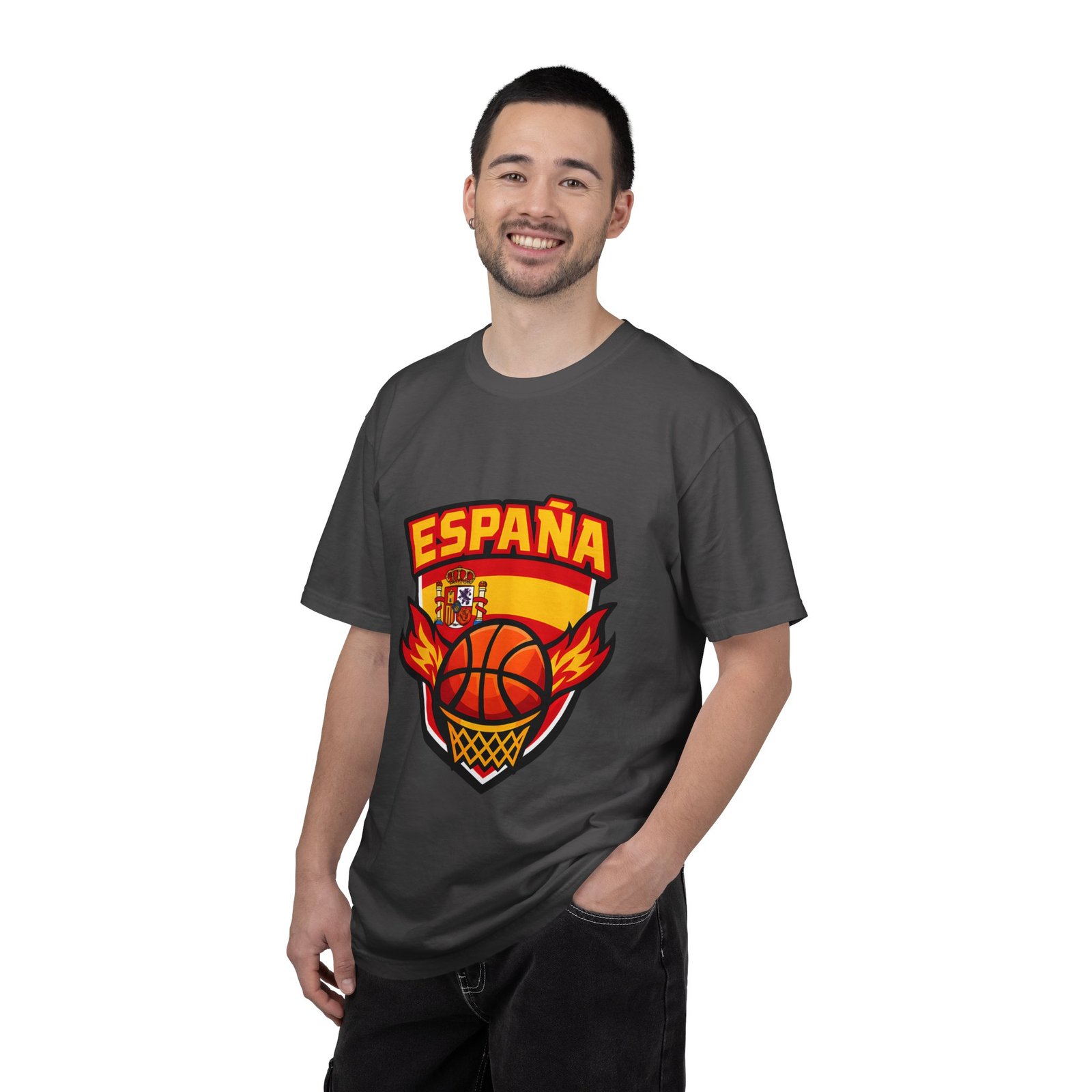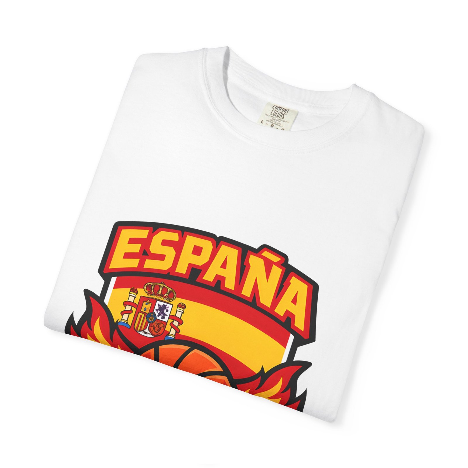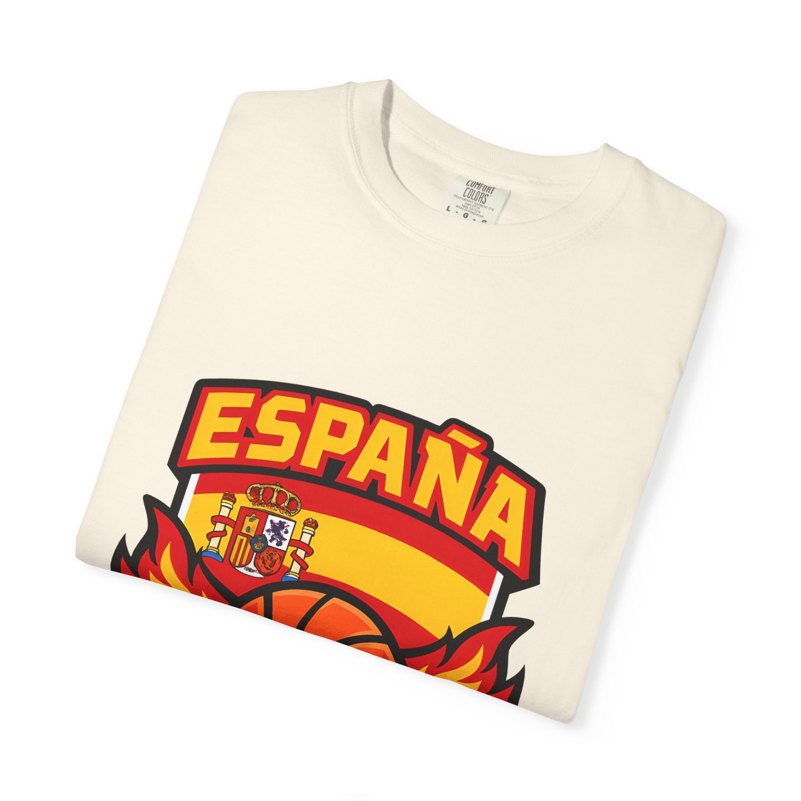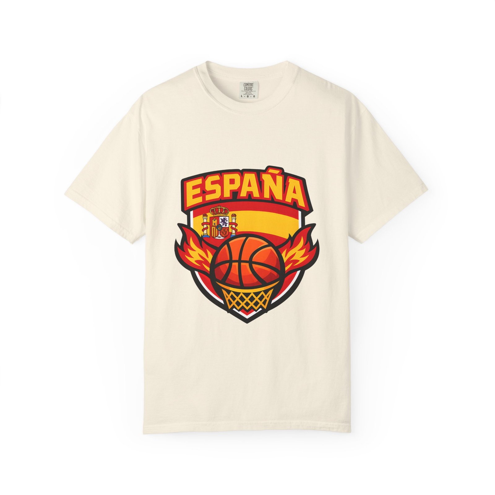 This garment-dyed tee brings warm, lived-in color and a bold Spanish basketball emblem to everyday wear. The heavy, 6.1 oz cotton feels substantial and soft after dyeing, so the shirt drapes with a relaxed, broken-in comfort that welcomes hours on the court, at a rally, or cheering from the stands. The fiery basketball crest and “España” banner read loud and proud, adding sporty energy to a casual wardrobe. Sizes run S–4XL and the tubular knit means clean lines with no side seams — a simple silhouette that showcases the graphic front and ages beautifully with wash after wash. Wear it to watch a match, for pickup games, or layered under a jacket when the evening cools; it’s built to feel like an old favorite from day one.