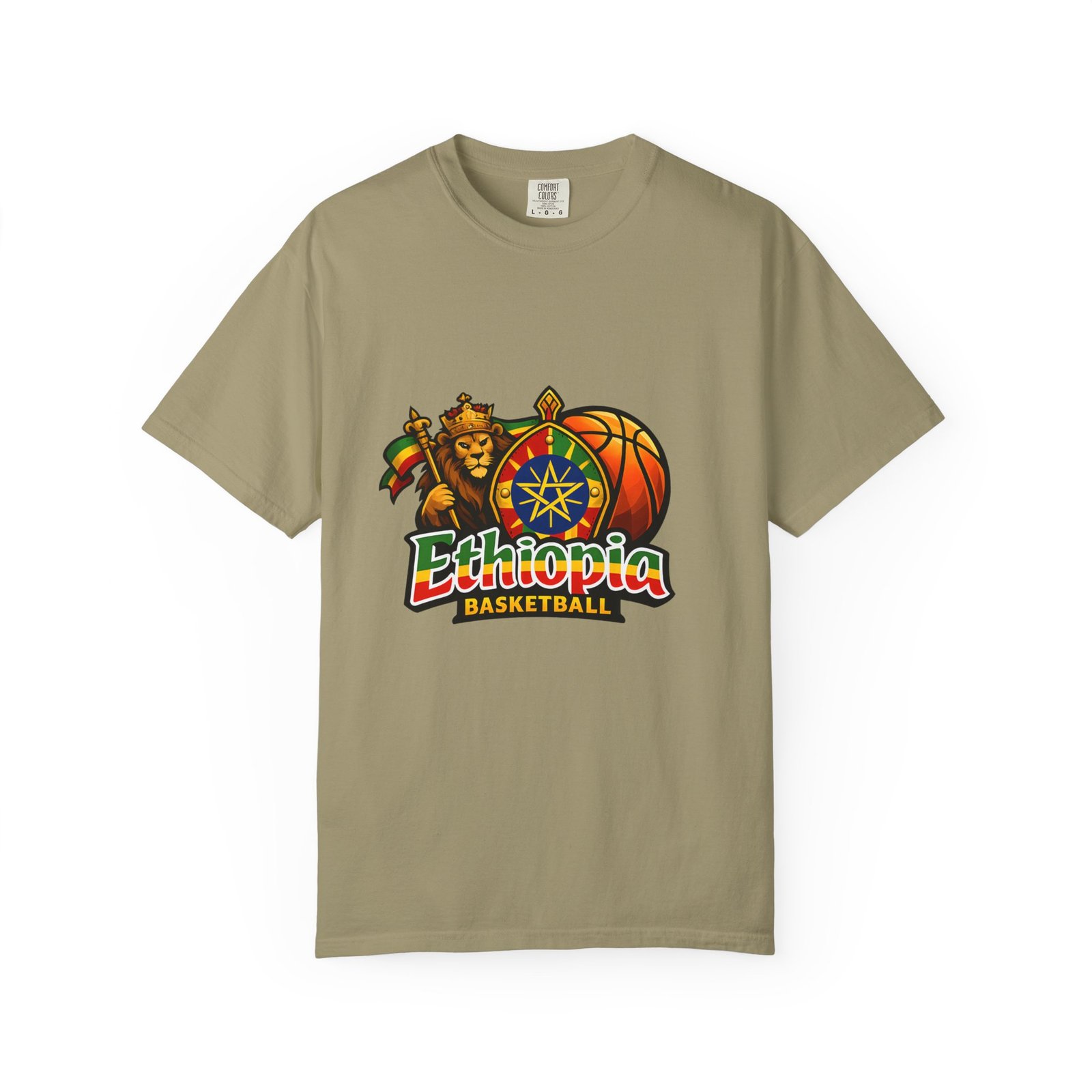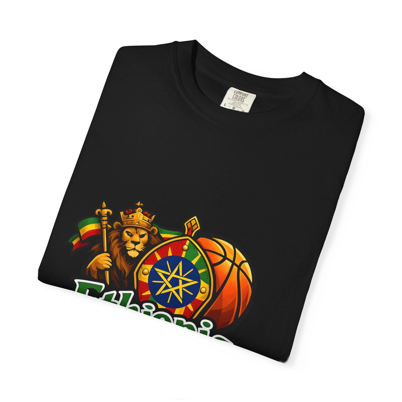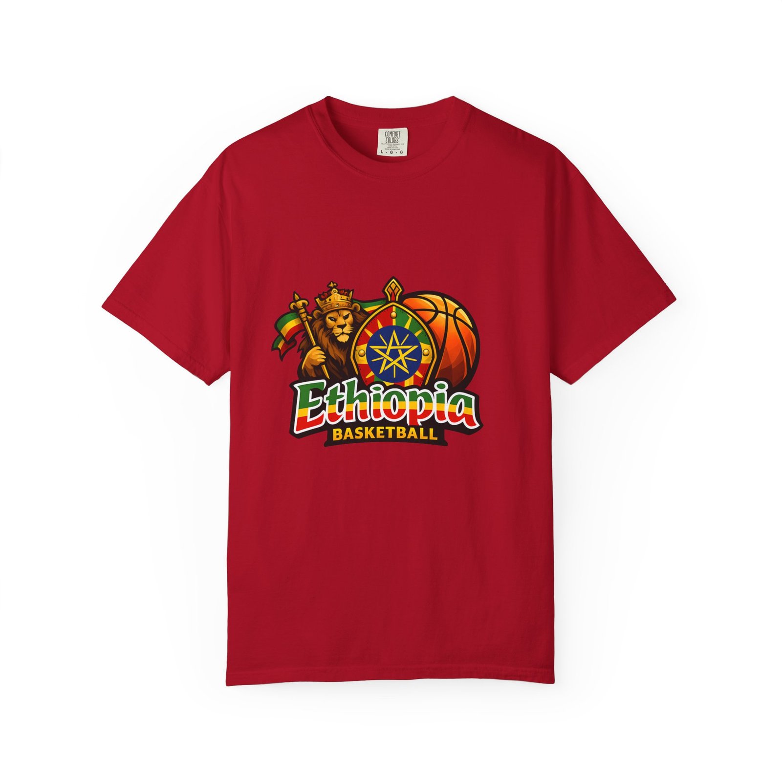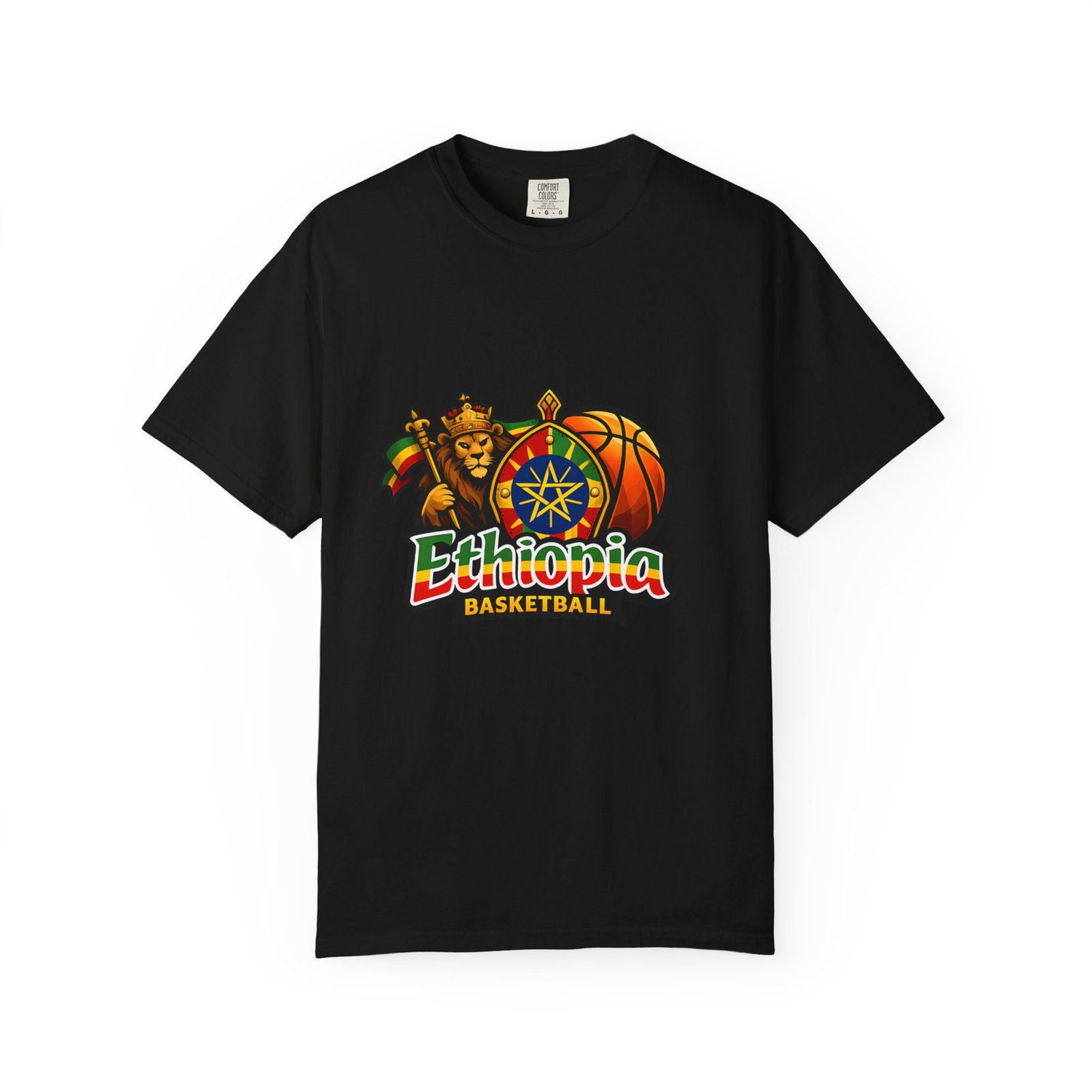 This heavyweight garment-dyed tee brings a warm, lived-in feel to everyday wear while celebrating Ethiopian basketball spirit. The soft, washed cotton drapes with relaxed ease, and the vibrant chest artwork — a lion, basketball and Ethiopian emblem in bold Rasta tones — makes it feel like you’re carrying a bit of home and the court with you. It’s the kind of shirt you reach for on practice days, neighborhood pick-up games, or when you want to rep cultural pride at a community event. The muted, vintage-like color of the fabric pairs with the saturated print to create an authentic, timeworn look that only improves with wear. Durable stitching and a roomy cut let you move freely while staying comfortable through long days and active nights.