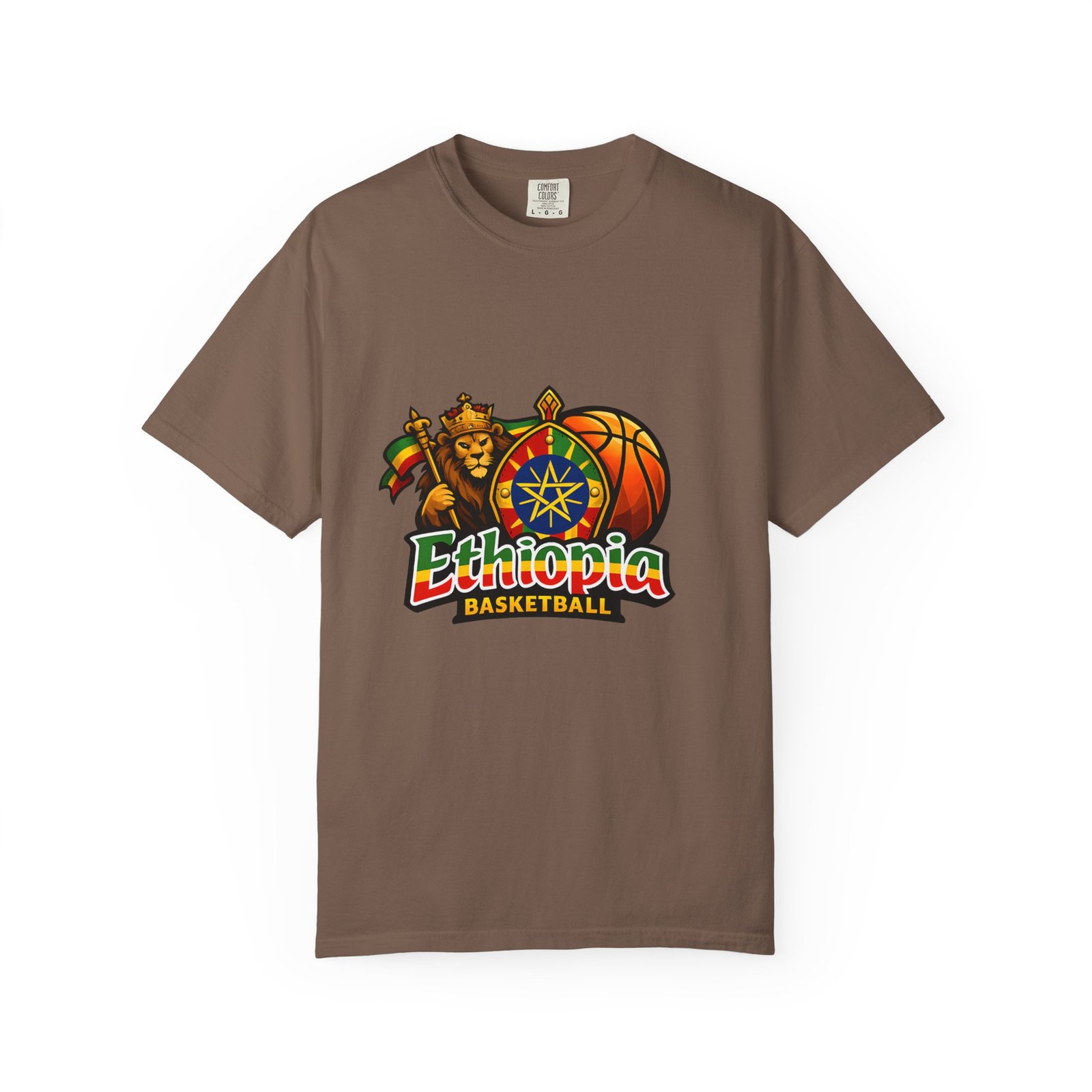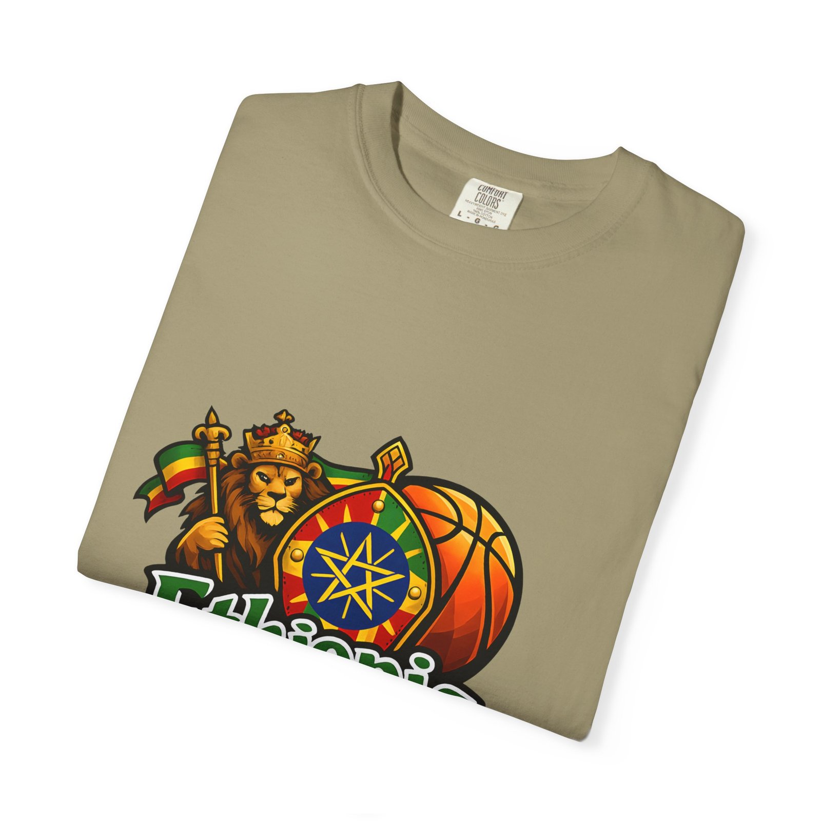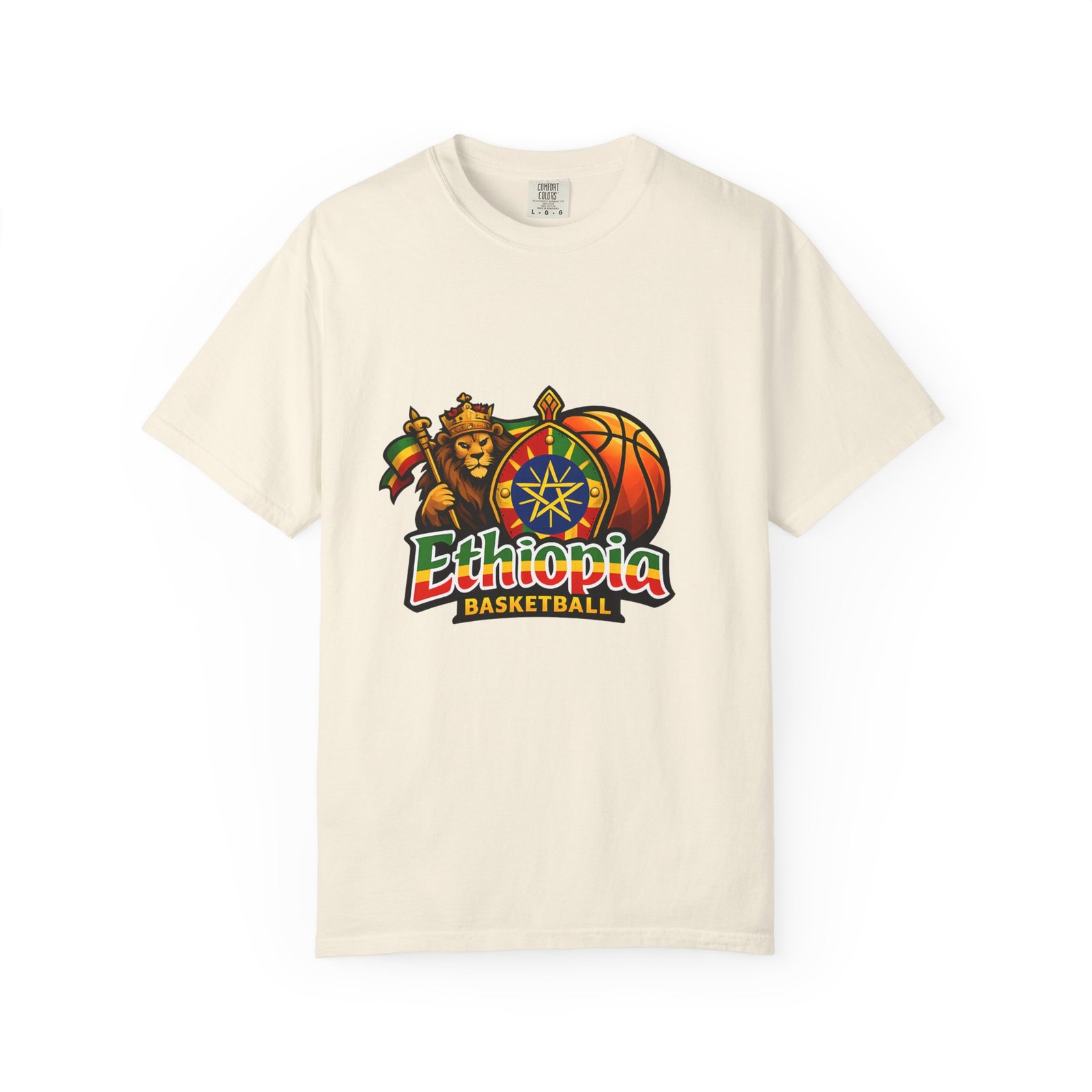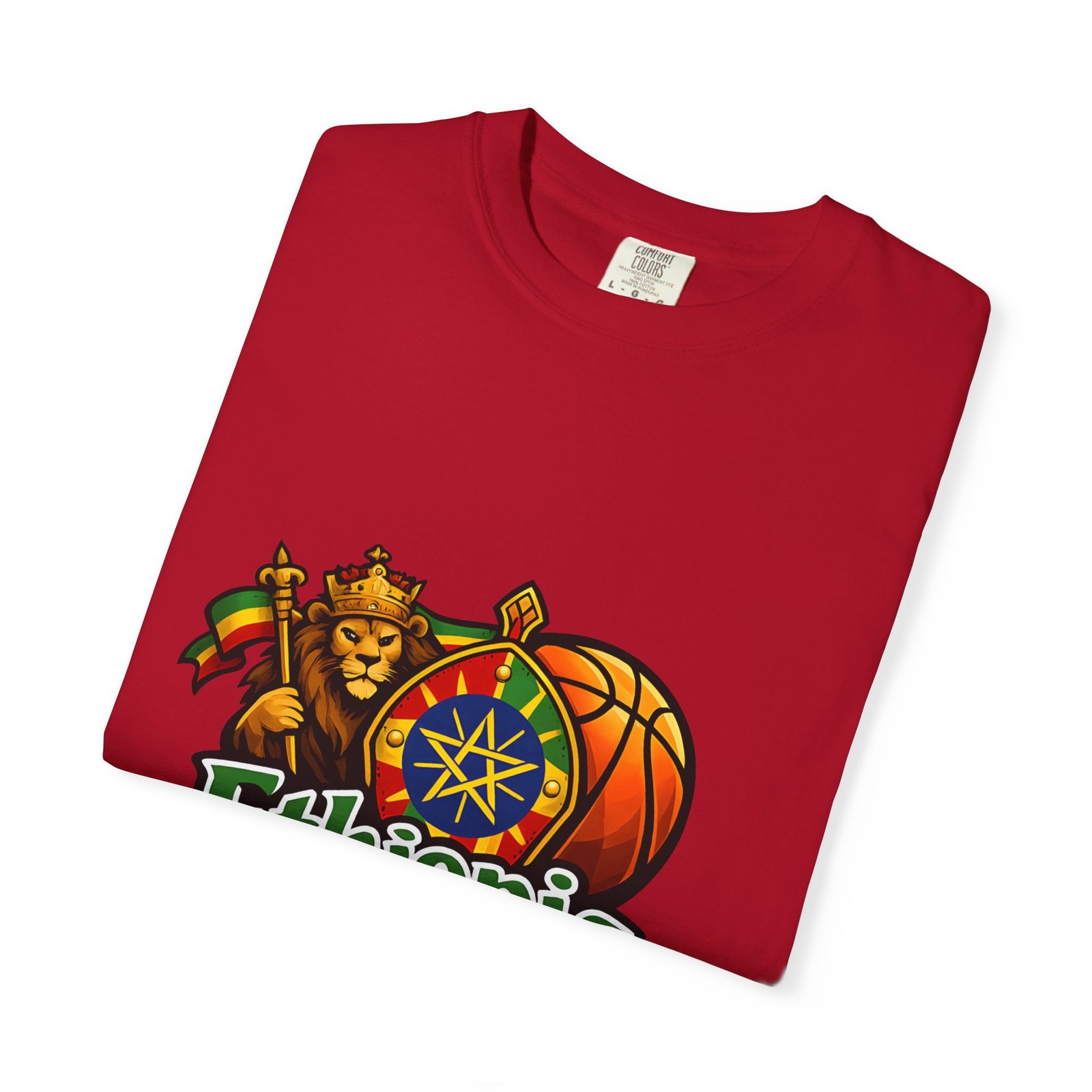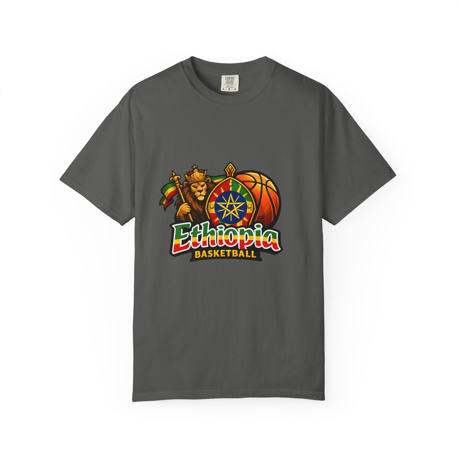 This heavyweight garment-dyed tee brings a warm, lived-in feel to everyday wear while celebrating Ethiopian basketball spirit. The soft, washed cotton drapes with relaxed ease, and the vibrant chest artwork — a lion, basketball and Ethiopian emblem in bold Rasta tones — makes it feel like you’re carrying a bit of home and the court with you. It’s the kind of shirt you reach for on practice days, neighborhood pick-up games, or when you want to rep cultural pride at a community event. The muted, vintage-like color of the fabric pairs with the saturated print to create an authentic, timeworn look that only improves with wear. Durable stitching and a roomy cut let you move freely while staying comfortable through long days and active nights.