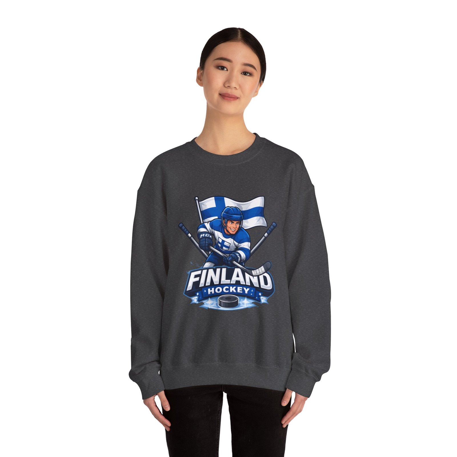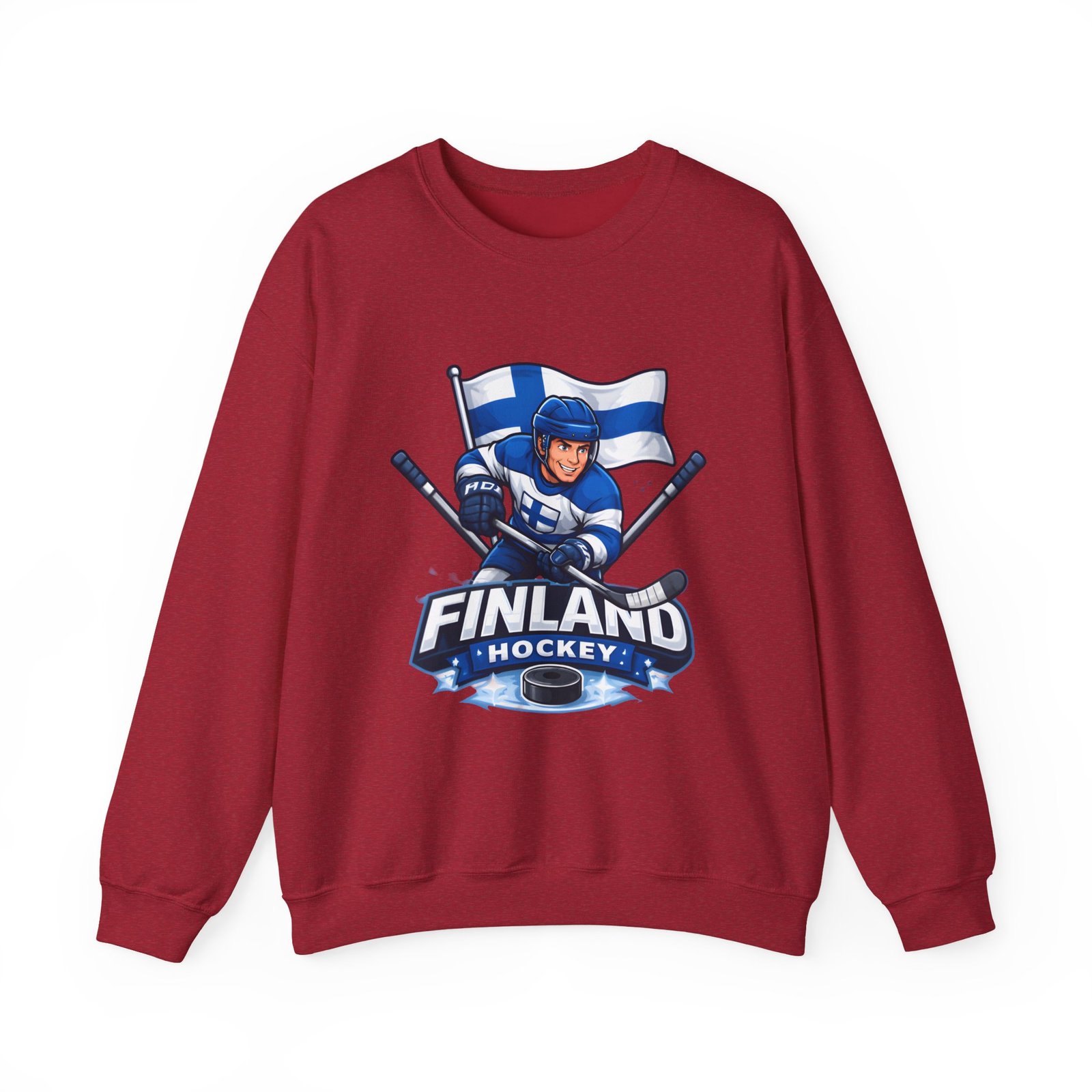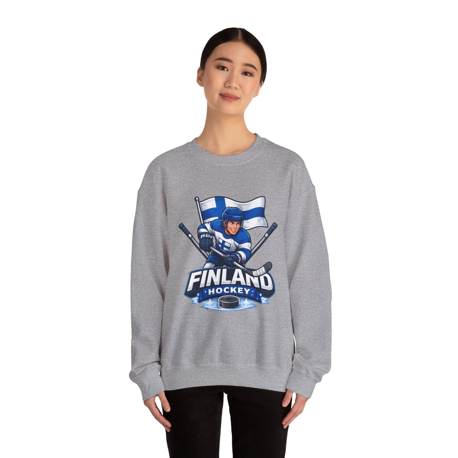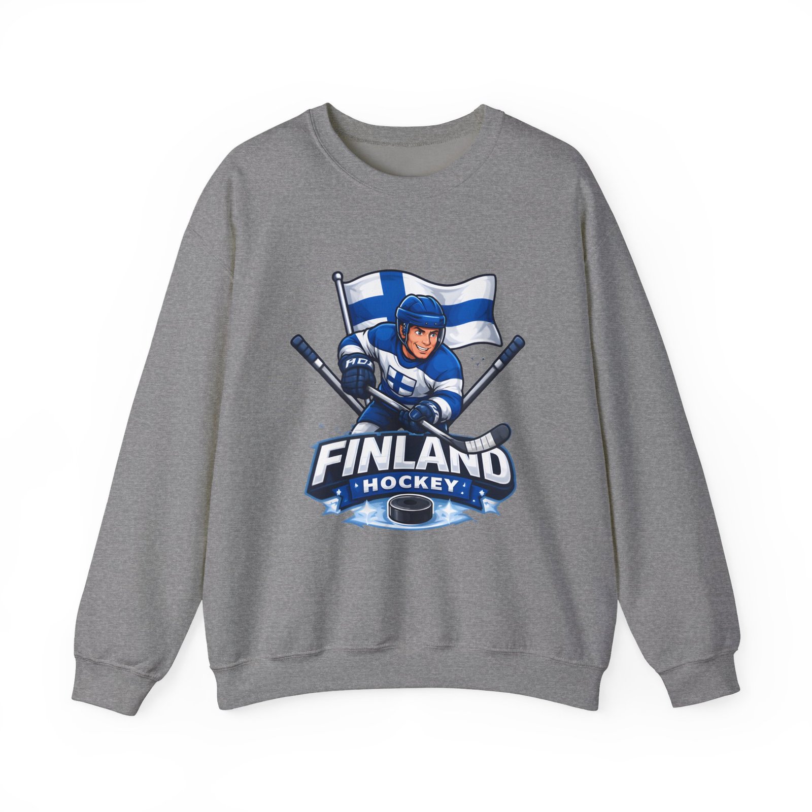 Wrap yourself in chilly-bleacher energy with this cozy crewneck that wears like a rallying cry. Soft, midweight fleece holds a bold Finland hockey emblem—skating player, crossed sticks, and waving flag—so you carry team pride without shouting. The classic fit and ribbed crew collar sit familiar and comfortable after long rides home from the rink or slow mornings with a steaming mug. Subtle label details and clean seams keep the focus on the graphic while lasting through practices, travel days, and weekends packed with friends and family.