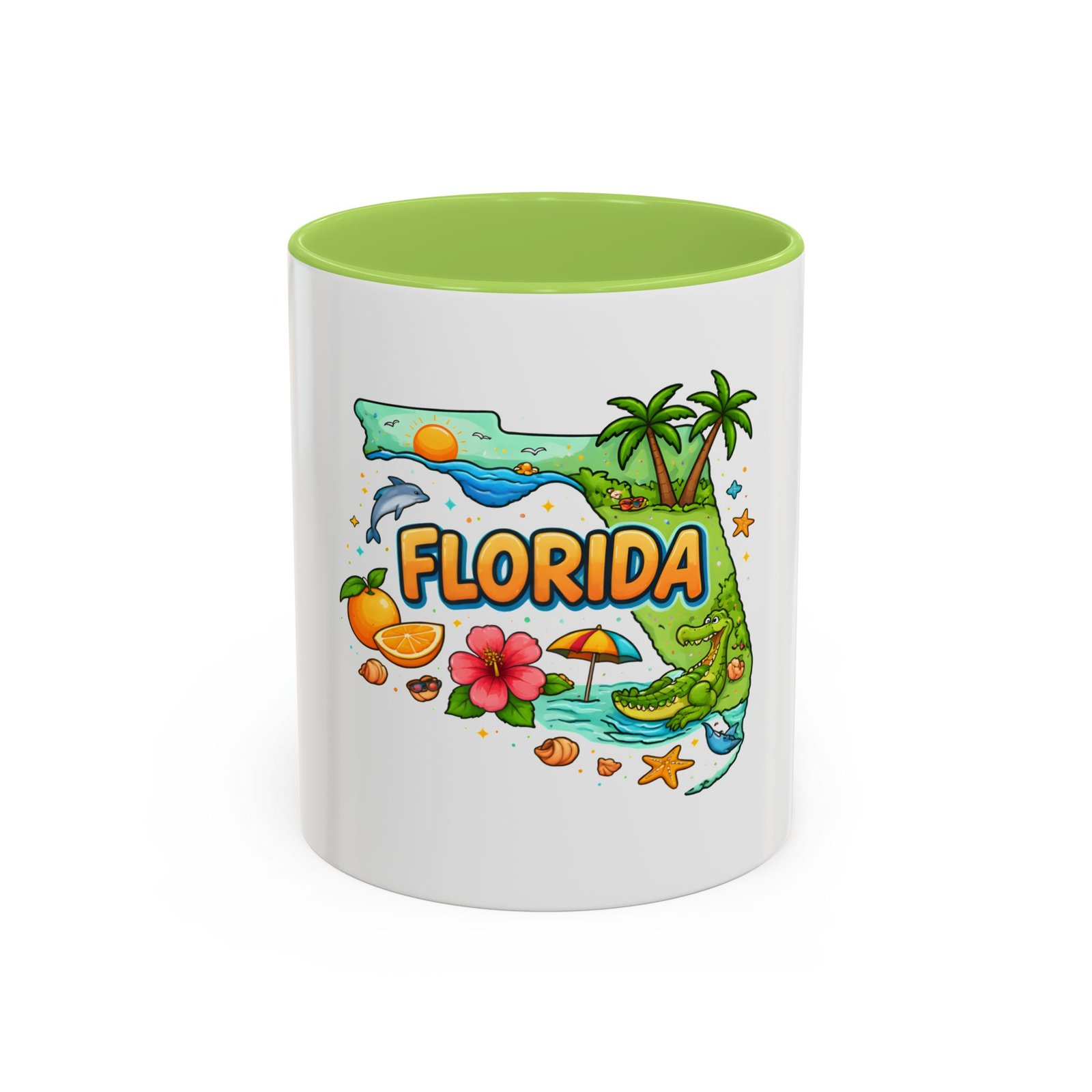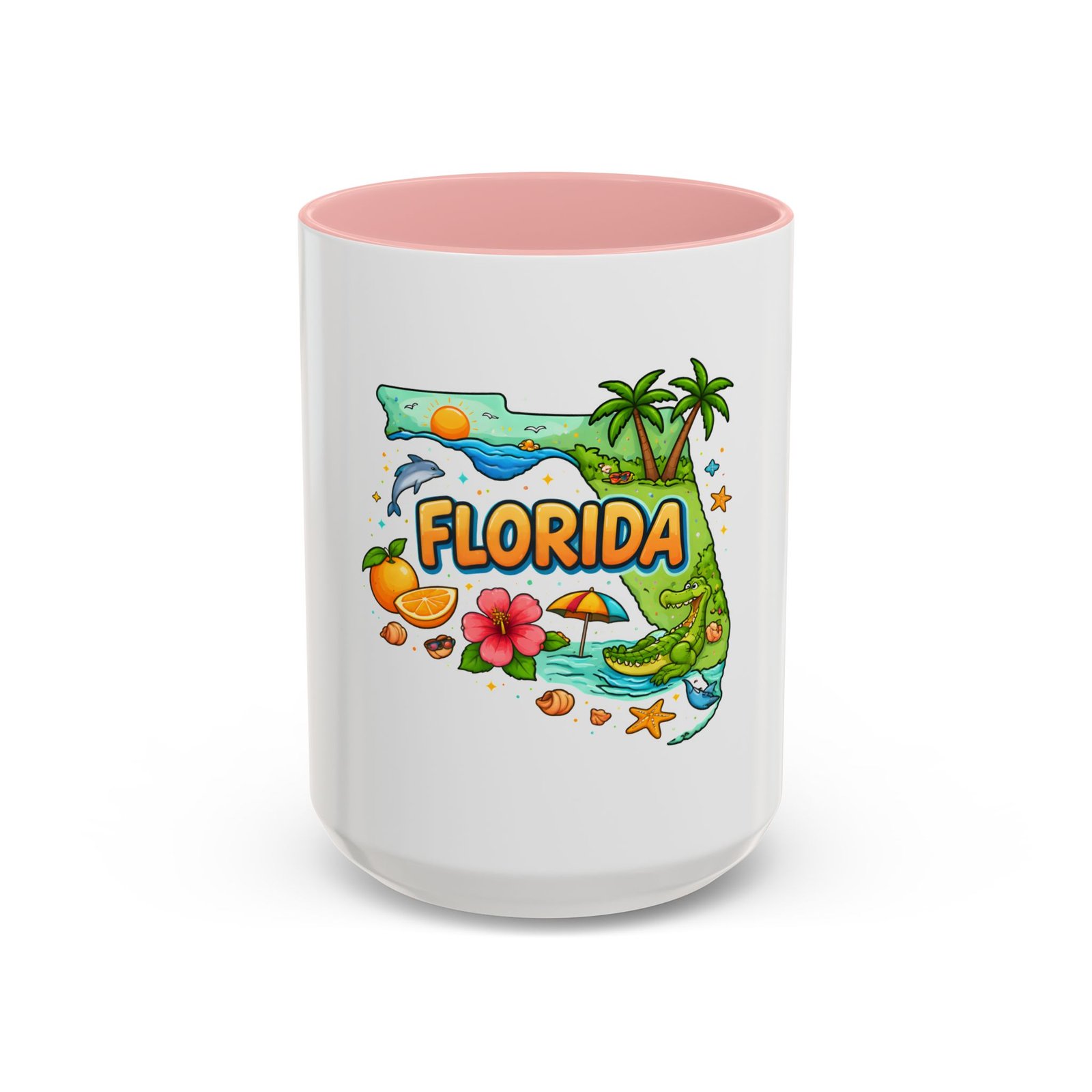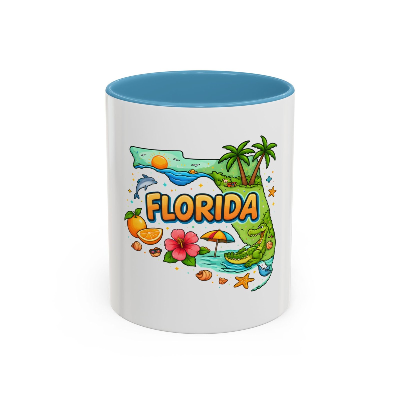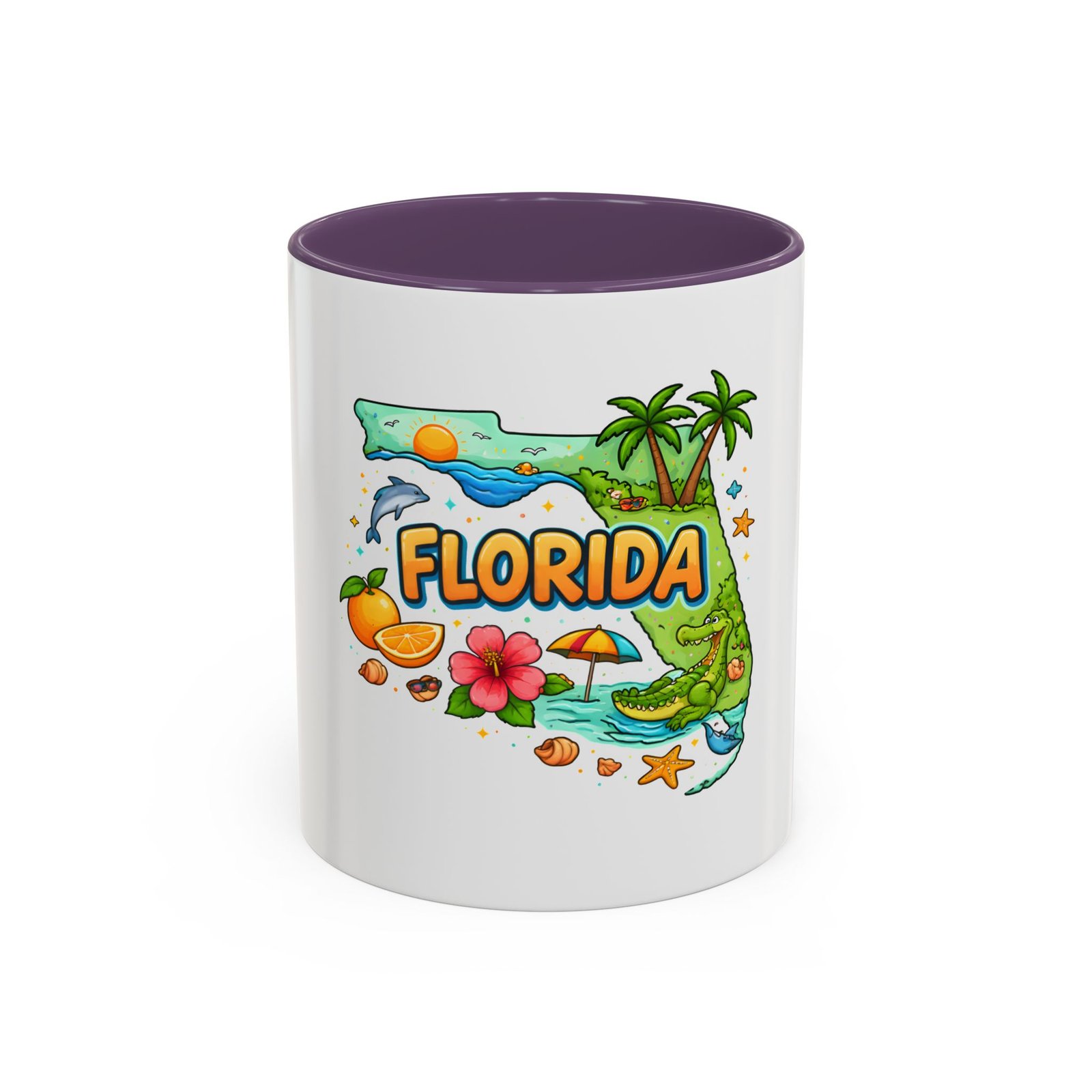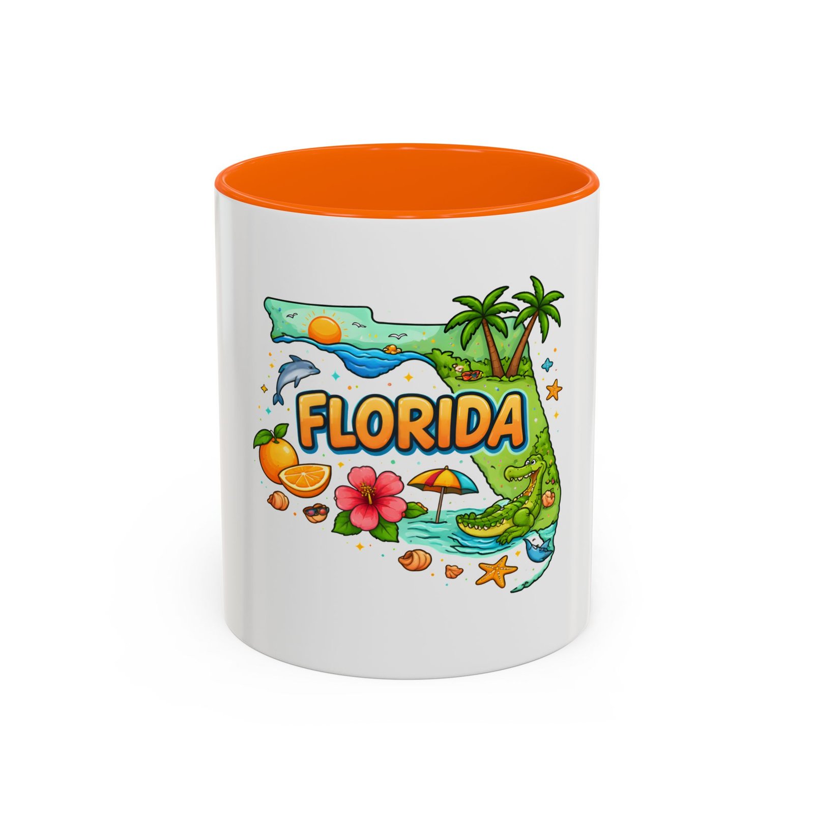 Wake up to sunshine, salt air, and a little Florida whimsy. This ceramic accent mug pairs a glossy white exterior with a colorful interior and handle, framing a playful Florida design—palm trees, hibiscus, an orange slice, and a grinning alligator lounging by the shore. It feels like a slow morning on the coast: warm light, ocean breeze, and a splash of tropical color to start your day. Slip it into your routine for coffee breaks after morning surf reports, desk escapes during work-from-home afternoons, or casual catch-ups with friends who love the Gulf and Atlantic alike.
