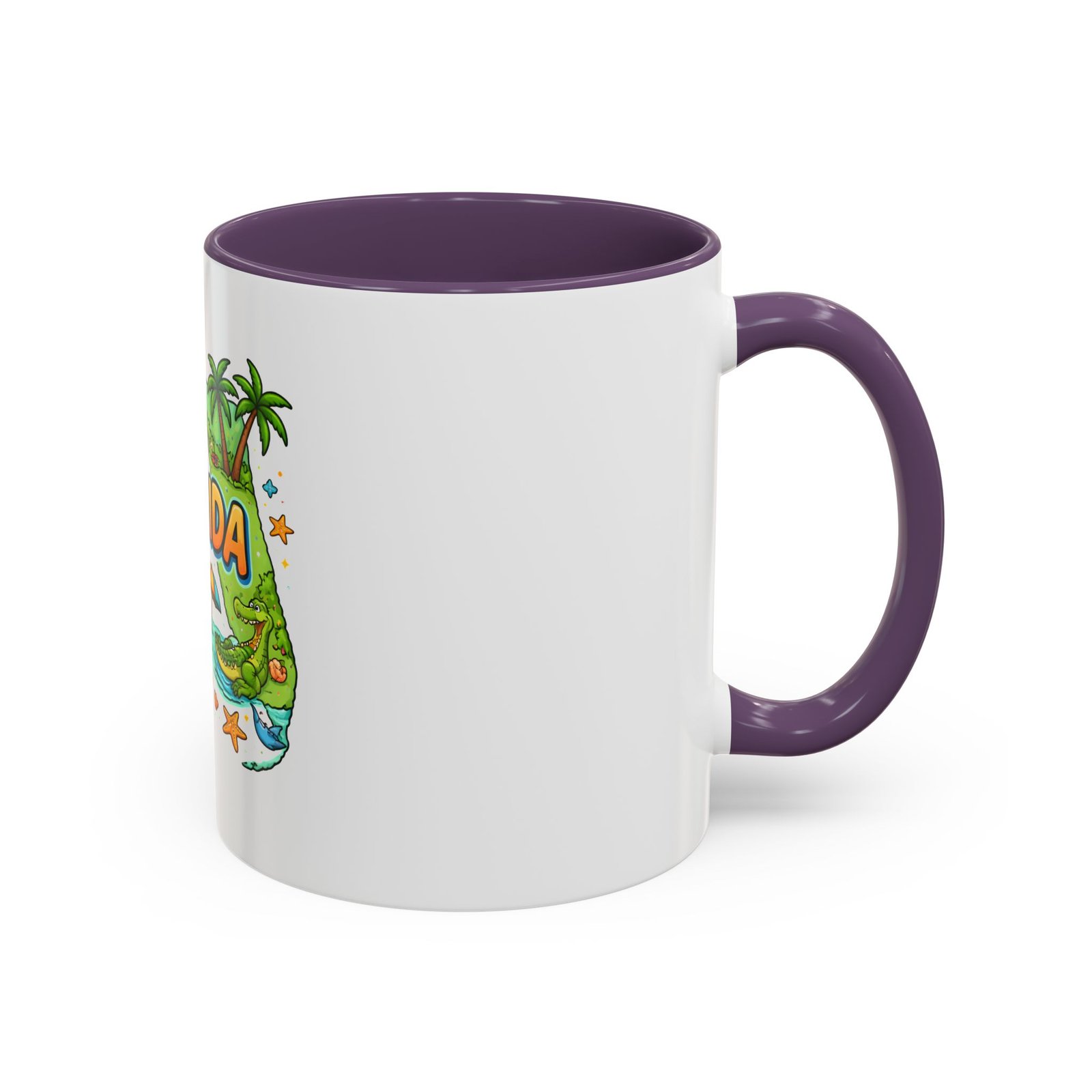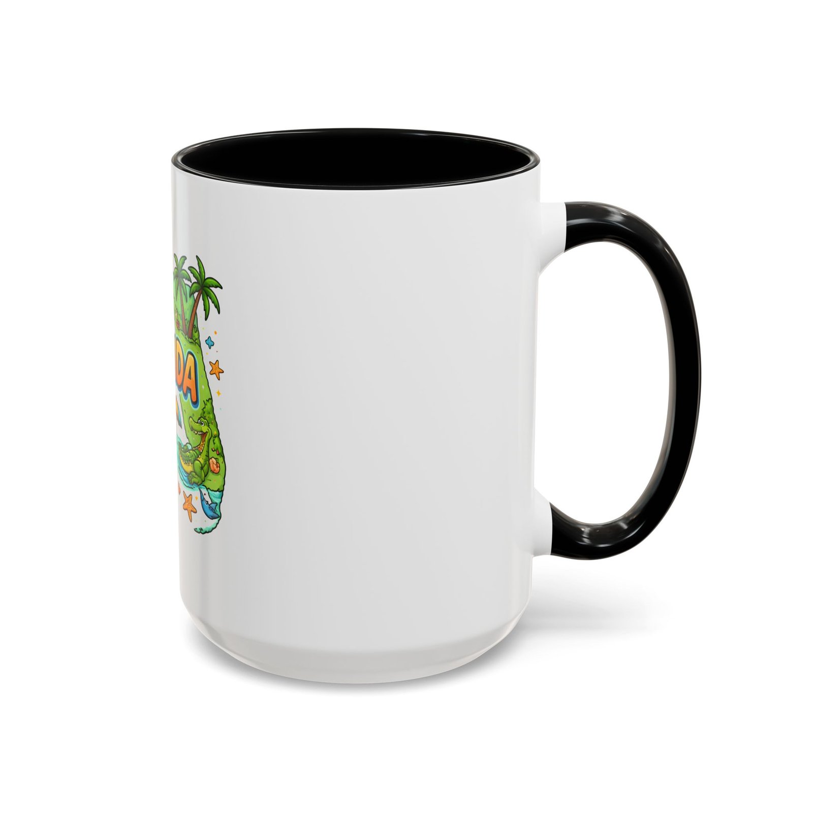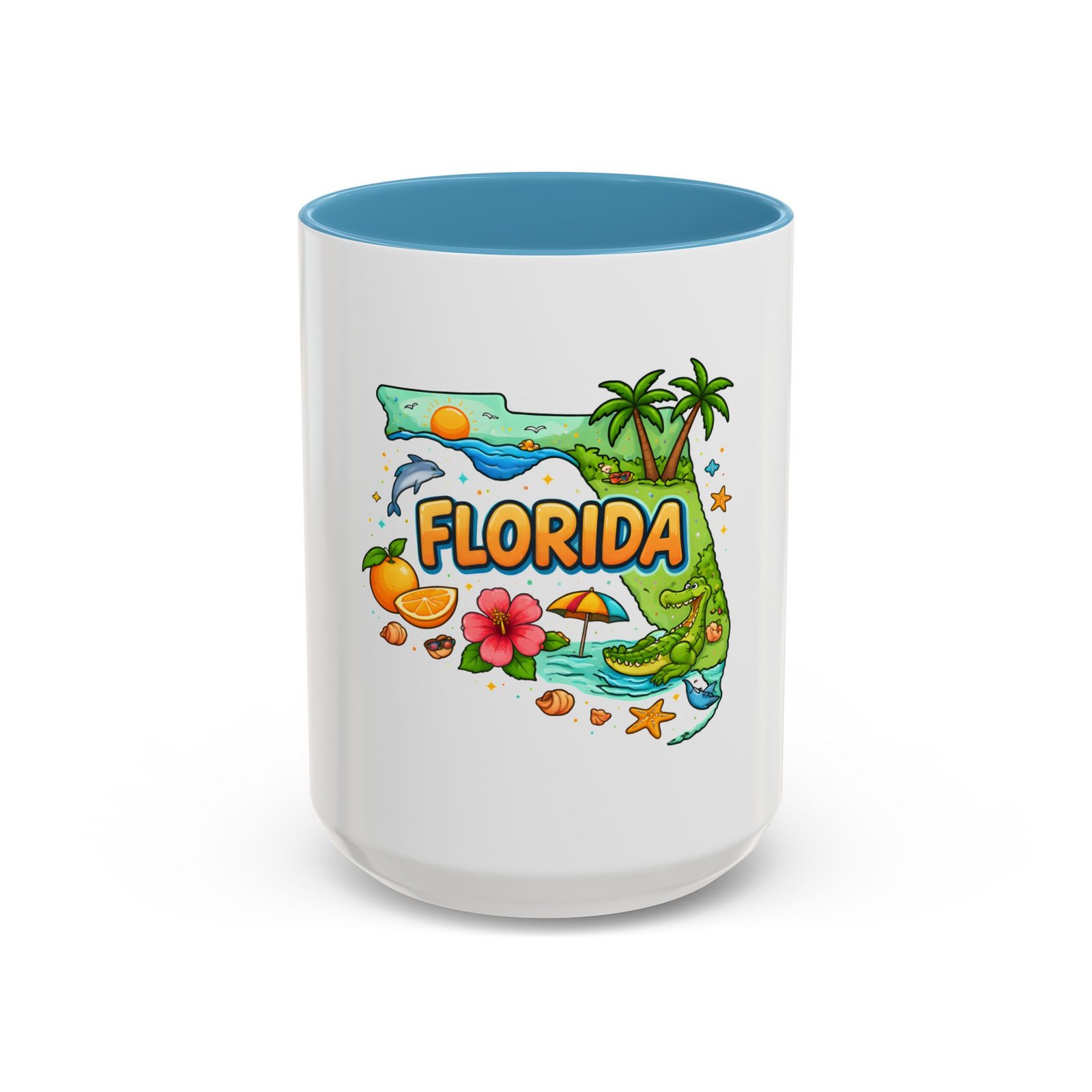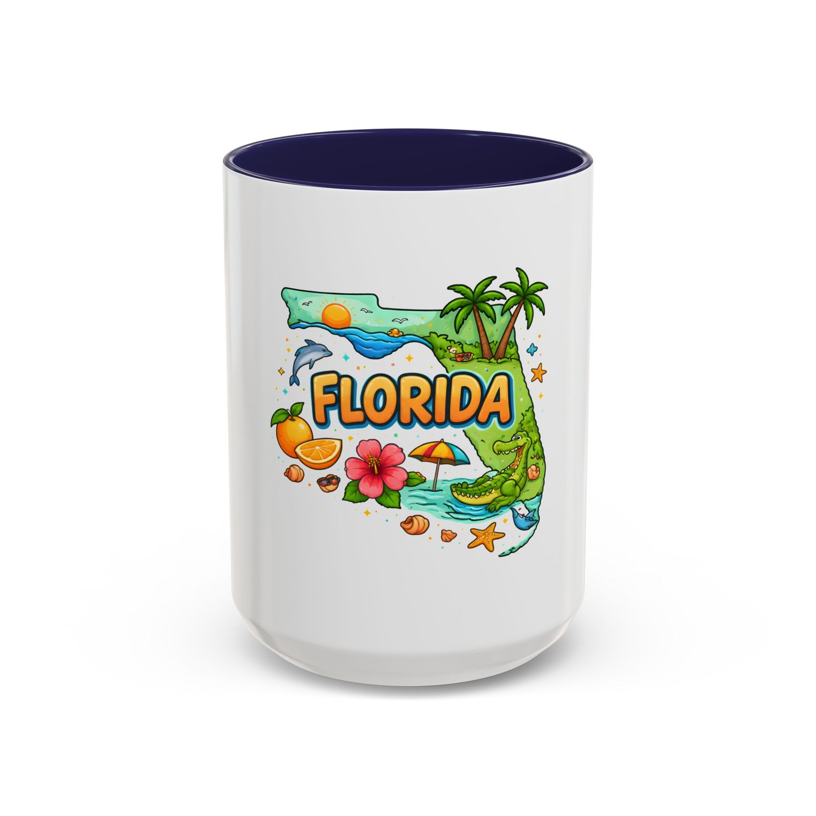 Wake up to sunshine, salt air, and a little Florida whimsy. This ceramic accent mug pairs a glossy white exterior with a colorful interior and handle, framing a playful Florida design—palm trees, hibiscus, an orange slice, and a grinning alligator lounging by the shore. It feels like a slow morning on the coast: warm light, ocean breeze, and a splash of tropical color to start your day. Slip it into your routine for coffee breaks after morning surf reports, desk escapes during work-from-home afternoons, or casual catch-ups with friends who love the Gulf and Atlantic alike.