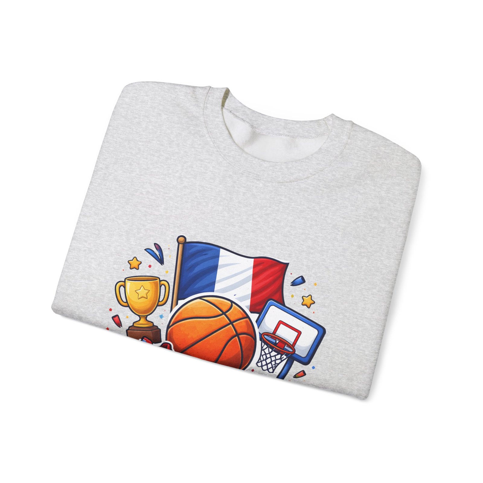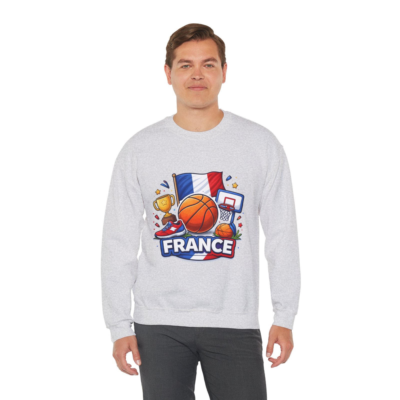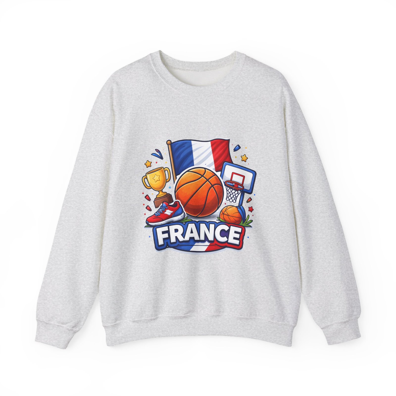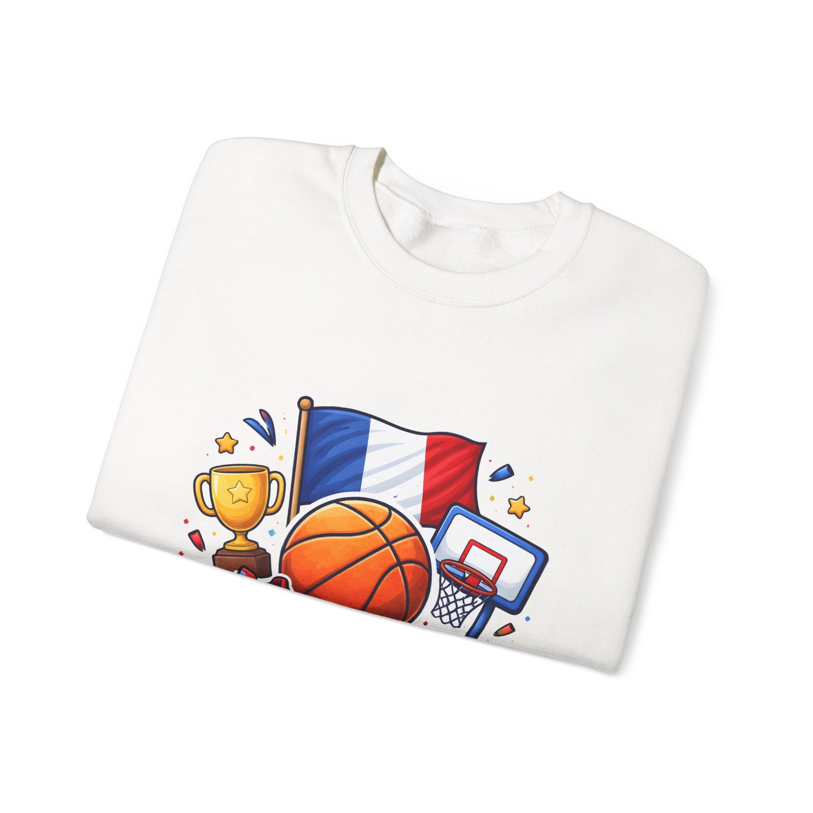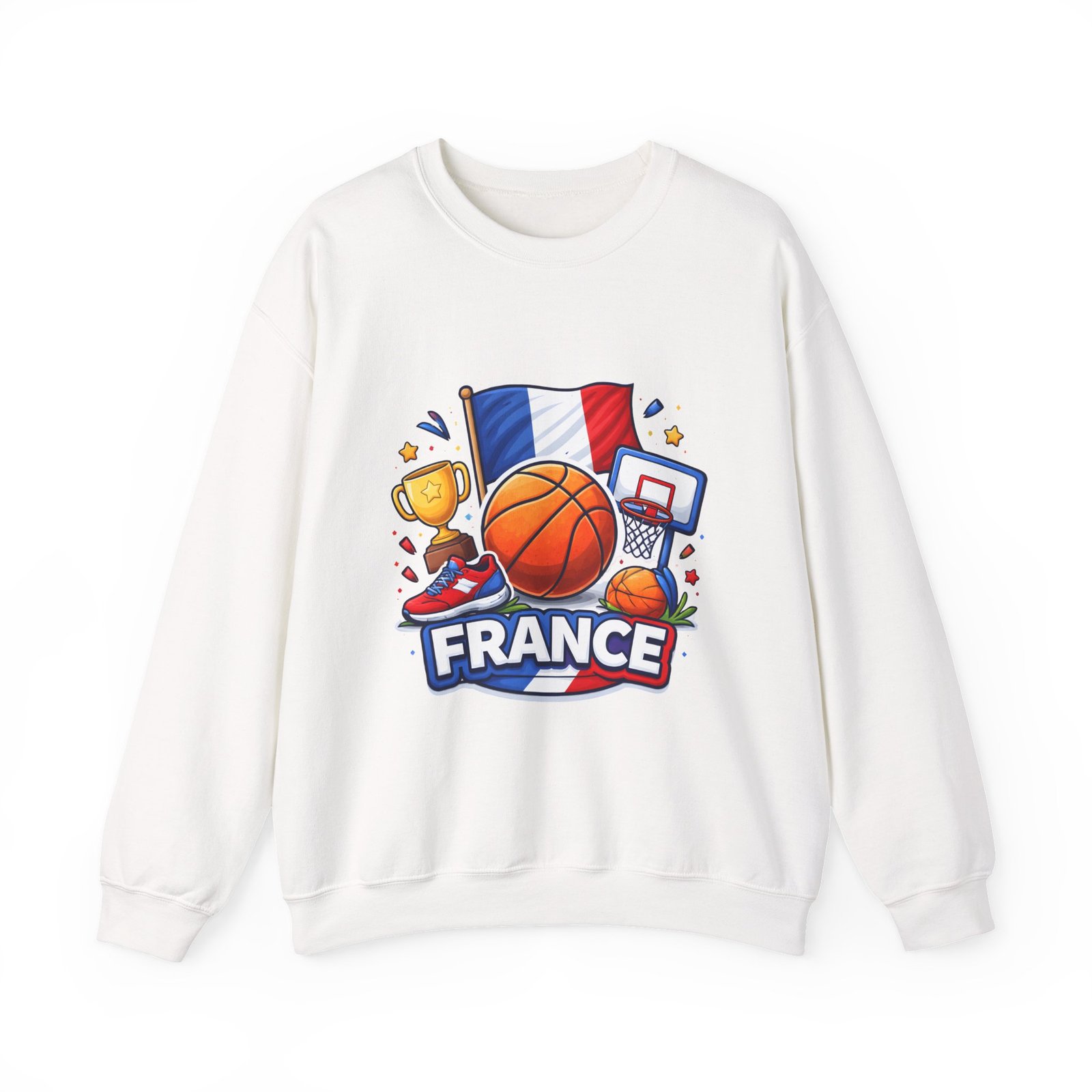 Pull on this soft, midweight crew and carry a little court-side energy everywhere you go. The sweatshirt’s clean white canvas puts a bold, playful France basketball graphic front-and-center — tricolor flag, sneaker, trophy and hoop clustered around a lively orange ball. It reads like a small celebration: game-night grit, national pride, and the easy confidence of someone who lives for pick-up games and match-day rituals. The classic crew cut and ribbed collar tuck the design into a relaxed silhouette that layers well over tees or under a coach jacket. It breaks in with you: the tubular knit eliminates side seams for a smoother drape, while double-needle stitching keeps the seams strong after many washes. Breathable cotton-poly balance and OEKO-TEX dyes mean it feels familiar and looks fresh long after the season ends.