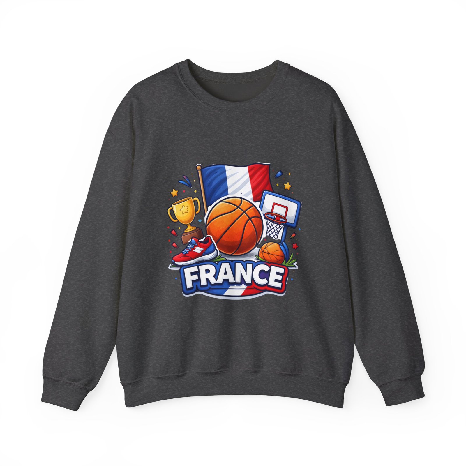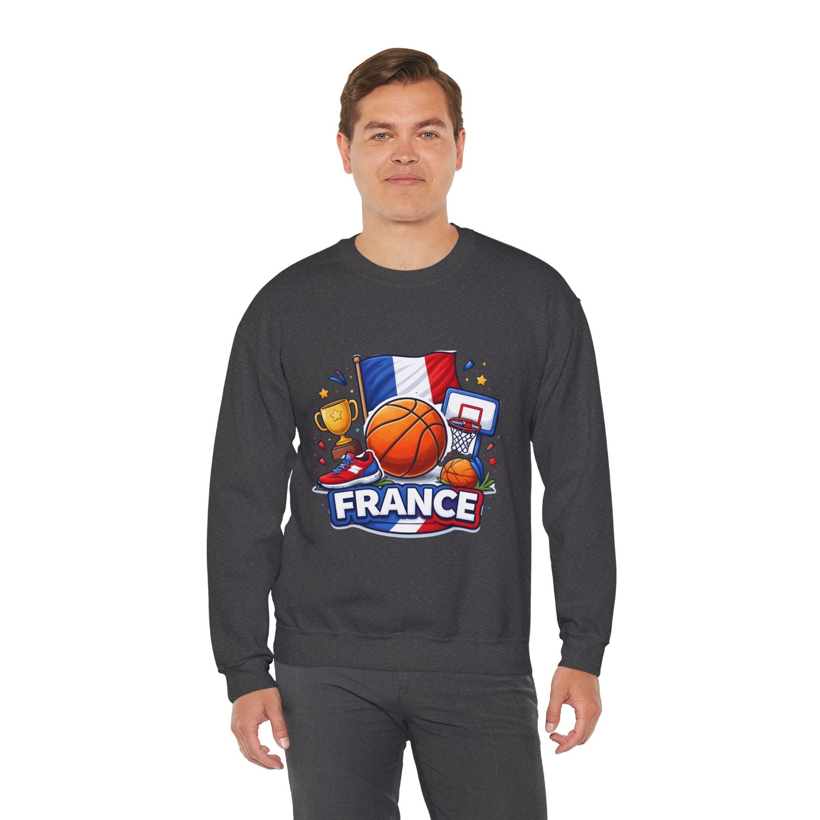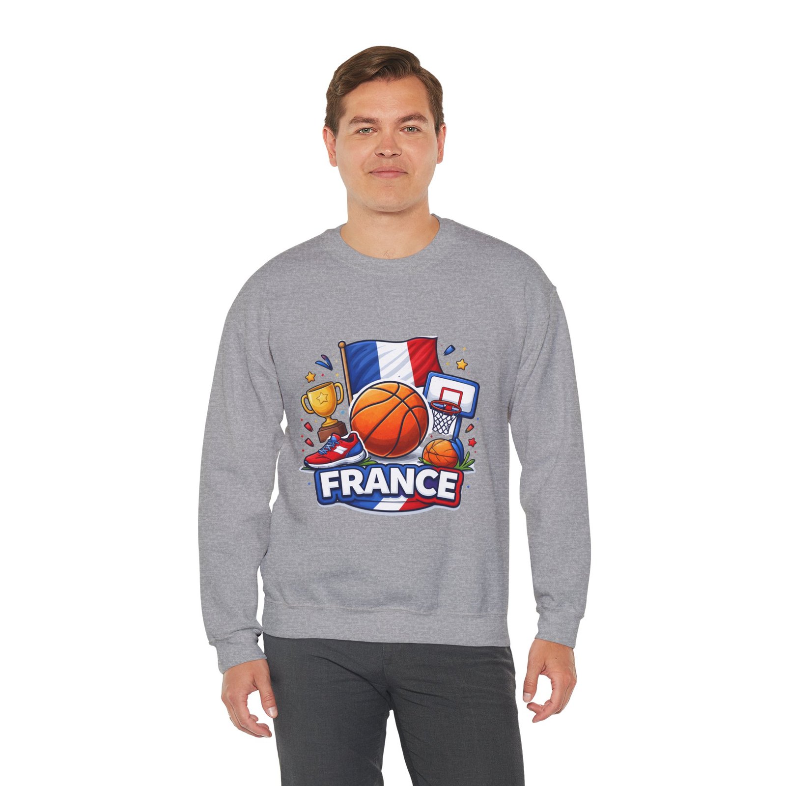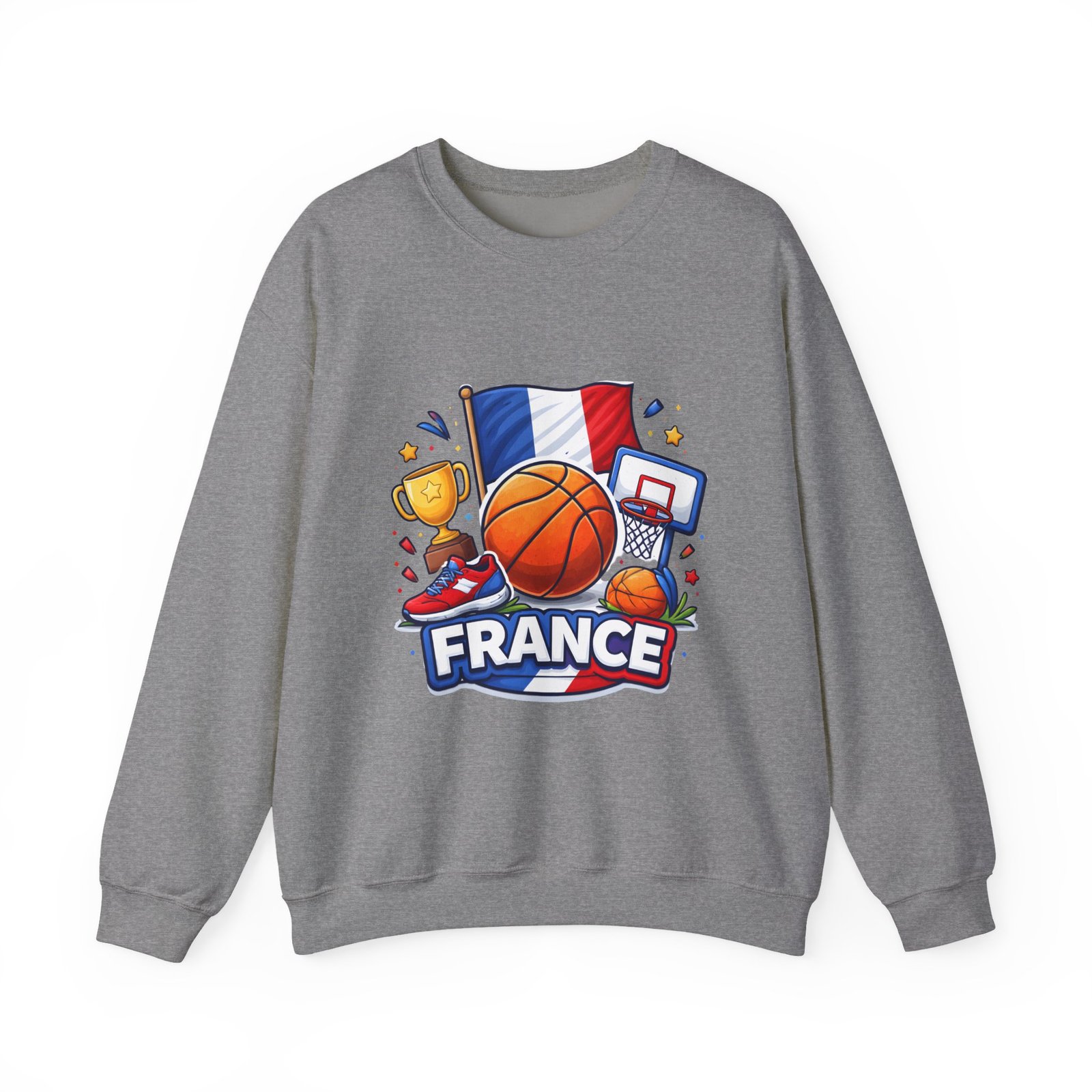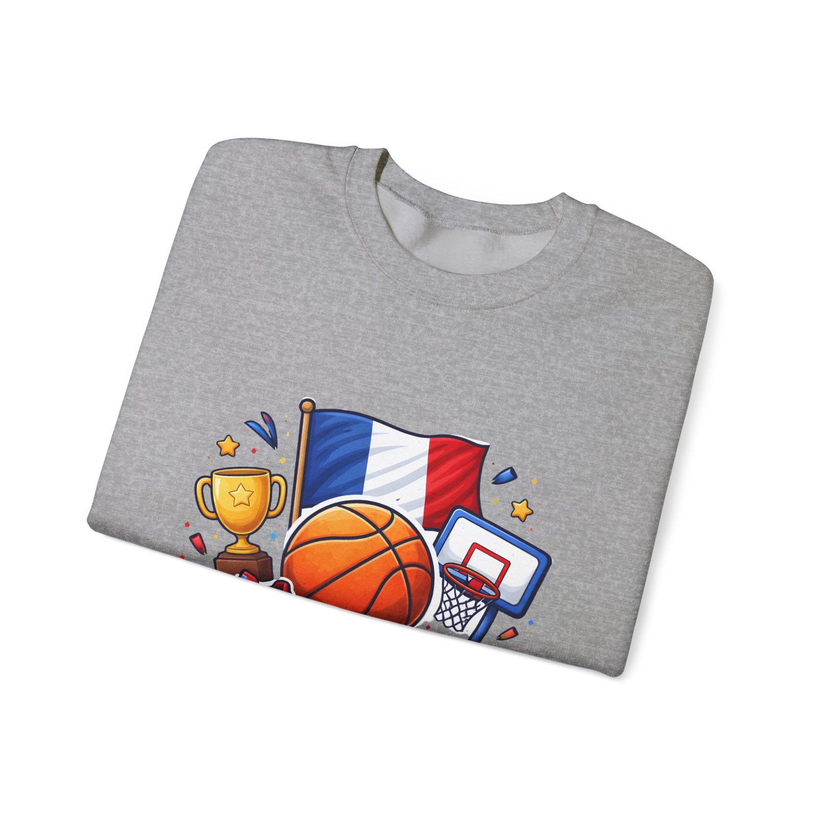 Pull on this soft, midweight crew and carry a little court-side energy everywhere you go. The sweatshirt’s clean white canvas puts a bold, playful France basketball graphic front-and-center — tricolor flag, sneaker, trophy and hoop clustered around a lively orange ball. It reads like a small celebration: game-night grit, national pride, and the easy confidence of someone who lives for pick-up games and match-day rituals. The classic crew cut and ribbed collar tuck the design into a relaxed silhouette that layers well over tees or under a coach jacket. It breaks in with you: the tubular knit eliminates side seams for a smoother drape, while double-needle stitching keeps the seams strong after many washes. Breathable cotton-poly balance and OEKO-TEX dyes mean it feels familiar and looks fresh long after the season ends.