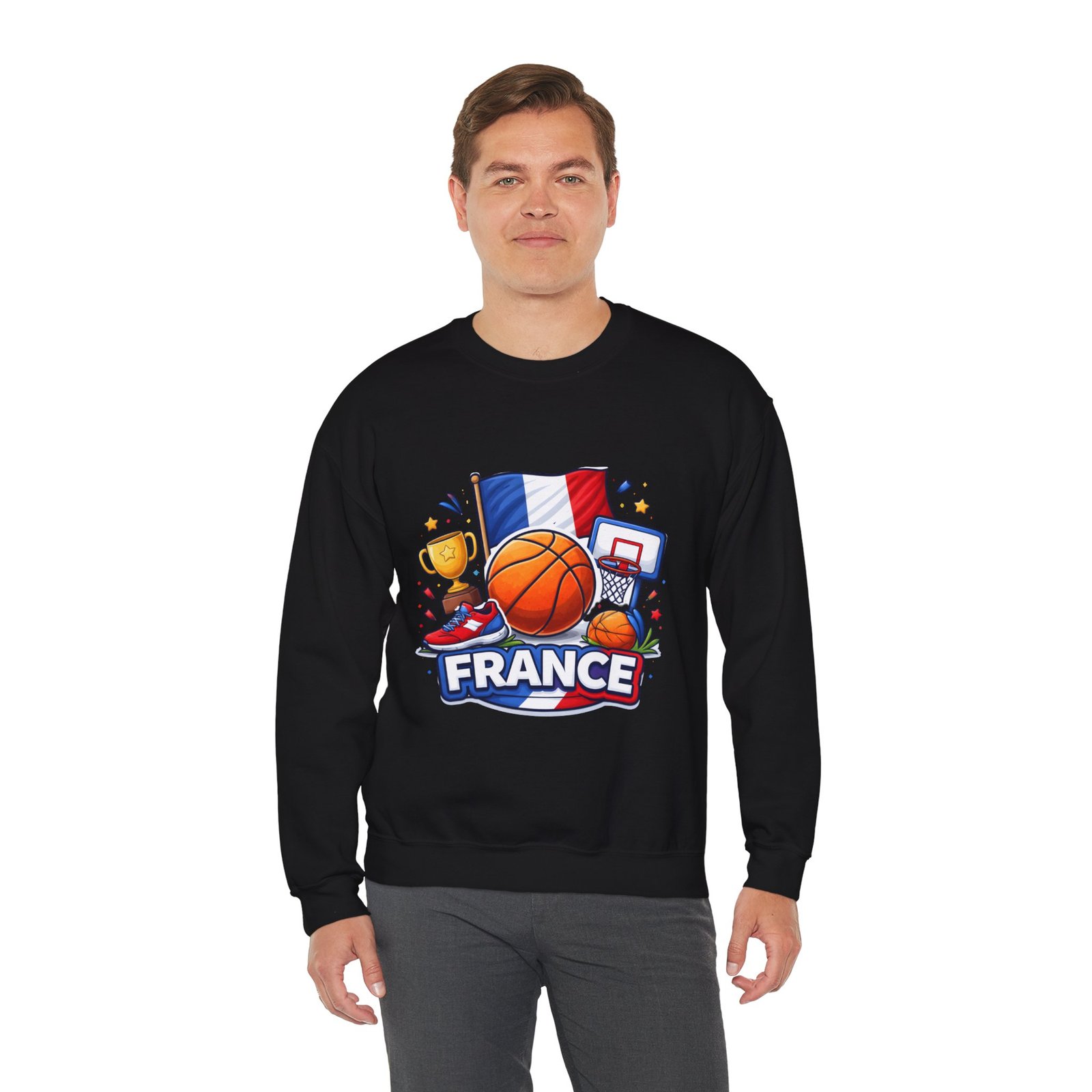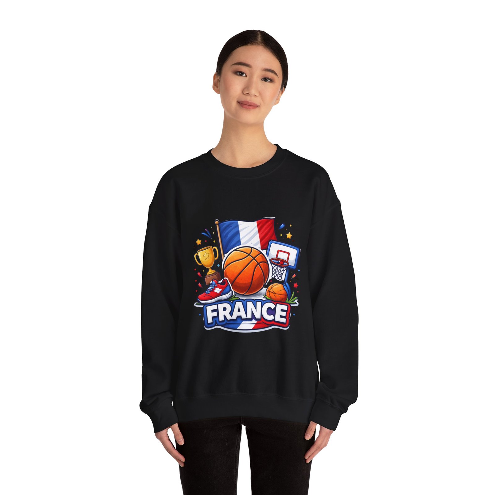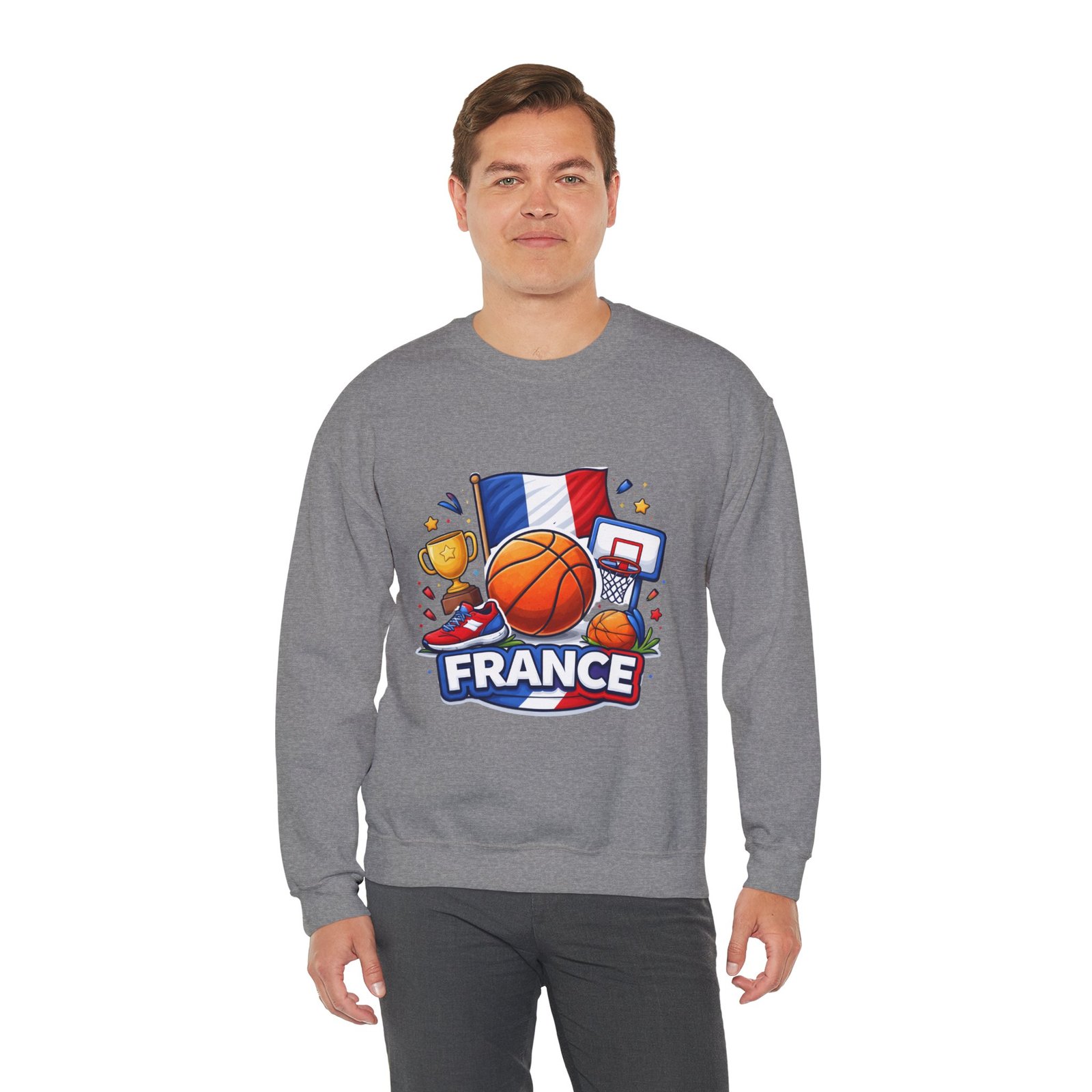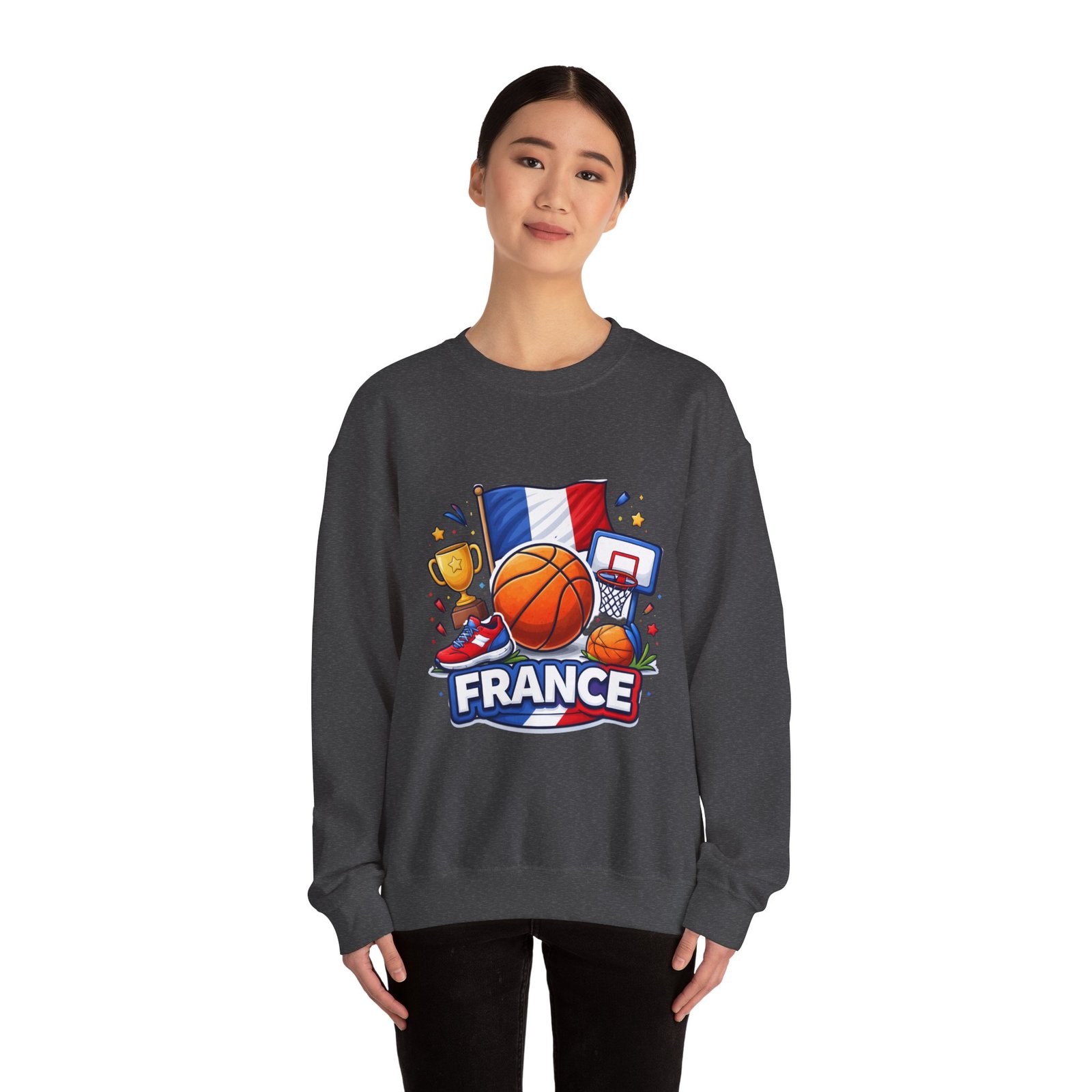 Pull on this soft, midweight crew and carry a little court-side energy everywhere you go. The sweatshirt’s clean white canvas puts a bold, playful France basketball graphic front-and-center — tricolor flag, sneaker, trophy and hoop clustered around a lively orange ball. It reads like a small celebration: game-night grit, national pride, and the easy confidence of someone who lives for pick-up games and match-day rituals. The classic crew cut and ribbed collar tuck the design into a relaxed silhouette that layers well over tees or under a coach jacket. It breaks in with you: the tubular knit eliminates side seams for a smoother drape, while double-needle stitching keeps the seams strong after many washes. Breathable cotton-poly balance and OEKO-TEX dyes mean it feels familiar and looks fresh long after the season ends.