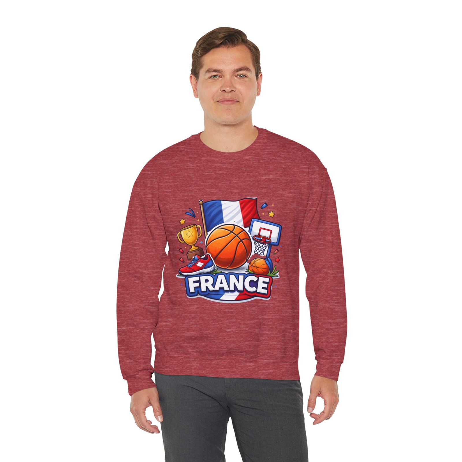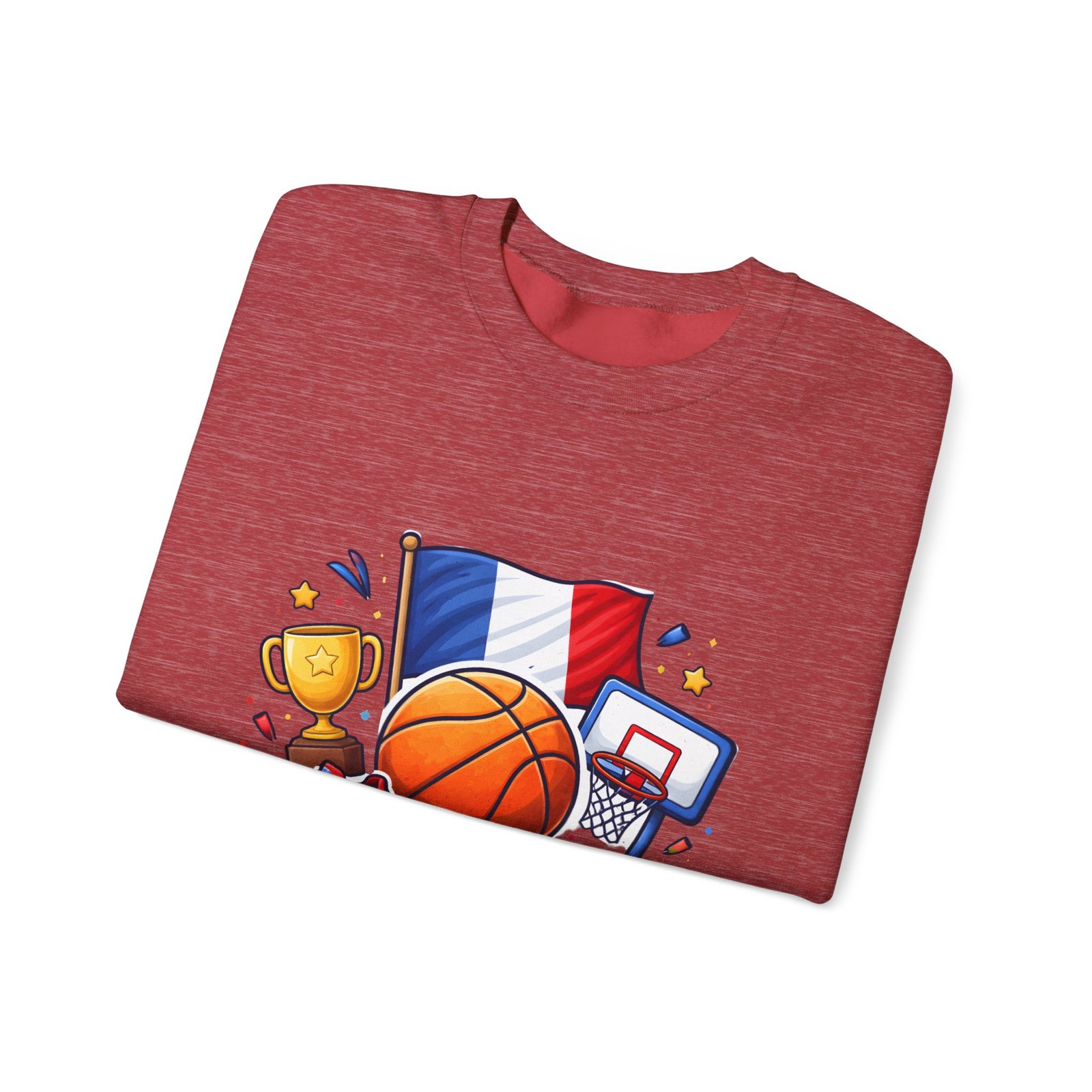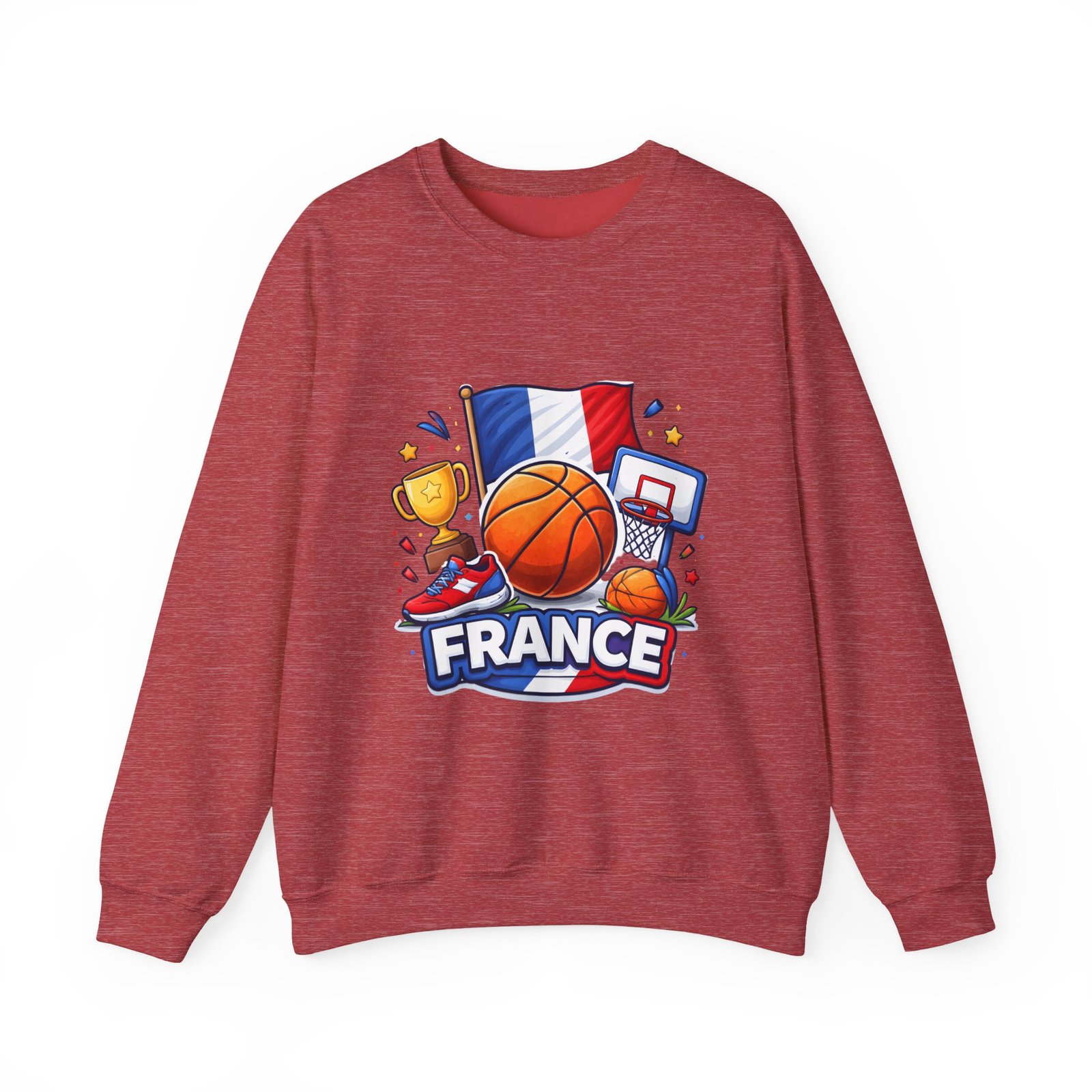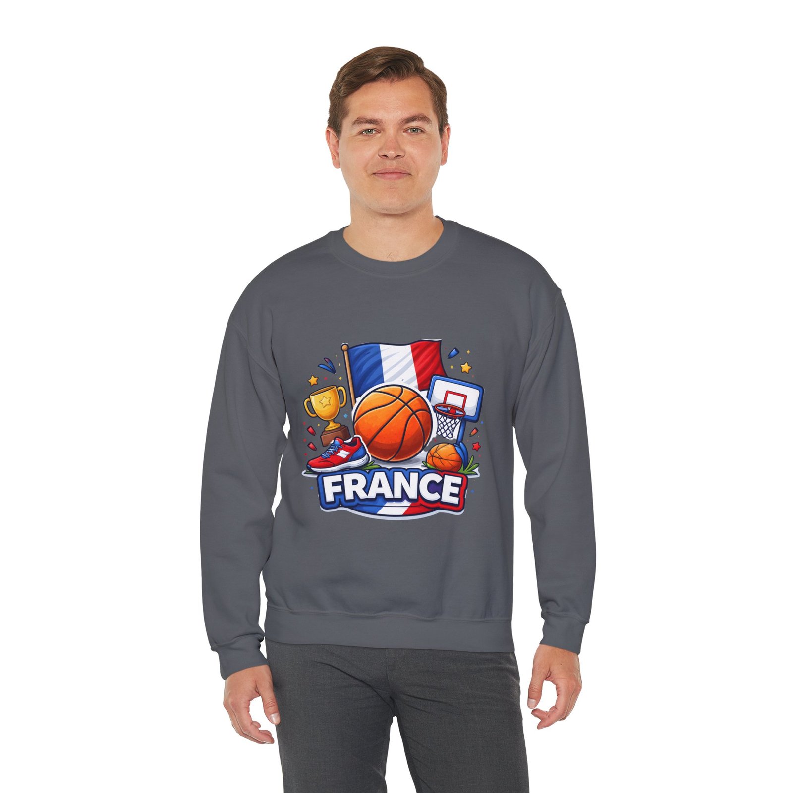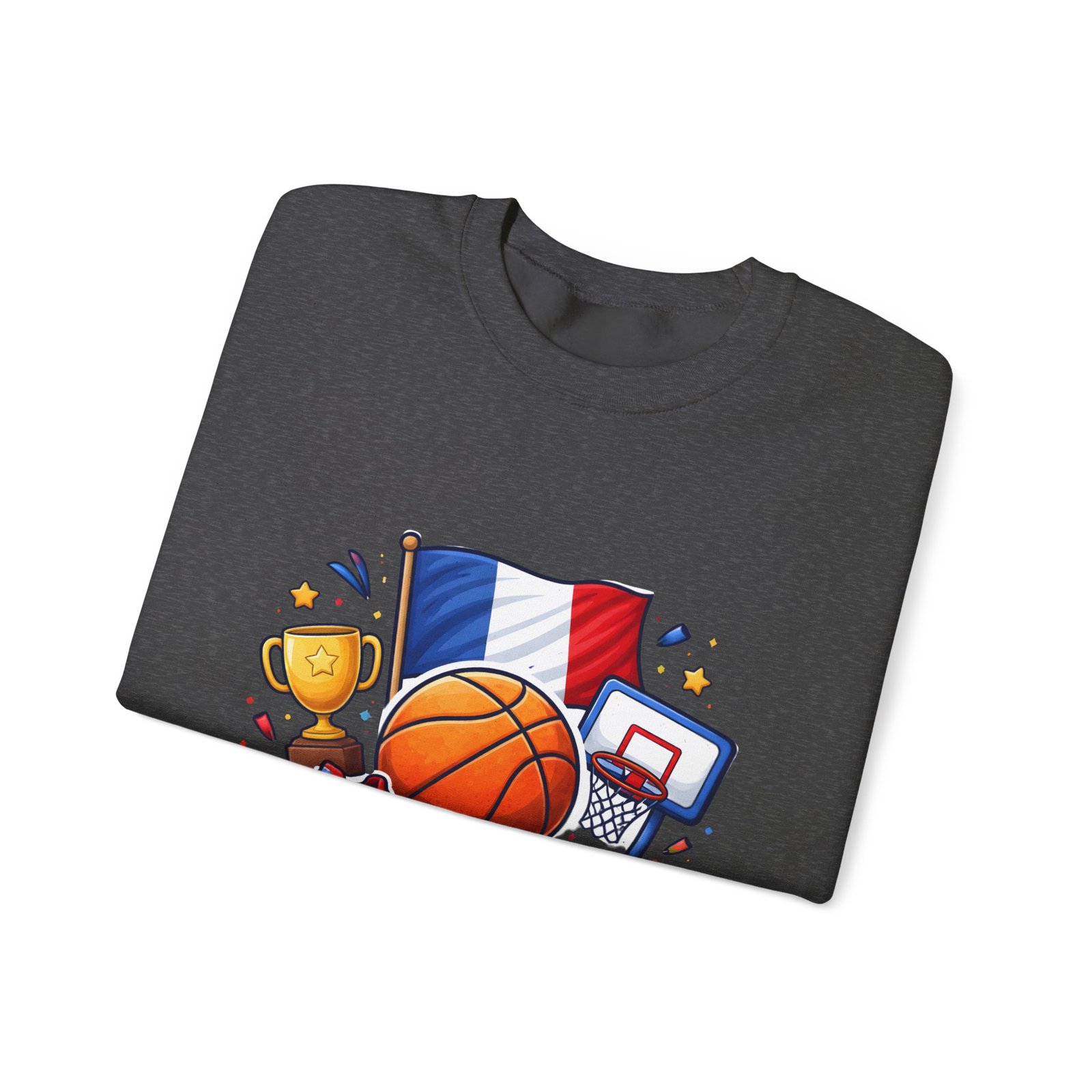 Pull on this soft, midweight crew and carry a little court-side energy everywhere you go. The sweatshirt’s clean white canvas puts a bold, playful France basketball graphic front-and-center — tricolor flag, sneaker, trophy and hoop clustered around a lively orange ball. It reads like a small celebration: game-night grit, national pride, and the easy confidence of someone who lives for pick-up games and match-day rituals. The classic crew cut and ribbed collar tuck the design into a relaxed silhouette that layers well over tees or under a coach jacket. It breaks in with you: the tubular knit eliminates side seams for a smoother drape, while double-needle stitching keeps the seams strong after many washes. Breathable cotton-poly balance and OEKO-TEX dyes mean it feels familiar and looks fresh long after the season ends.