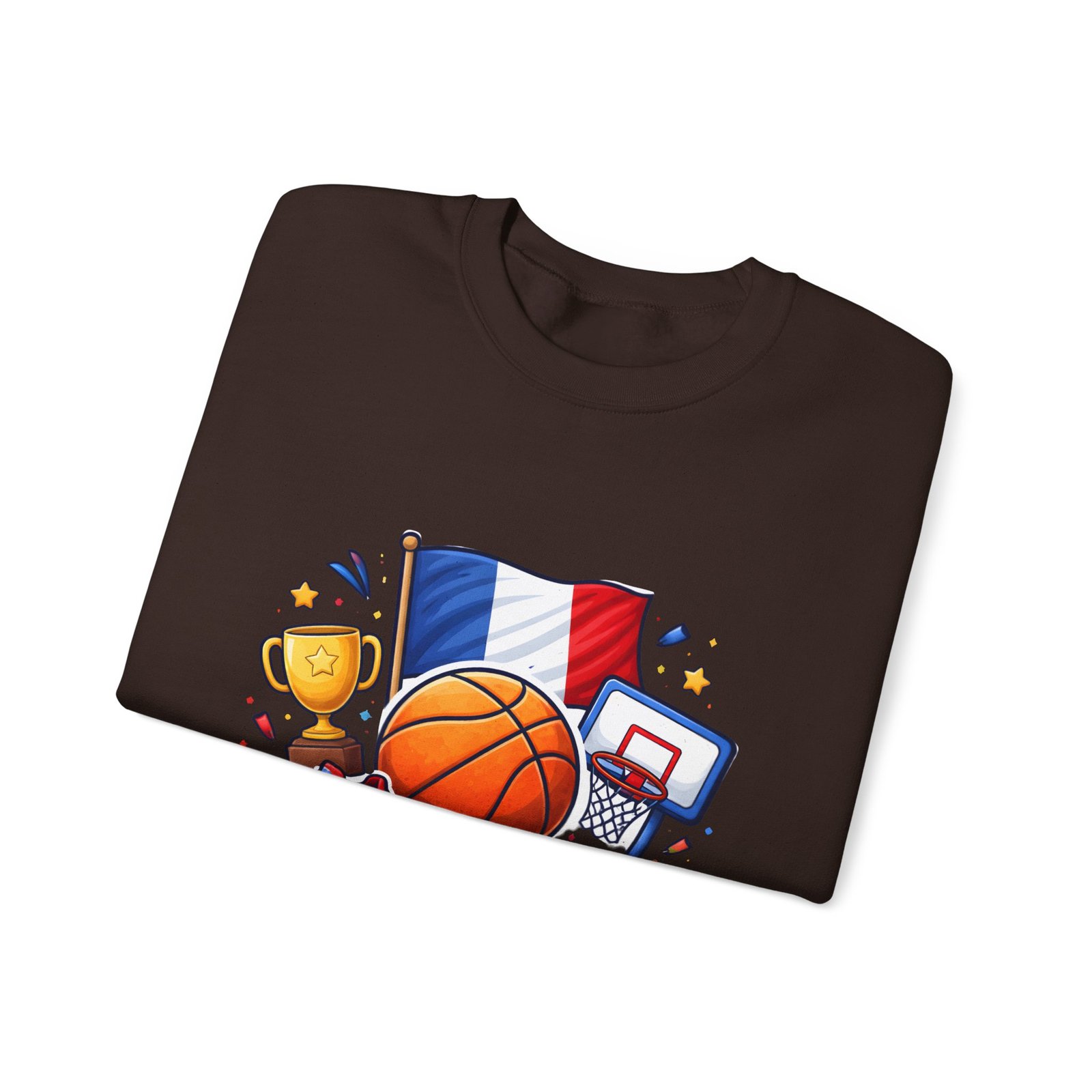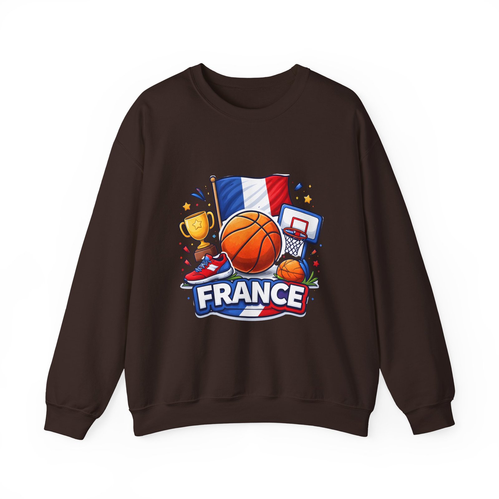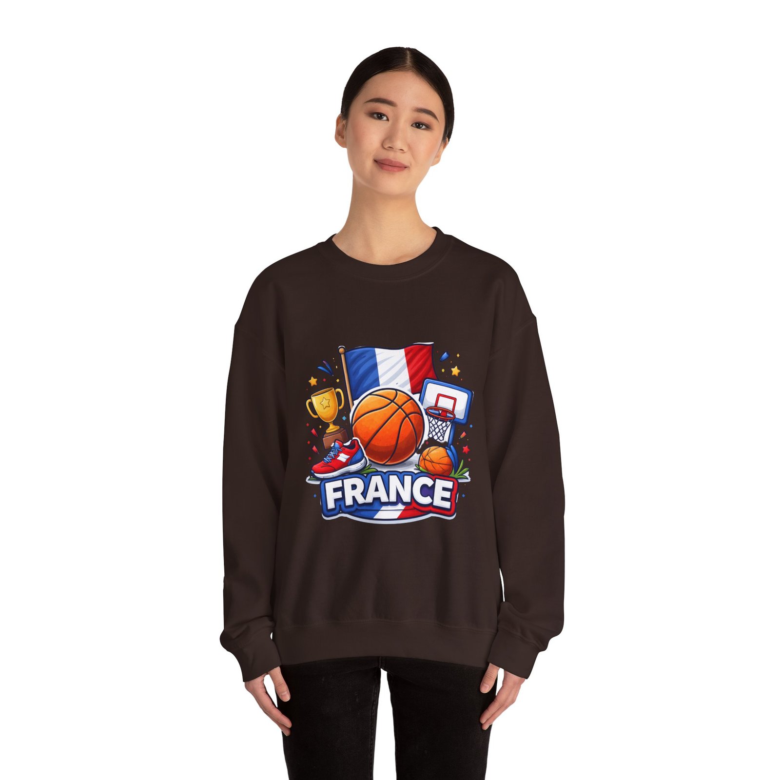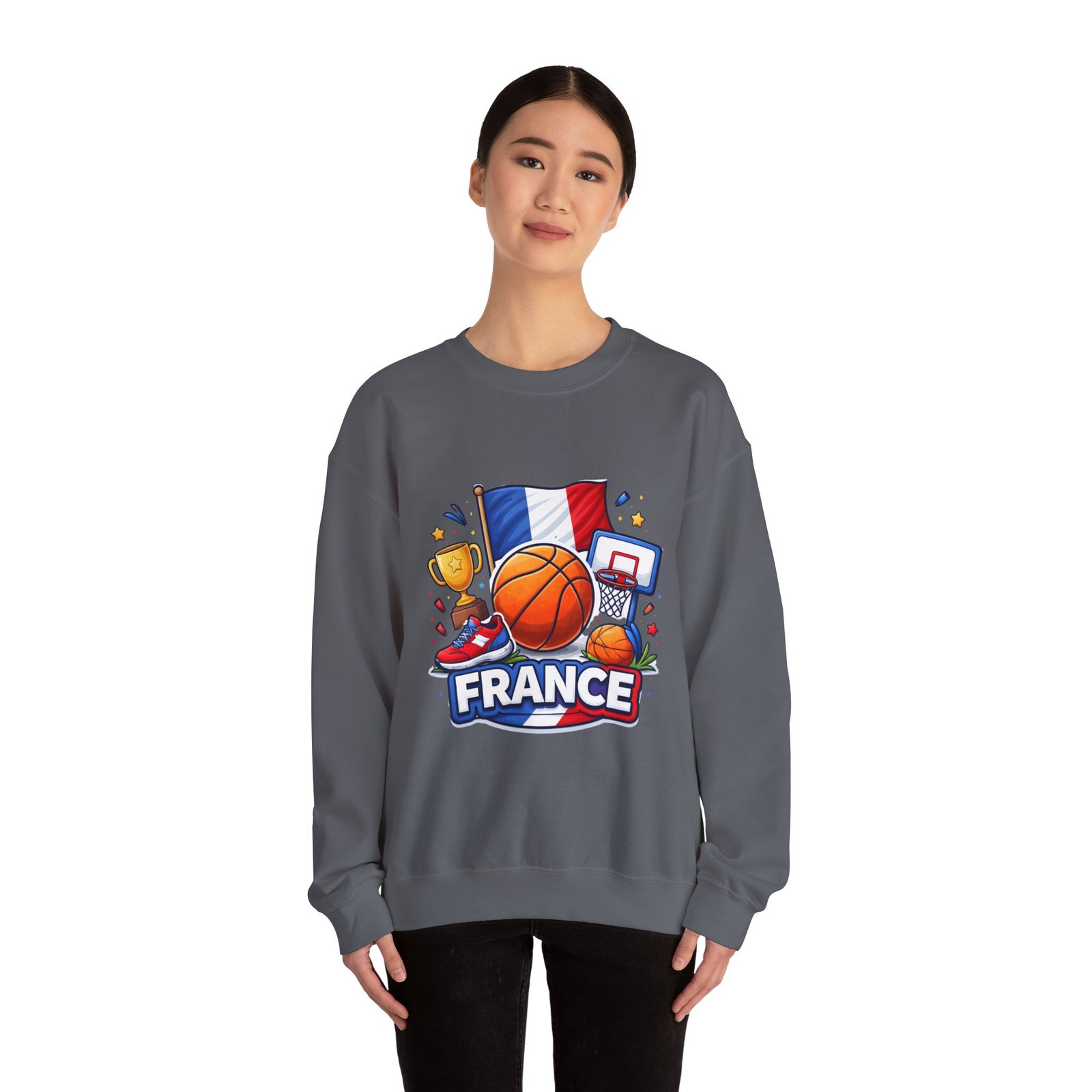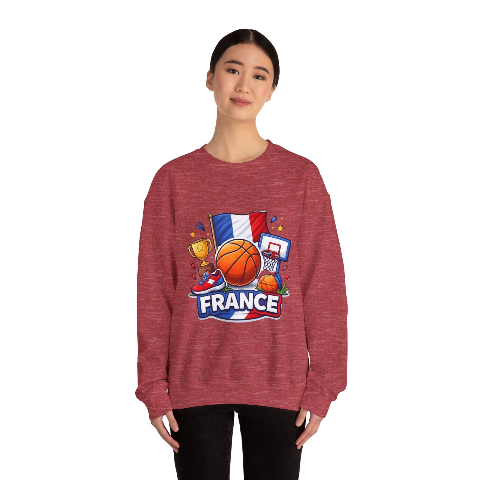 Pull on this soft, midweight crew and carry a little court-side energy everywhere you go. The sweatshirt’s clean white canvas puts a bold, playful France basketball graphic front-and-center — tricolor flag, sneaker, trophy and hoop clustered around a lively orange ball. It reads like a small celebration: game-night grit, national pride, and the easy confidence of someone who lives for pick-up games and match-day rituals. The classic crew cut and ribbed collar tuck the design into a relaxed silhouette that layers well over tees or under a coach jacket. It breaks in with you: the tubular knit eliminates side seams for a smoother drape, while double-needle stitching keeps the seams strong after many washes. Breathable cotton-poly balance and OEKO-TEX dyes mean it feels familiar and looks fresh long after the season ends.