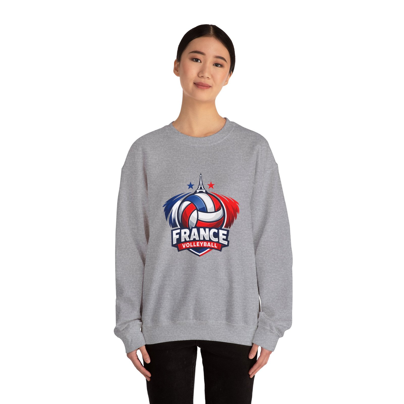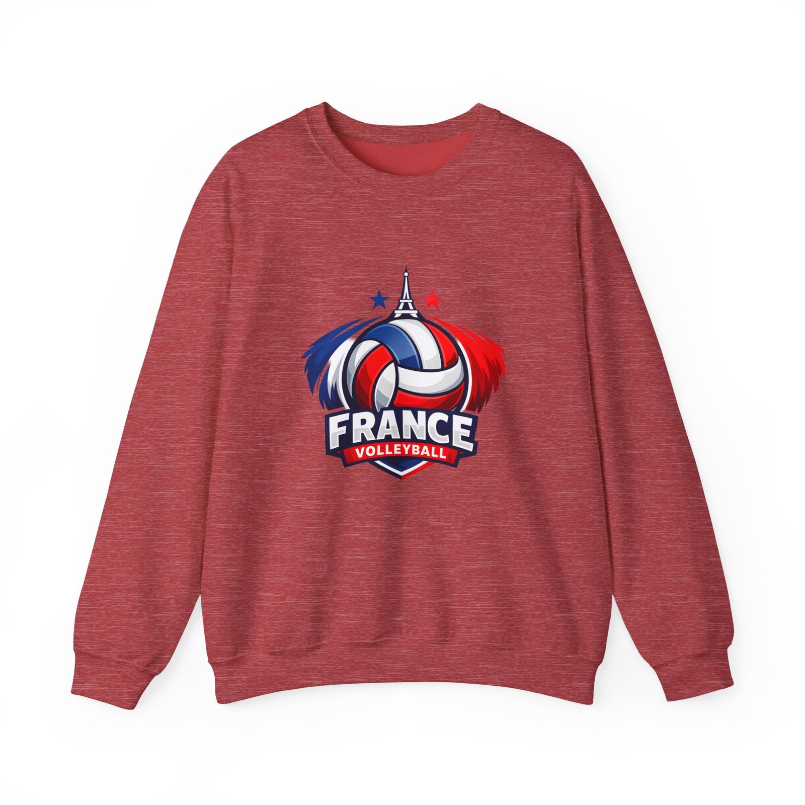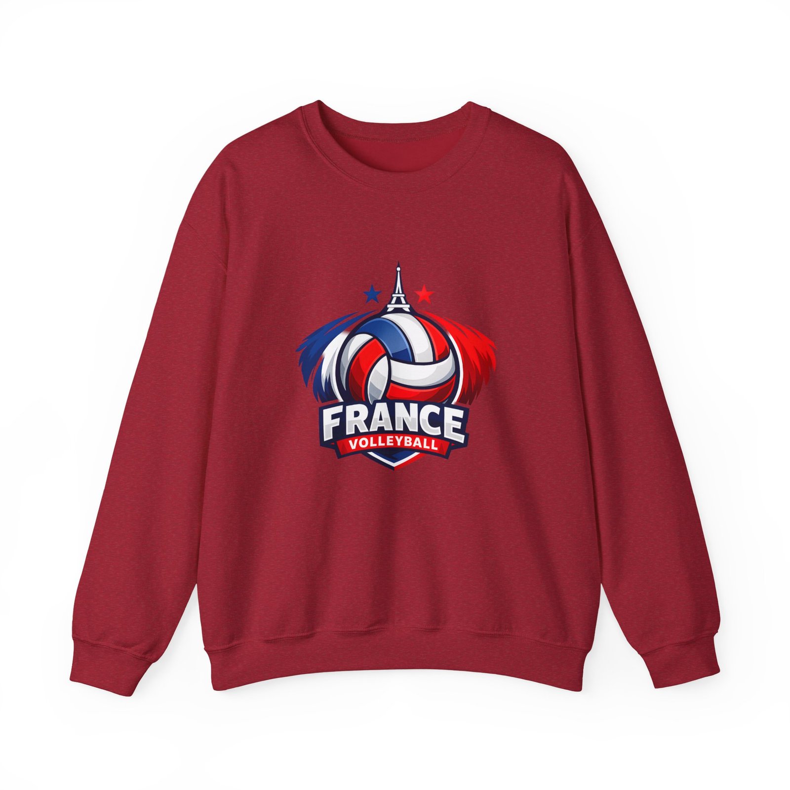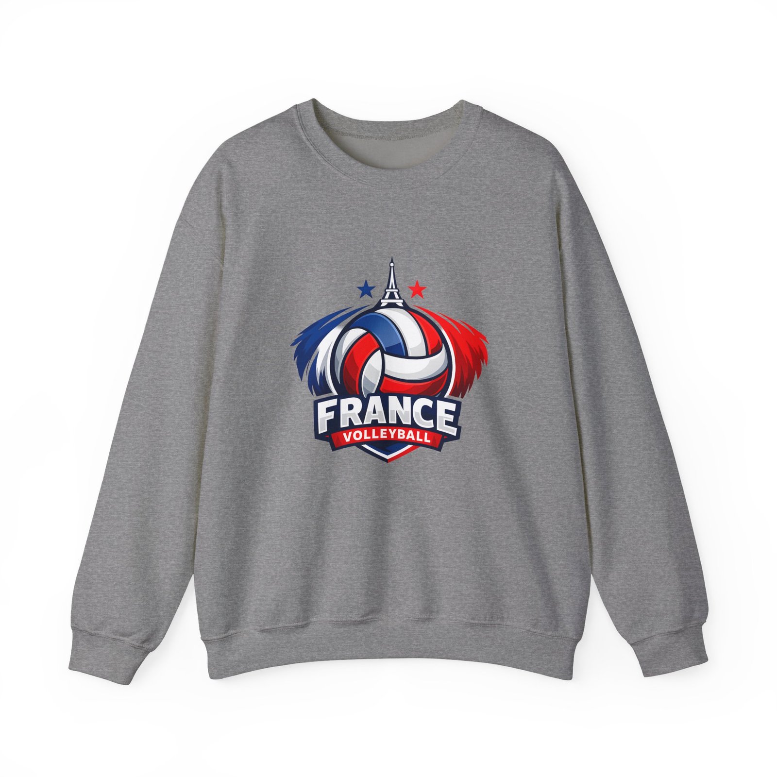 Soft, sturdy, and unapologetically proud — this crewneck brings the energy of the court into everyday wear. The front sports a bold France volleyball emblem in red, white, and blue, balanced by a clean, classic silhouette that layers easily. Slip it on after practice, before a match, or on a chilly morning cheering from the stands; the medium-heavy cotton-poly blend keeps you warm without feeling bulky. Thoughtful details like a ribbed knit collar, tear-away inner label, and flat, durable seams mean it wears like a favorite from day one. Embroidery or printed neck/wrist accents add a touch of team identity or personal flair.