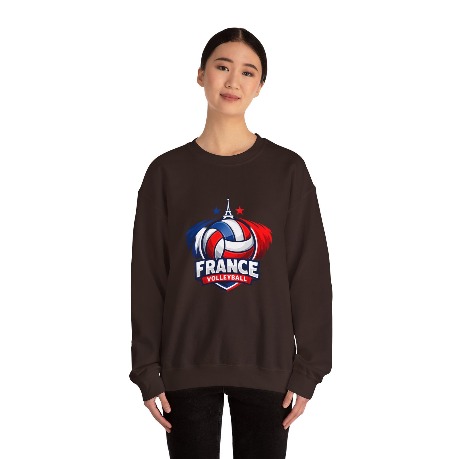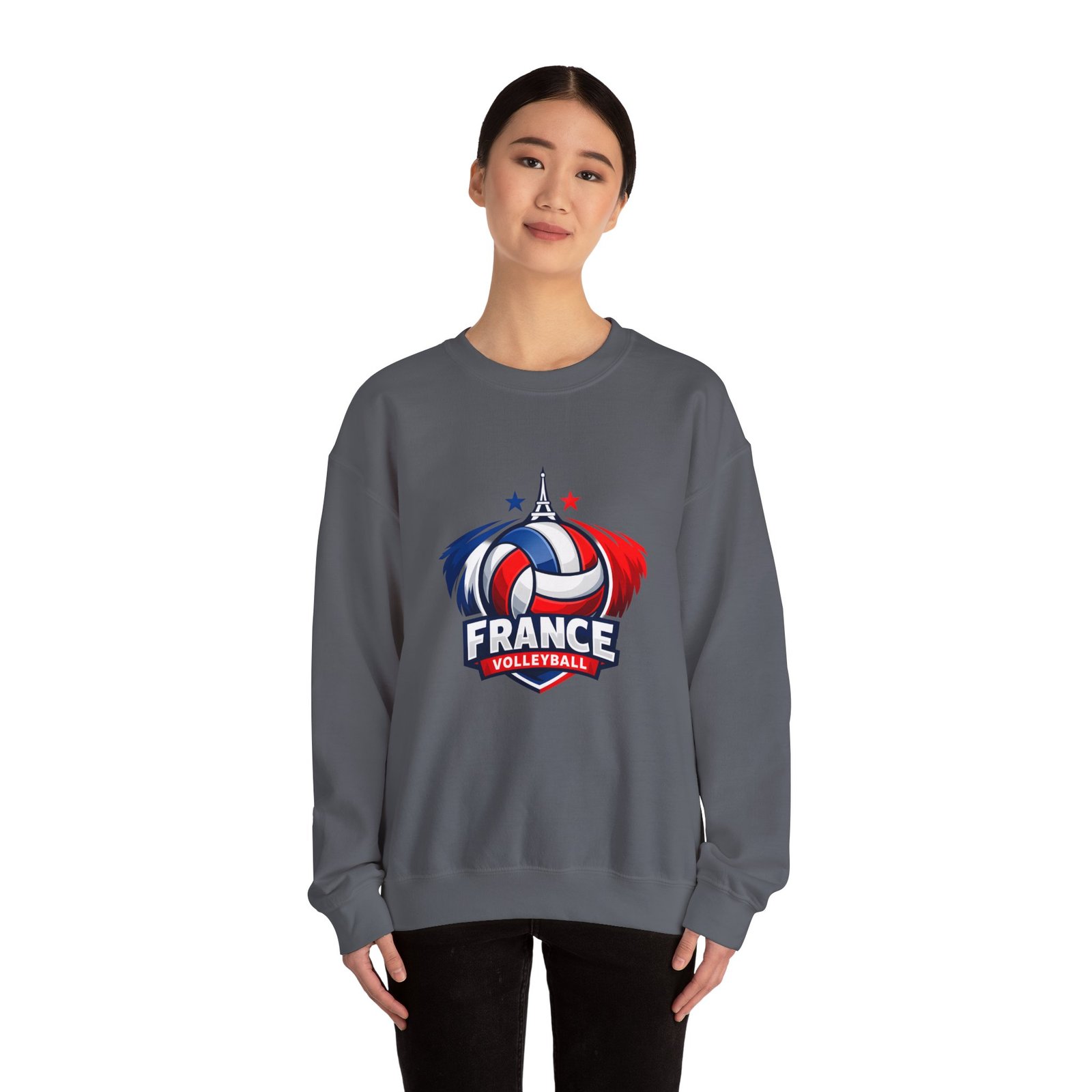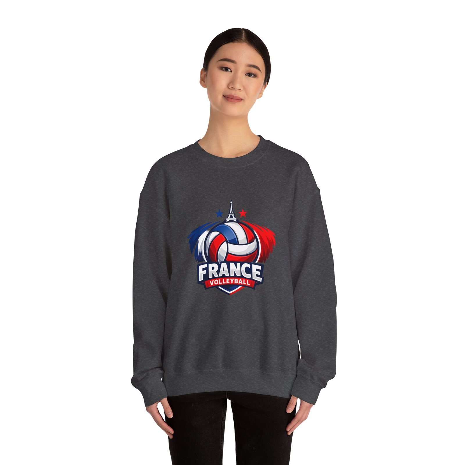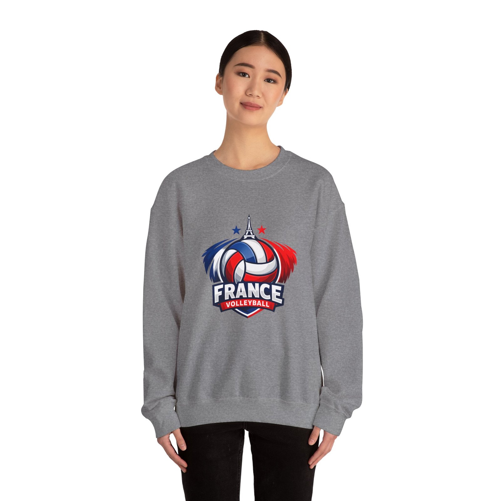 Soft, sturdy, and unapologetically proud — this crewneck brings the energy of the court into everyday wear. The front sports a bold France volleyball emblem in red, white, and blue, balanced by a clean, classic silhouette that layers easily. Slip it on after practice, before a match, or on a chilly morning cheering from the stands; the medium-heavy cotton-poly blend keeps you warm without feeling bulky. Thoughtful details like a ribbed knit collar, tear-away inner label, and flat, durable seams mean it wears like a favorite from day one. Embroidery or printed neck/wrist accents add a touch of team identity or personal flair.