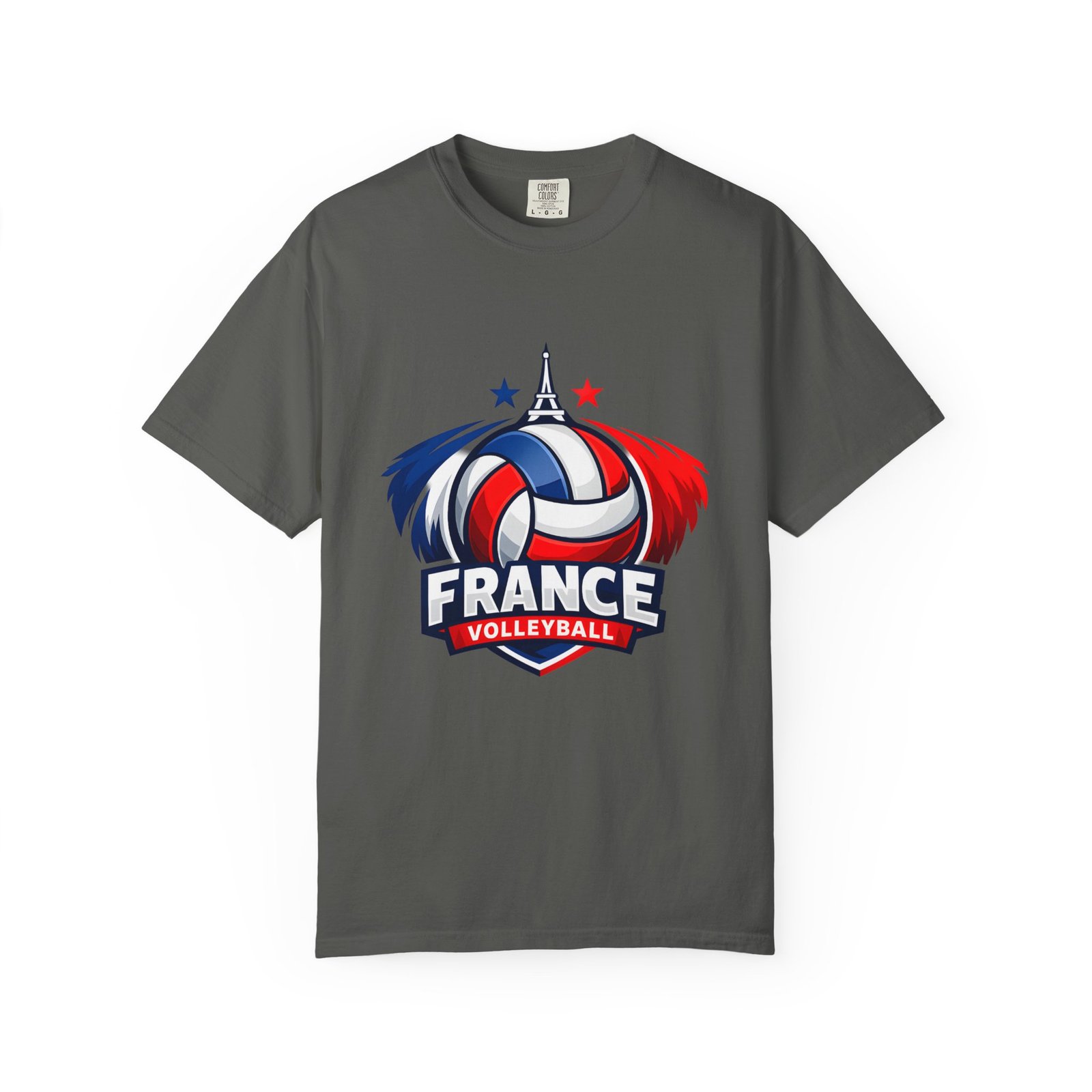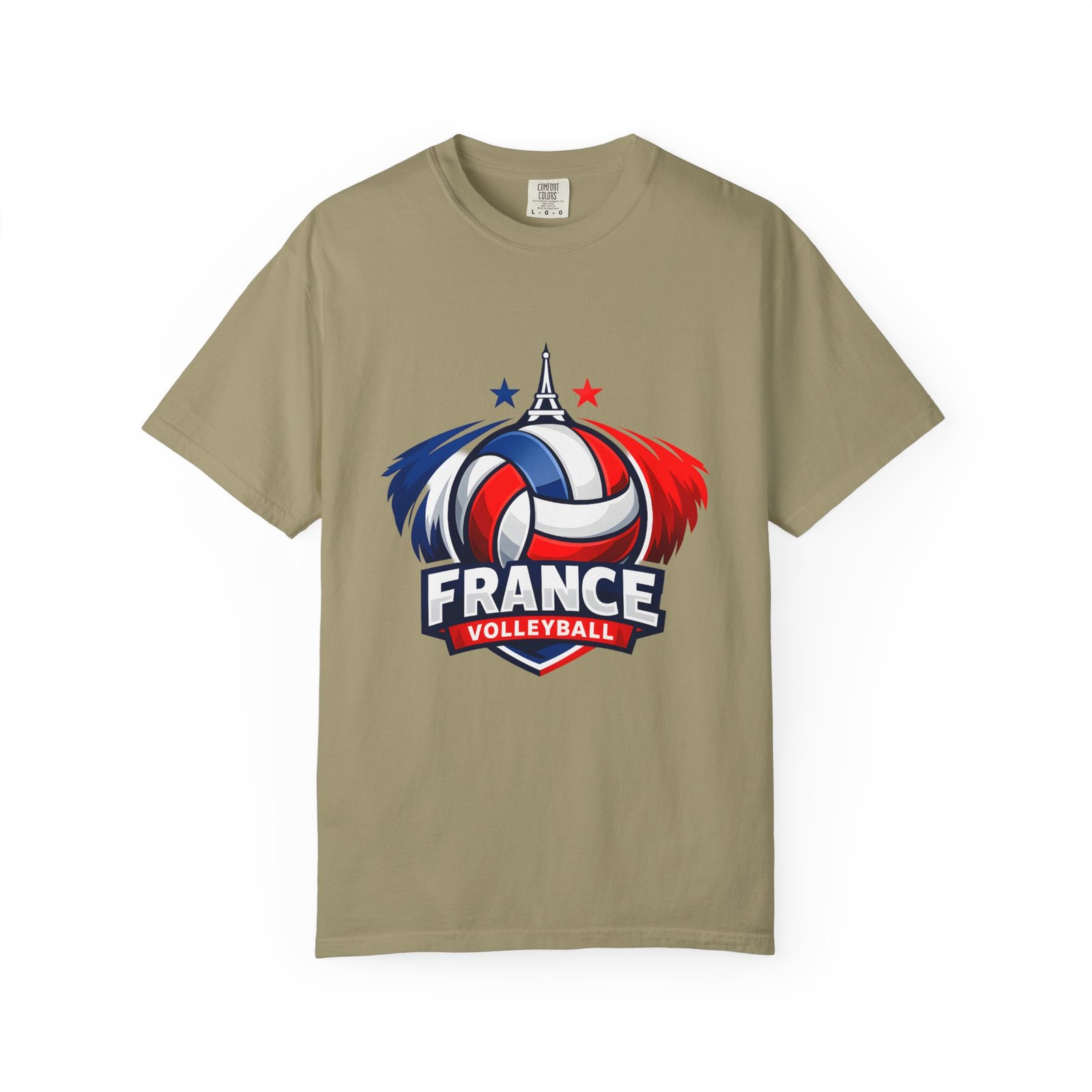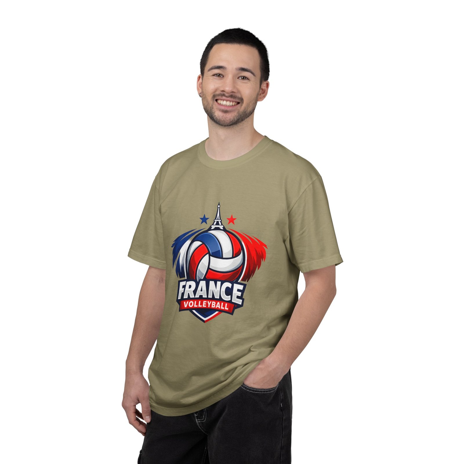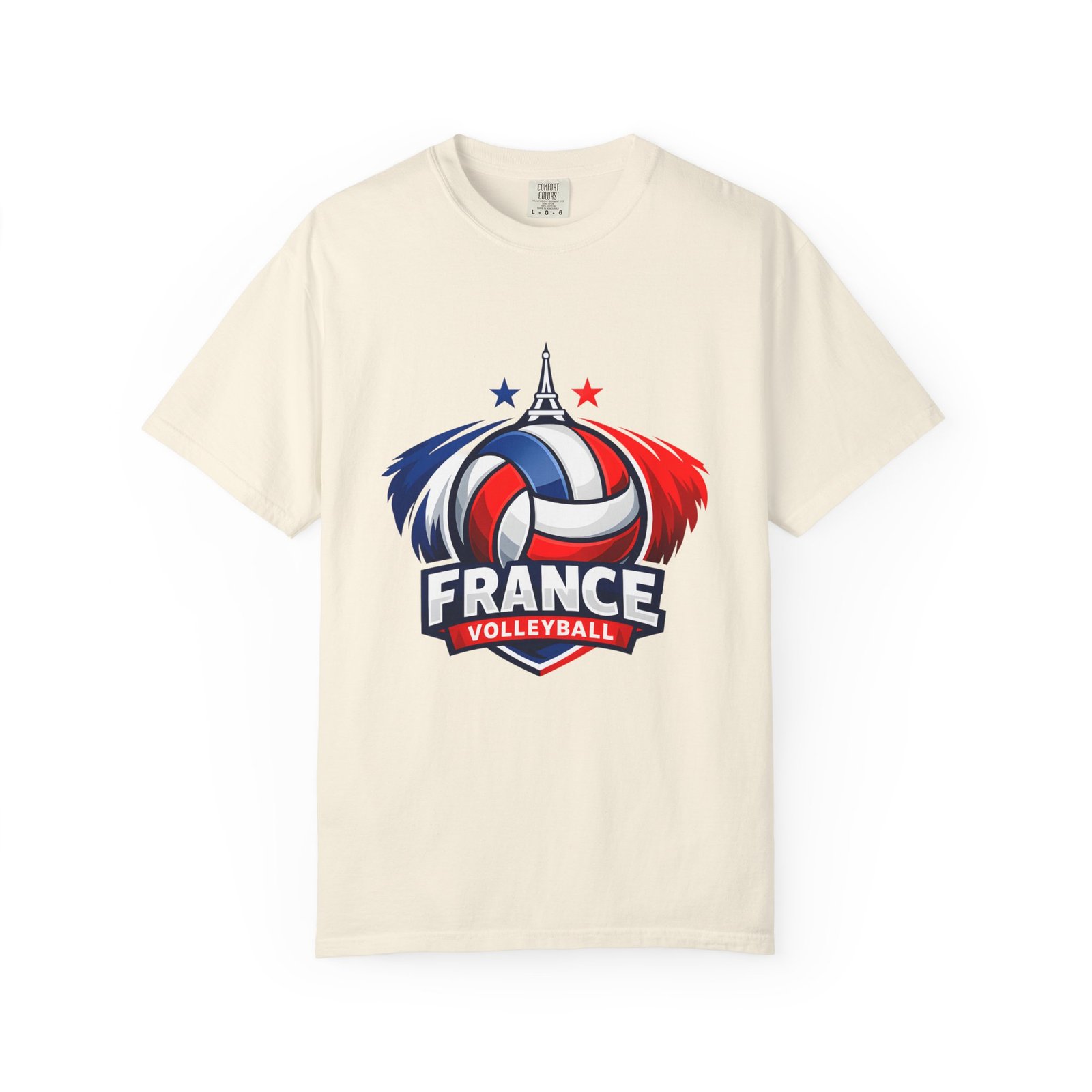 Lightweight but substantial, this garment-dyed tee carries the energy of the court and the pride of France in every stitch. A bold volleyball crest in blue, white and red sits over the chest beneath a subtle Eiffel Tower silhouette—clean, athletic, and unmistakably national. The fabric is soft from the garment-dye process and built to last with double-needle seams and a tubular, seam-free body that drapes in a relaxed, comfortable way. Wear it to practice, to a local match, or while cheering from the stands; it moves easily with you and holds its color and shape through many washes.