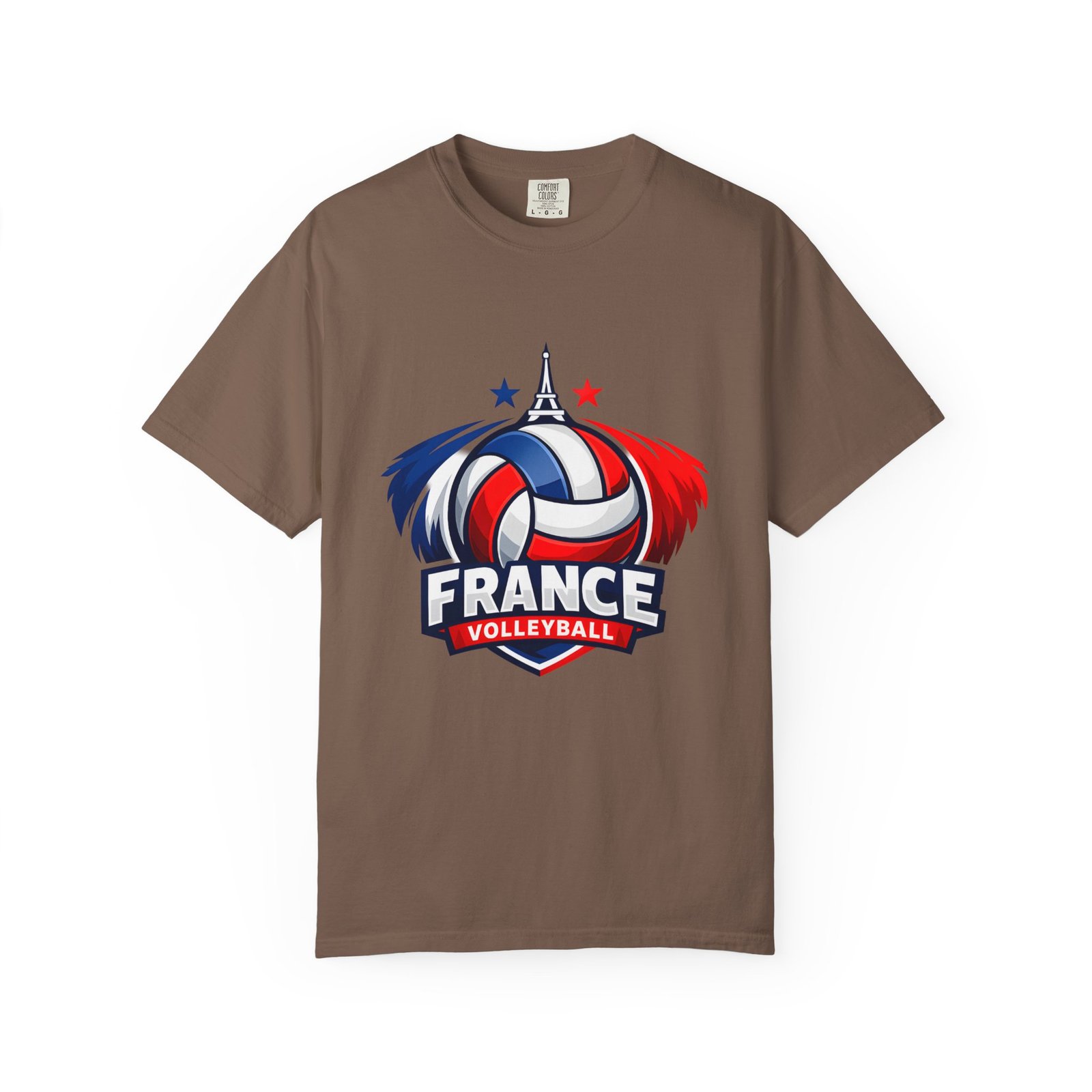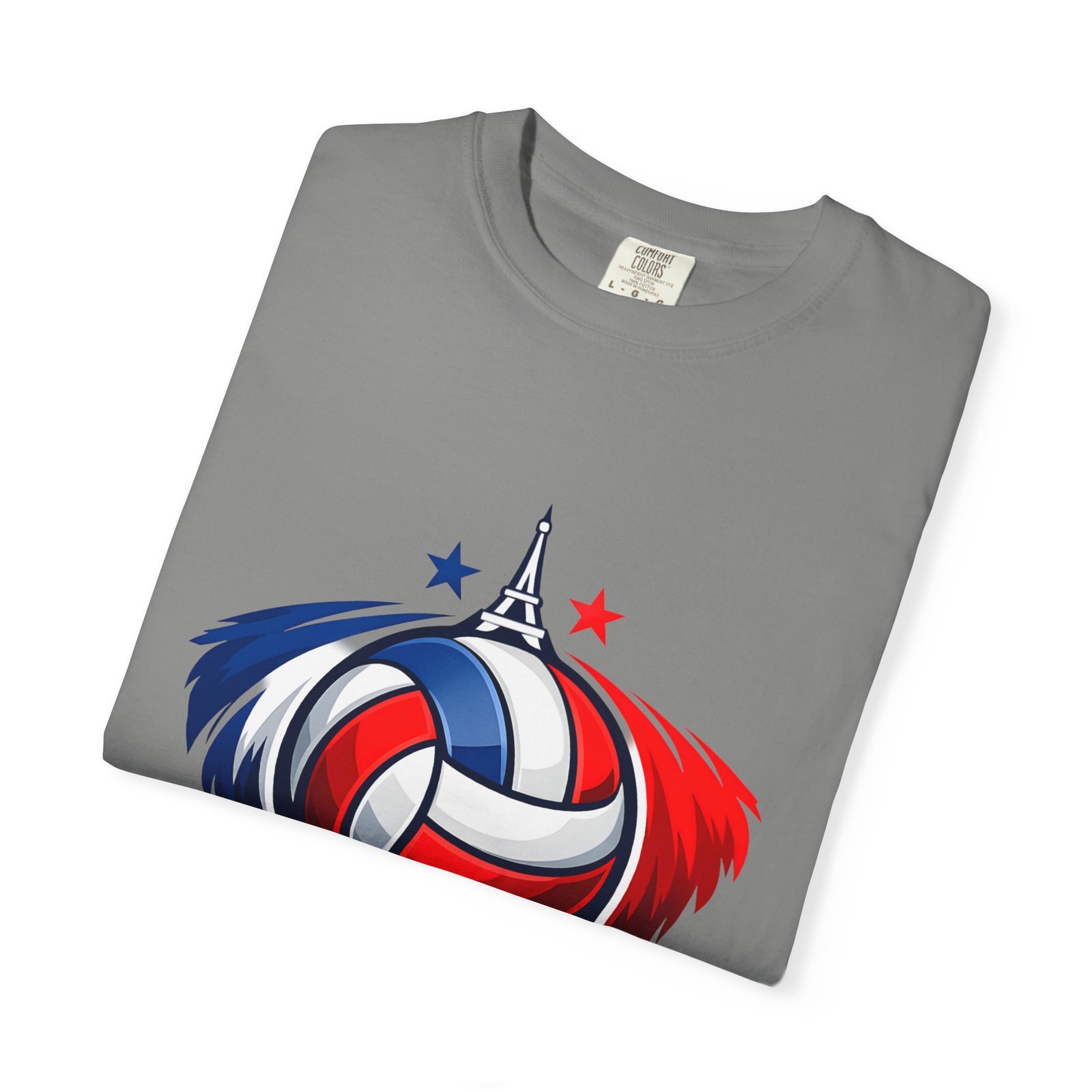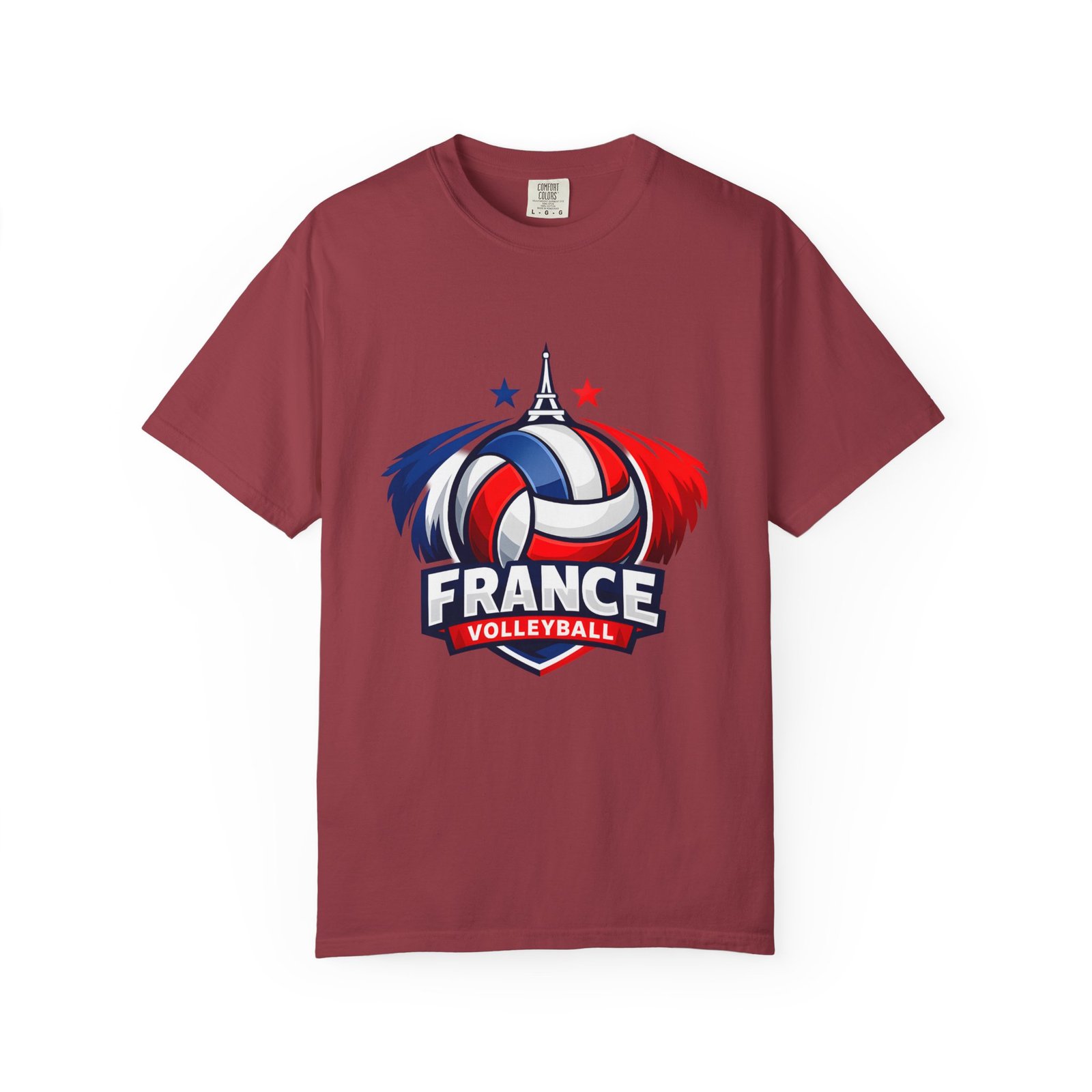 Lightweight but substantial, this garment-dyed tee carries the energy of the court and the pride of France in every stitch. A bold volleyball crest in blue, white and red sits over the chest beneath a subtle Eiffel Tower silhouette—clean, athletic, and unmistakably national. The fabric is soft from the garment-dye process and built to last with double-needle seams and a tubular, seam-free body that drapes in a relaxed, comfortable way. Wear it to practice, to a local match, or while cheering from the stands; it moves easily with you and holds its color and shape through many washes.