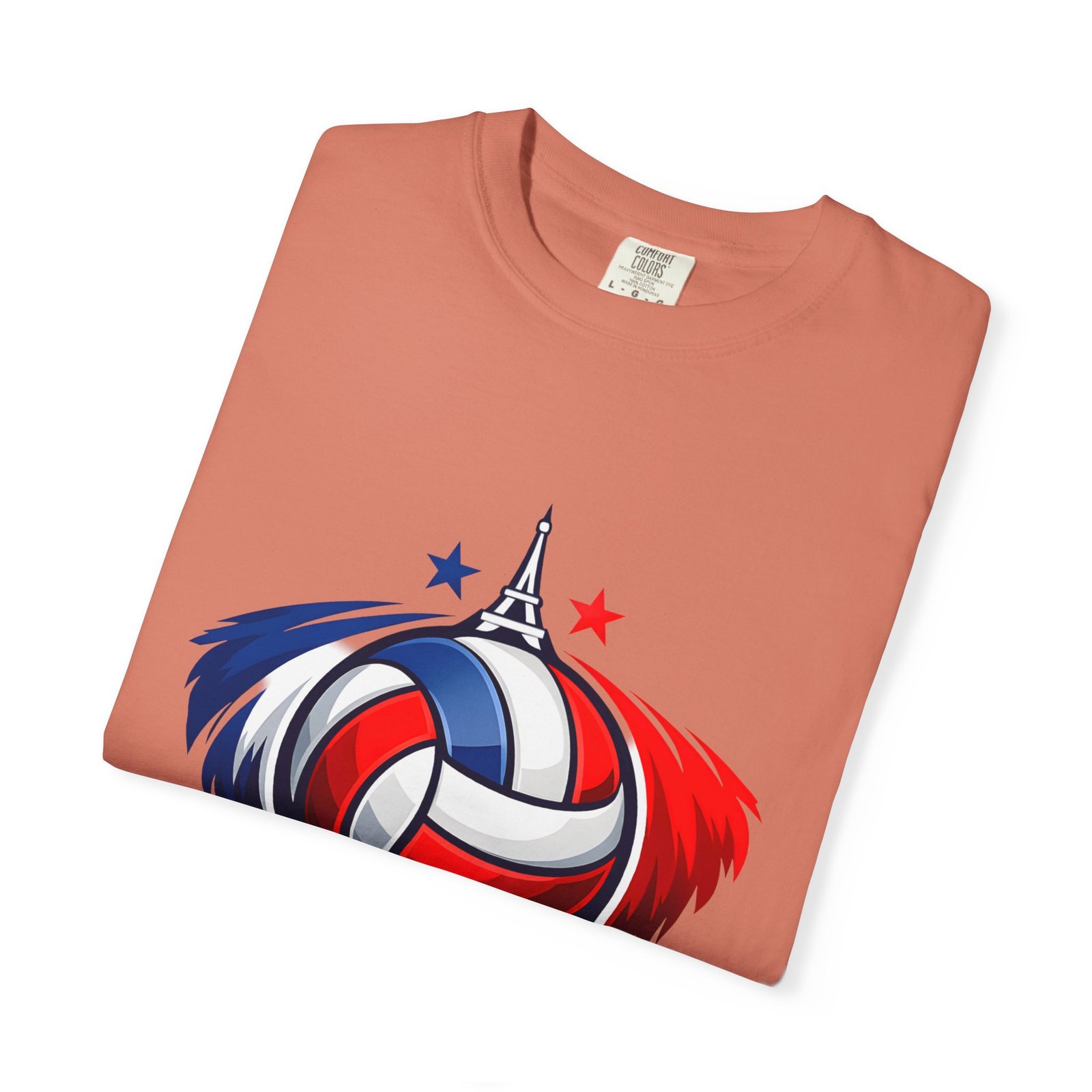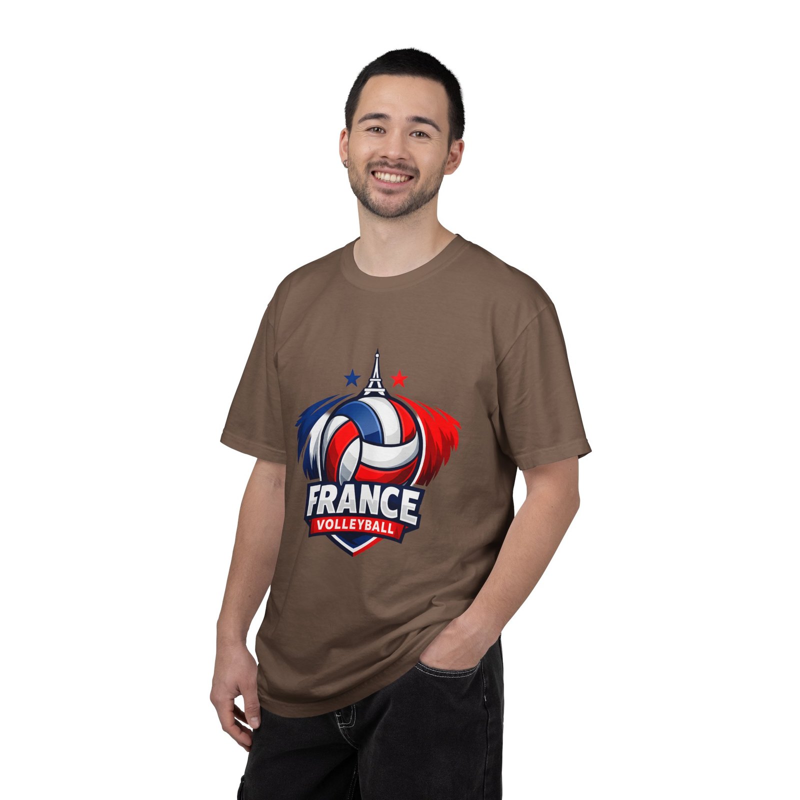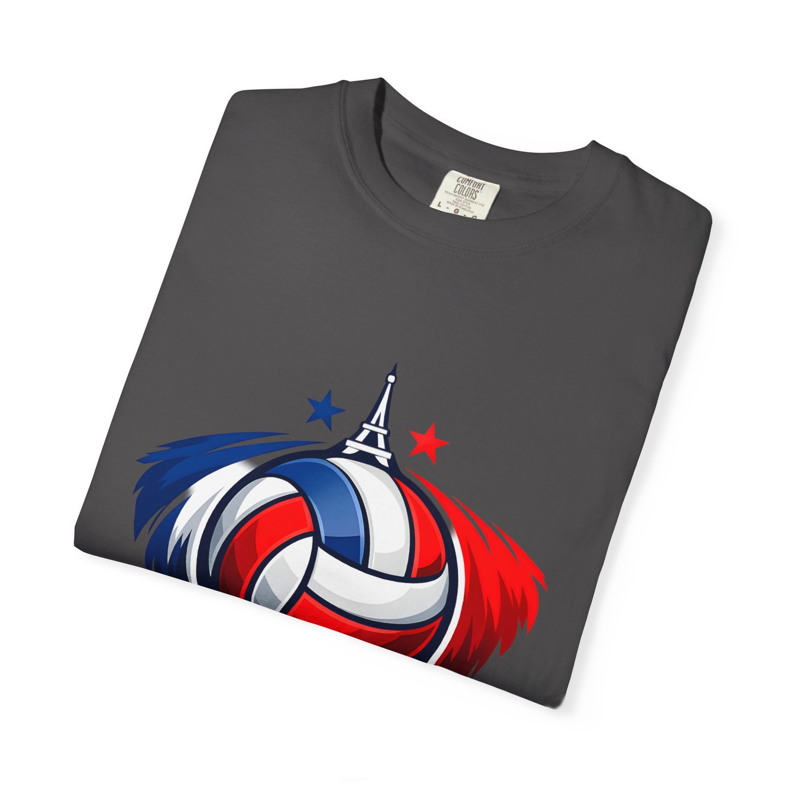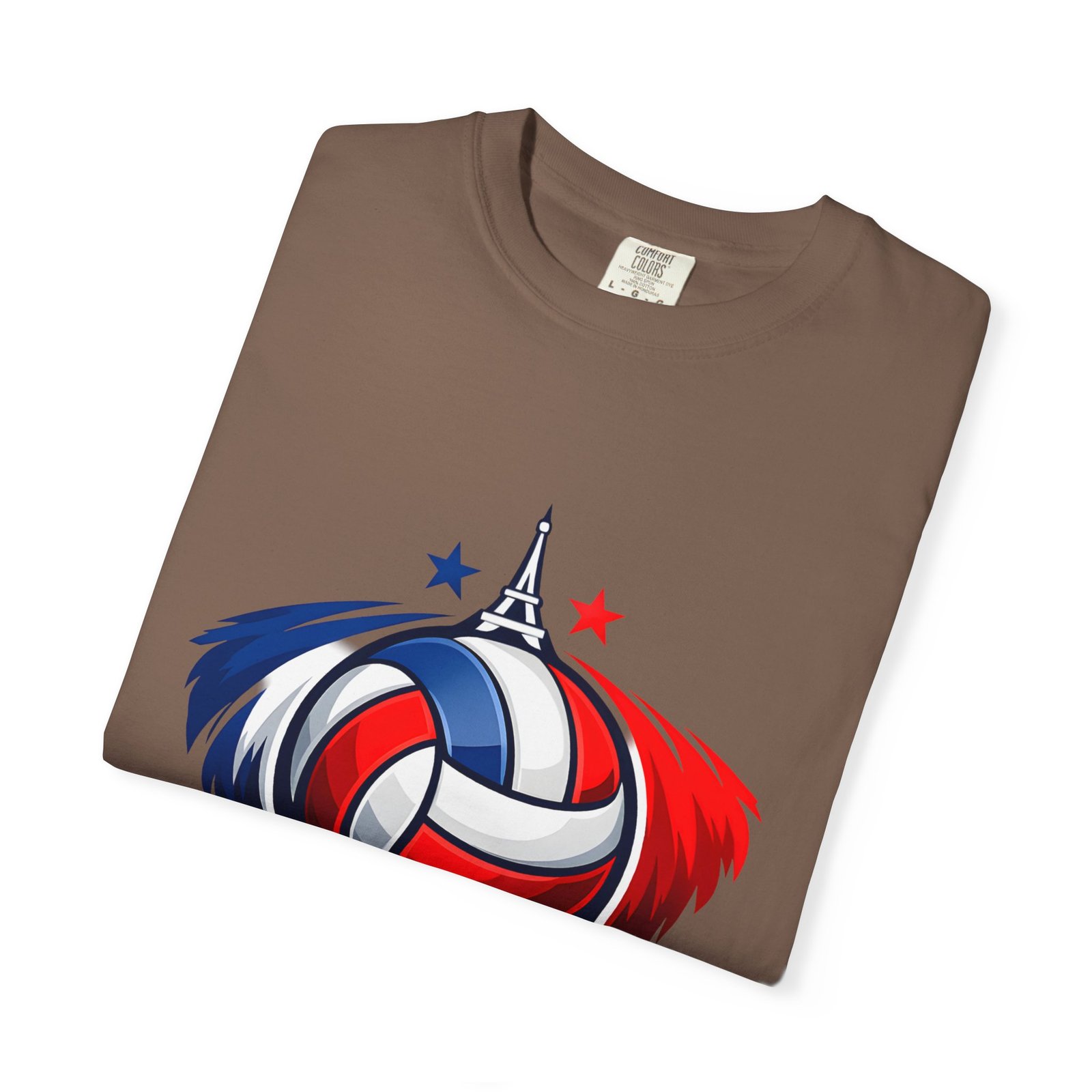 Lightweight but substantial, this garment-dyed tee carries the energy of the court and the pride of France in every stitch. A bold volleyball crest in blue, white and red sits over the chest beneath a subtle Eiffel Tower silhouette—clean, athletic, and unmistakably national. The fabric is soft from the garment-dye process and built to last with double-needle seams and a tubular, seam-free body that drapes in a relaxed, comfortable way. Wear it to practice, to a local match, or while cheering from the stands; it moves easily with you and holds its color and shape through many washes.