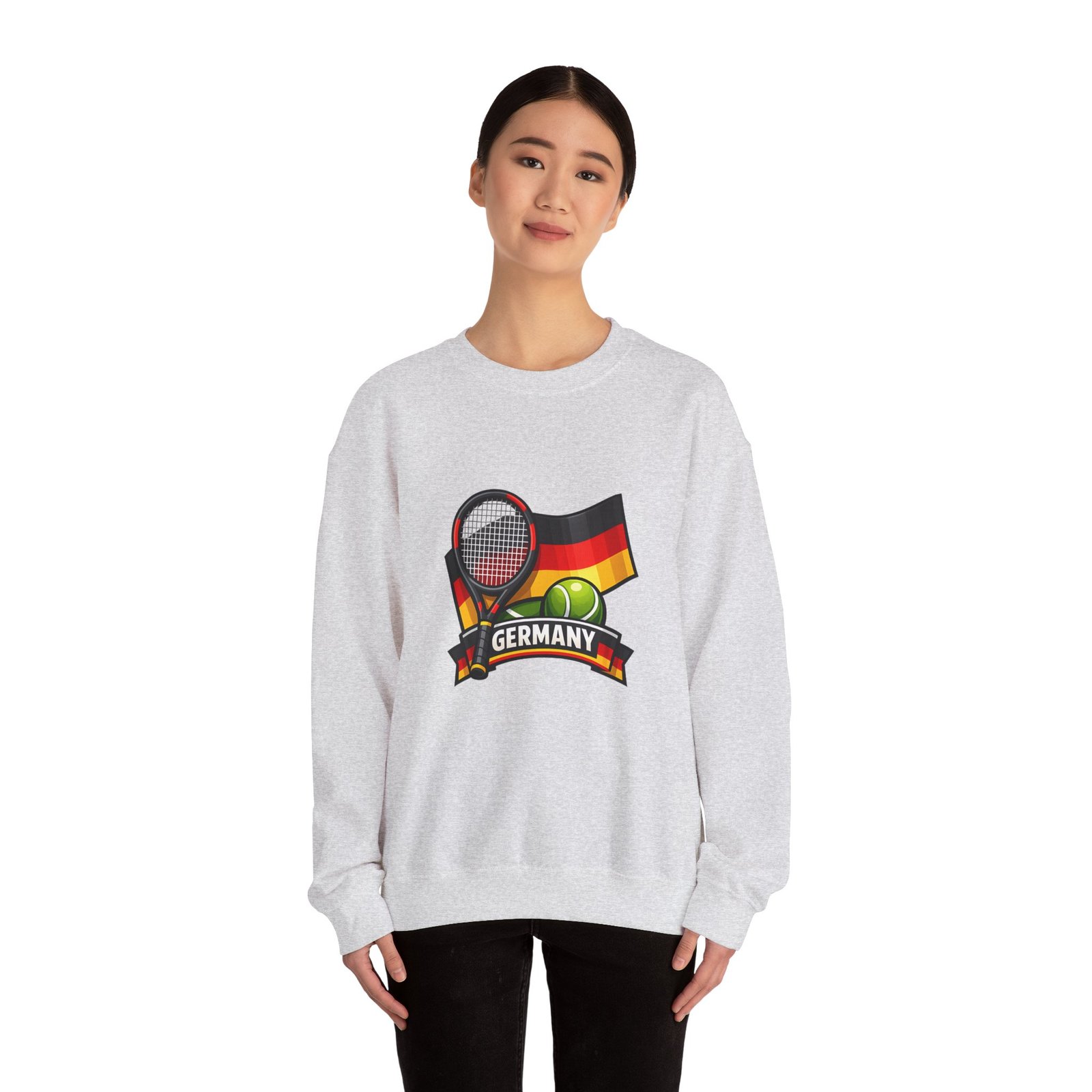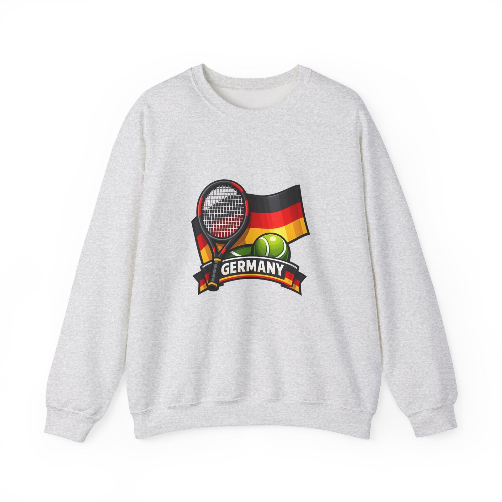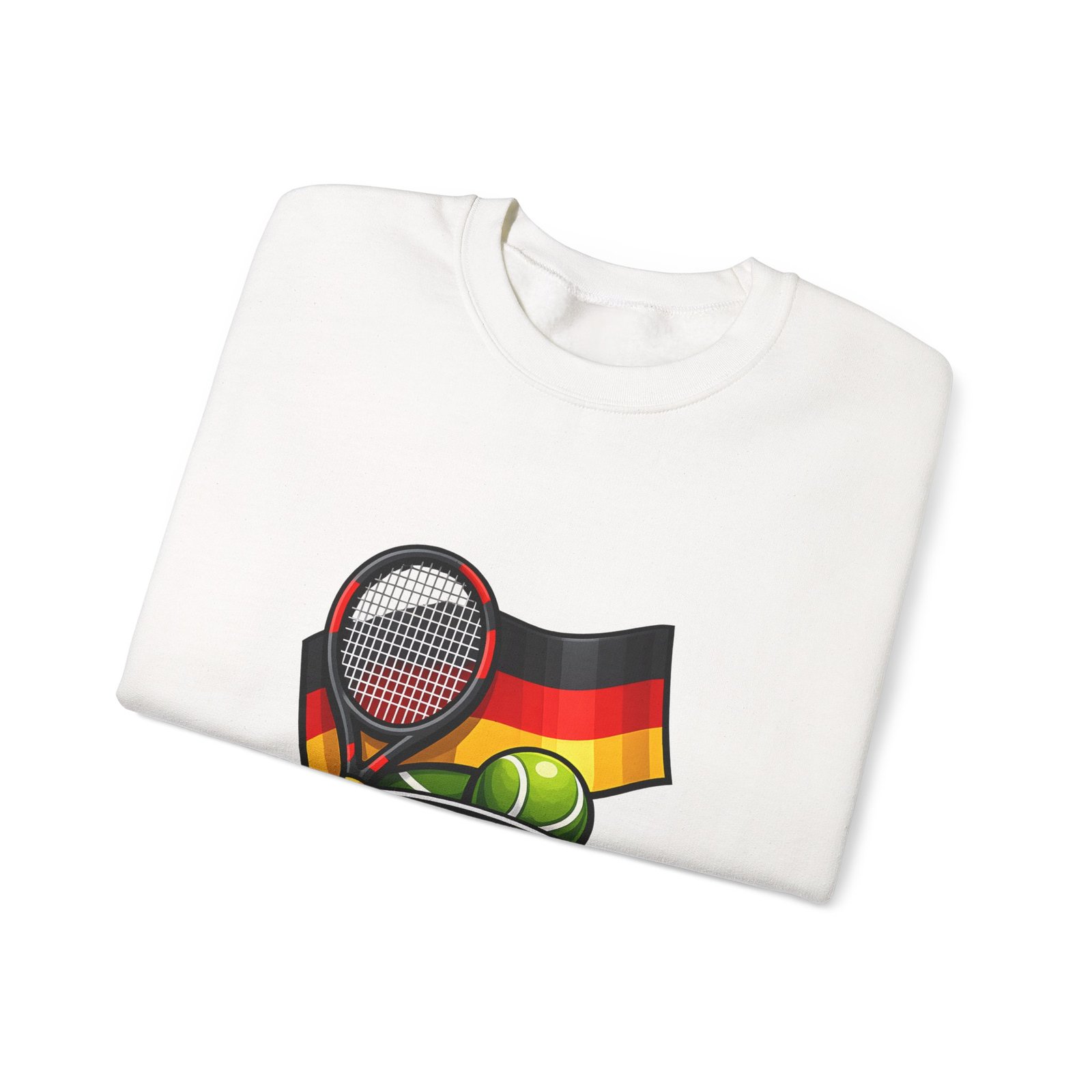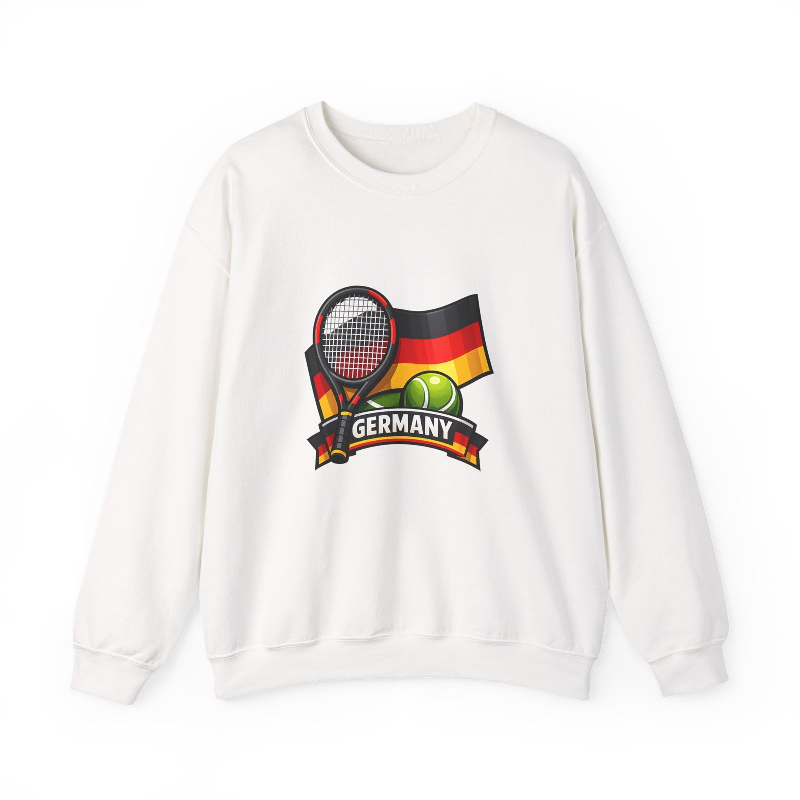 A soft, midweight crewneck that carries quiet pride for Germany and a love of tennis. The clean white sweatshirt showcases a vibrant embroidered-style emblem — a tennis racket, ball, and Germany’s flag in bold, warm colors — placed on the chest for a sporty, heritage feel. Wear it to crisp early-morning practices, casual match days with friends, or weekend walks through the city; it layers easily under a jacket or stands on its own when you want comfortable coverage and a touch of team spirit. The fabric has a substantial hand without feeling stiff, and thoughtful construction details — ribbed collar, cuffs, and hem plus double-needle stitching — keep the shape after many wears. It reads like a teammate’s sweater: familiar, durable, and quietly proud.