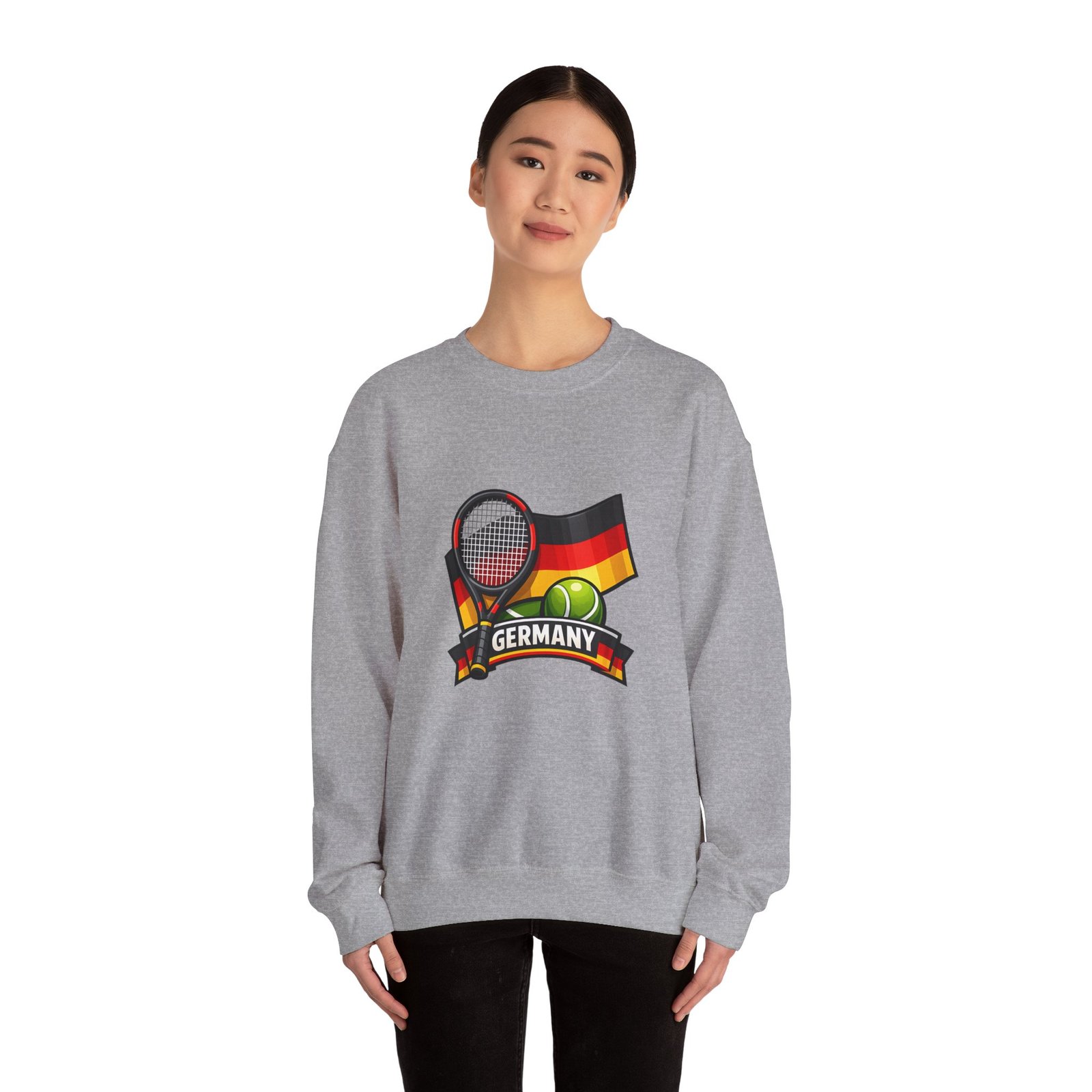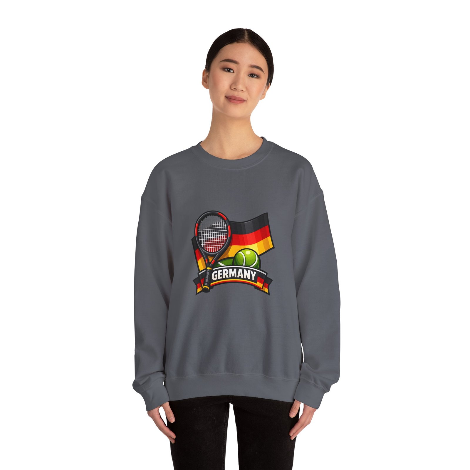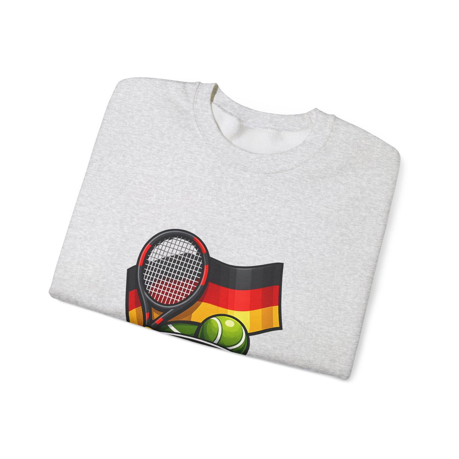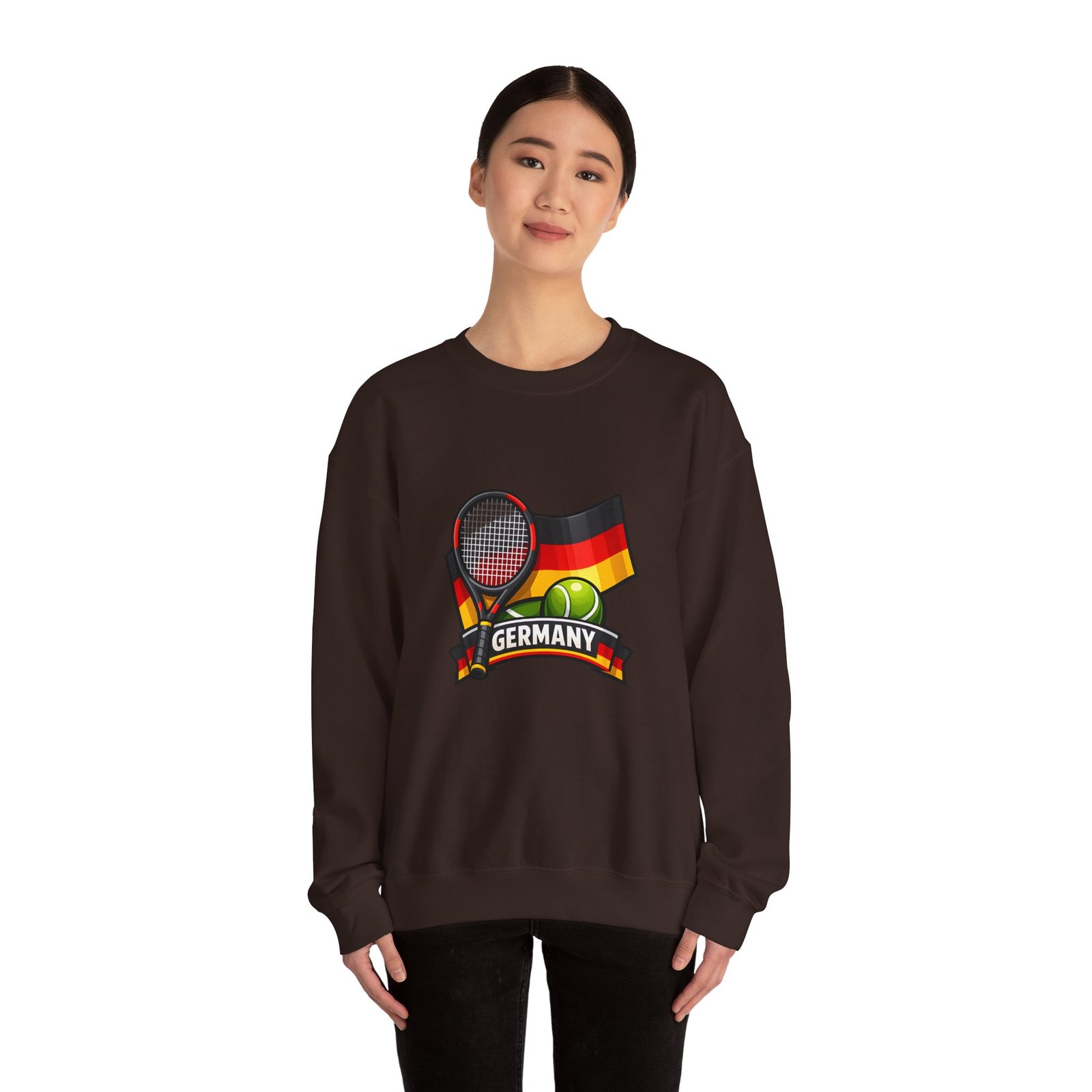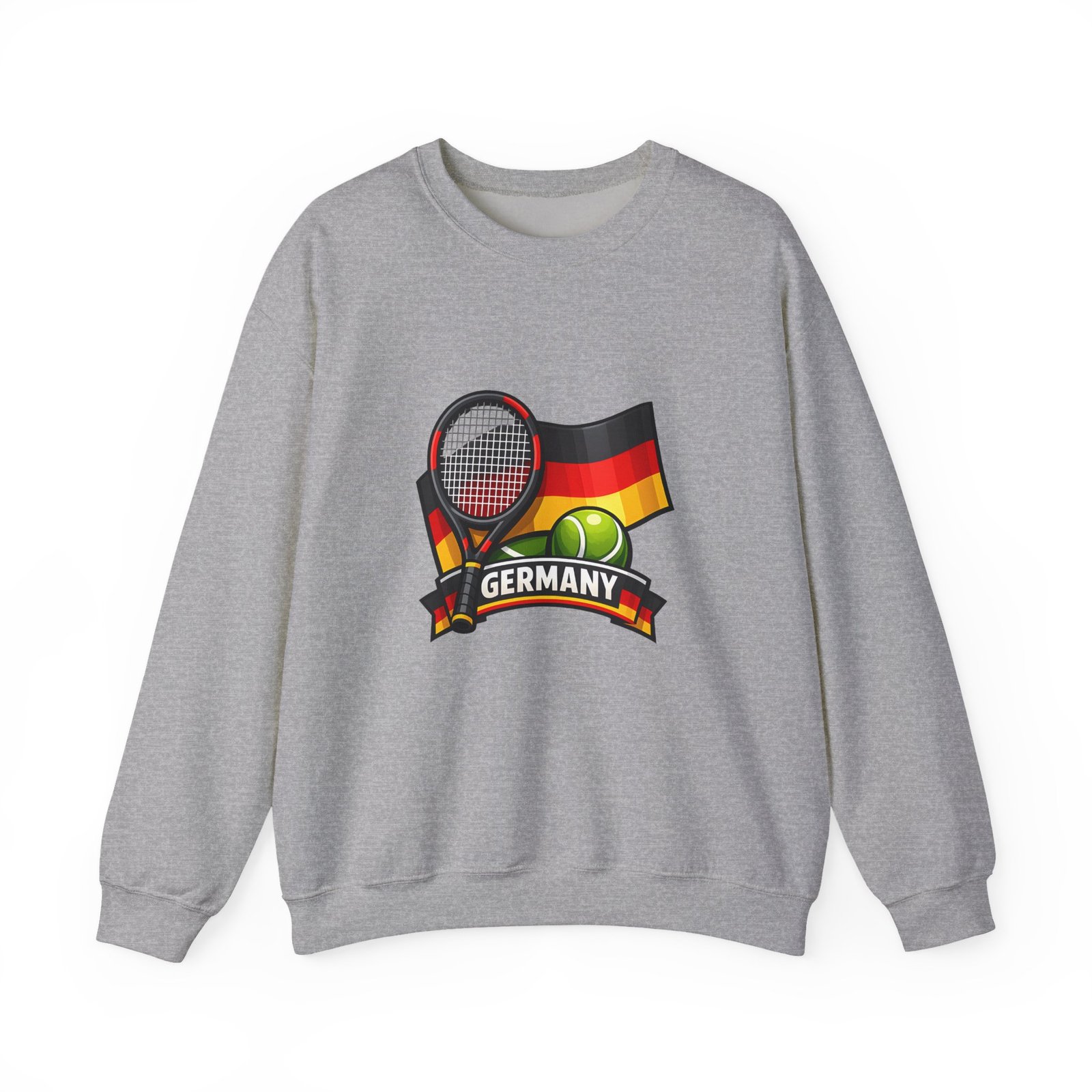 A soft, midweight crewneck that carries quiet pride for Germany and a love of tennis. The clean white sweatshirt showcases a vibrant embroidered-style emblem — a tennis racket, ball, and Germany’s flag in bold, warm colors — placed on the chest for a sporty, heritage feel. Wear it to crisp early-morning practices, casual match days with friends, or weekend walks through the city; it layers easily under a jacket or stands on its own when you want comfortable coverage and a touch of team spirit. The fabric has a substantial hand without feeling stiff, and thoughtful construction details — ribbed collar, cuffs, and hem plus double-needle stitching — keep the shape after many wears. It reads like a teammate’s sweater: familiar, durable, and quietly proud.