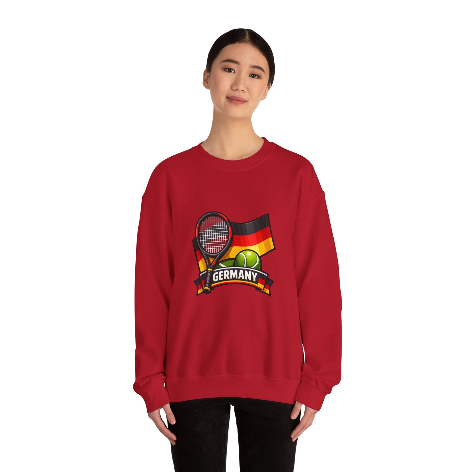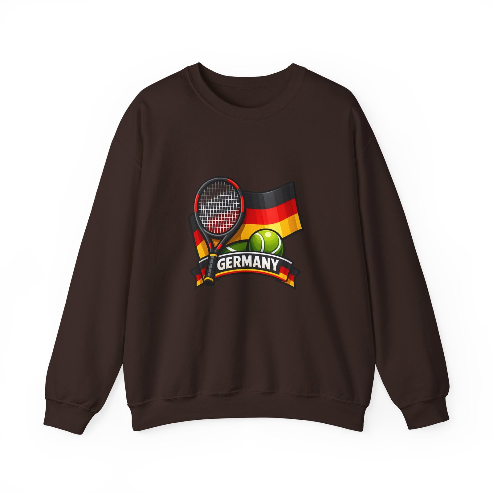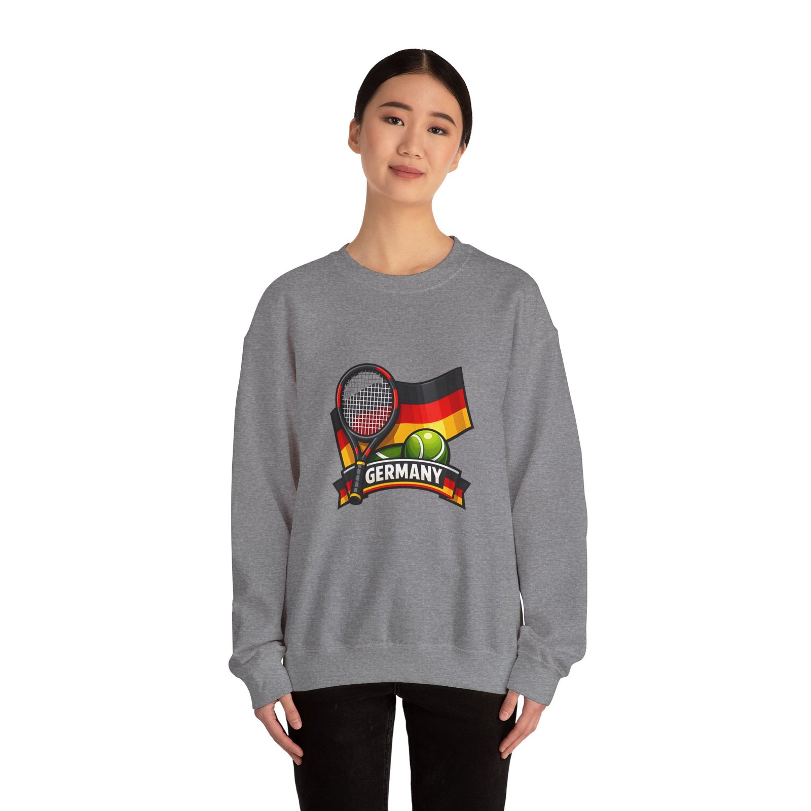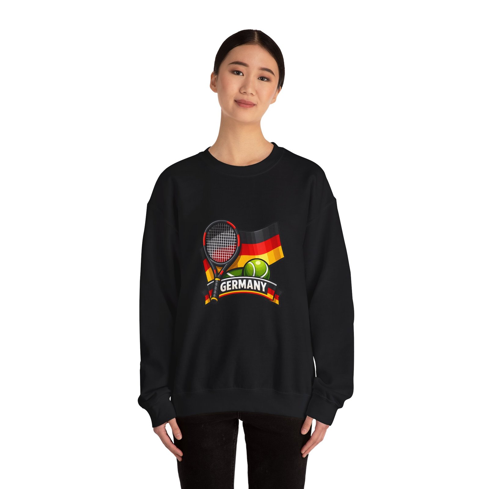 A soft, midweight crewneck that carries quiet pride for Germany and a love of tennis. The clean white sweatshirt showcases a vibrant embroidered-style emblem — a tennis racket, ball, and Germany’s flag in bold, warm colors — placed on the chest for a sporty, heritage feel. Wear it to crisp early-morning practices, casual match days with friends, or weekend walks through the city; it layers easily under a jacket or stands on its own when you want comfortable coverage and a touch of team spirit. The fabric has a substantial hand without feeling stiff, and thoughtful construction details — ribbed collar, cuffs, and hem plus double-needle stitching — keep the shape after many wears. It reads like a teammate’s sweater: familiar, durable, and quietly proud.