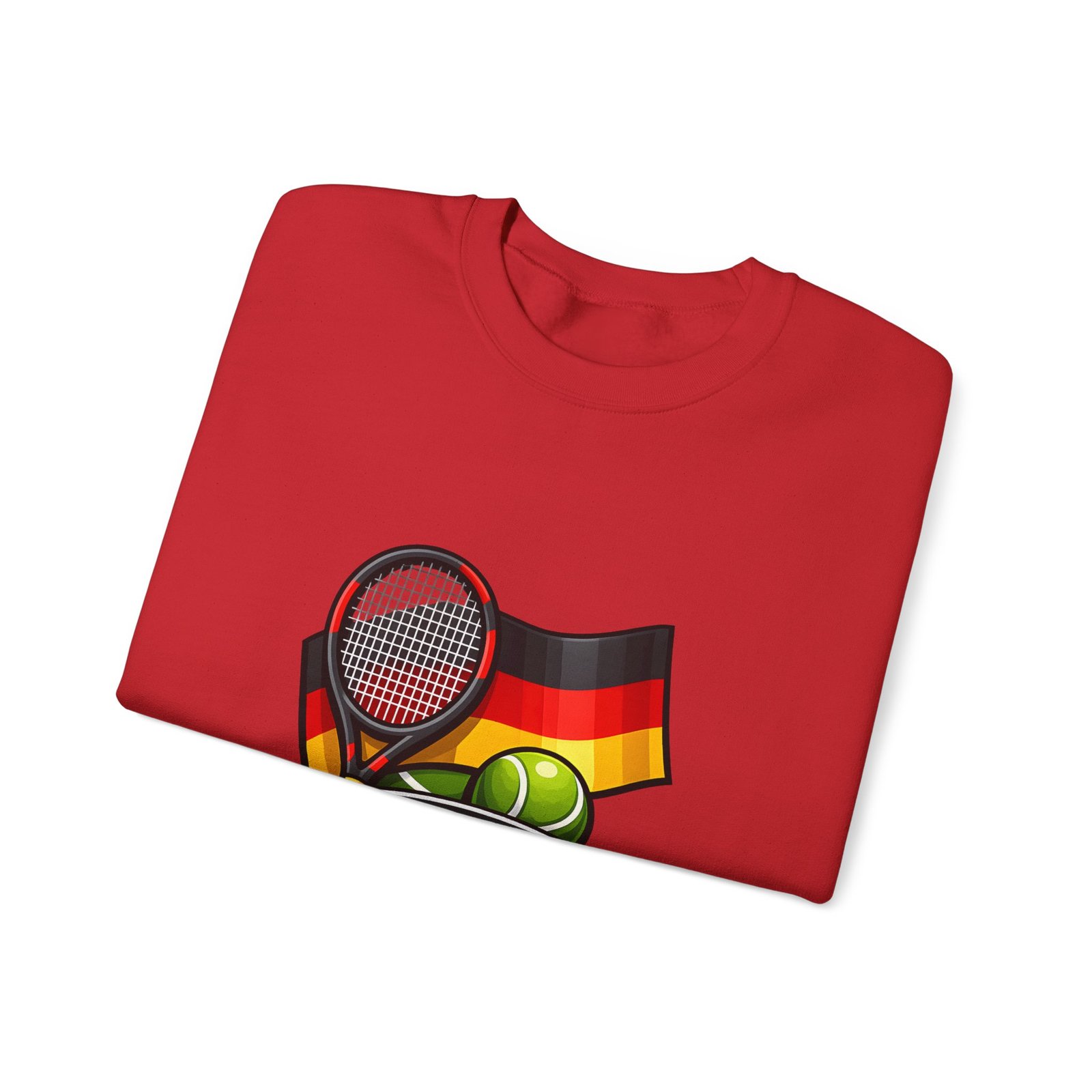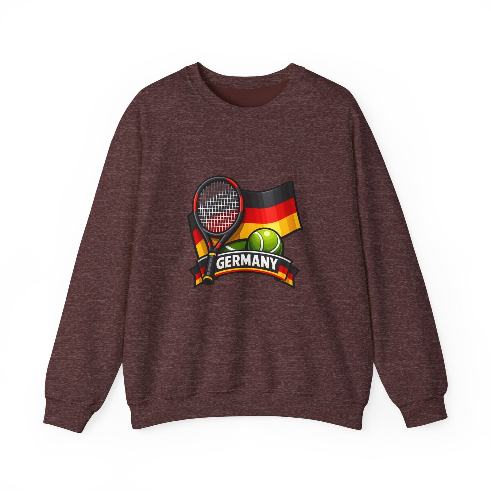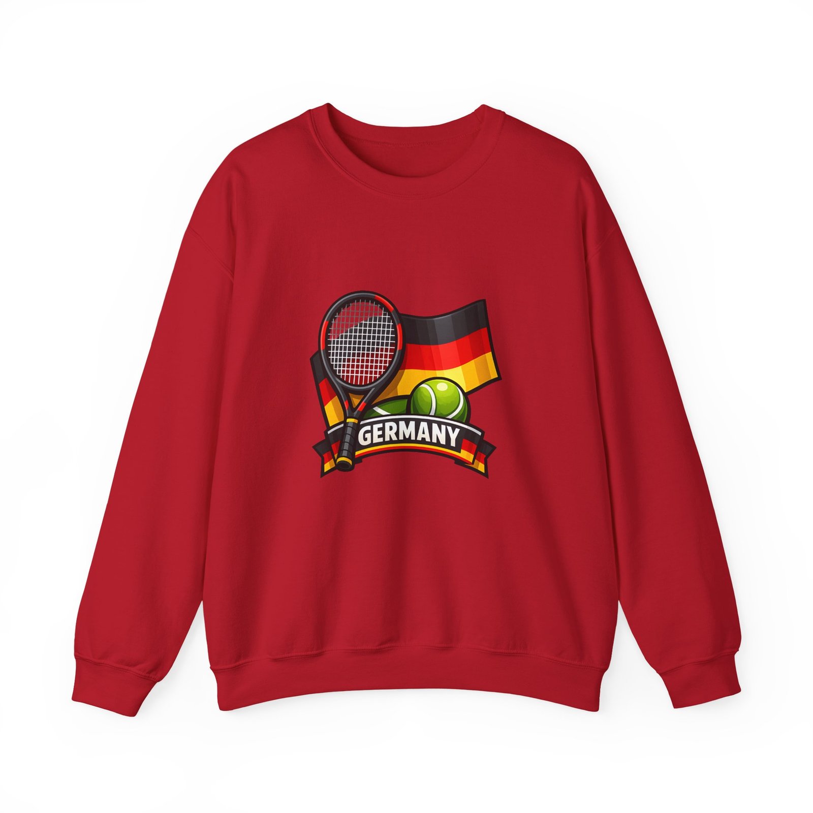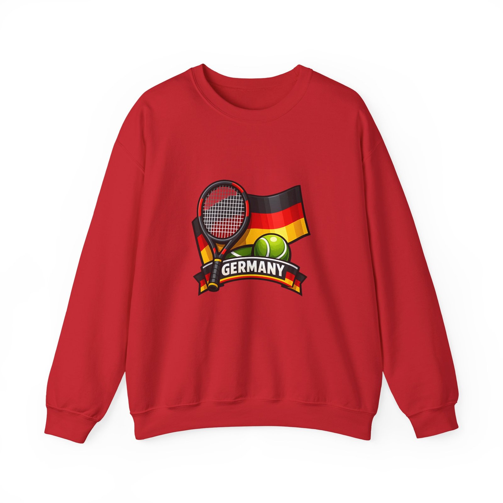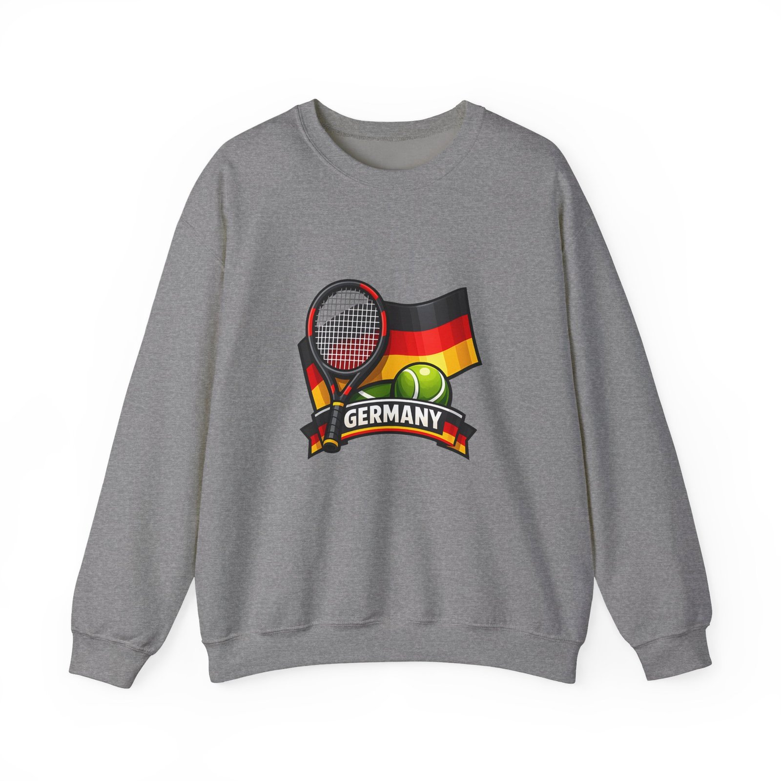 A soft, midweight crewneck that carries quiet pride for Germany and a love of tennis. The clean white sweatshirt showcases a vibrant embroidered-style emblem — a tennis racket, ball, and Germany’s flag in bold, warm colors — placed on the chest for a sporty, heritage feel. Wear it to crisp early-morning practices, casual match days with friends, or weekend walks through the city; it layers easily under a jacket or stands on its own when you want comfortable coverage and a touch of team spirit. The fabric has a substantial hand without feeling stiff, and thoughtful construction details — ribbed collar, cuffs, and hem plus double-needle stitching — keep the shape after many wears. It reads like a teammate’s sweater: familiar, durable, and quietly proud.