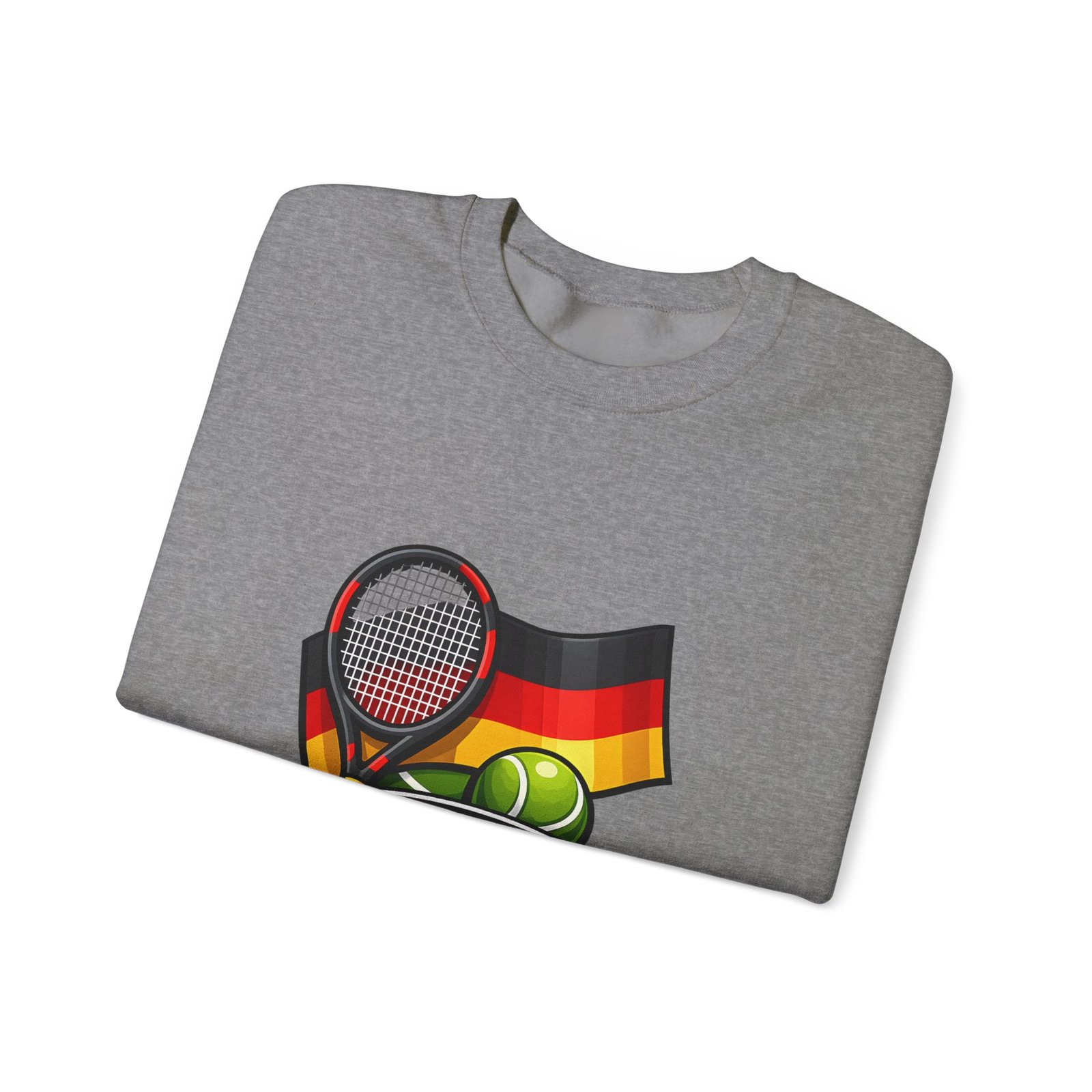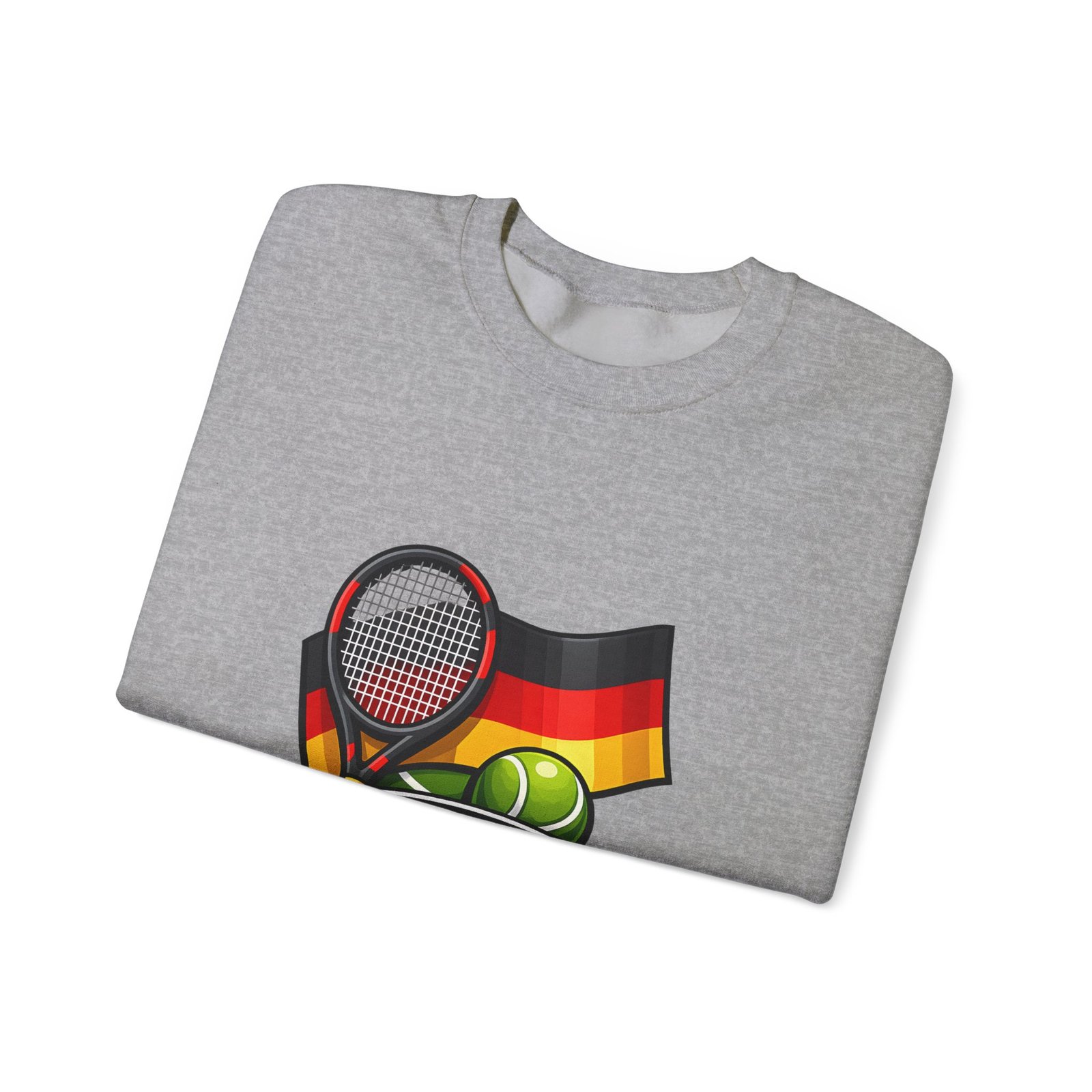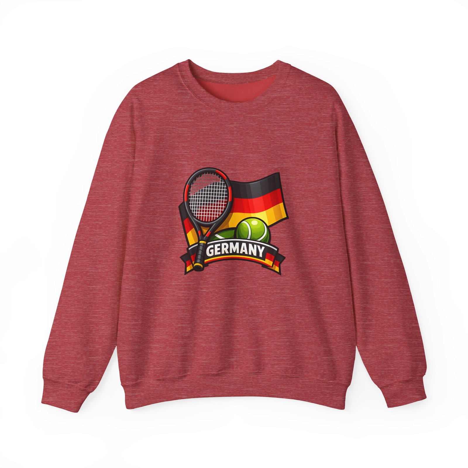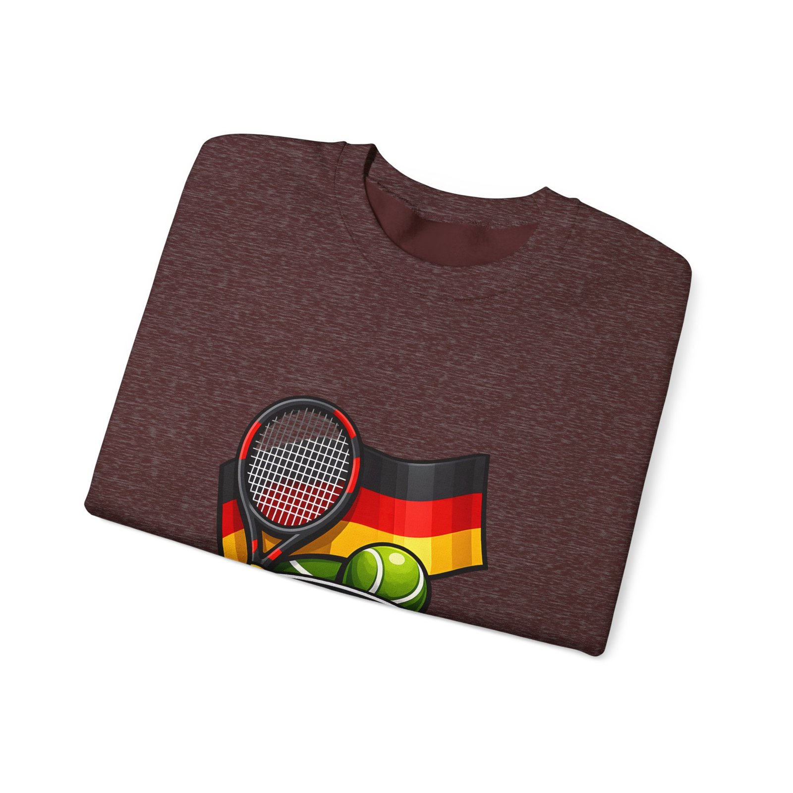 A soft, midweight crewneck that carries quiet pride for Germany and a love of tennis. The clean white sweatshirt showcases a vibrant embroidered-style emblem — a tennis racket, ball, and Germany’s flag in bold, warm colors — placed on the chest for a sporty, heritage feel. Wear it to crisp early-morning practices, casual match days with friends, or weekend walks through the city; it layers easily under a jacket or stands on its own when you want comfortable coverage and a touch of team spirit. The fabric has a substantial hand without feeling stiff, and thoughtful construction details — ribbed collar, cuffs, and hem plus double-needle stitching — keep the shape after many wears. It reads like a teammate’s sweater: familiar, durable, and quietly proud.