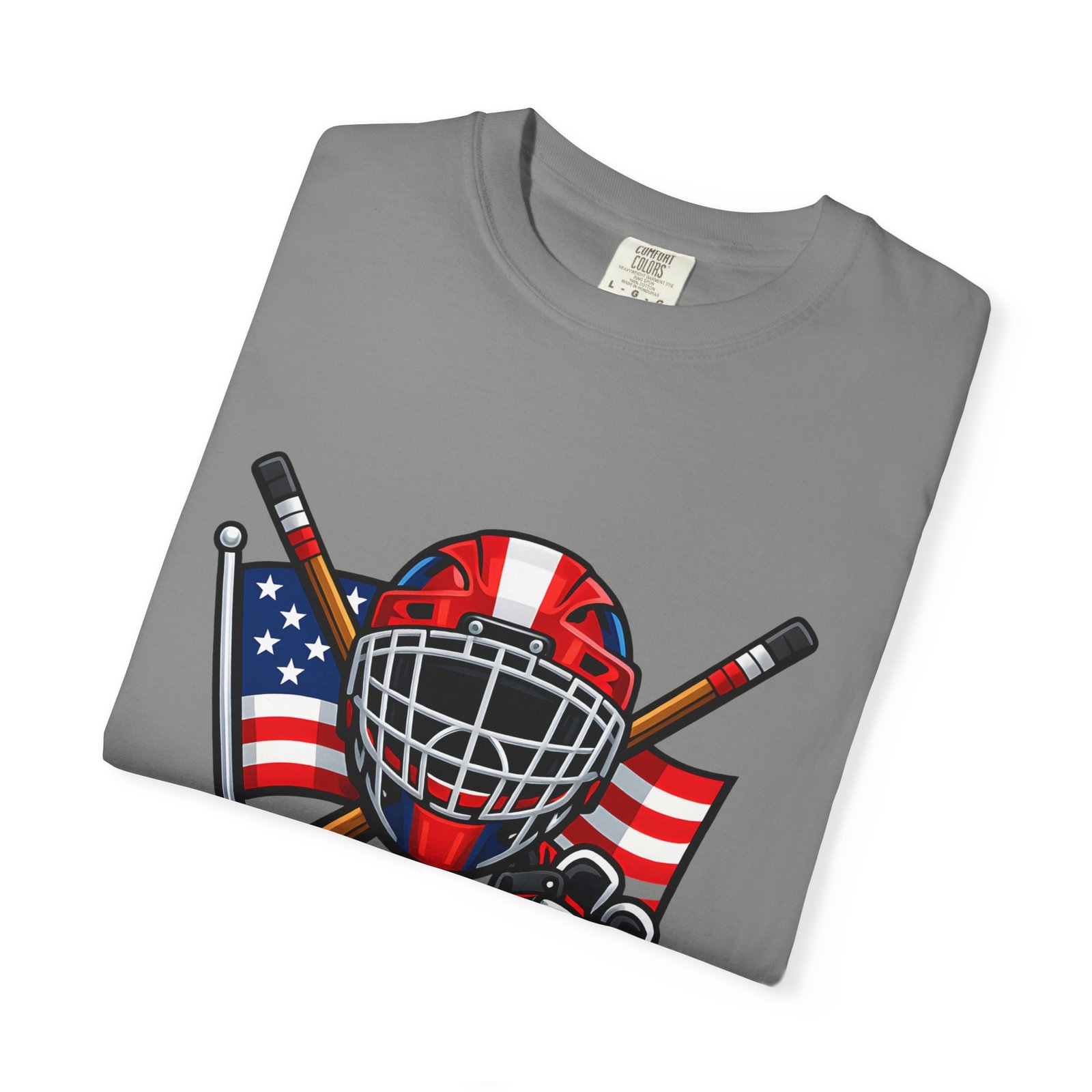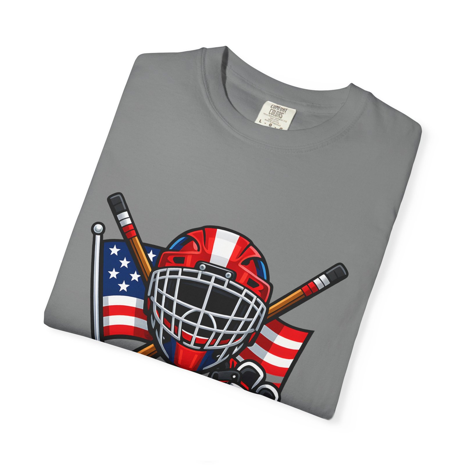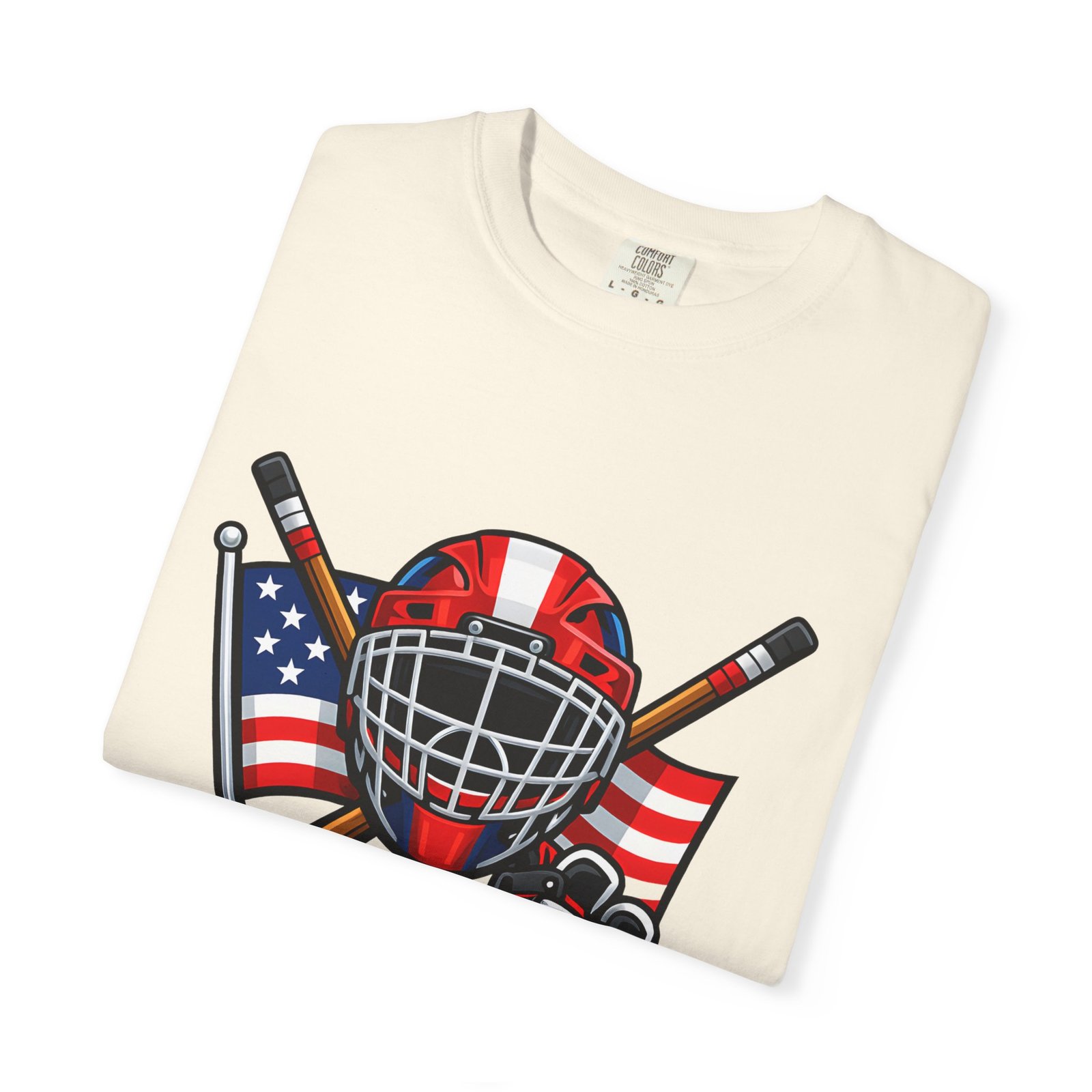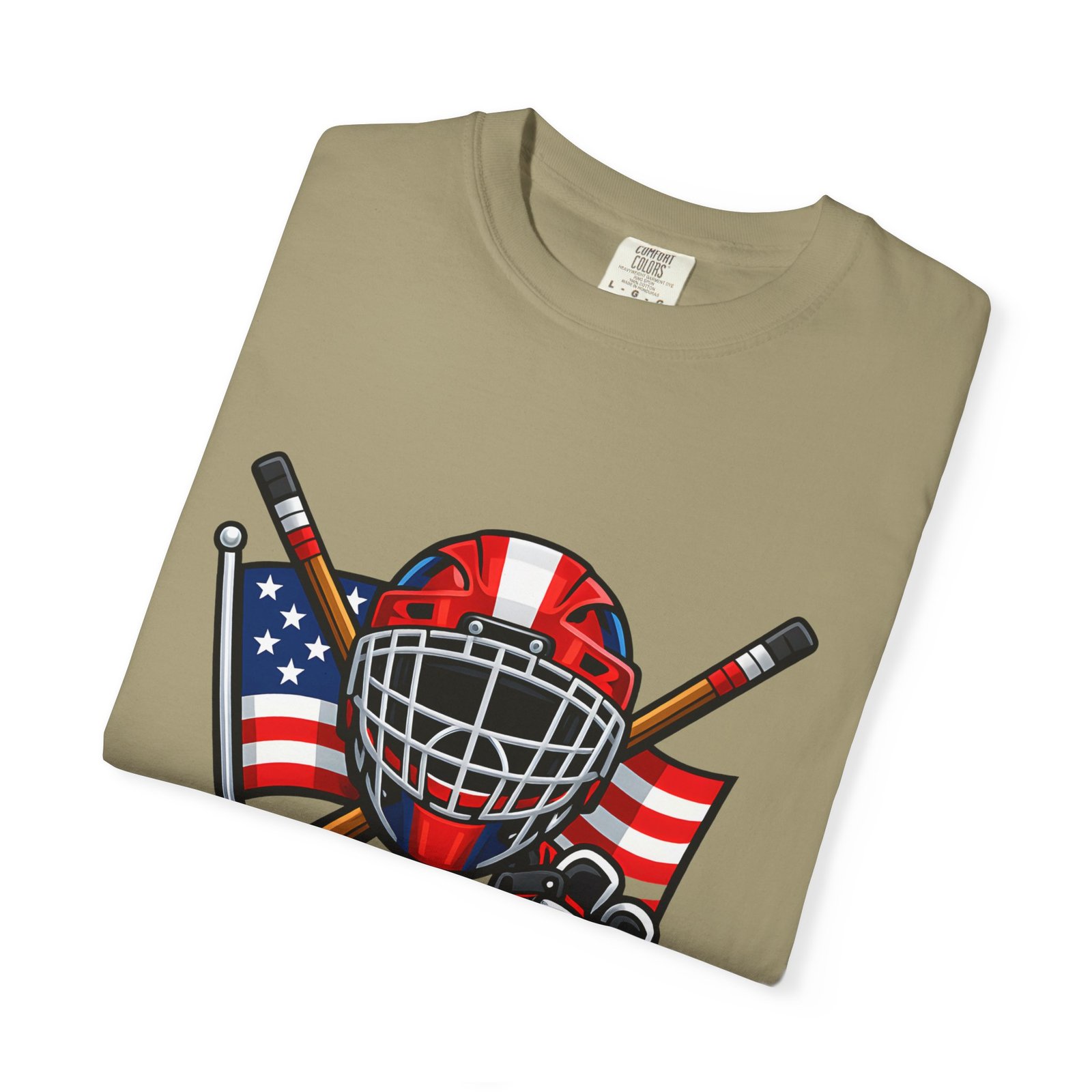 A soft, heavyweight tee built for game-day grit and summer practices. This garment-dyed cotton shirt wears in like an old favorite—slightly broken-in, richly hued, and ready for the rink. The front graphic layers a goalie mask, crossed sticks, skates and an American flag, capturing that sweaty, triumphant after-game glow. Wear it to warm up, to coach from the sidelines, or for post-game burgers and stories. The relaxed cut leaves room for movement and the sturdy double-needle seams mean it stands up to rougher wash-and-wear life. Sizes run S–4XL and a wide palette of colors lets you match team tones or hometown pride.