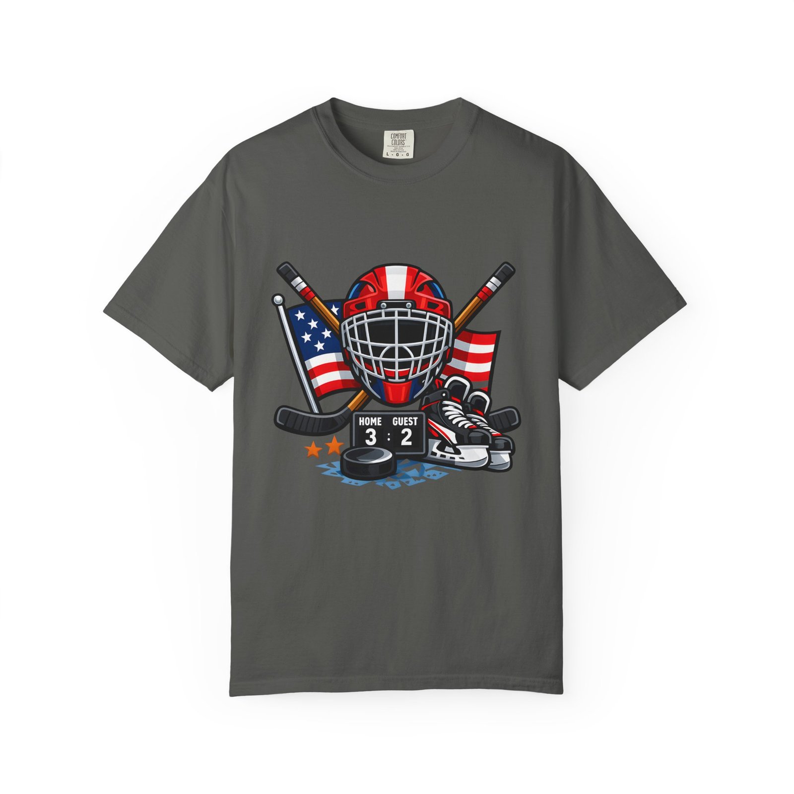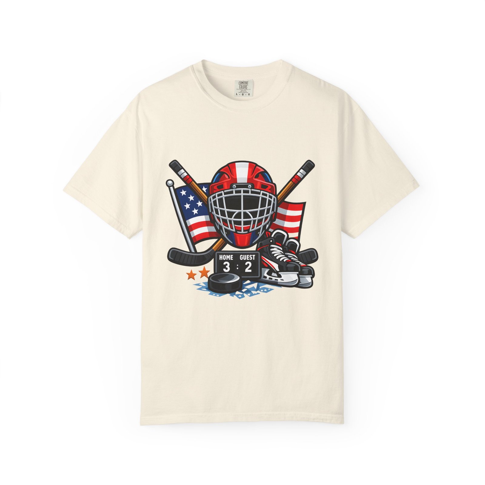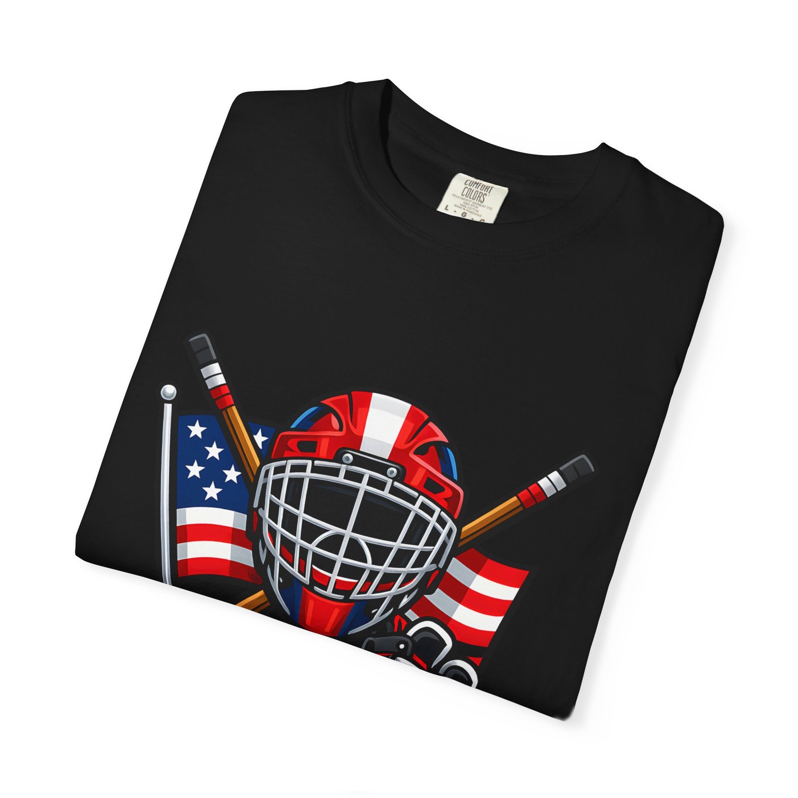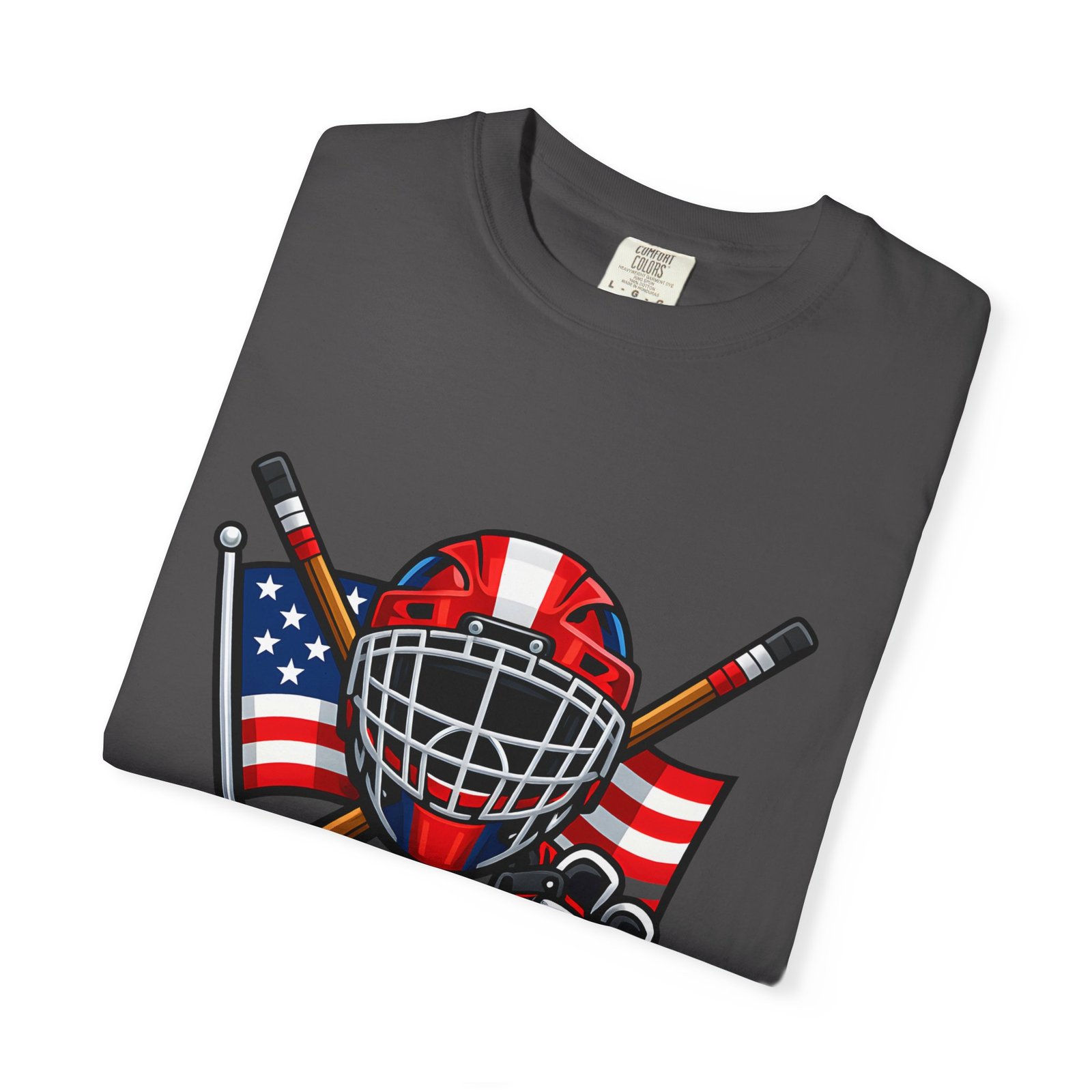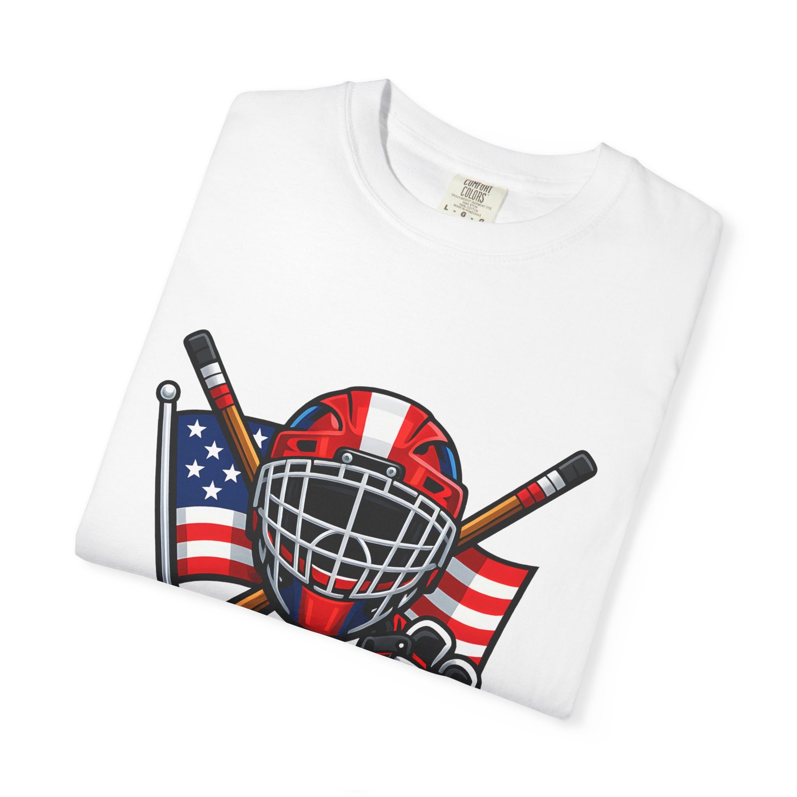A soft, heavyweight tee built for game-day grit and summer practices. This garment-dyed cotton shirt wears in like an old favorite—slightly broken-in, richly hued, and ready for the rink. The front graphic layers a goalie mask, crossed sticks, skates and an American flag, capturing that sweaty, triumphant after-game glow. Wear it to warm up, to coach from the sidelines, or for post-game burgers and stories. The relaxed cut leaves room for movement and the sturdy double-needle seams mean it stands up to rougher wash-and-wear life. Sizes run S–4XL and a wide palette of colors lets you match team tones or hometown pride.