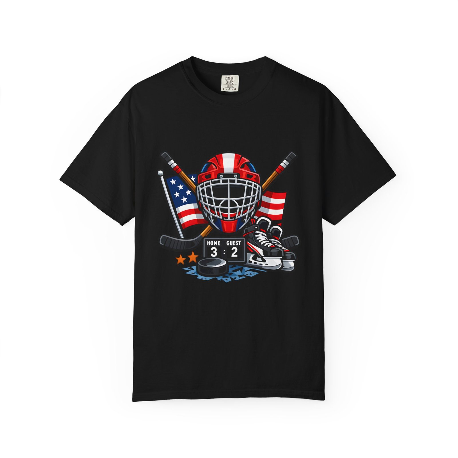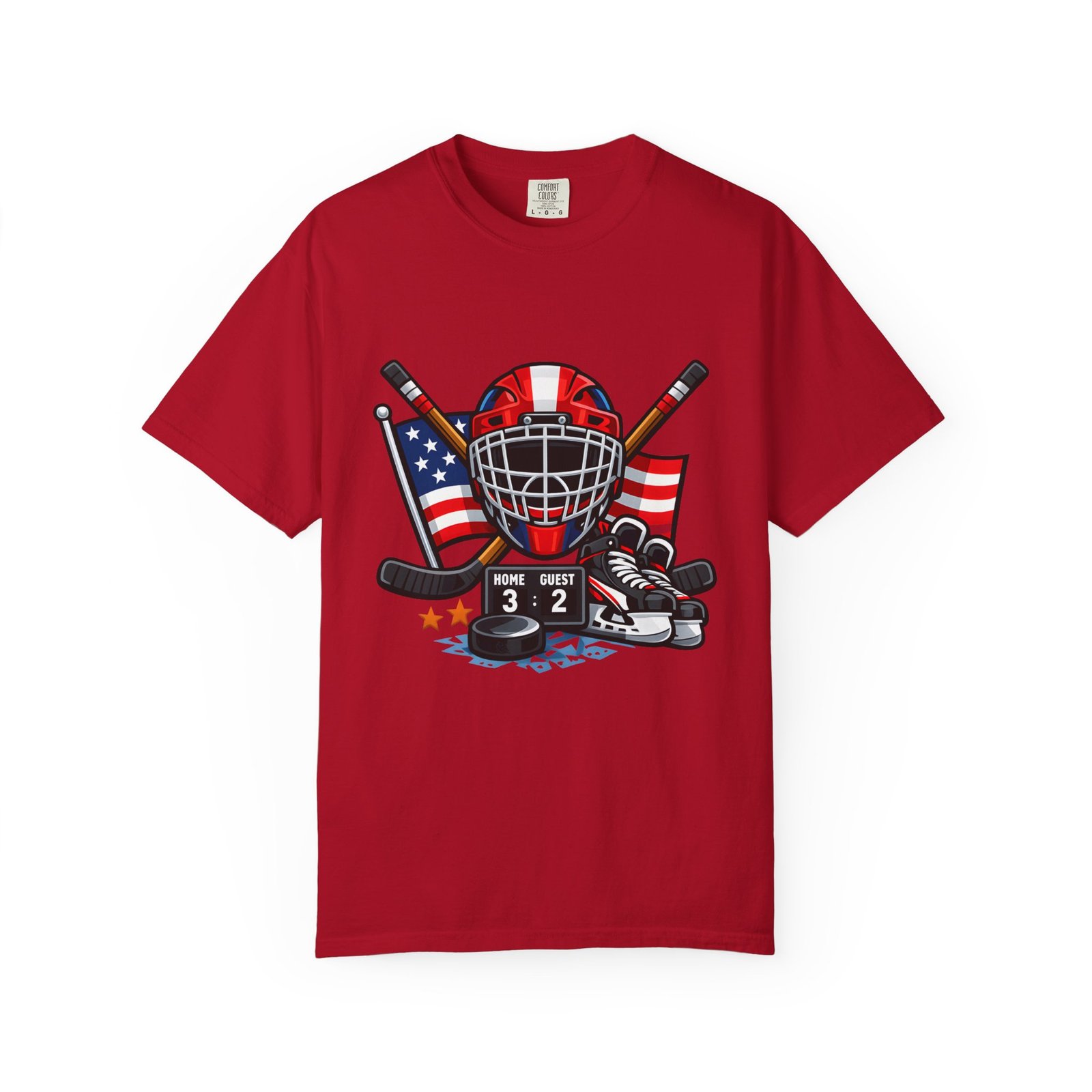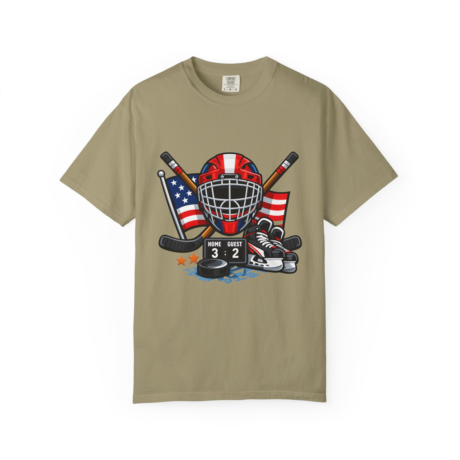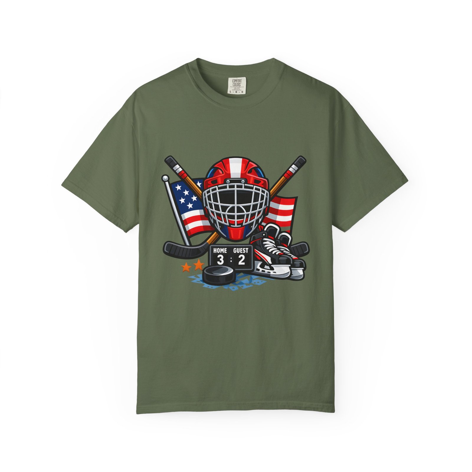 A soft, heavyweight tee built for game-day grit and summer practices. This garment-dyed cotton shirt wears in like an old favorite—slightly broken-in, richly hued, and ready for the rink. The front graphic layers a goalie mask, crossed sticks, skates and an American flag, capturing that sweaty, triumphant after-game glow. Wear it to warm up, to coach from the sidelines, or for post-game burgers and stories. The relaxed cut leaves room for movement and the sturdy double-needle seams mean it stands up to rougher wash-and-wear life. Sizes run S–4XL and a wide palette of colors lets you match team tones or hometown pride.