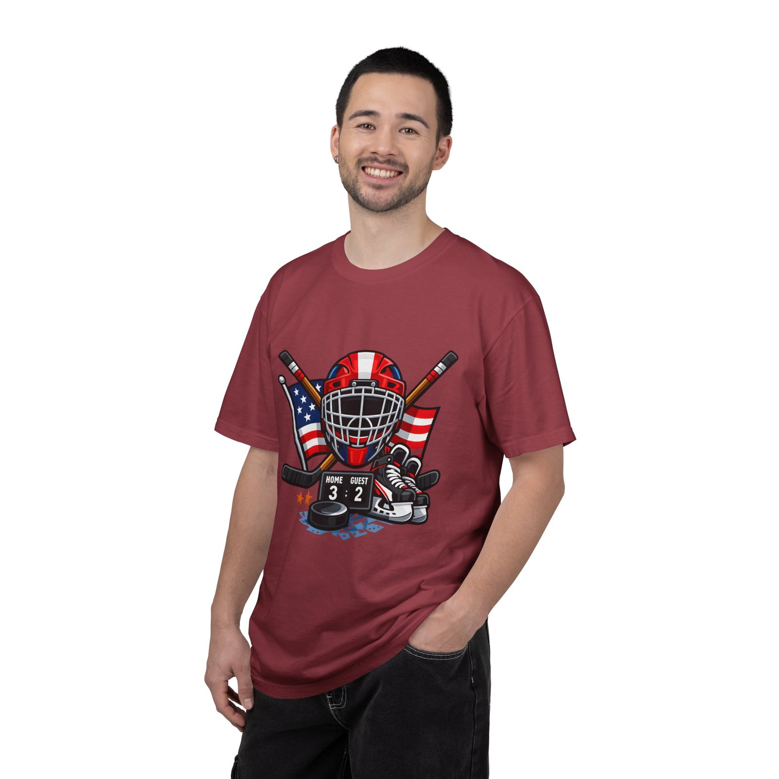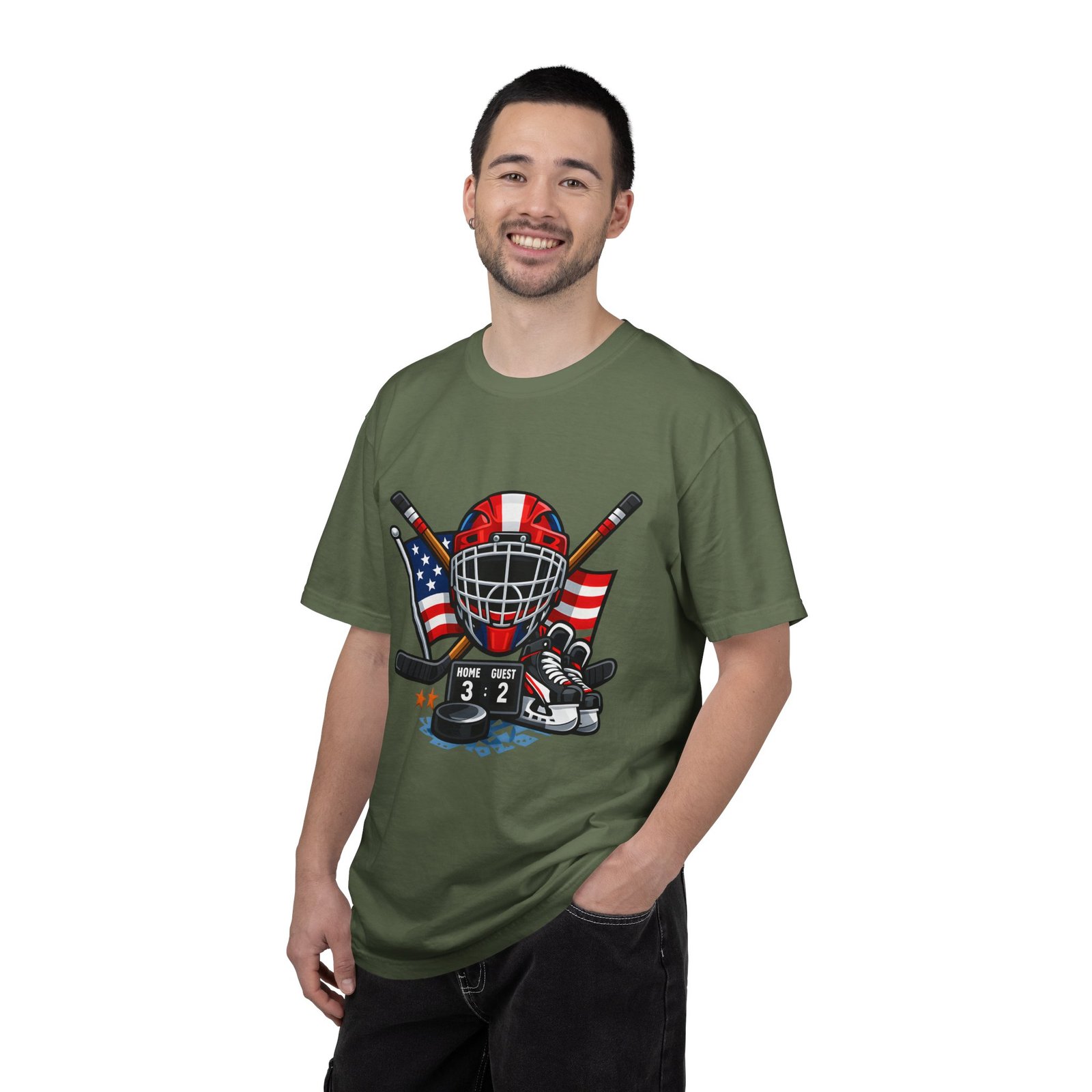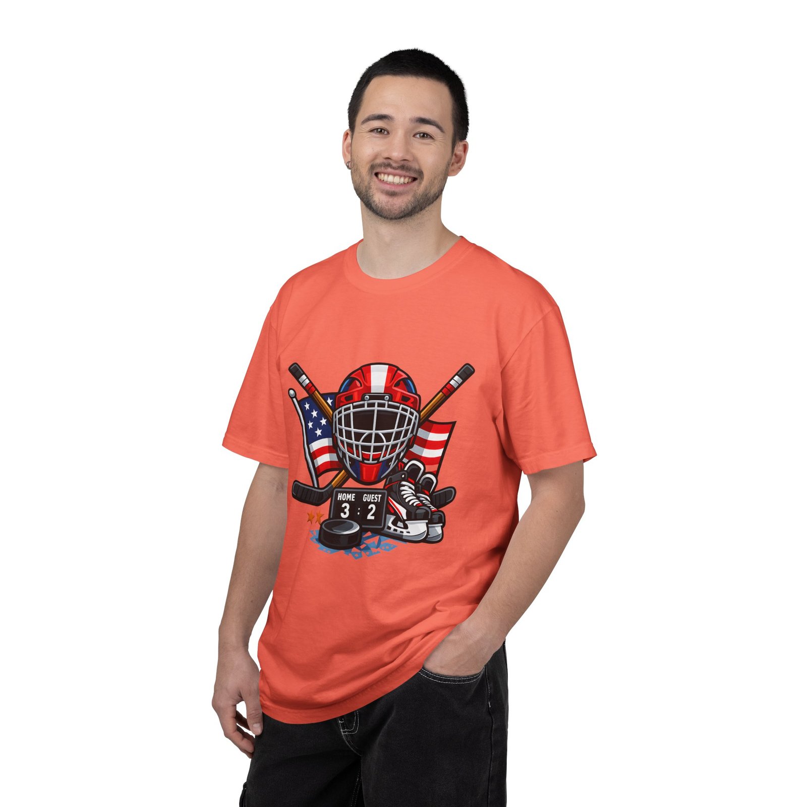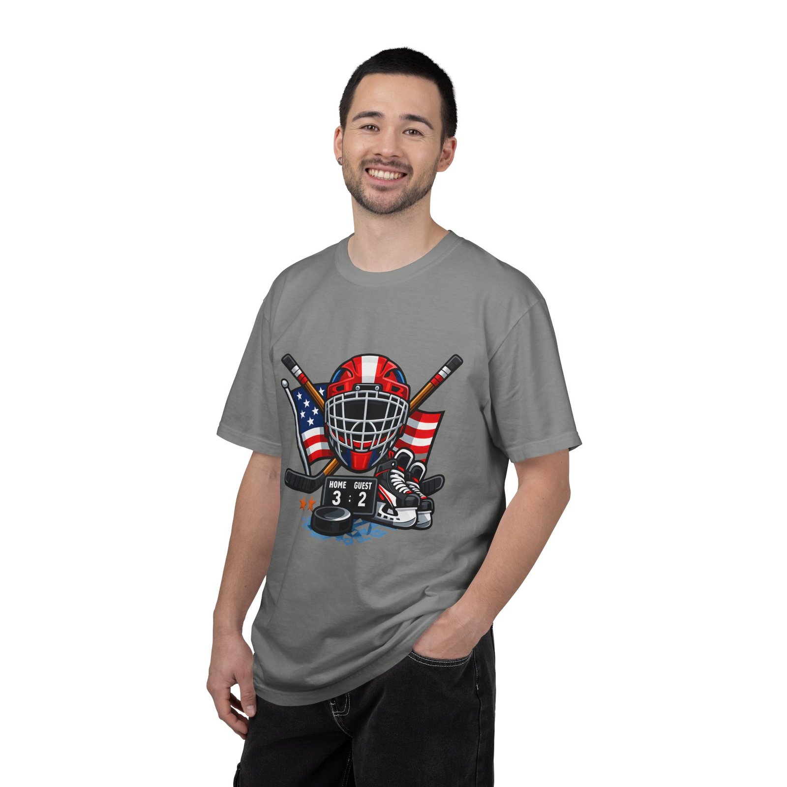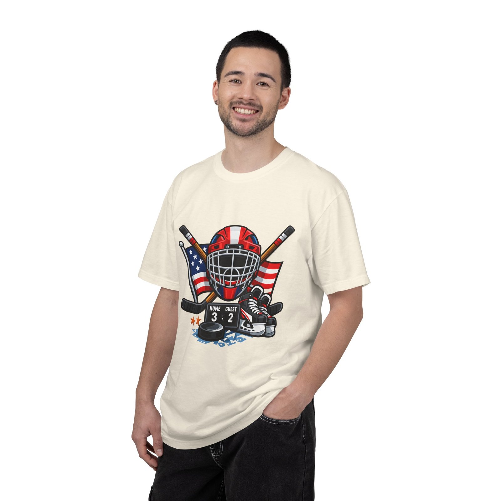 A soft, heavyweight tee built for game-day grit and summer practices. This garment-dyed cotton shirt wears in like an old favorite—slightly broken-in, richly hued, and ready for the rink. The front graphic layers a goalie mask, crossed sticks, skates and an American flag, capturing that sweaty, triumphant after-game glow. Wear it to warm up, to coach from the sidelines, or for post-game burgers and stories. The relaxed cut leaves room for movement and the sturdy double-needle seams mean it stands up to rougher wash-and-wear life. Sizes run S–4XL and a wide palette of colors lets you match team tones or hometown pride.