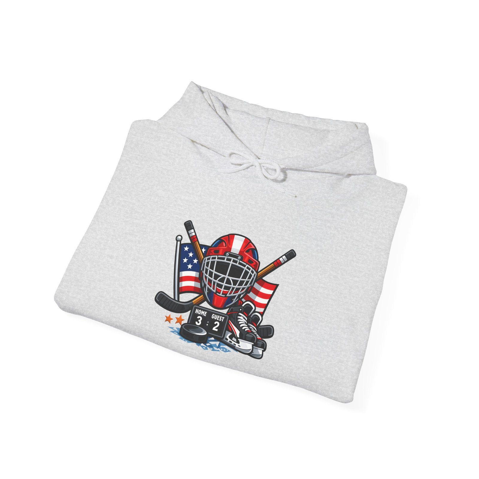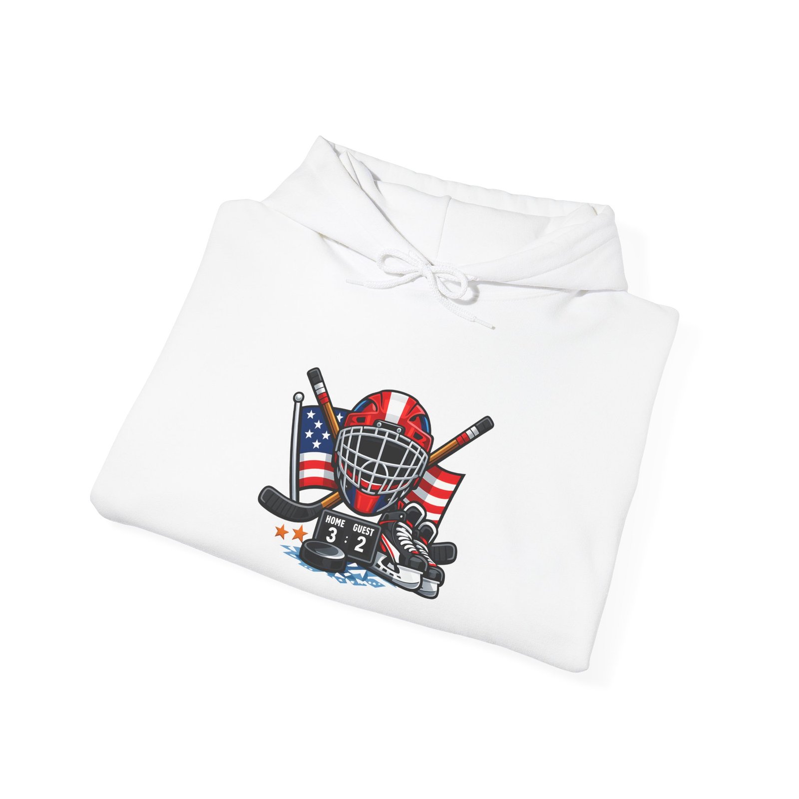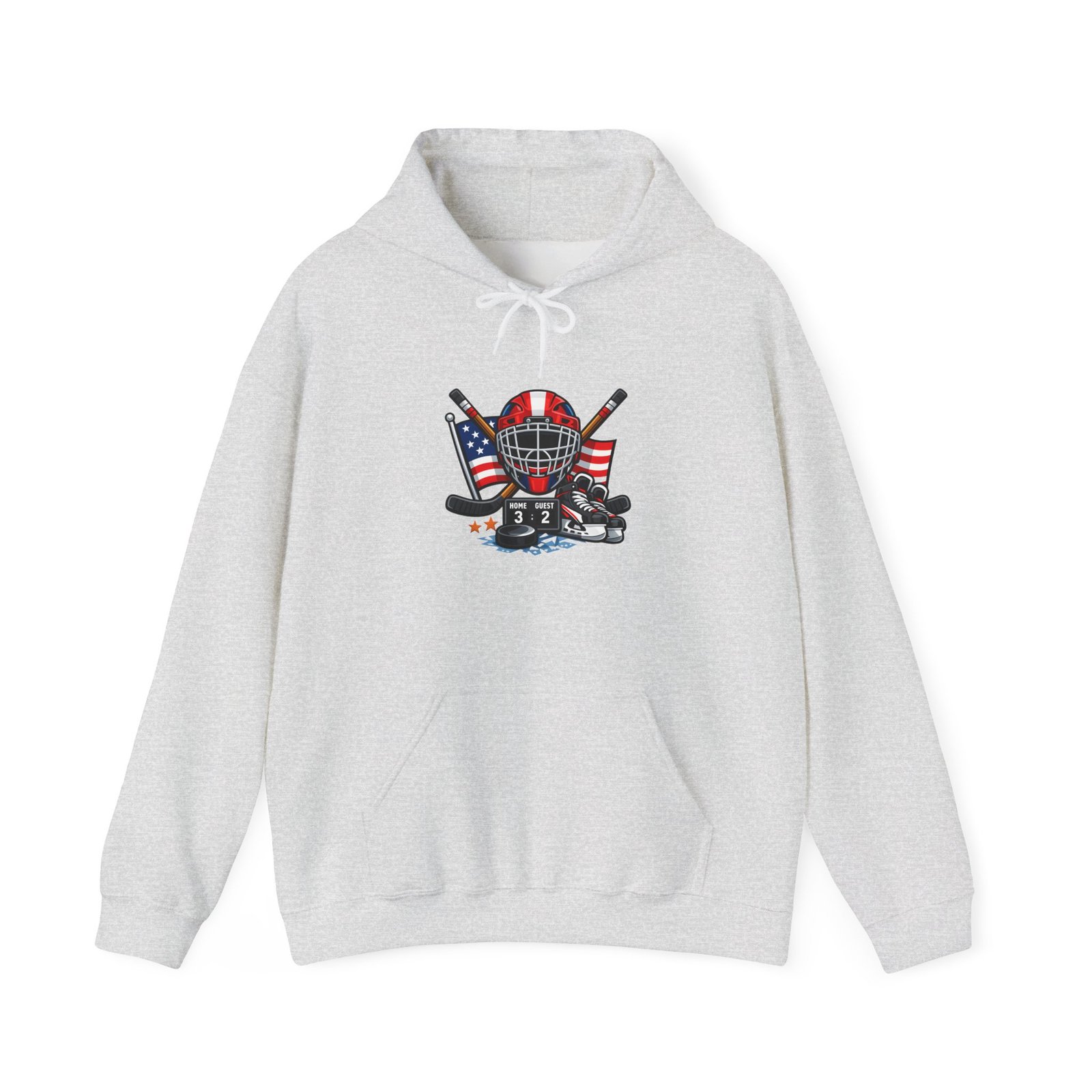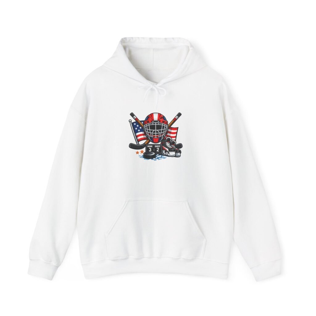 Soft, warm, and quietly bold — this hooded sweatshirt wraps you in comfort while carrying a spirit of the rink. A vintage-style hockey mask sits over crossed sticks, flanked by waving American flags and scuffed goalie pads. It reads like a story: early-morning practices, frozen breath, and the steady thud of pucks against boards. Wear it to the arena, on the drive home after a game, or curled up with a hot drink while replaying that last save. The clean white background makes the artwork pop, while the roomy pouch and double-lined hood keep you cozy through chilly commutes and late-night ice sessions.