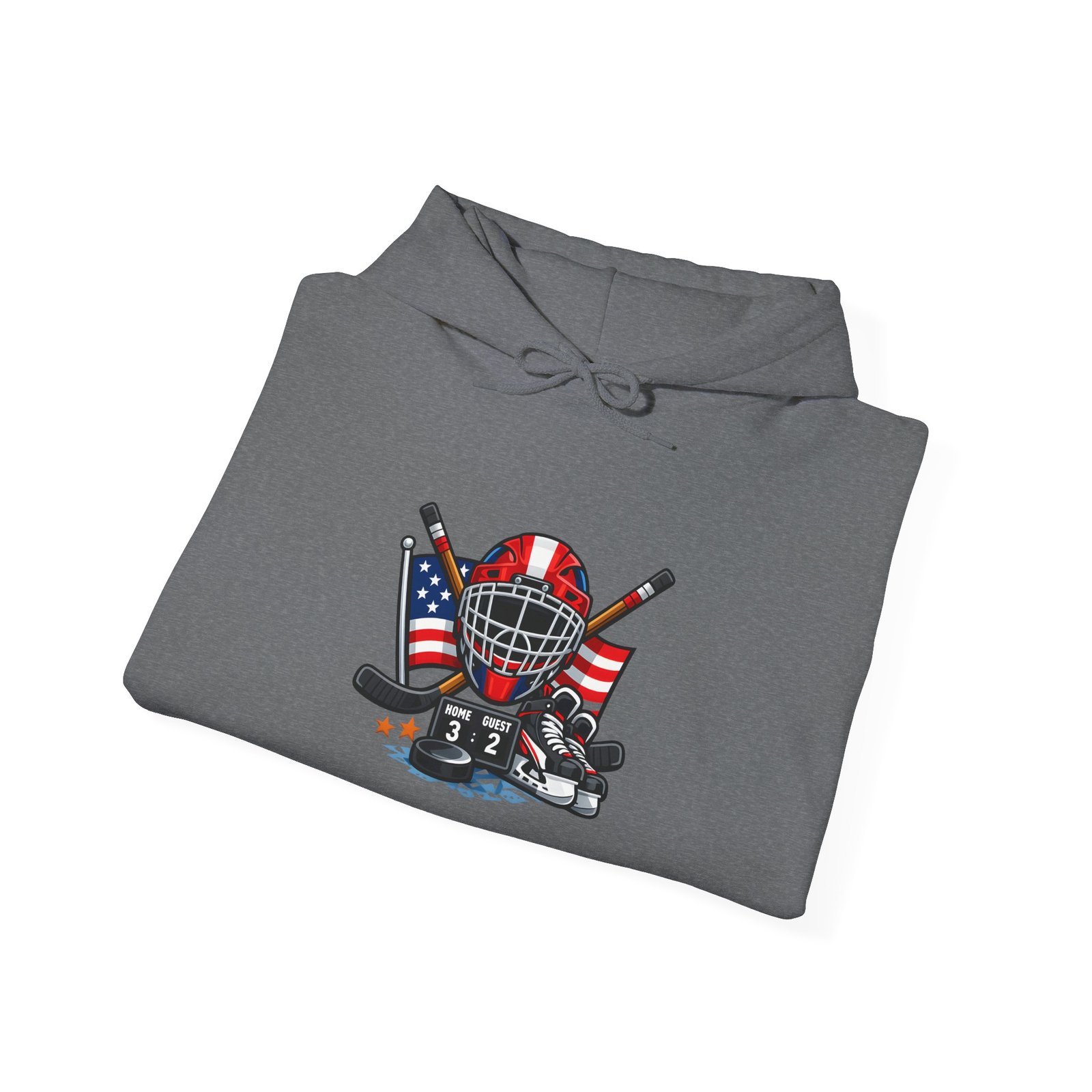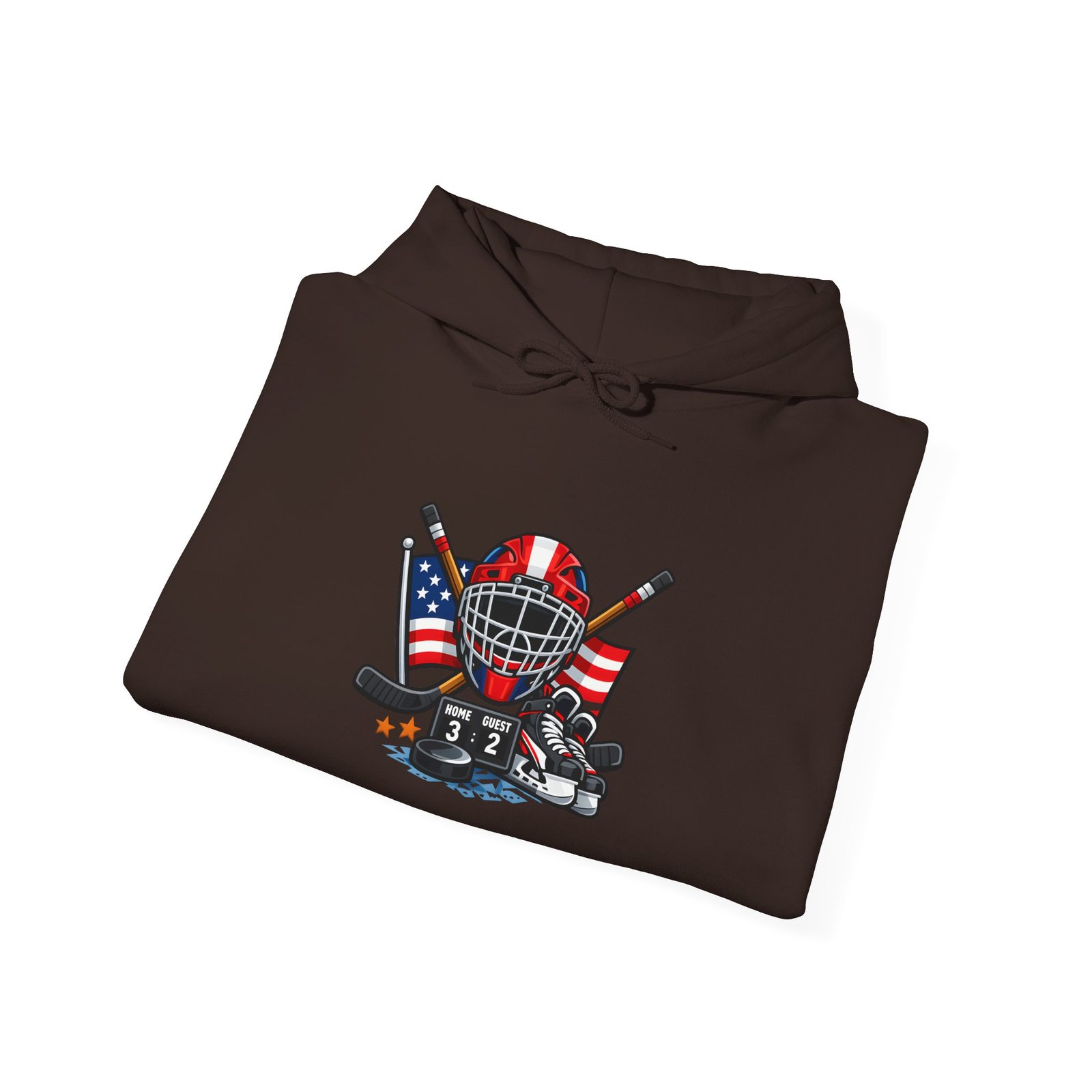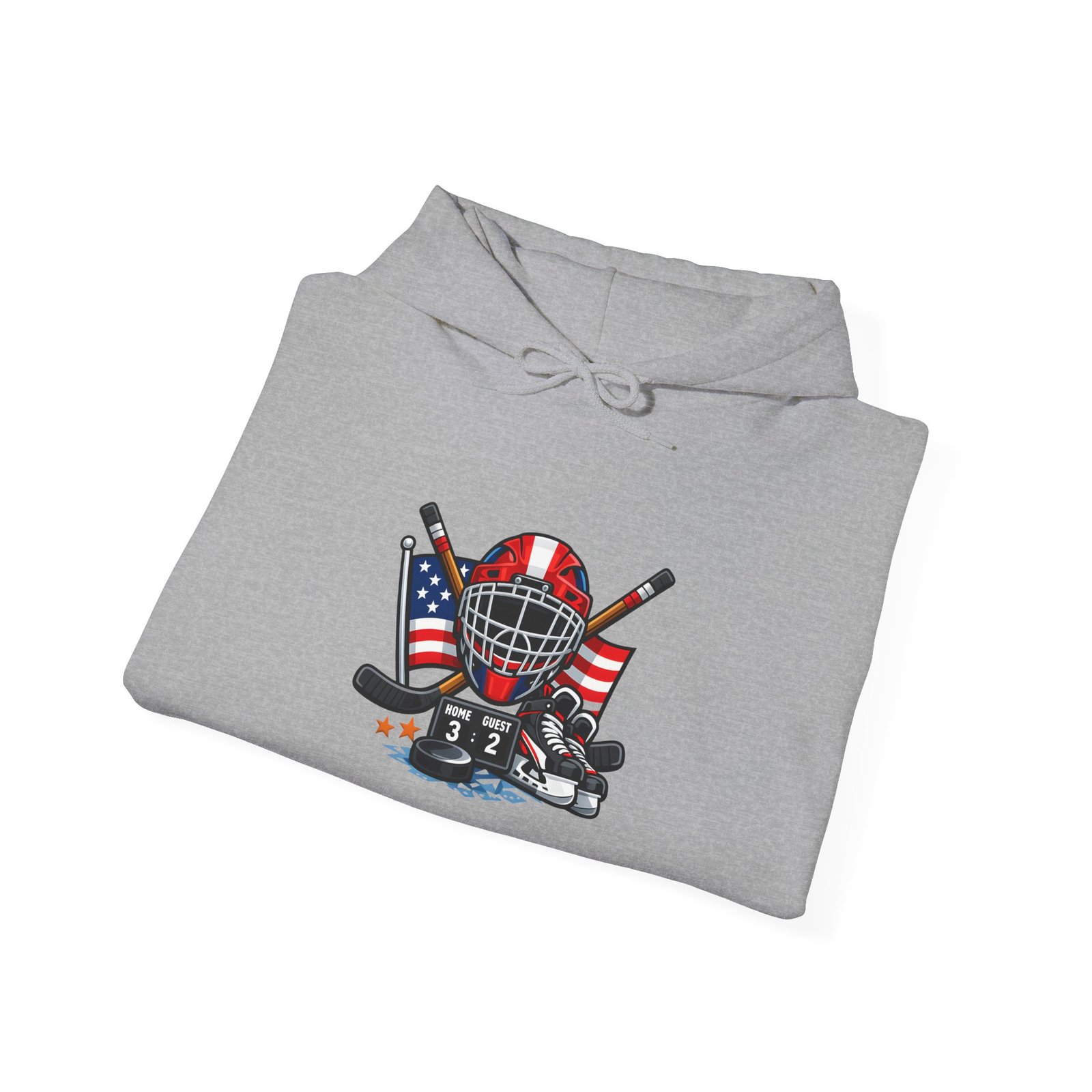 Soft, warm, and quietly bold — this hooded sweatshirt wraps you in comfort while carrying a spirit of the rink. A vintage-style hockey mask sits over crossed sticks, flanked by waving American flags and scuffed goalie pads. It reads like a story: early-morning practices, frozen breath, and the steady thud of pucks against boards. Wear it to the arena, on the drive home after a game, or curled up with a hot drink while replaying that last save. The clean white background makes the artwork pop, while the roomy pouch and double-lined hood keep you cozy through chilly commutes and late-night ice sessions.