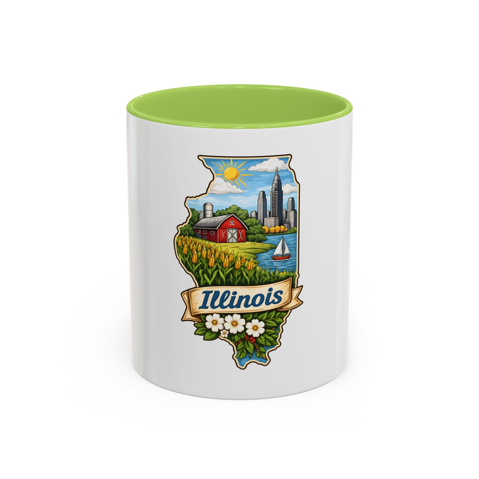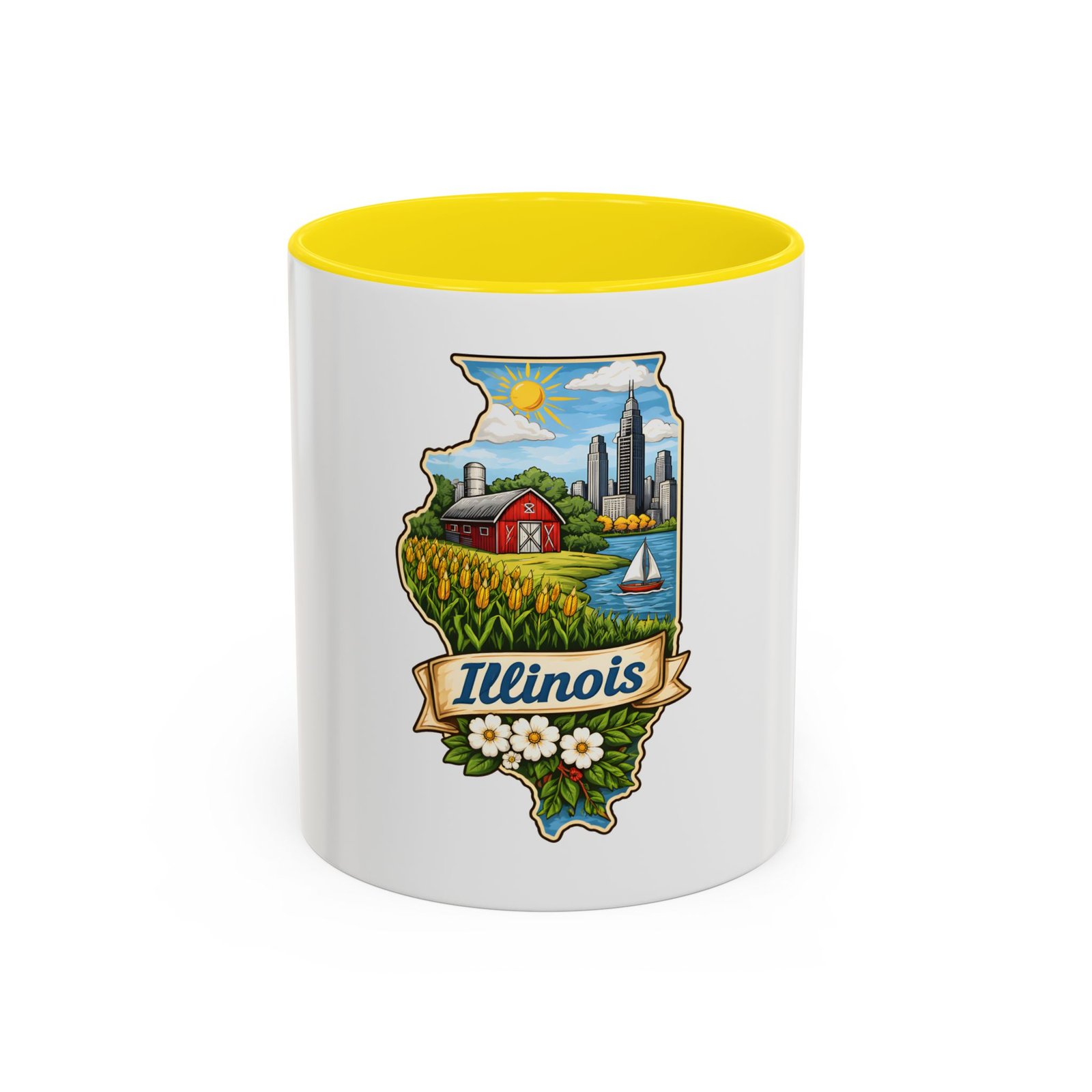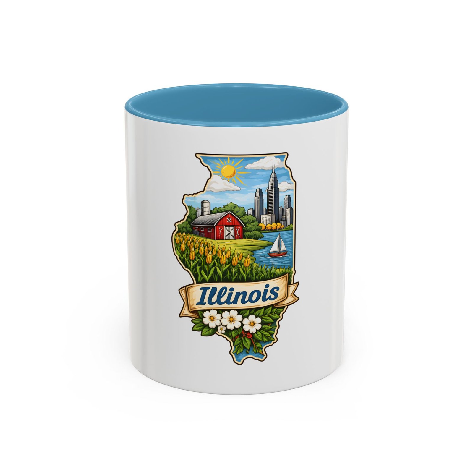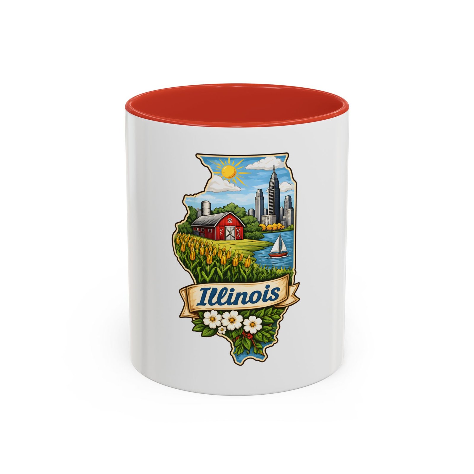 Warm mornings with a Midwestern skyline and fields — this ceramic mug carries a little piece of Illinois to your kitchen. The artwork frames the state’s outline with a red barn, cornrows, a sailboat on the lake, and a skyline in the distance, all tied together with a script banner that reads “Illinois.” Each sip feels like a short walk through hometown streets, slow sunrises over farmland, and lake breezes on a summer afternoon. The bright, detailed print pops against the glossy white body while the colored interior and handle add a cheerful contrast. Durable for daily use and easy to care for, it slips comfortably into a hand with a C-shaped handle and holds enough coffee to start your day or keep you company through an evening chat.