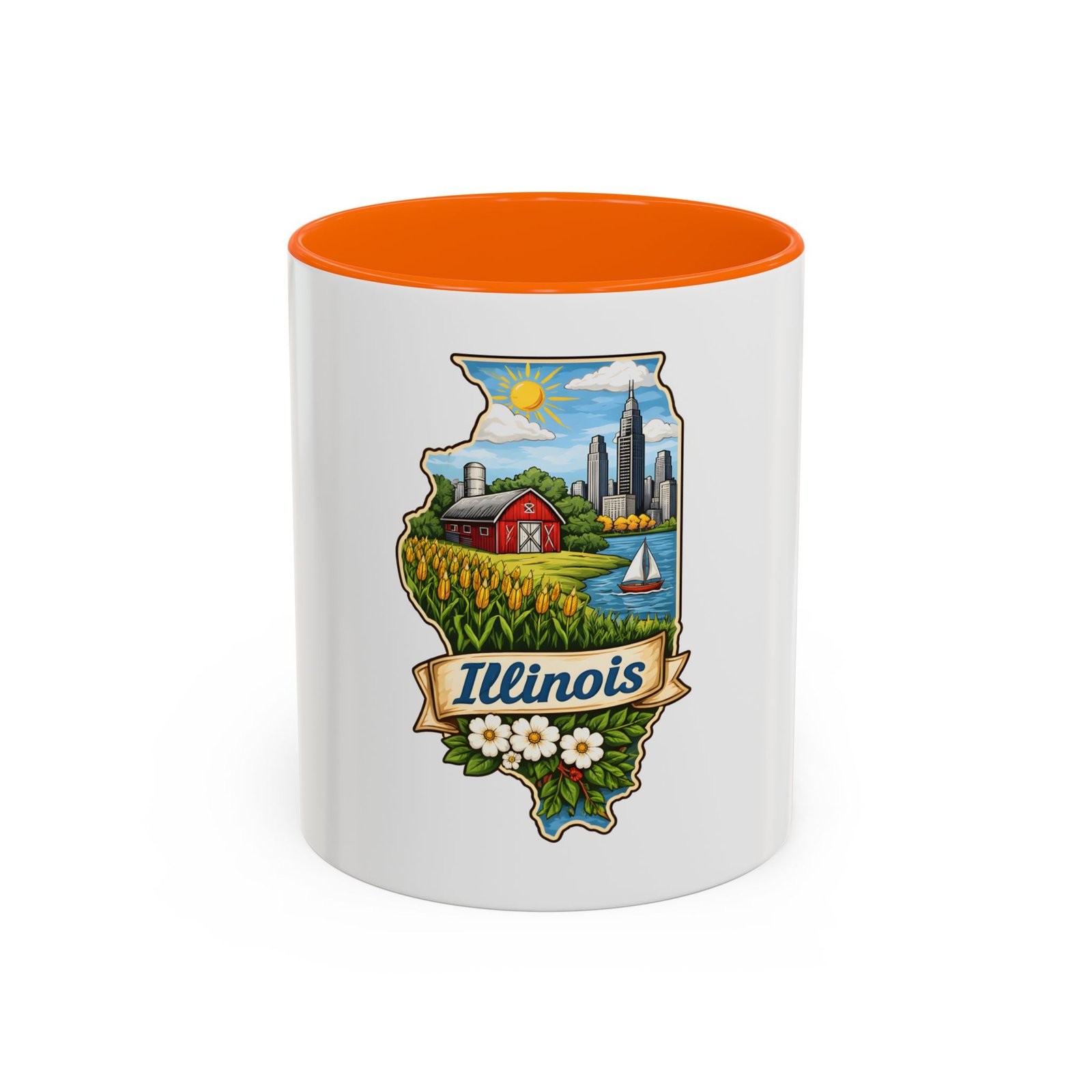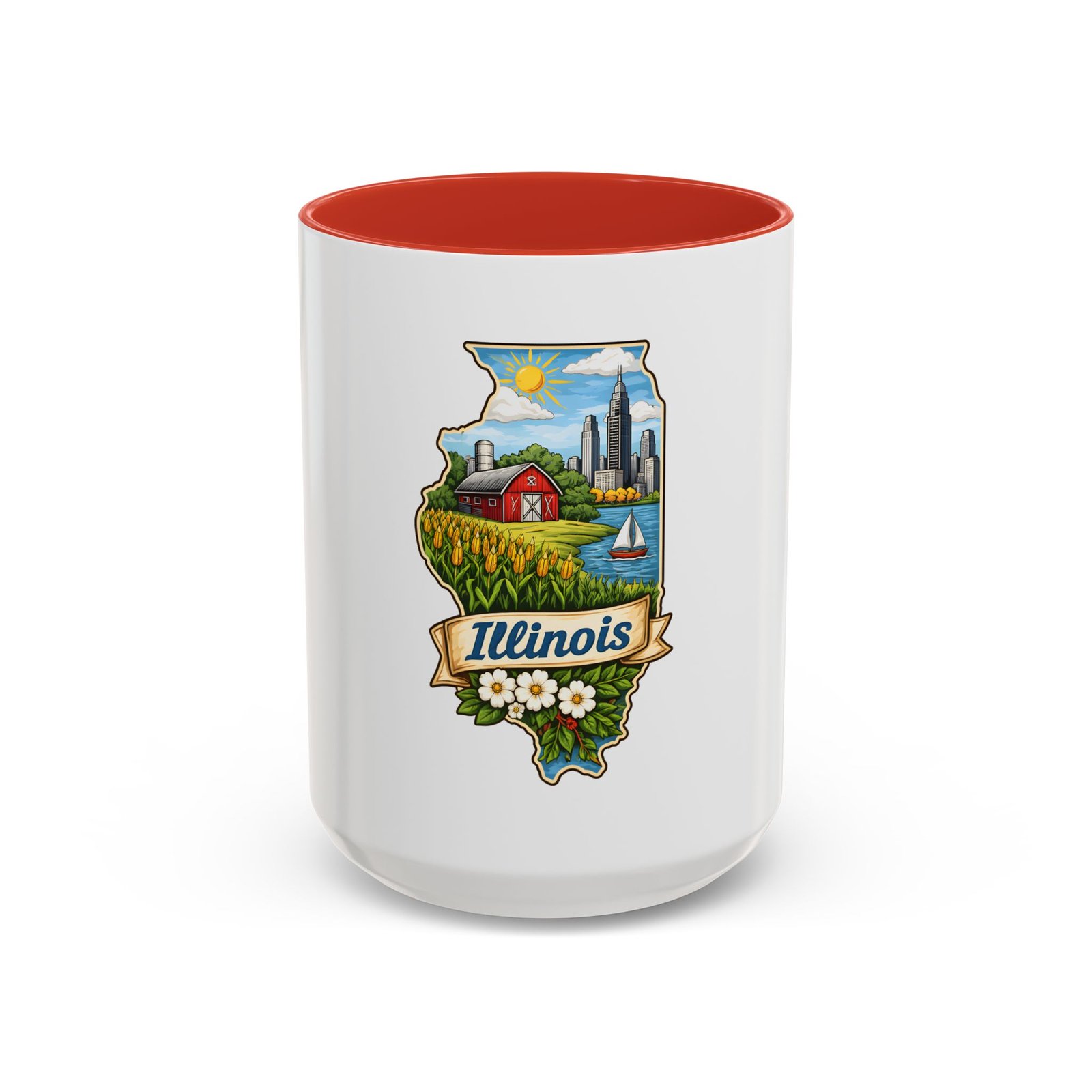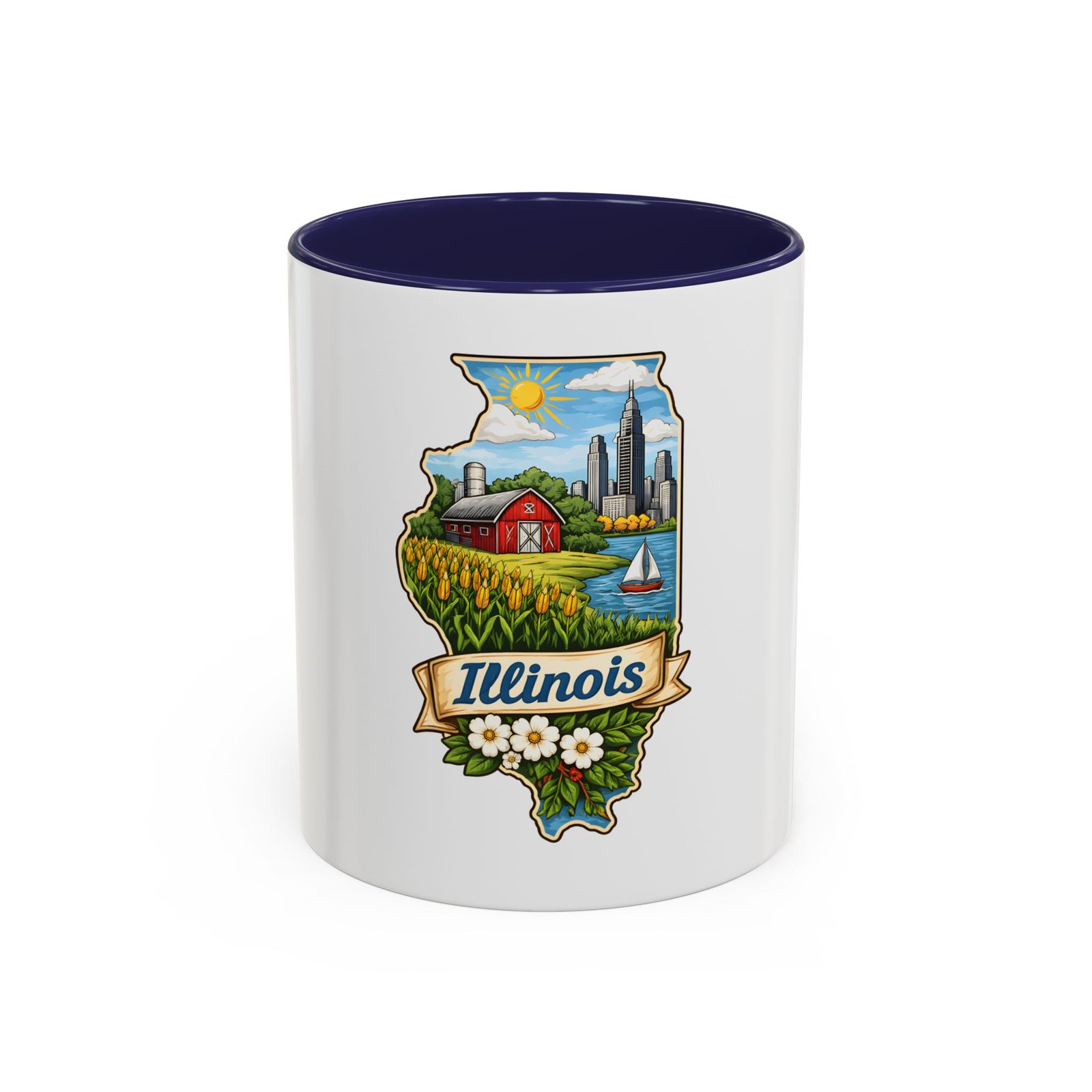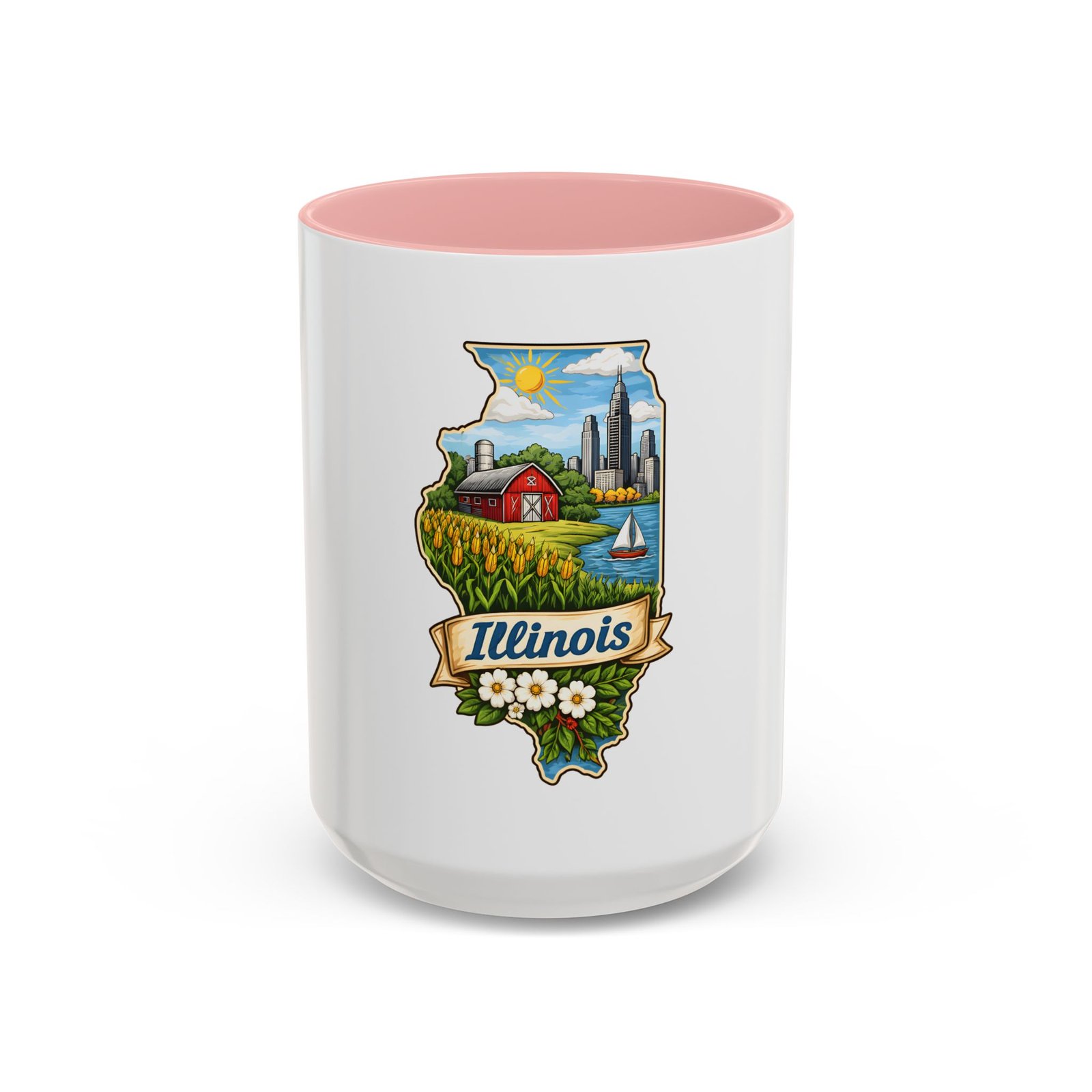 Warm mornings with a Midwestern skyline and fields — this ceramic mug carries a little piece of Illinois to your kitchen. The artwork frames the state’s outline with a red barn, cornrows, a sailboat on the lake, and a skyline in the distance, all tied together with a script banner that reads “Illinois.” Each sip feels like a short walk through hometown streets, slow sunrises over farmland, and lake breezes on a summer afternoon. The bright, detailed print pops against the glossy white body while the colored interior and handle add a cheerful contrast. Durable for daily use and easy to care for, it slips comfortably into a hand with a C-shaped handle and holds enough coffee to start your day or keep you company through an evening chat.