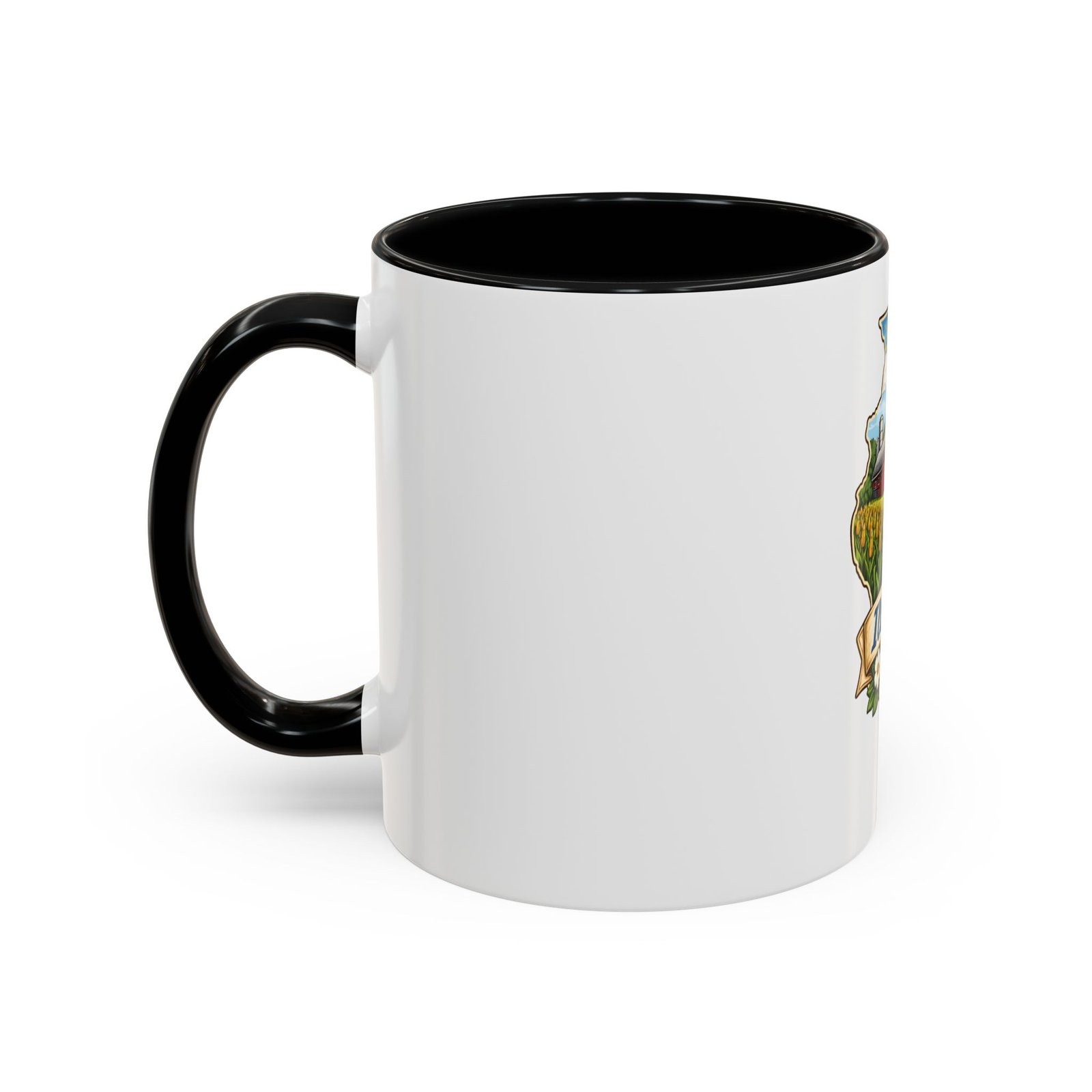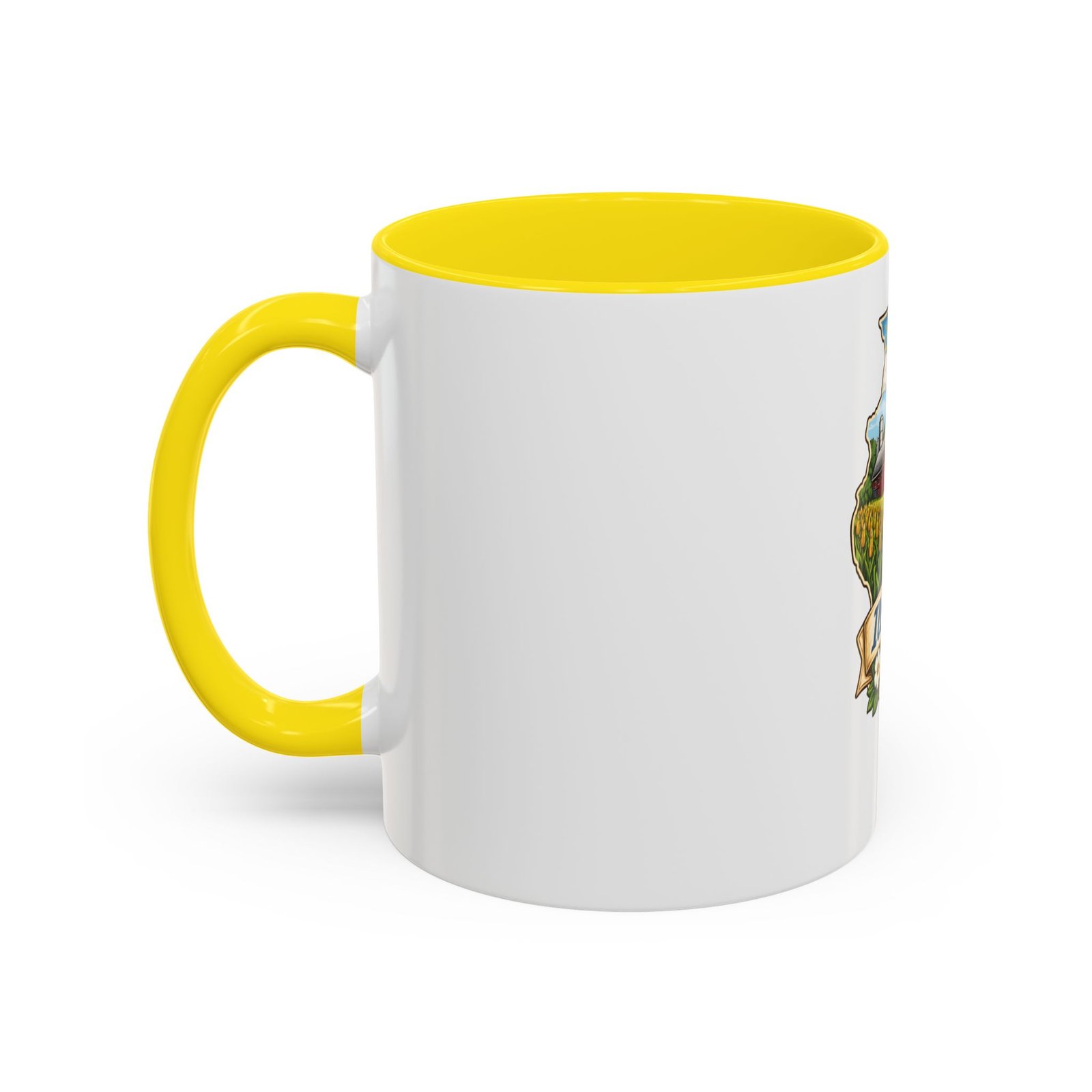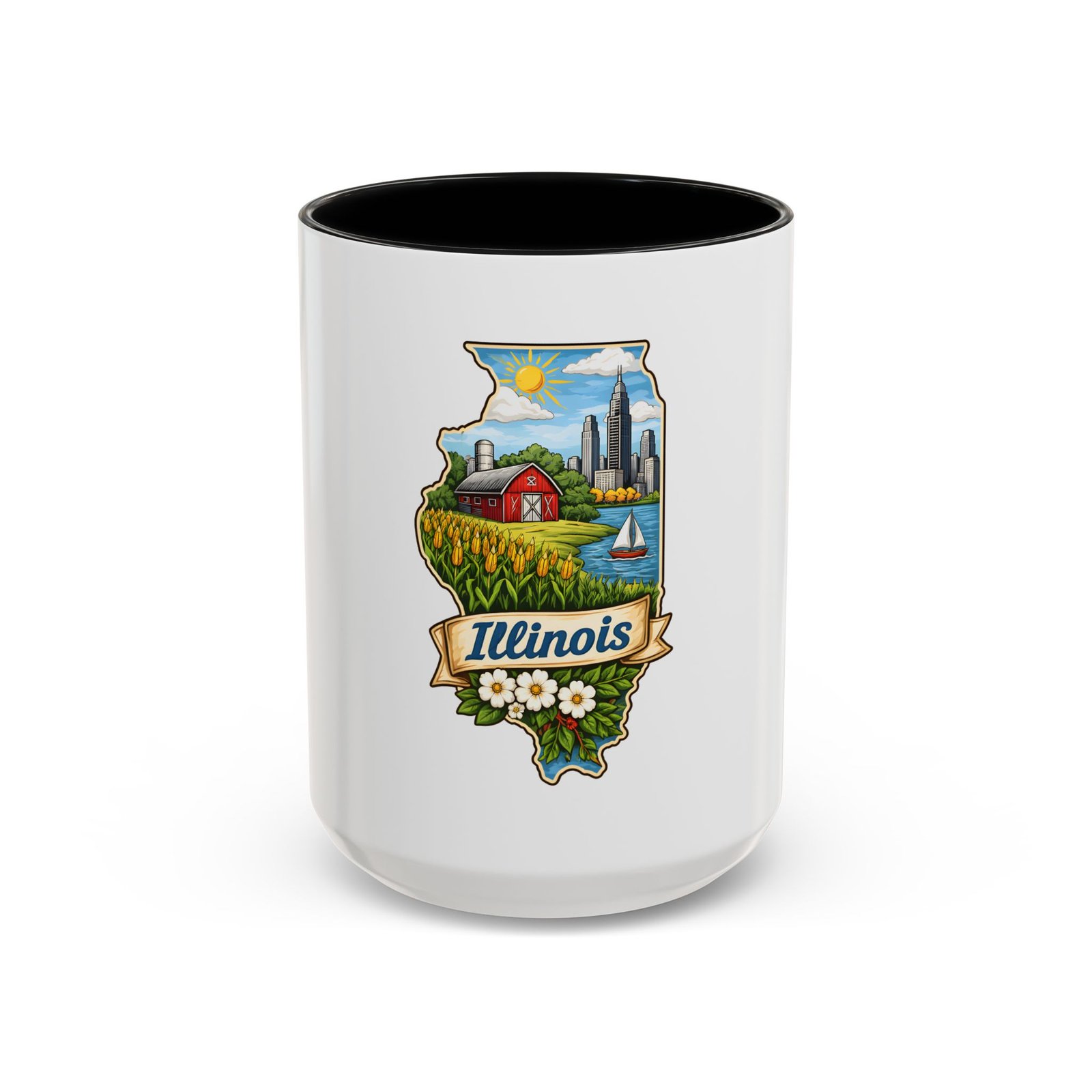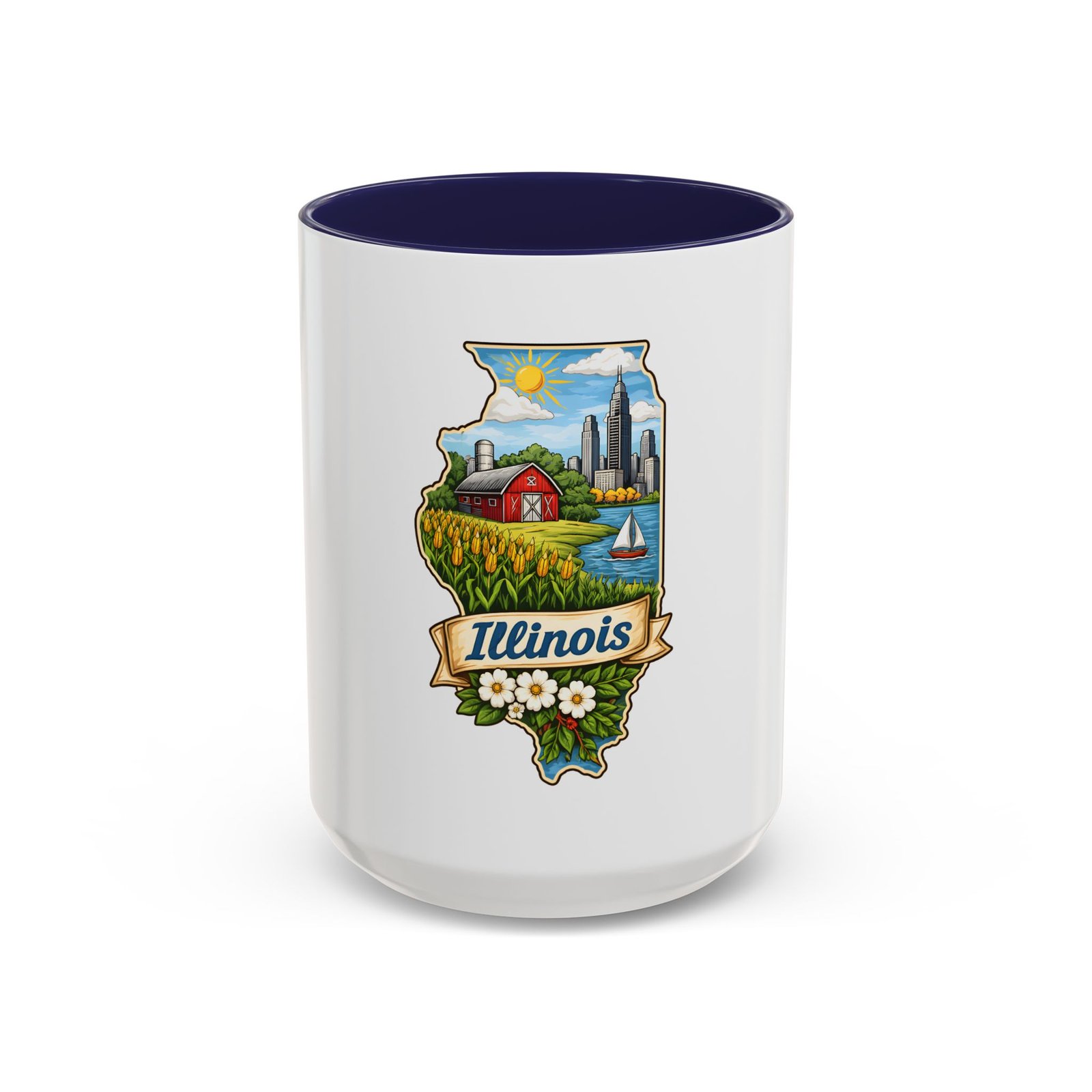 Warm mornings with a Midwestern skyline and fields — this ceramic mug carries a little piece of Illinois to your kitchen. The artwork frames the state’s outline with a red barn, cornrows, a sailboat on the lake, and a skyline in the distance, all tied together with a script banner that reads “Illinois.” Each sip feels like a short walk through hometown streets, slow sunrises over farmland, and lake breezes on a summer afternoon. The bright, detailed print pops against the glossy white body while the colored interior and handle add a cheerful contrast. Durable for daily use and easy to care for, it slips comfortably into a hand with a C-shaped handle and holds enough coffee to start your day or keep you company through an evening chat.