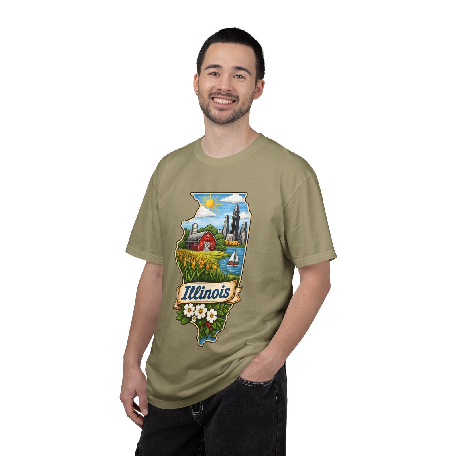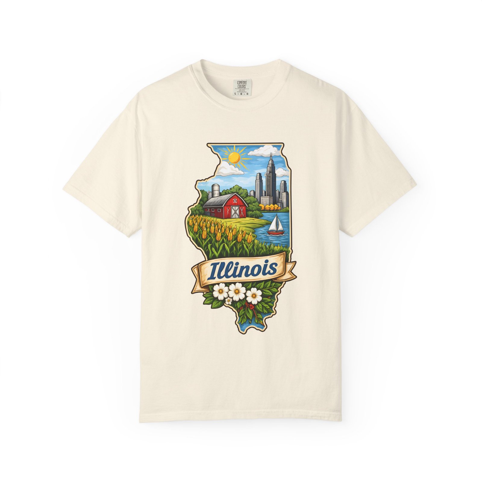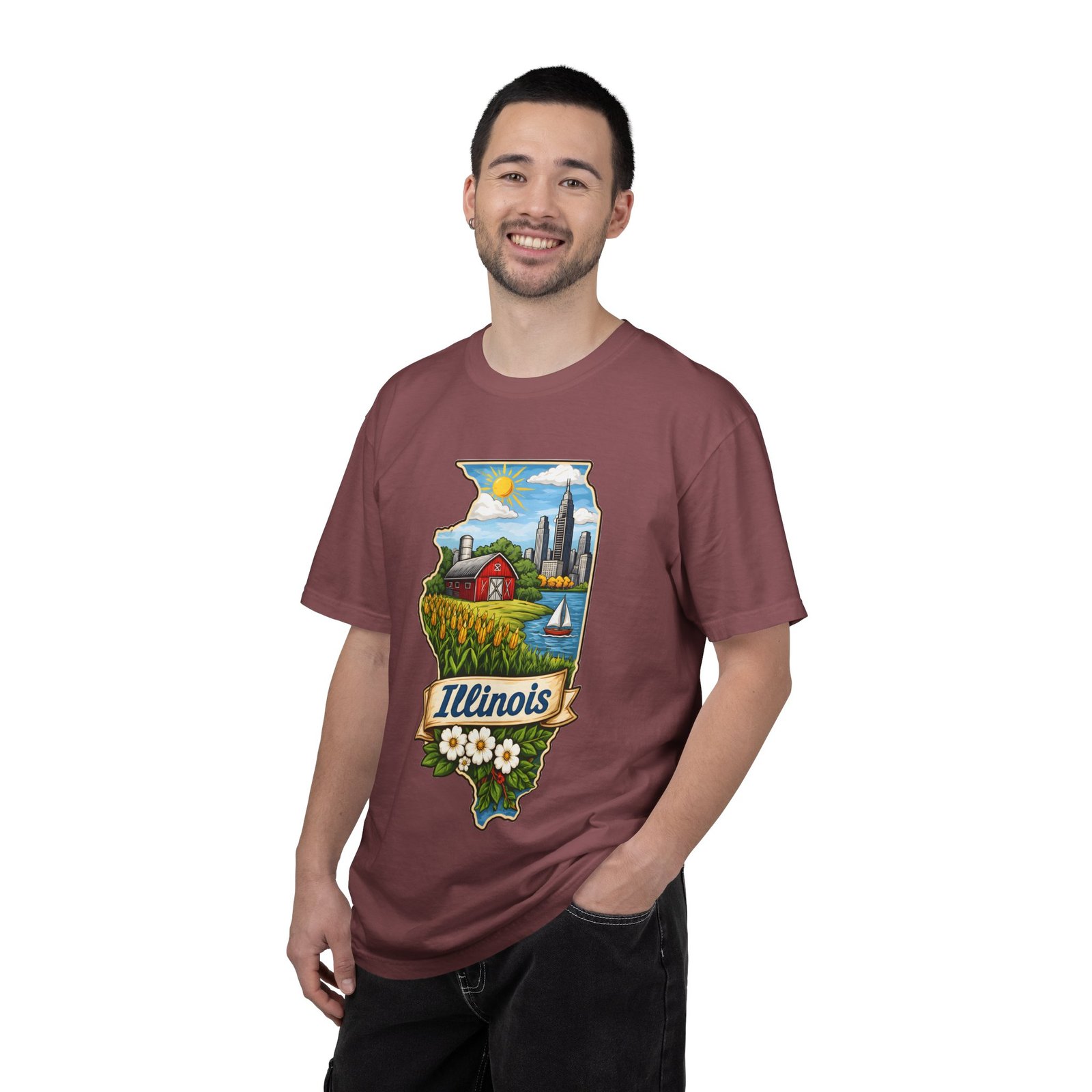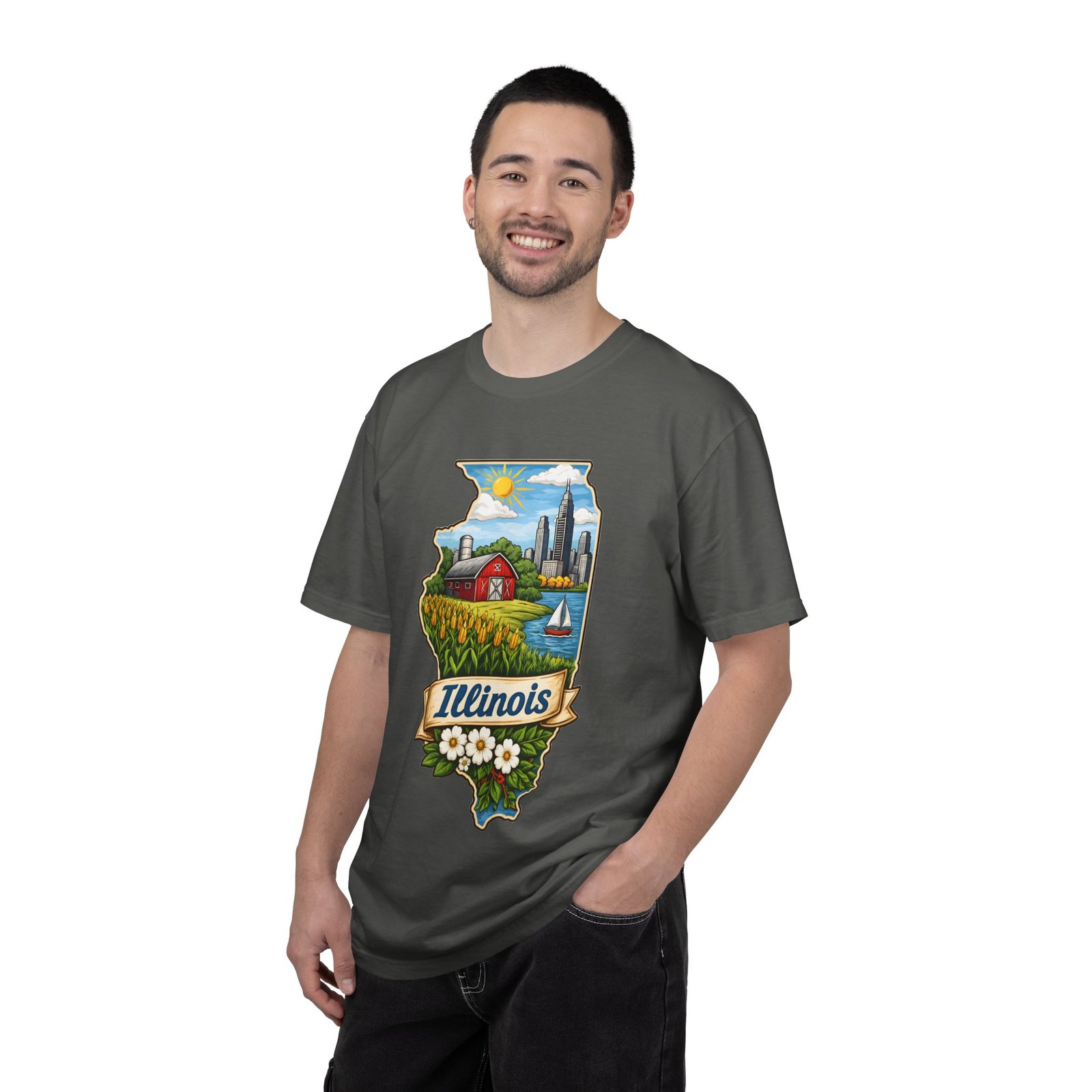 This heavyweight garment-dyed tee wears like a lived-in favorite from the first moment. The front carries a warm, illustrated Illinois map — fields, a red barn, lakewater with a sailboat and a skyline peeking in the distance — finished with a banner and wildflowers for a vintage-travel patch vibe. The relaxed, slightly boxy silhouette and soft, pre-shrunk cotton make it a go-to for weekend road trips, farmers’ market runs, and slow summer evenings on a porch. It layers easily under jackets or stands alone with denim; the muted, garment-dyed color and sewn-in label keep the look effortless and intentional. If you want a shirt that reads like hometown pride and quiet afternoons in one, this tee slips into that story naturally.