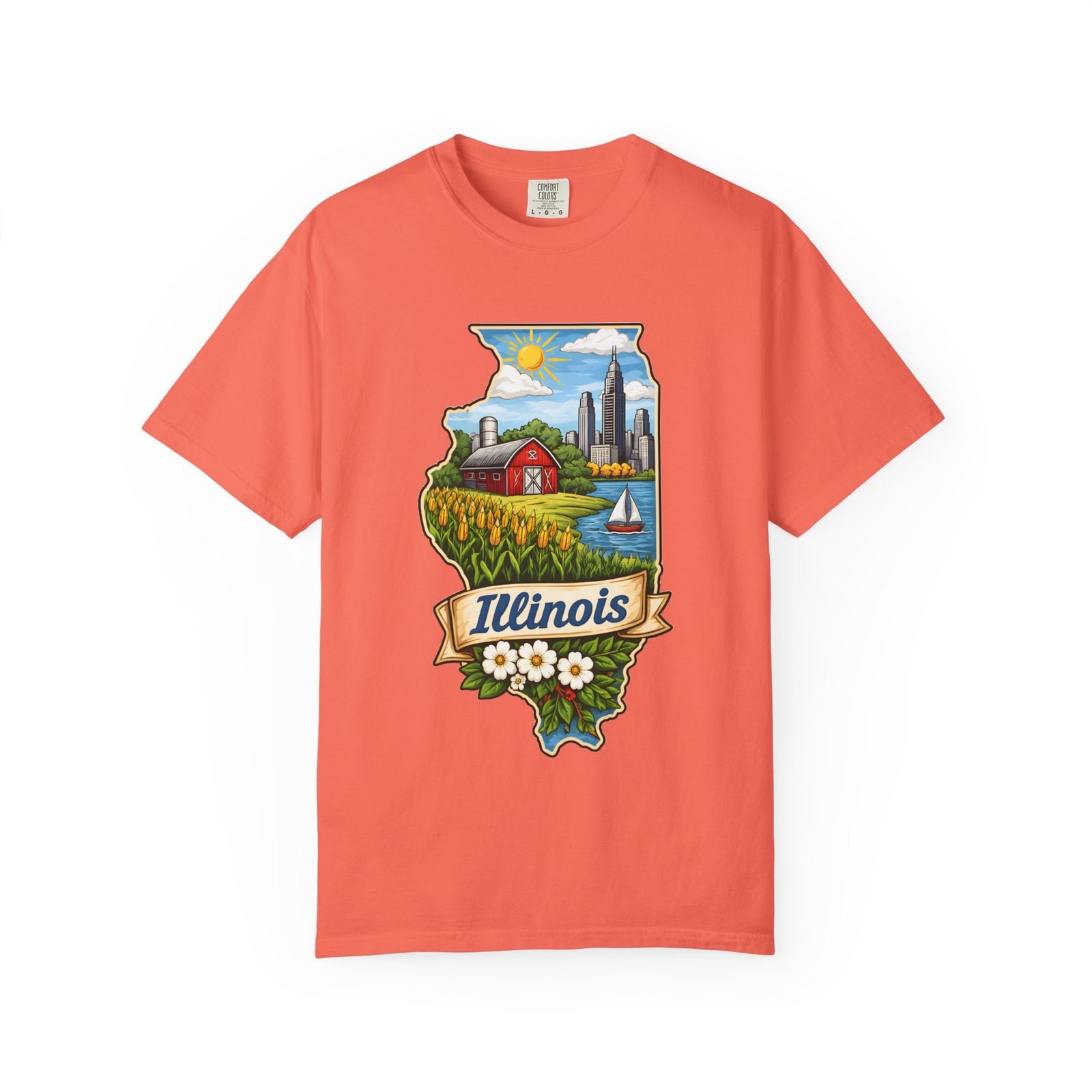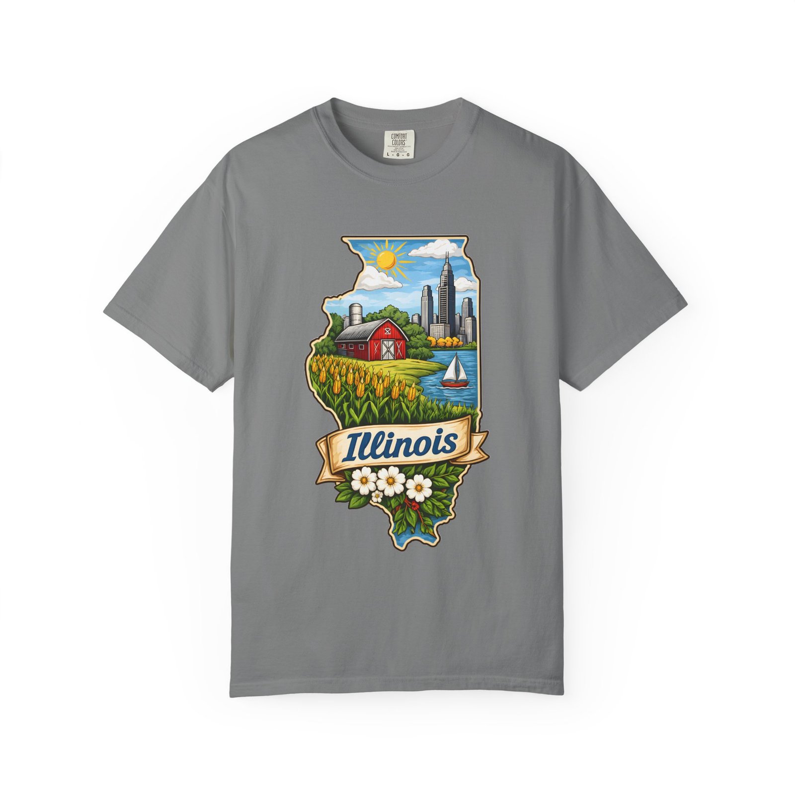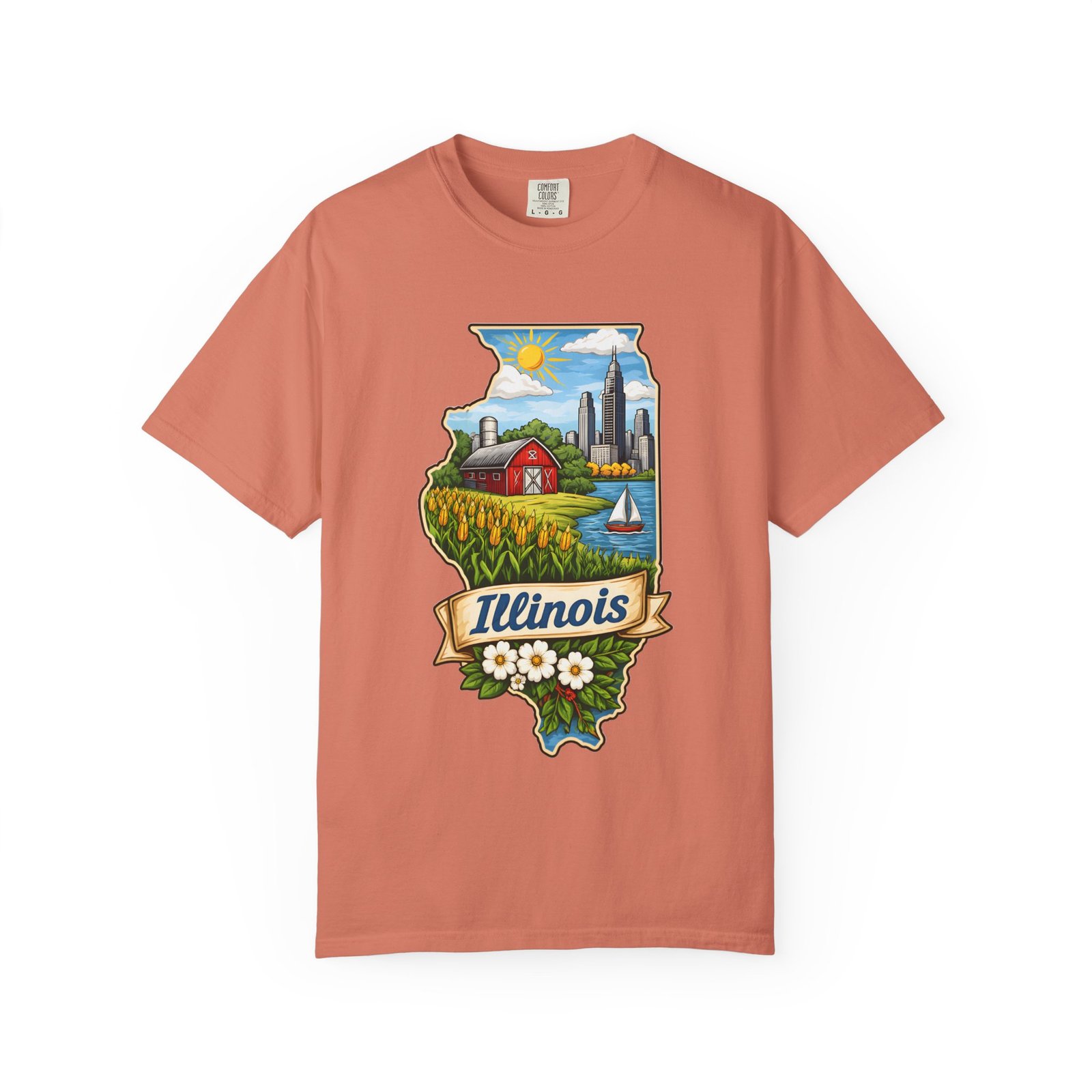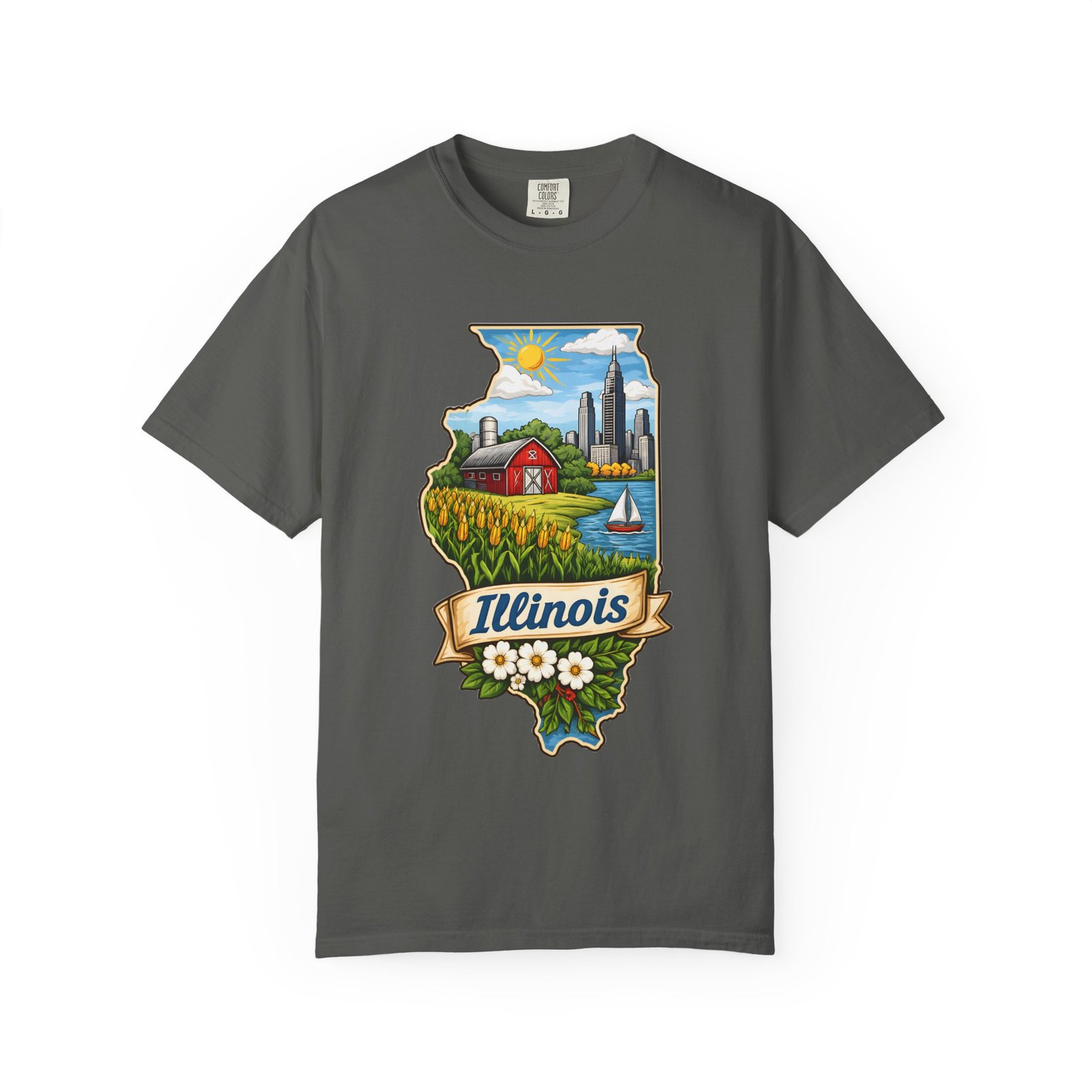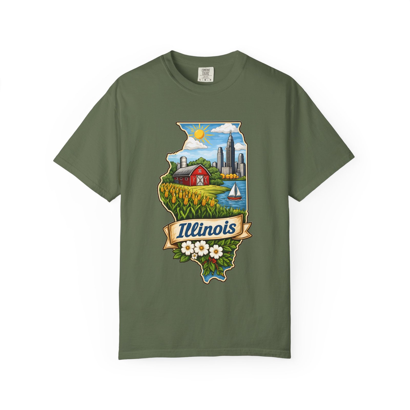 This heavyweight garment-dyed tee wears like a lived-in favorite from the first moment. The front carries a warm, illustrated Illinois map — fields, a red barn, lakewater with a sailboat and a skyline peeking in the distance — finished with a banner and wildflowers for a vintage-travel patch vibe. The relaxed, slightly boxy silhouette and soft, pre-shrunk cotton make it a go-to for weekend road trips, farmers’ market runs, and slow summer evenings on a porch. It layers easily under jackets or stands alone with denim; the muted, garment-dyed color and sewn-in label keep the look effortless and intentional. If you want a shirt that reads like hometown pride and quiet afternoons in one, this tee slips into that story naturally.