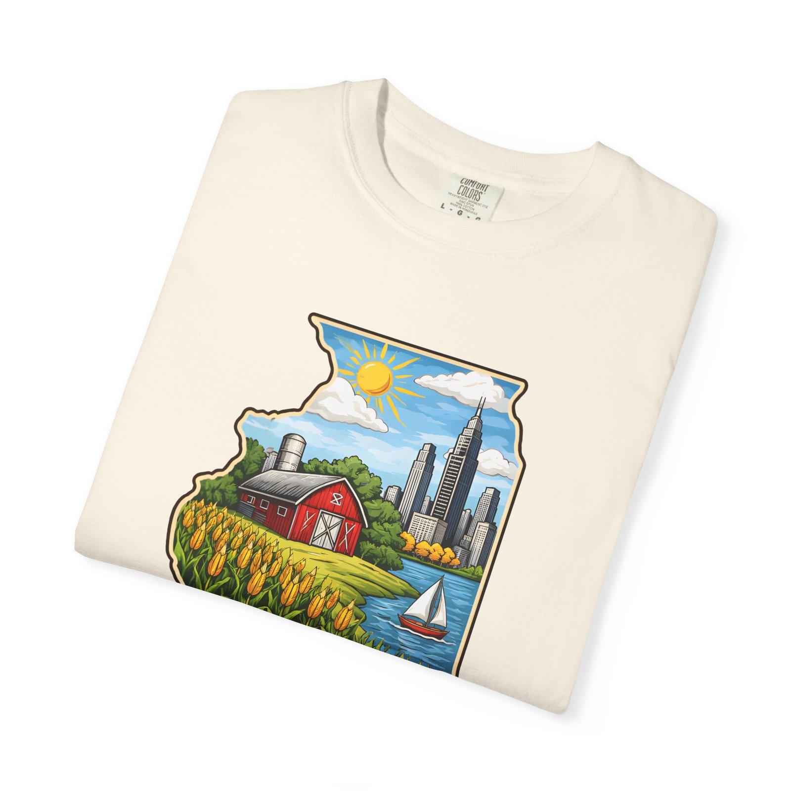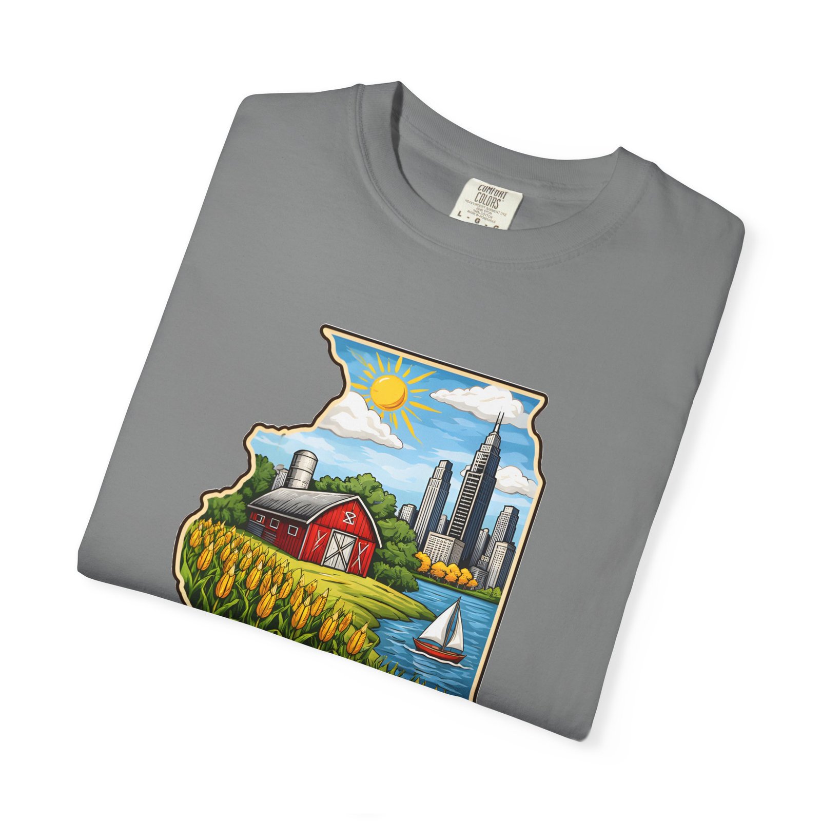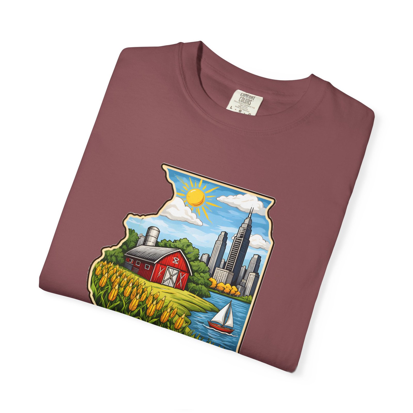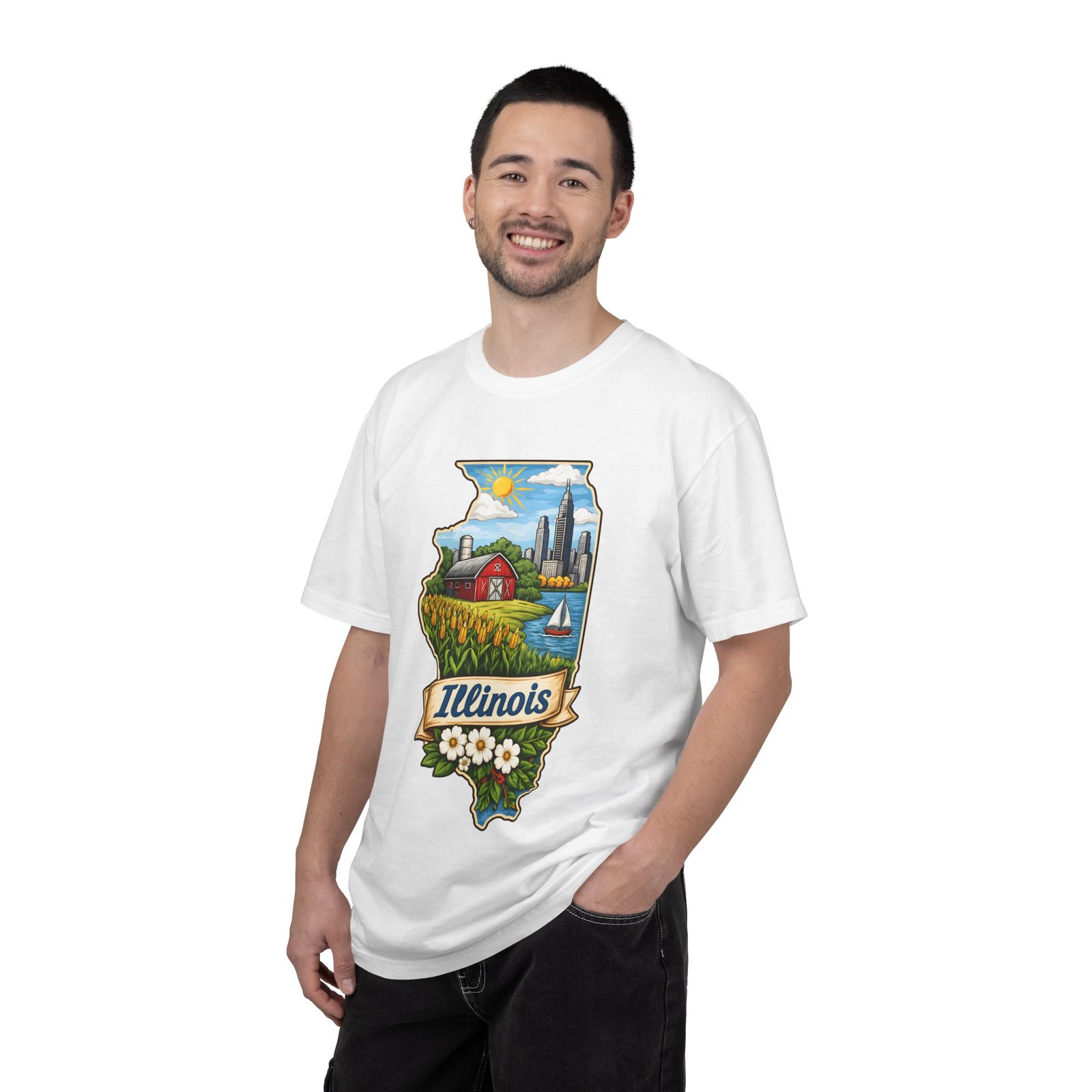 This heavyweight garment-dyed tee wears like a lived-in favorite from the first moment. The front carries a warm, illustrated Illinois map — fields, a red barn, lakewater with a sailboat and a skyline peeking in the distance — finished with a banner and wildflowers for a vintage-travel patch vibe. The relaxed, slightly boxy silhouette and soft, pre-shrunk cotton make it a go-to for weekend road trips, farmers’ market runs, and slow summer evenings on a porch. It layers easily under jackets or stands alone with denim; the muted, garment-dyed color and sewn-in label keep the look effortless and intentional. If you want a shirt that reads like hometown pride and quiet afternoons in one, this tee slips into that story naturally.