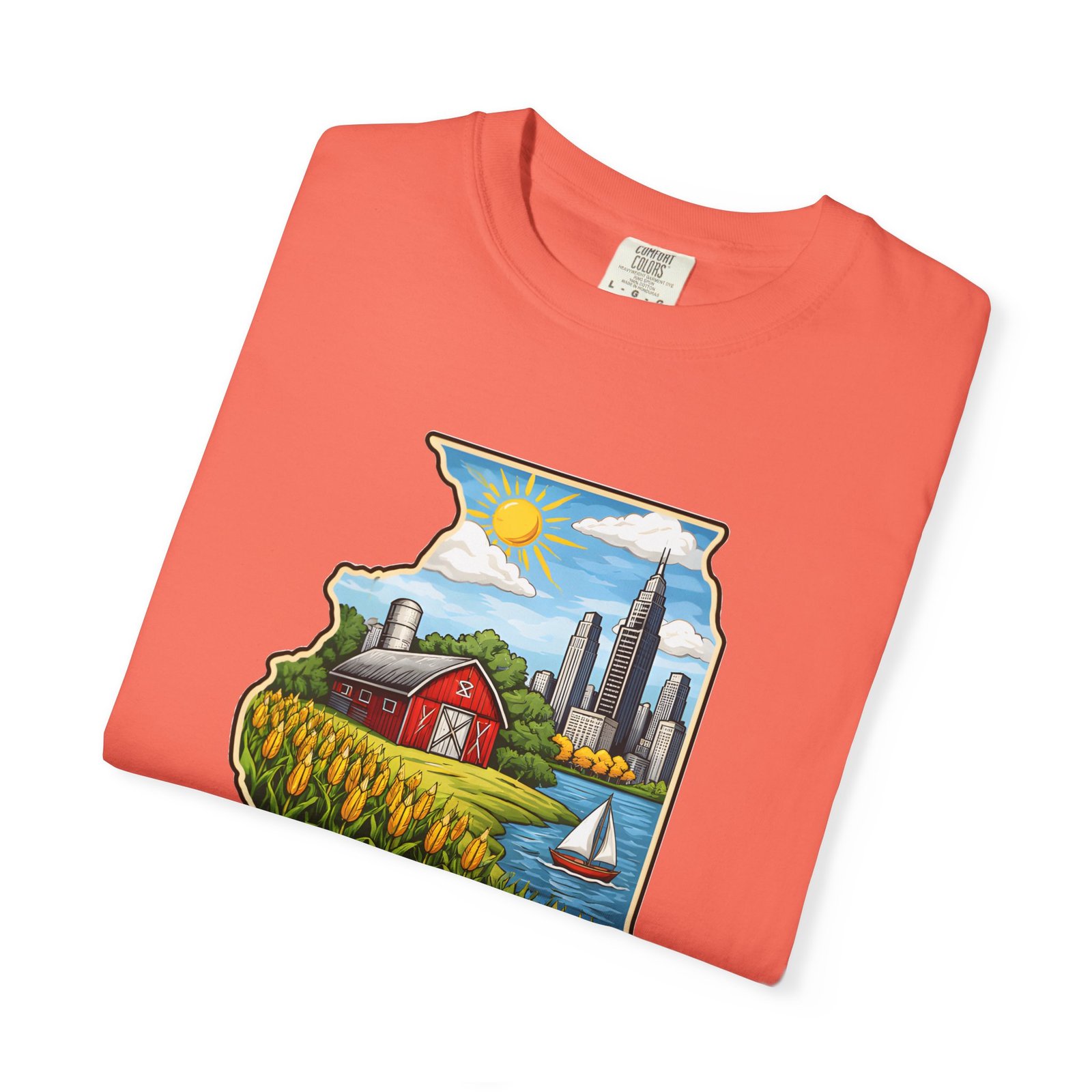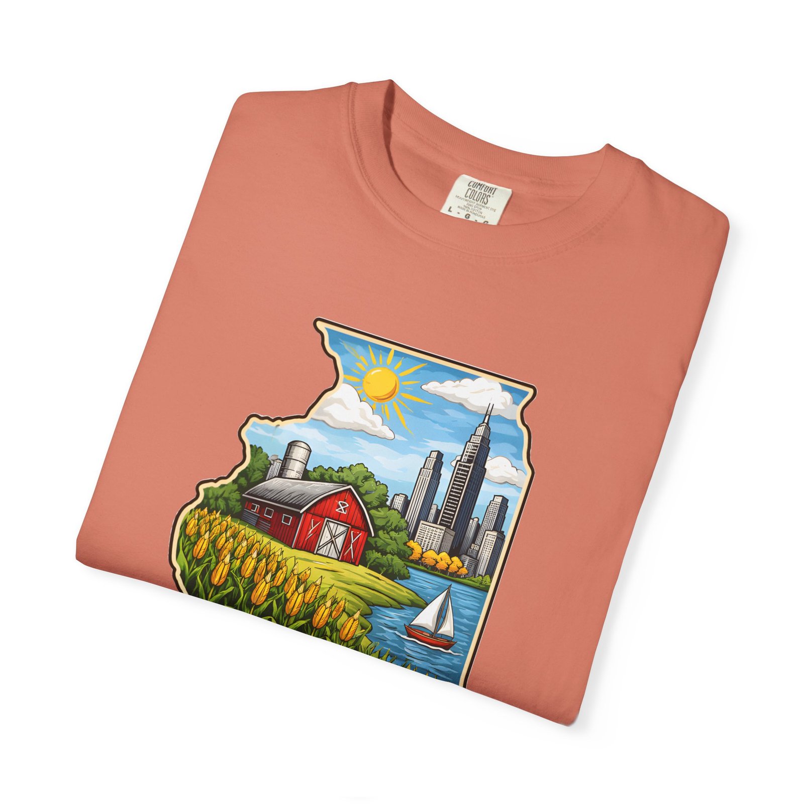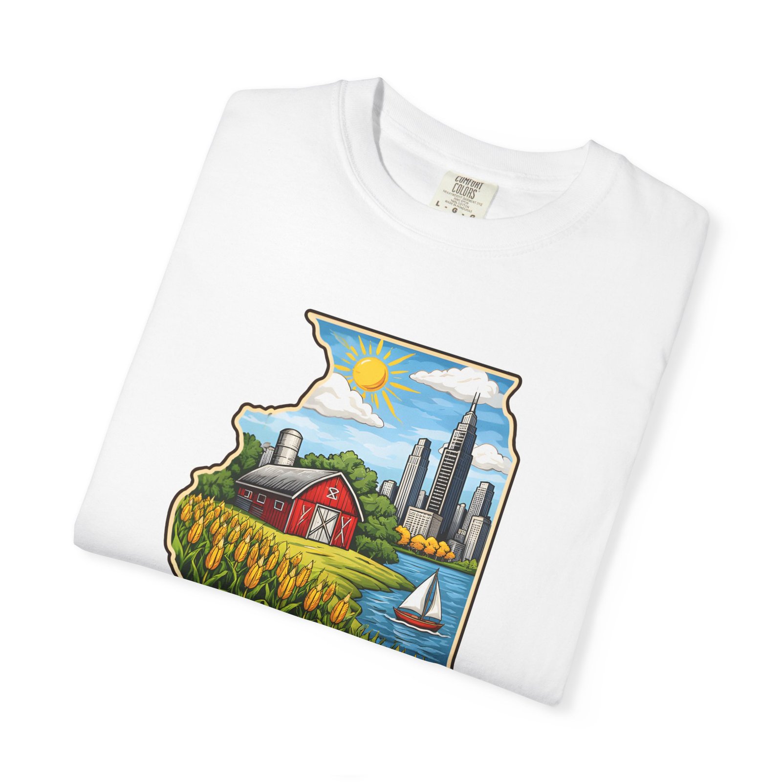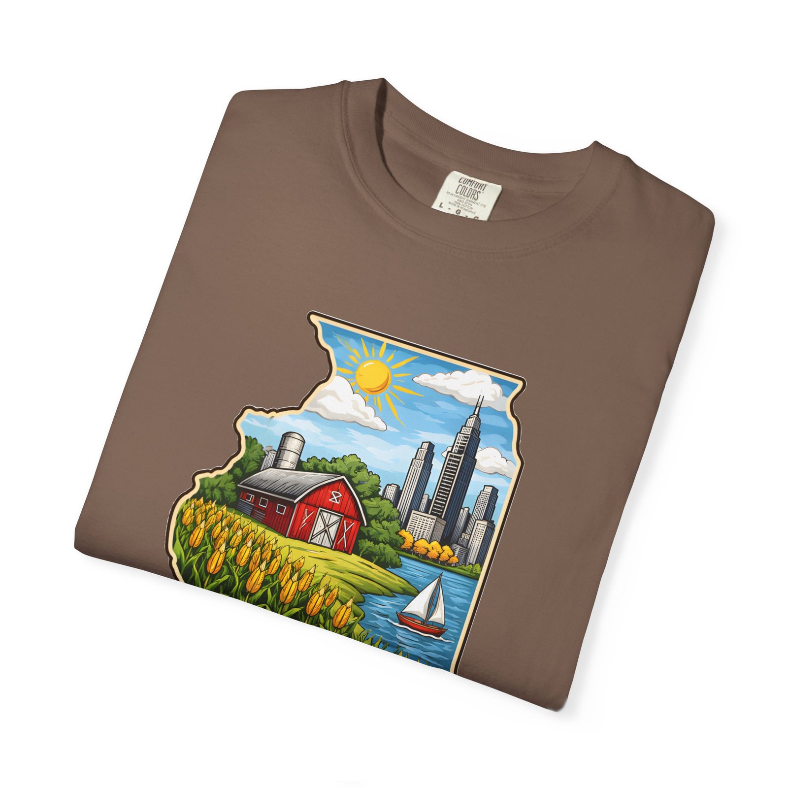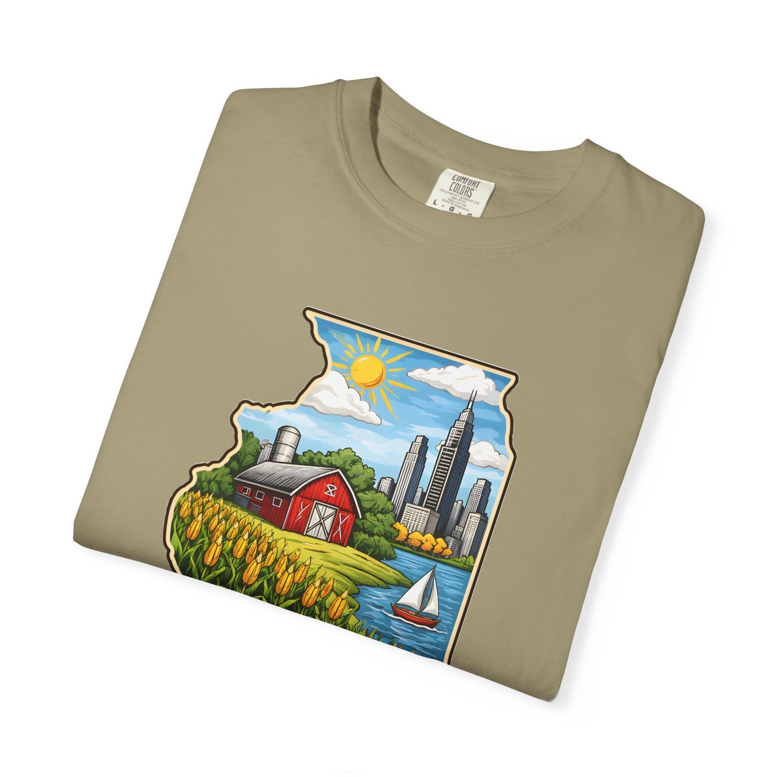 This heavyweight garment-dyed tee wears like a lived-in favorite from the first moment. The front carries a warm, illustrated Illinois map — fields, a red barn, lakewater with a sailboat and a skyline peeking in the distance — finished with a banner and wildflowers for a vintage-travel patch vibe. The relaxed, slightly boxy silhouette and soft, pre-shrunk cotton make it a go-to for weekend road trips, farmers’ market runs, and slow summer evenings on a porch. It layers easily under jackets or stands alone with denim; the muted, garment-dyed color and sewn-in label keep the look effortless and intentional. If you want a shirt that reads like hometown pride and quiet afternoons in one, this tee slips into that story naturally.