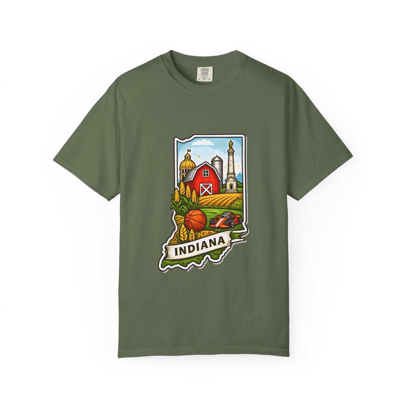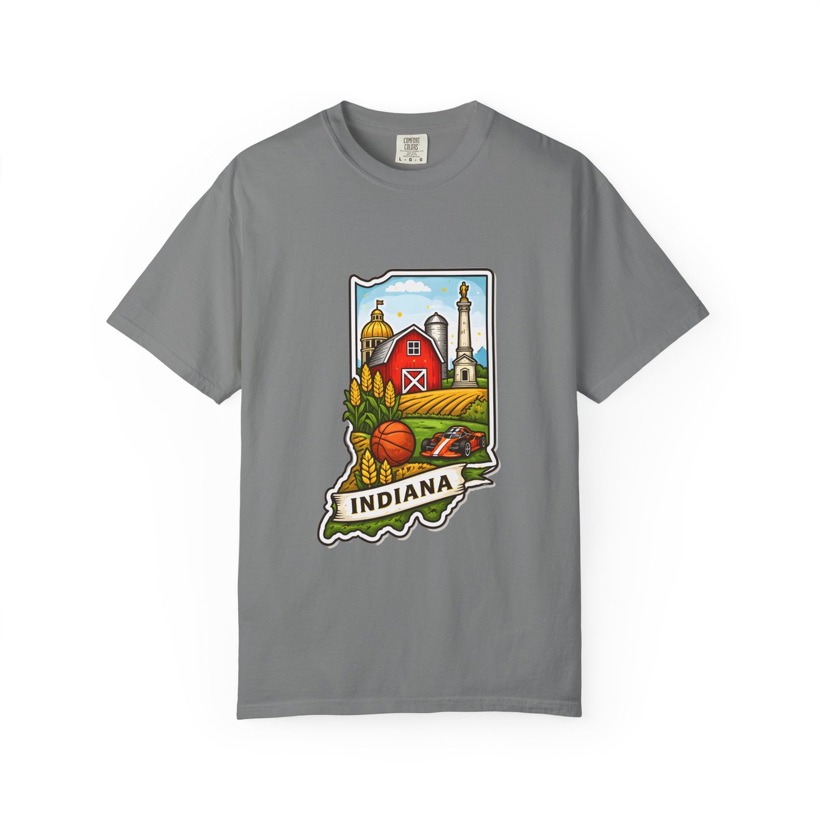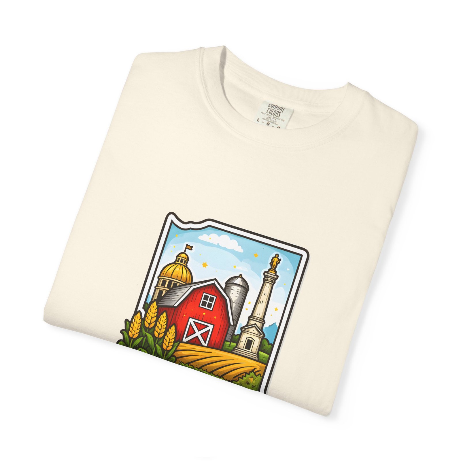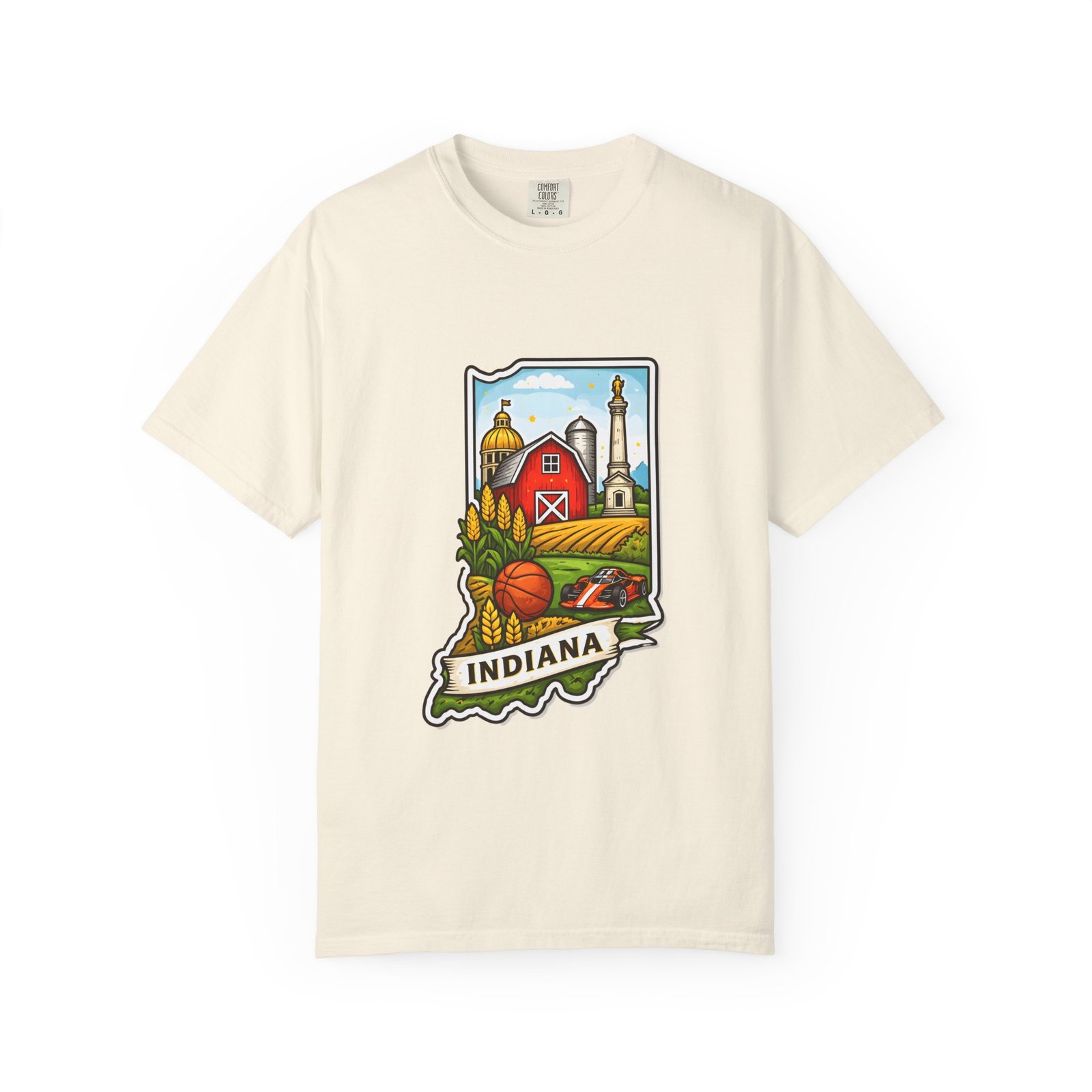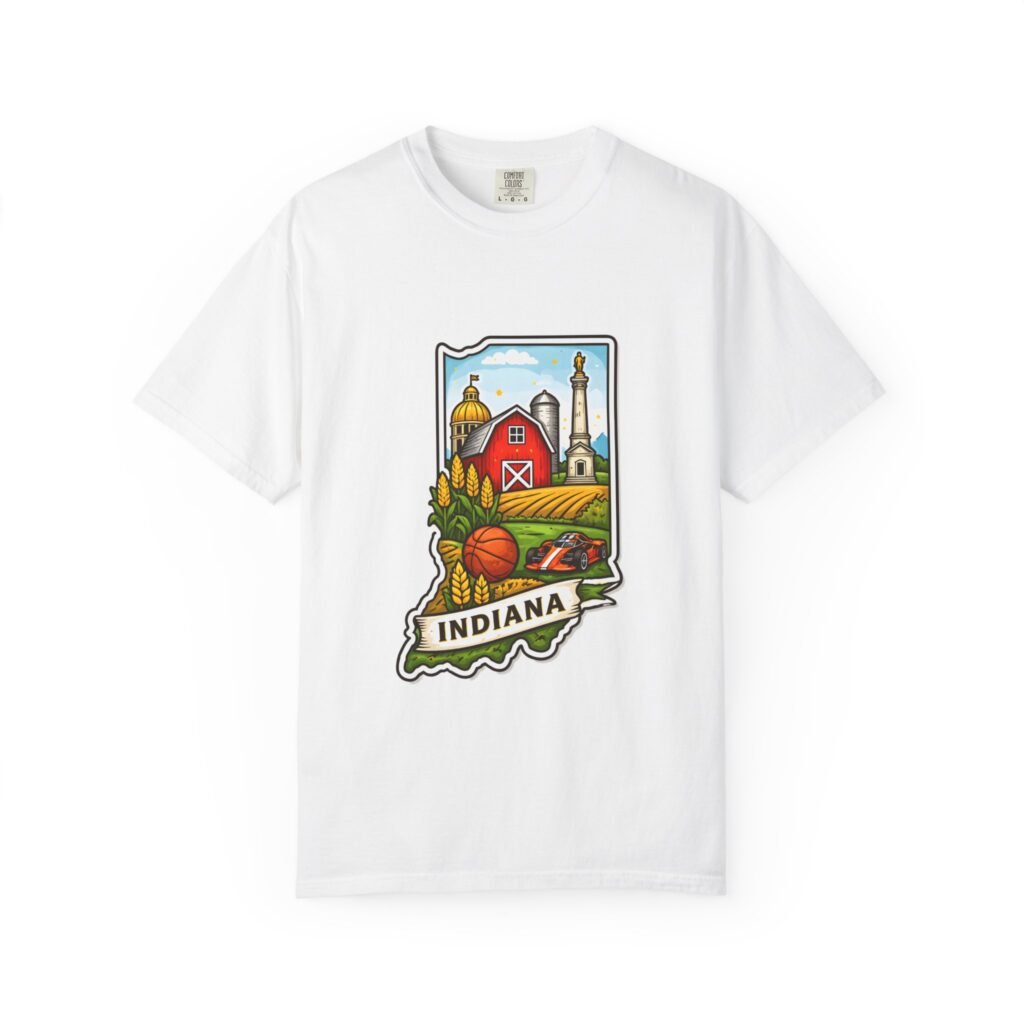 This garment-dyed tee brings a quiet slice of Hoosier life to your everyday wardrobe. The heavyweight, relaxed-fit cotton feels lived-in from the first wear, the soft-dyed finish giving each color a vintage, well-loved look. The front artwork—an illustrated Indiana silhouette filled with barn, silo, harvest fields and a warm horizon—reads like a short story about home, slow mornings, and open roads. It sits comfortably in casual routines: thrown on for farmstand runs, layered under a flannel for autumn parades, or worn at community gatherings that celebrate local roots. Durable double-needle seams and tubular knit construction keep it honest through repeated wear, while the range of sizes and many colorways make it easy to find a shade that fades into your favorite rotation.