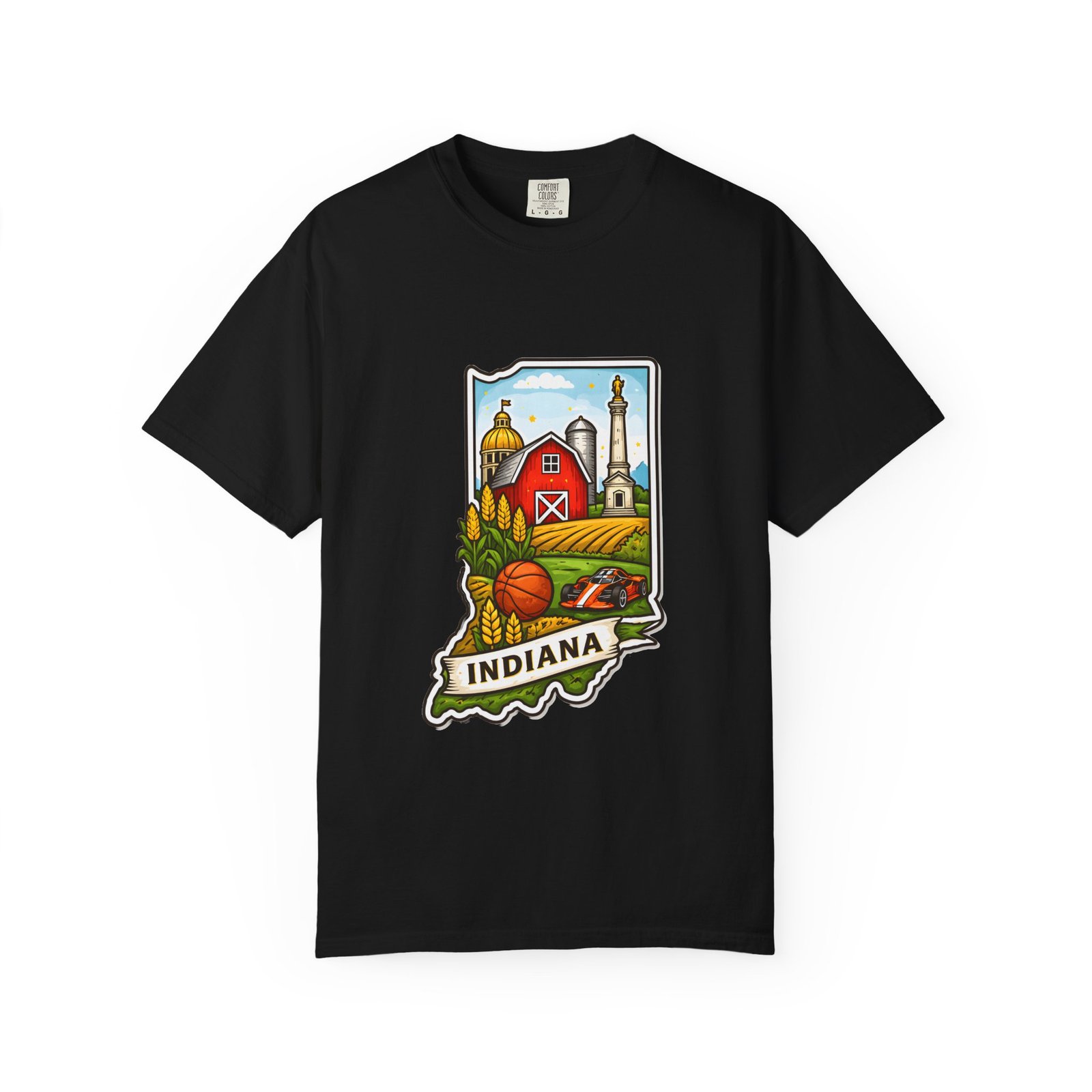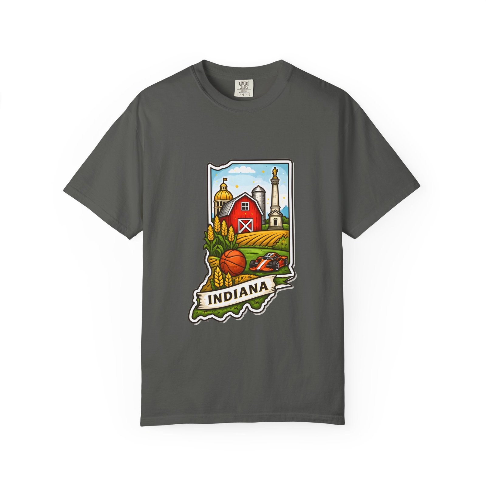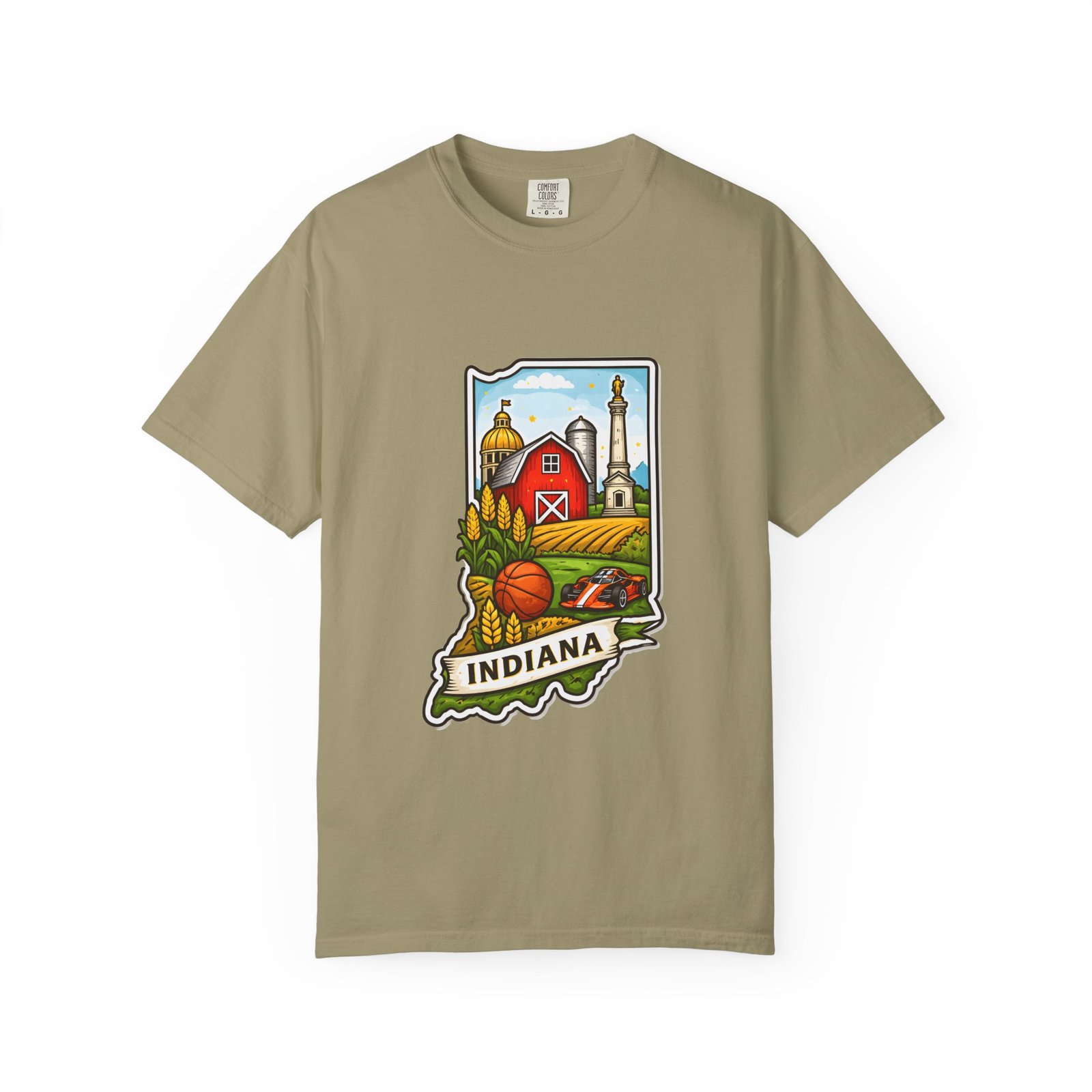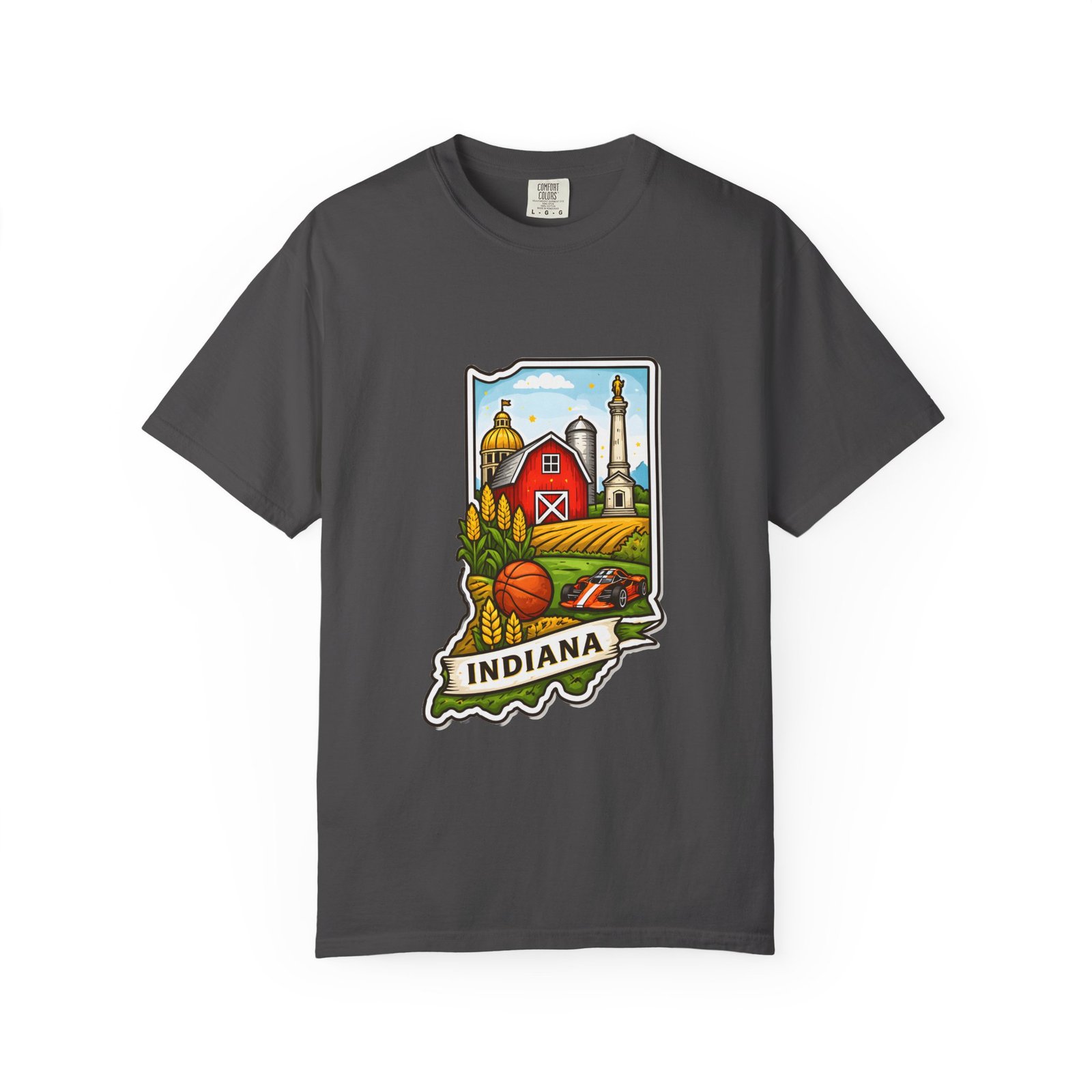 This garment-dyed tee brings a quiet slice of Hoosier life to your everyday wardrobe. The heavyweight, relaxed-fit cotton feels lived-in from the first wear, the soft-dyed finish giving each color a vintage, well-loved look. The front artwork—an illustrated Indiana silhouette filled with barn, silo, harvest fields and a warm horizon—reads like a short story about home, slow mornings, and open roads. It sits comfortably in casual routines: thrown on for farmstand runs, layered under a flannel for autumn parades, or worn at community gatherings that celebrate local roots. Durable double-needle seams and tubular knit construction keep it honest through repeated wear, while the range of sizes and many colorways make it easy to find a shade that fades into your favorite rotation.