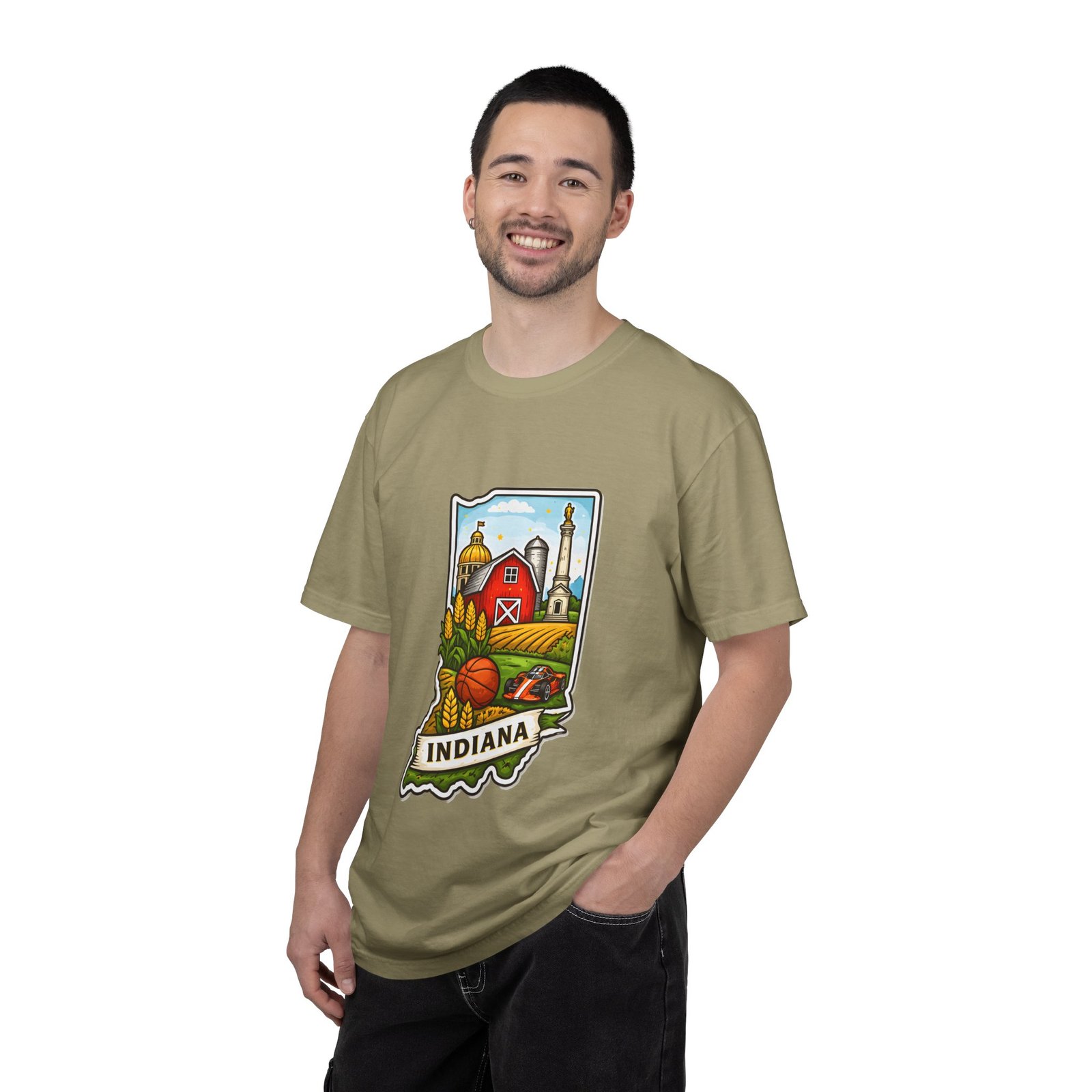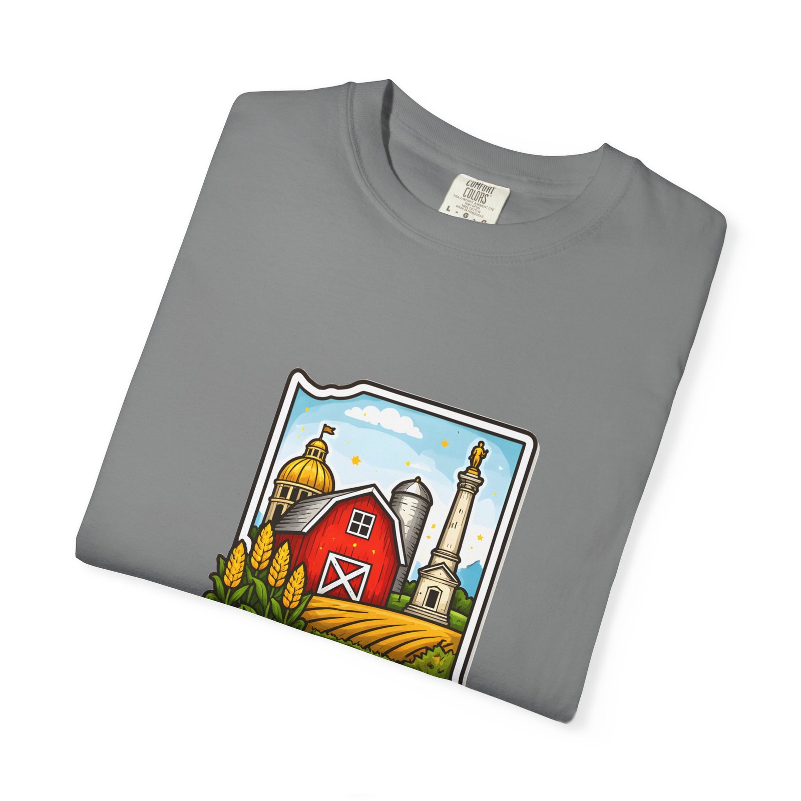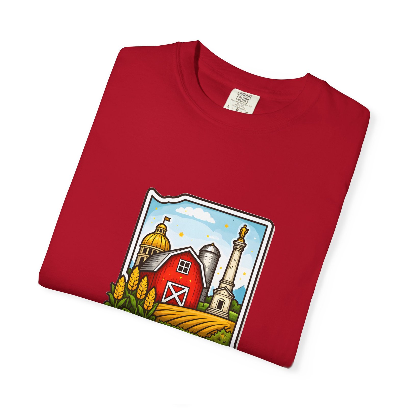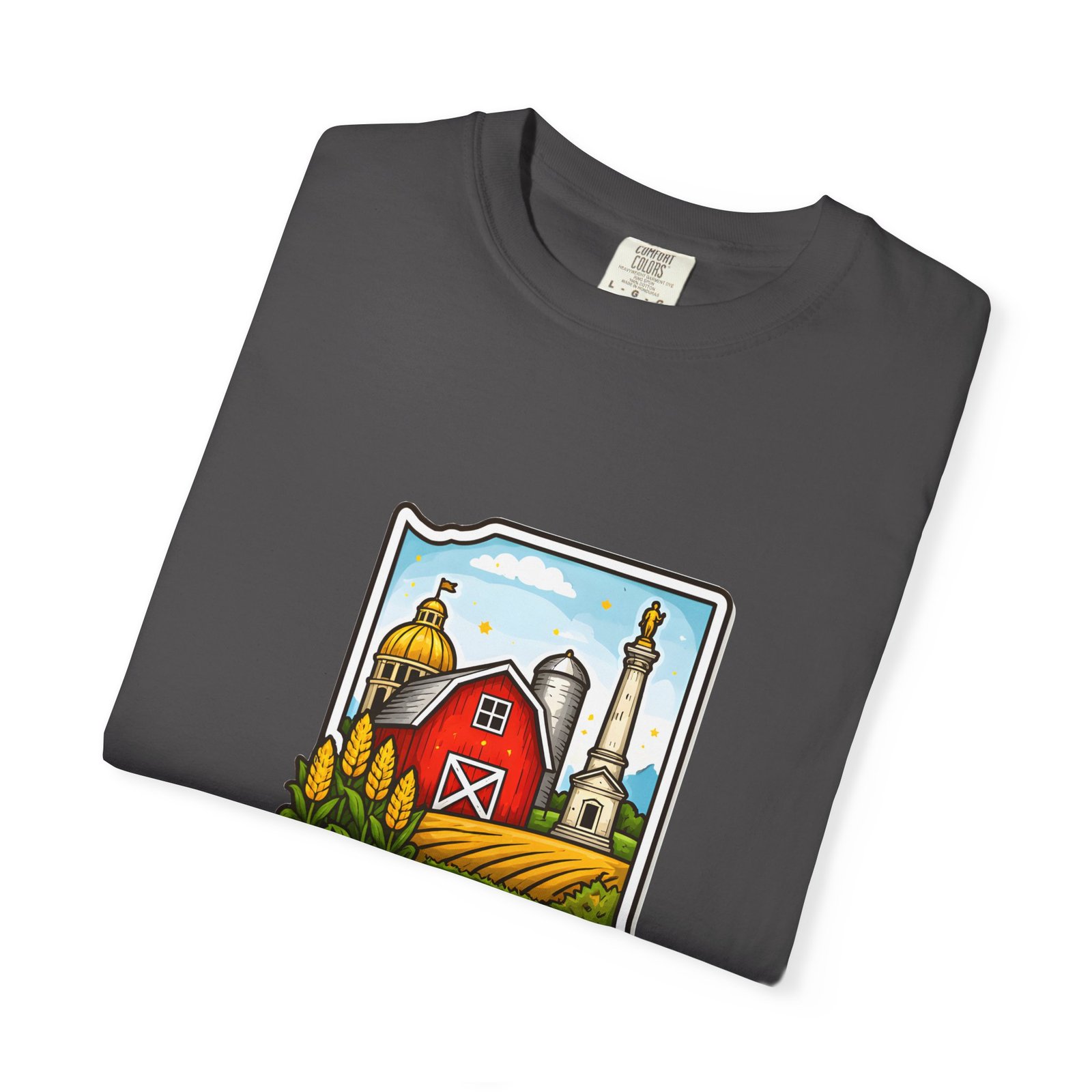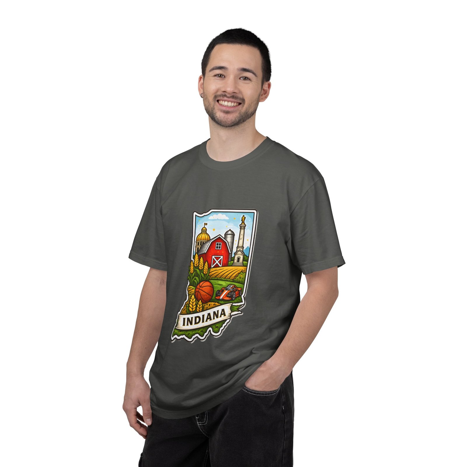 This garment-dyed tee brings a quiet slice of Hoosier life to your everyday wardrobe. The heavyweight, relaxed-fit cotton feels lived-in from the first wear, the soft-dyed finish giving each color a vintage, well-loved look. The front artwork—an illustrated Indiana silhouette filled with barn, silo, harvest fields and a warm horizon—reads like a short story about home, slow mornings, and open roads. It sits comfortably in casual routines: thrown on for farmstand runs, layered under a flannel for autumn parades, or worn at community gatherings that celebrate local roots. Durable double-needle seams and tubular knit construction keep it honest through repeated wear, while the range of sizes and many colorways make it easy to find a shade that fades into your favorite rotation.