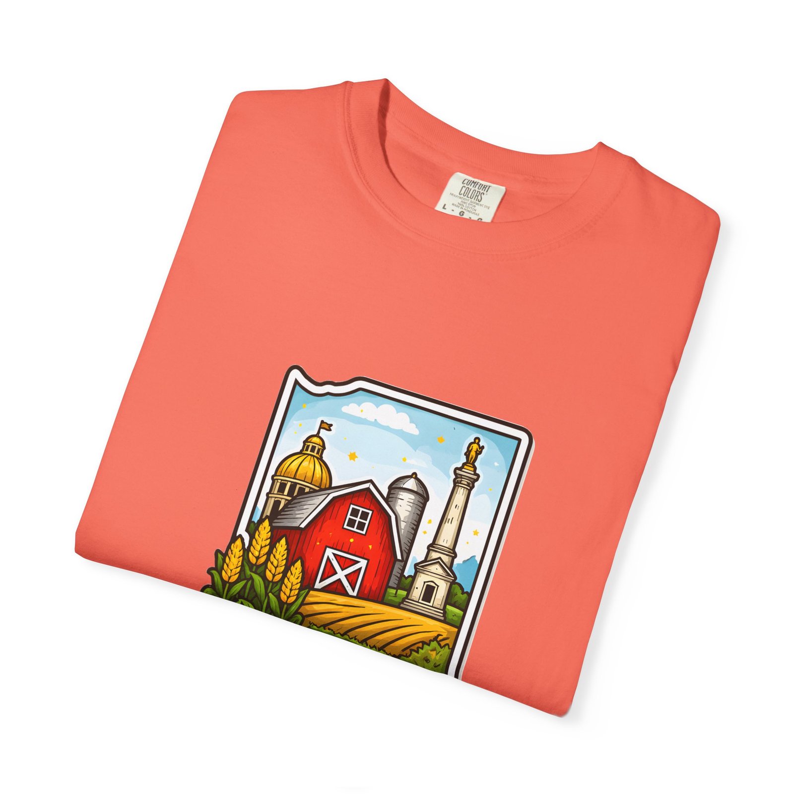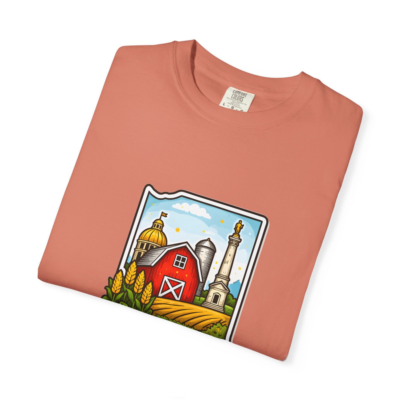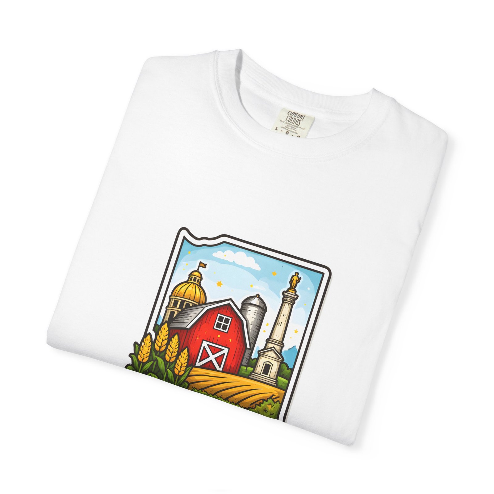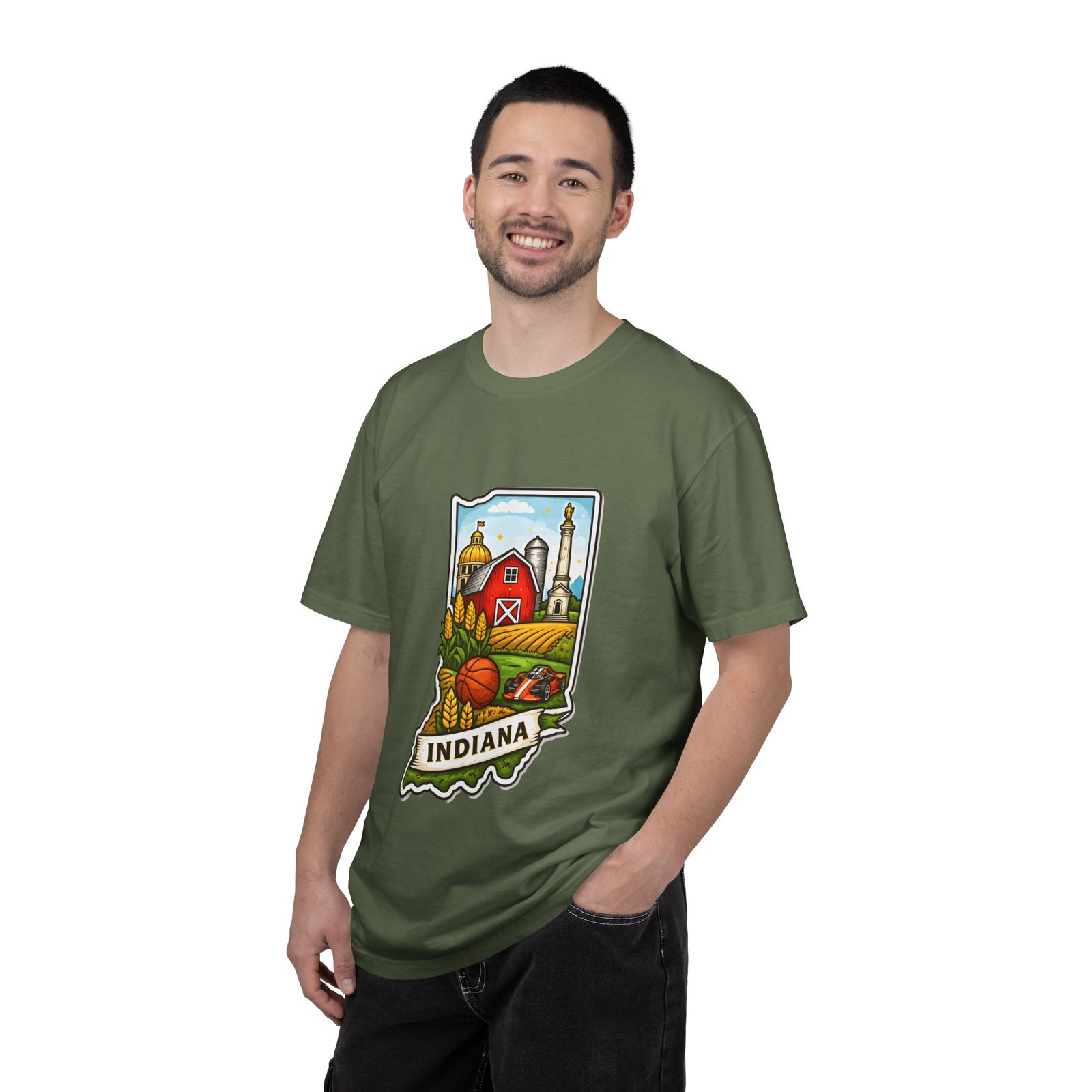 This garment-dyed tee brings a quiet slice of Hoosier life to your everyday wardrobe. The heavyweight, relaxed-fit cotton feels lived-in from the first wear, the soft-dyed finish giving each color a vintage, well-loved look. The front artwork—an illustrated Indiana silhouette filled with barn, silo, harvest fields and a warm horizon—reads like a short story about home, slow mornings, and open roads. It sits comfortably in casual routines: thrown on for farmstand runs, layered under a flannel for autumn parades, or worn at community gatherings that celebrate local roots. Durable double-needle seams and tubular knit construction keep it honest through repeated wear, while the range of sizes and many colorways make it easy to find a shade that fades into your favorite rotation.