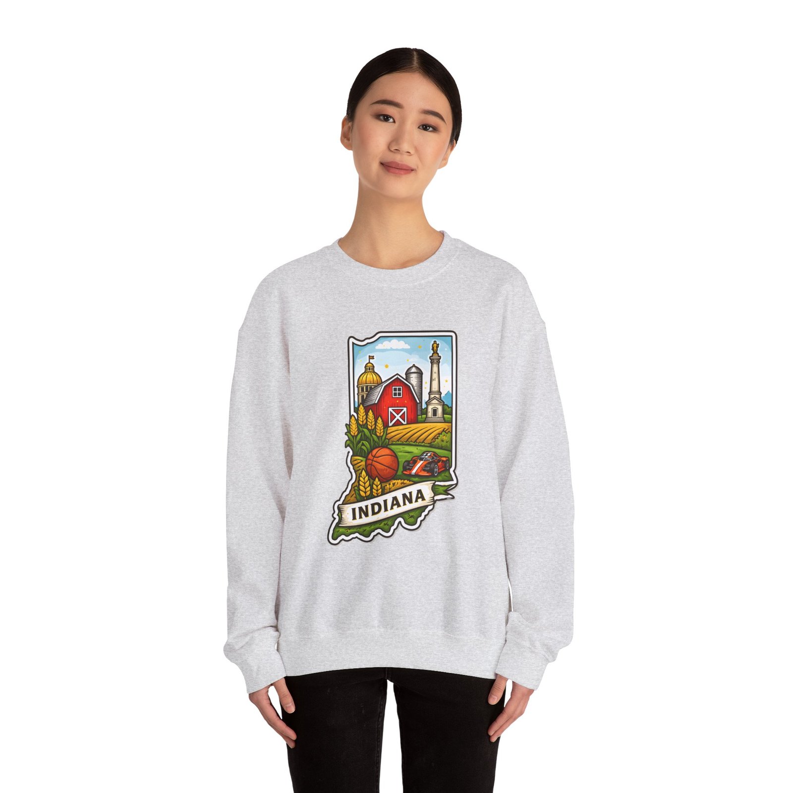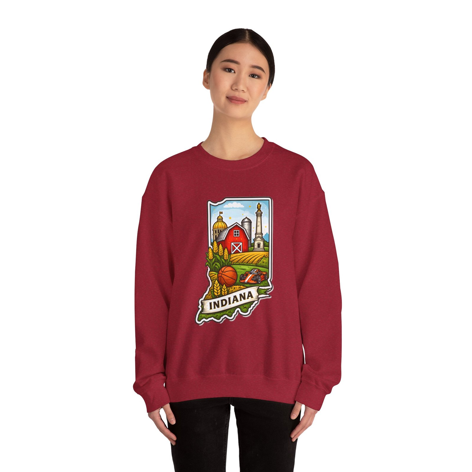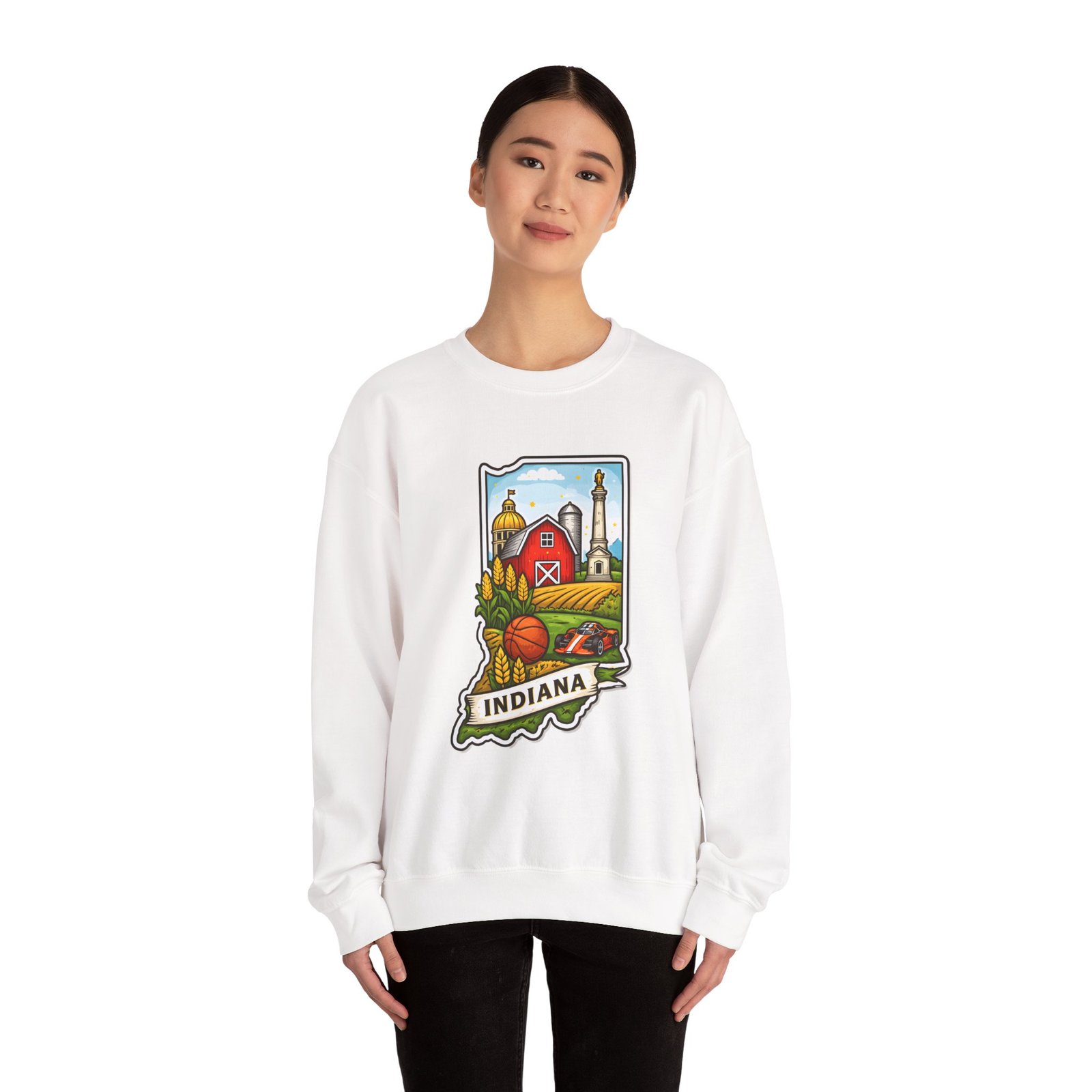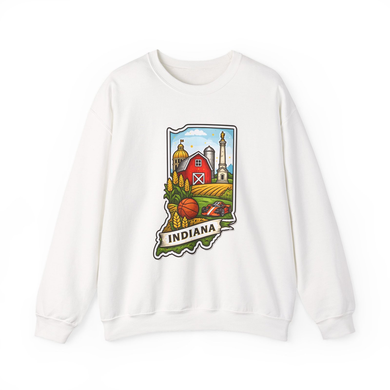 Wrap yourself in a soft, lived-in kind of comfort that feels like home. This cozy crewneck carries a warm, nostalgic illustration of Indiana — red barn, rolling fields, a church steeple, and a basketball — printed on a clean white backdrop. It sits loose but neat, the ribbed collar and double-stitched seams holding their shape through weekend errands, late-night drives, or slow mornings with coffee. Embroidery options at chest or wrists add a handcrafted touch, while tubular knit construction keeps the silhouette smooth and simple. Wear it to honor state roots, cheer on local teams, or bring a quiet piece of country calm to city life.