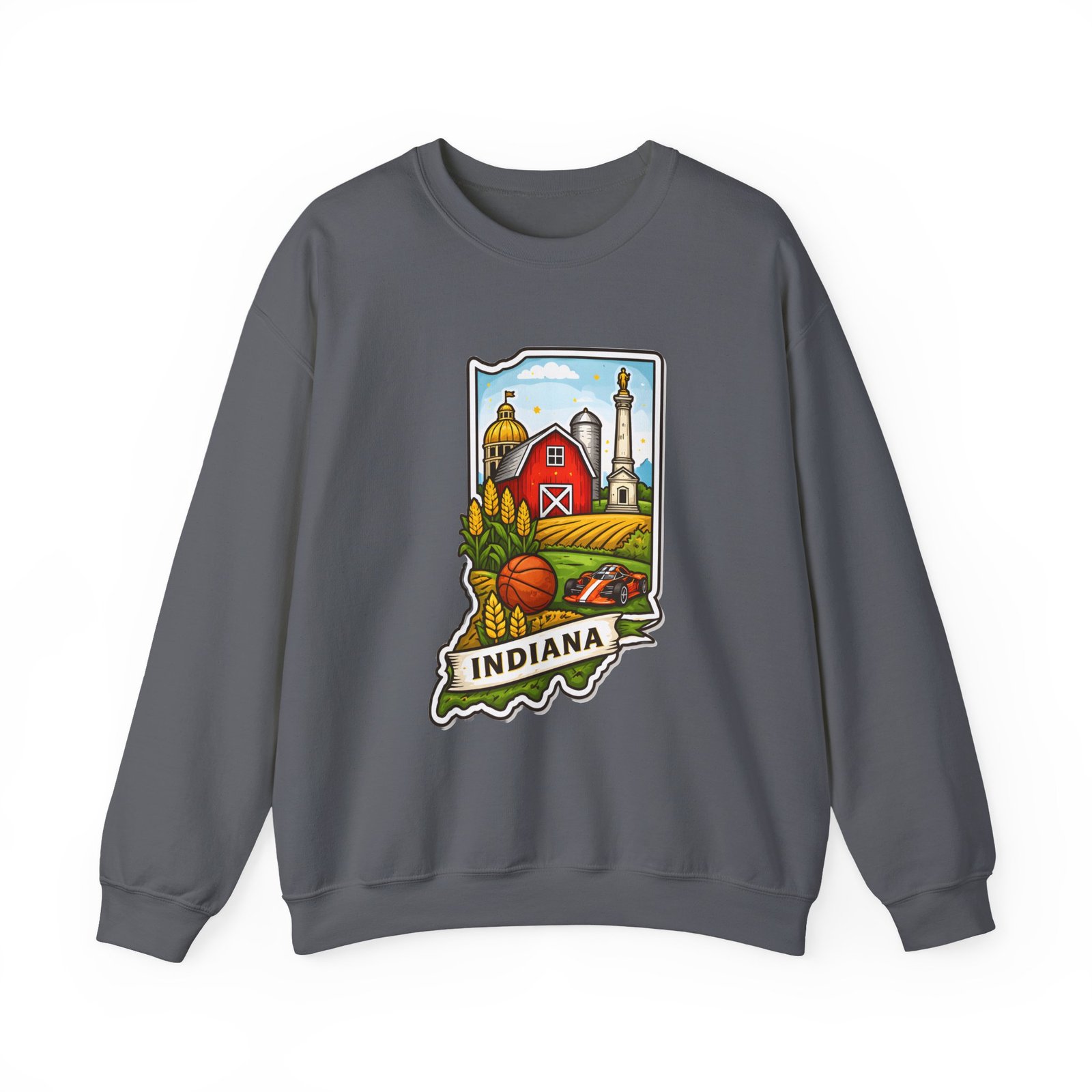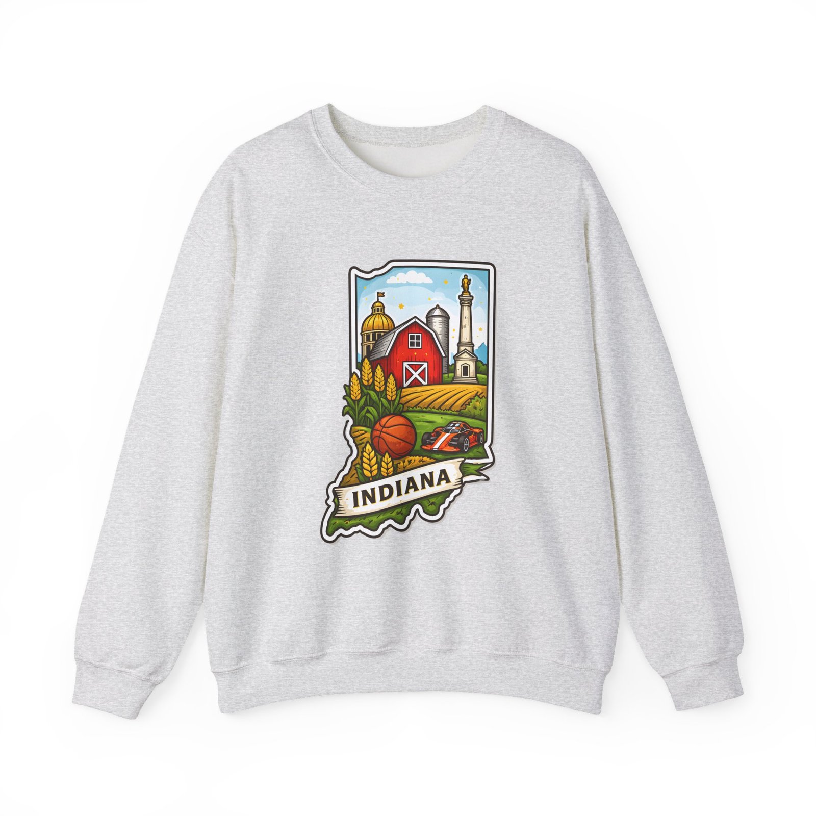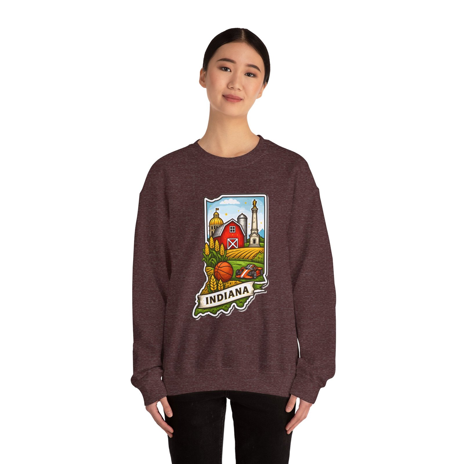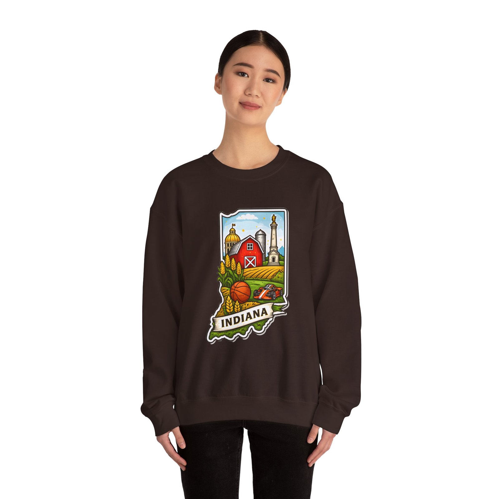 Wrap yourself in a soft, lived-in kind of comfort that feels like home. This cozy crewneck carries a warm, nostalgic illustration of Indiana — red barn, rolling fields, a church steeple, and a basketball — printed on a clean white backdrop. It sits loose but neat, the ribbed collar and double-stitched seams holding their shape through weekend errands, late-night drives, or slow mornings with coffee. Embroidery options at chest or wrists add a handcrafted touch, while tubular knit construction keeps the silhouette smooth and simple. Wear it to honor state roots, cheer on local teams, or bring a quiet piece of country calm to city life.