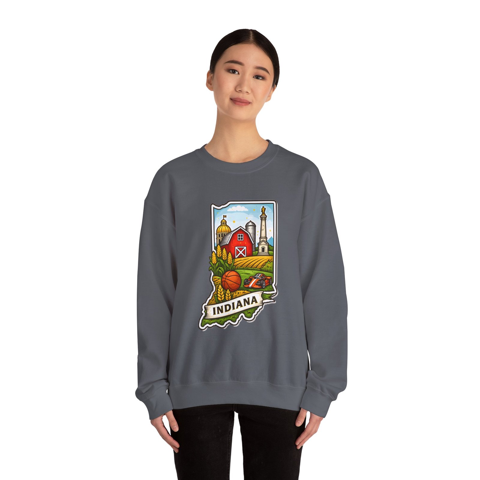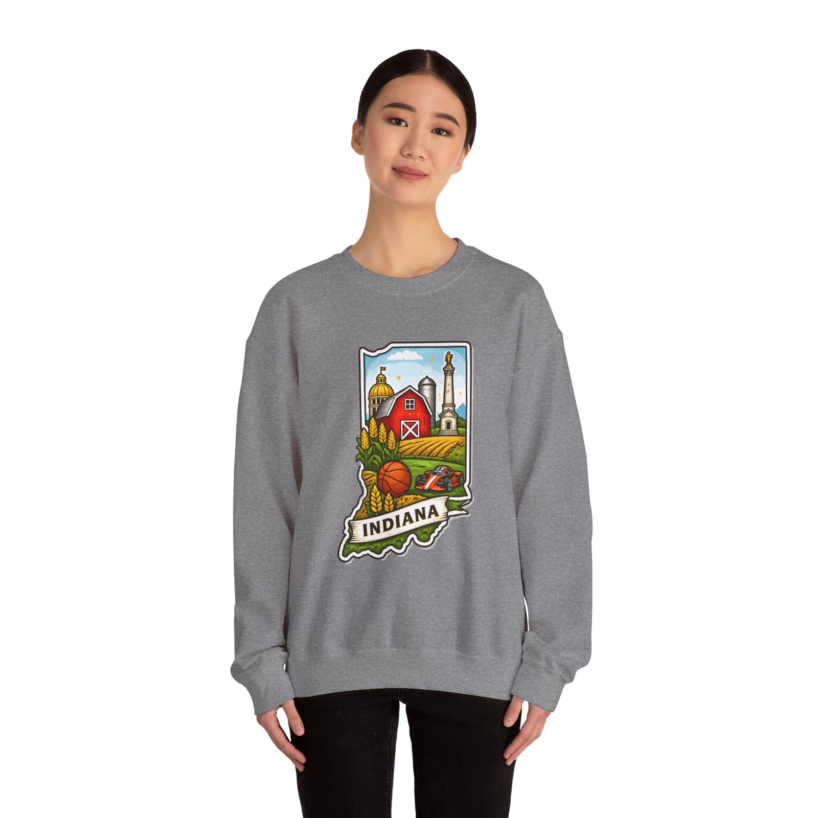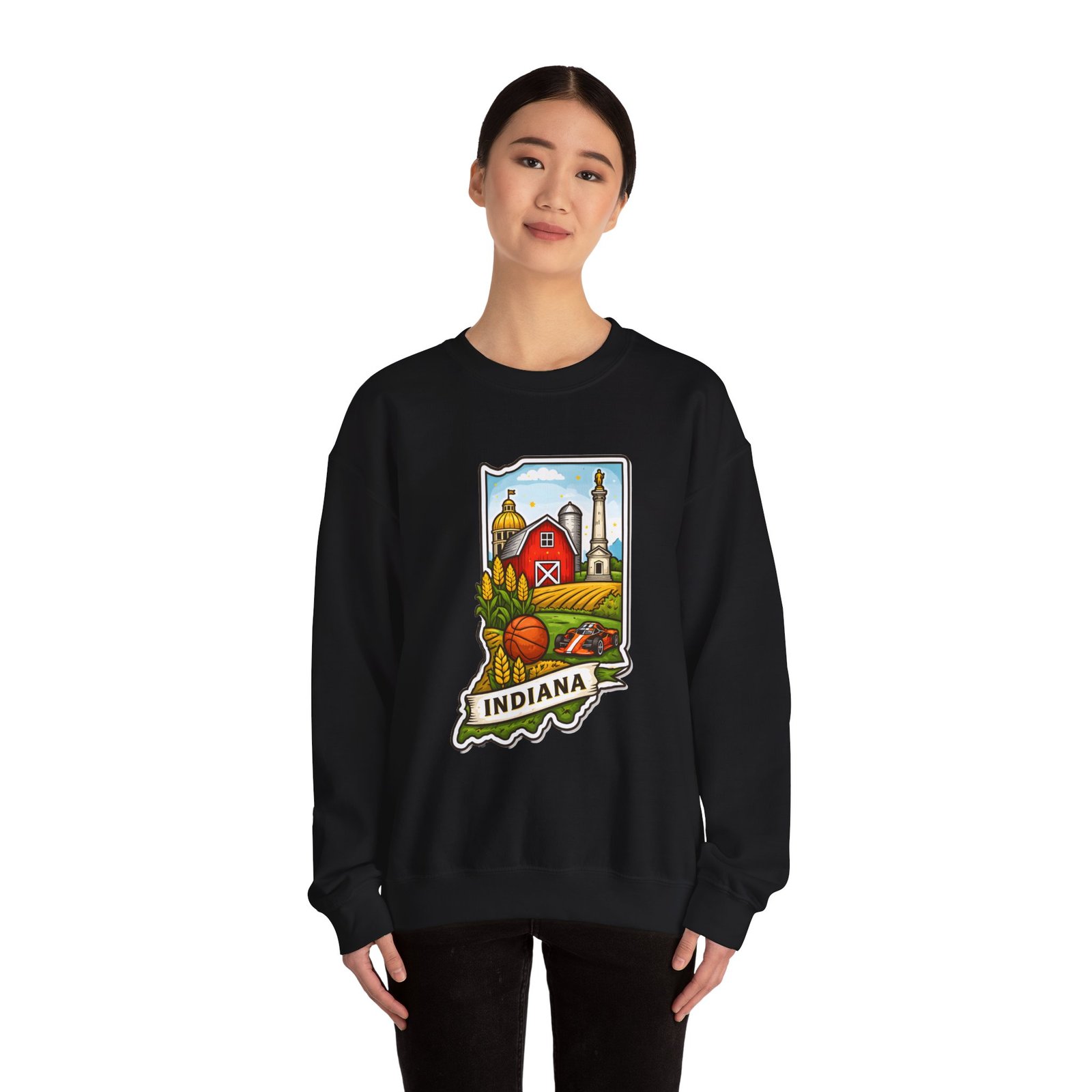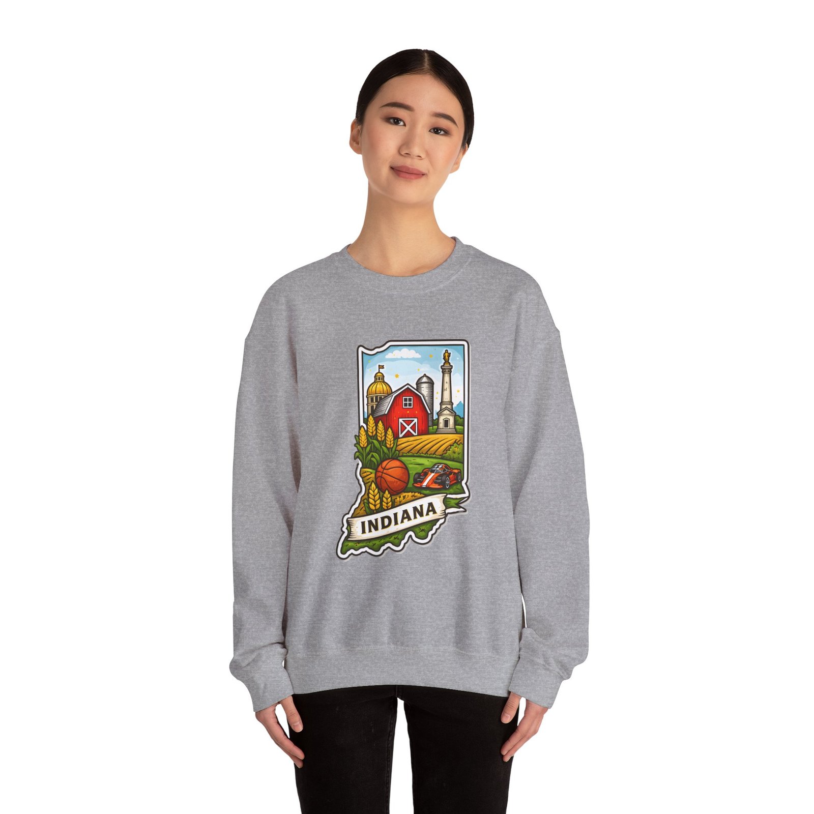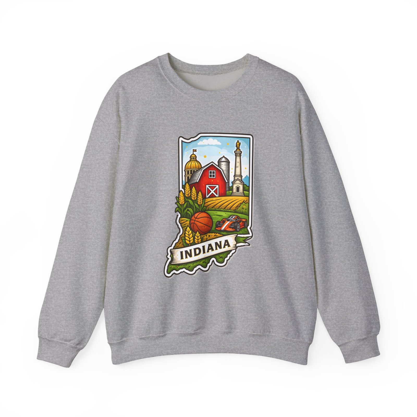 Wrap yourself in a soft, lived-in kind of comfort that feels like home. This cozy crewneck carries a warm, nostalgic illustration of Indiana — red barn, rolling fields, a church steeple, and a basketball — printed on a clean white backdrop. It sits loose but neat, the ribbed collar and double-stitched seams holding their shape through weekend errands, late-night drives, or slow mornings with coffee. Embroidery options at chest or wrists add a handcrafted touch, while tubular knit construction keeps the silhouette smooth and simple. Wear it to honor state roots, cheer on local teams, or bring a quiet piece of country calm to city life.