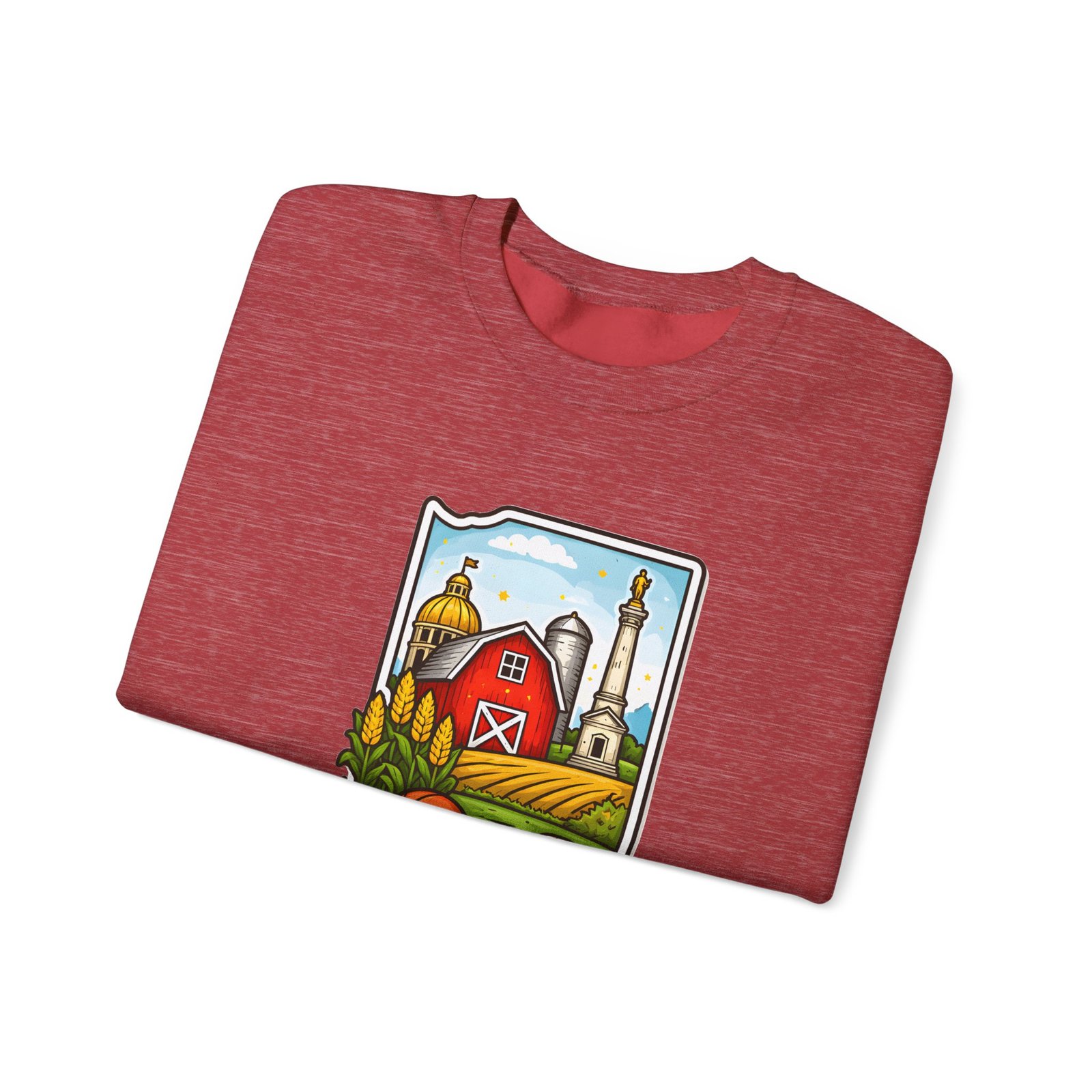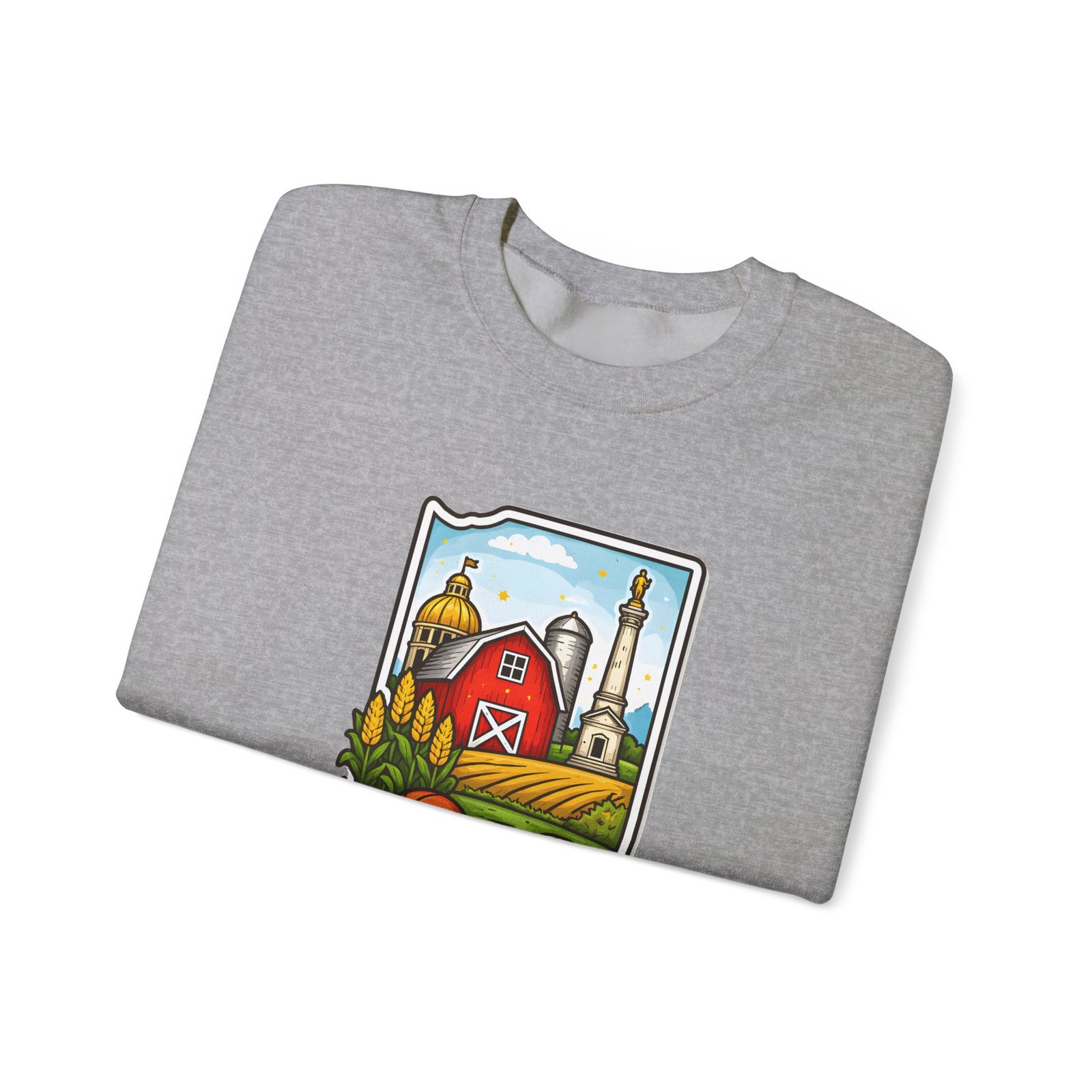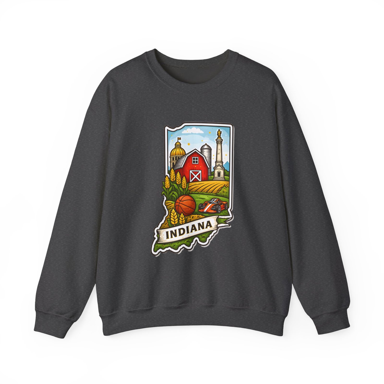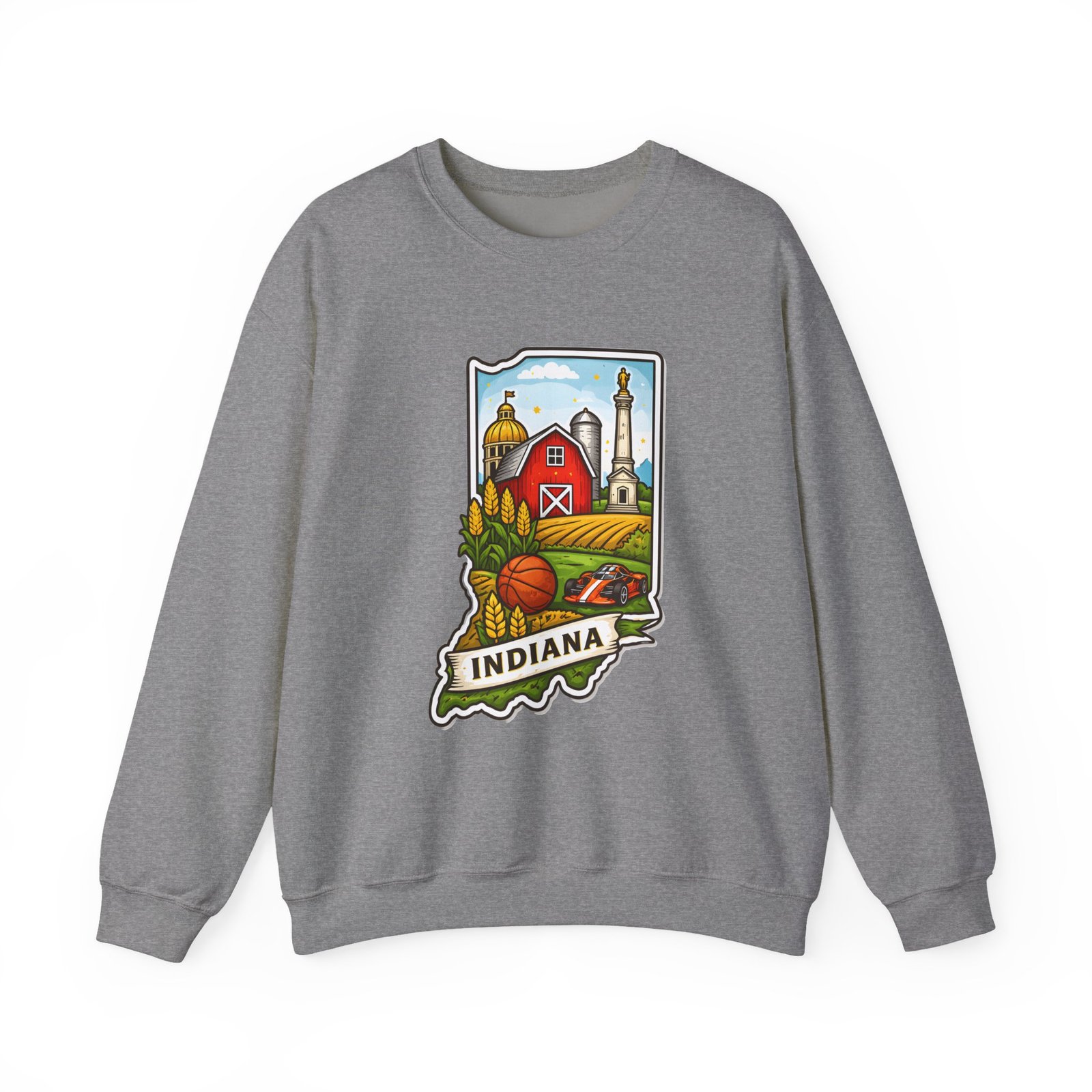 Wrap yourself in a soft, lived-in kind of comfort that feels like home. This cozy crewneck carries a warm, nostalgic illustration of Indiana — red barn, rolling fields, a church steeple, and a basketball — printed on a clean white backdrop. It sits loose but neat, the ribbed collar and double-stitched seams holding their shape through weekend errands, late-night drives, or slow mornings with coffee. Embroidery options at chest or wrists add a handcrafted touch, while tubular knit construction keeps the silhouette smooth and simple. Wear it to honor state roots, cheer on local teams, or bring a quiet piece of country calm to city life.
