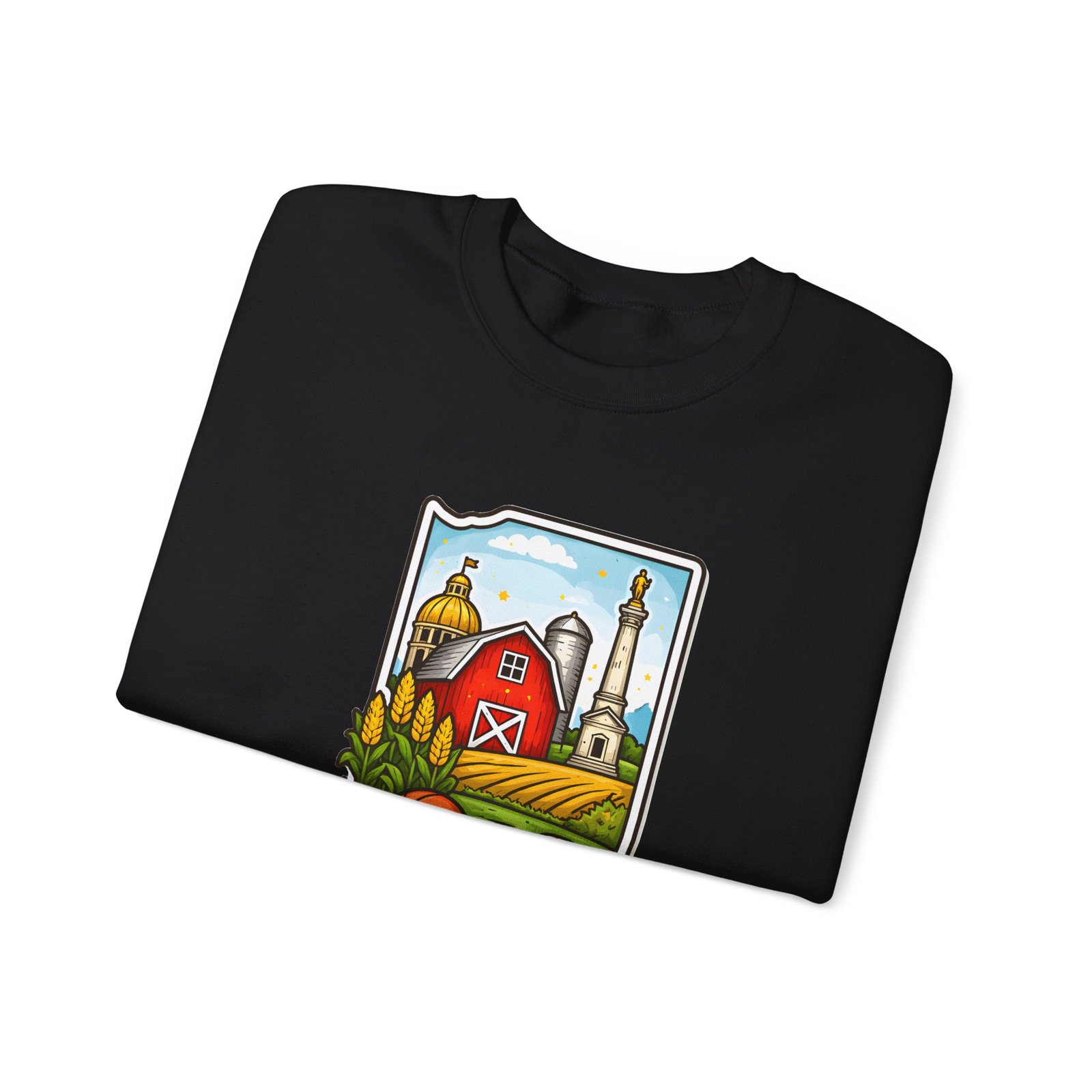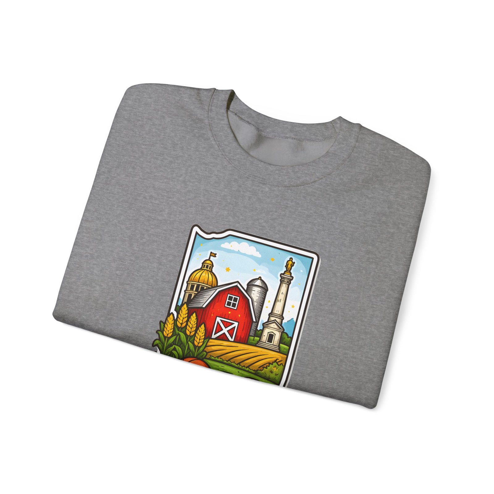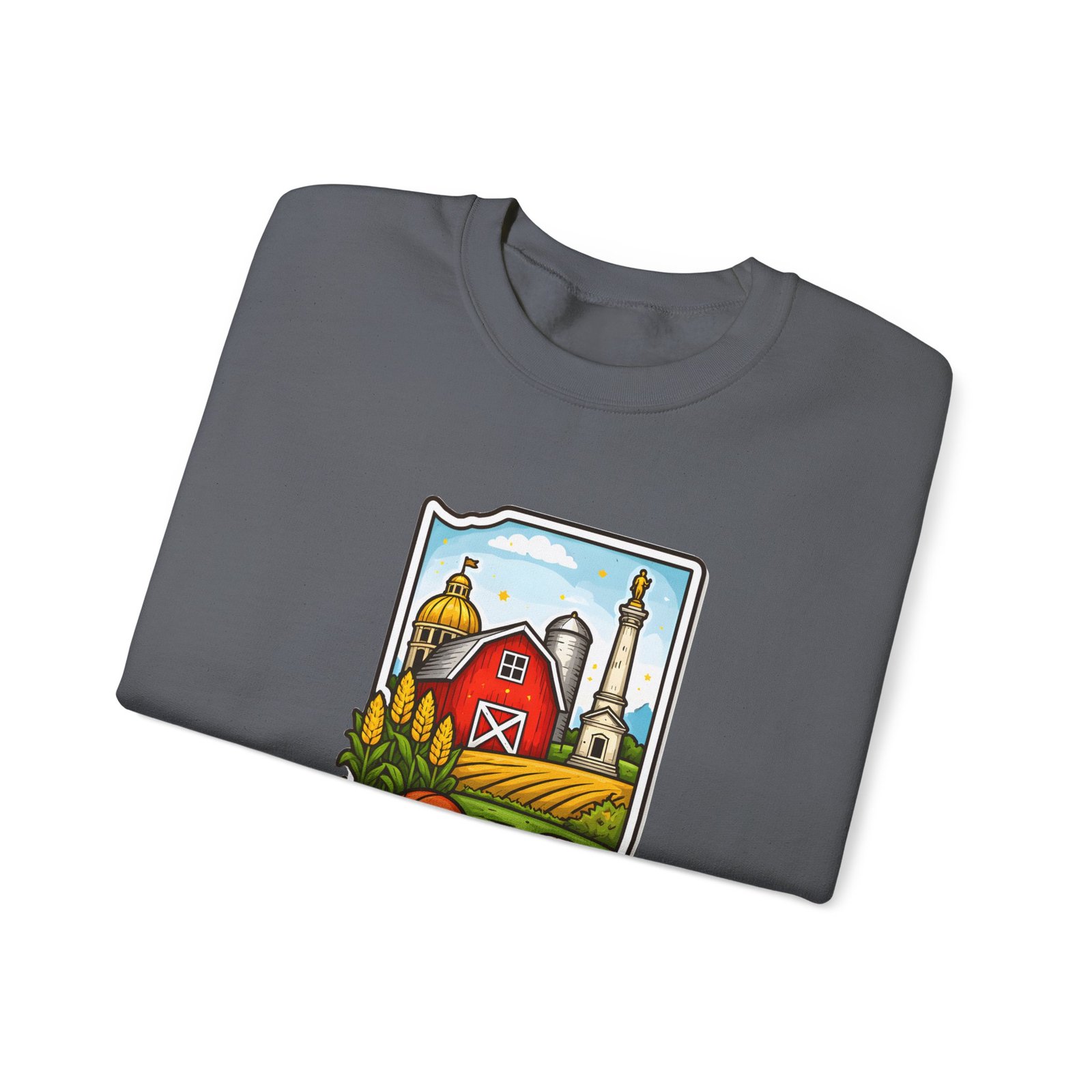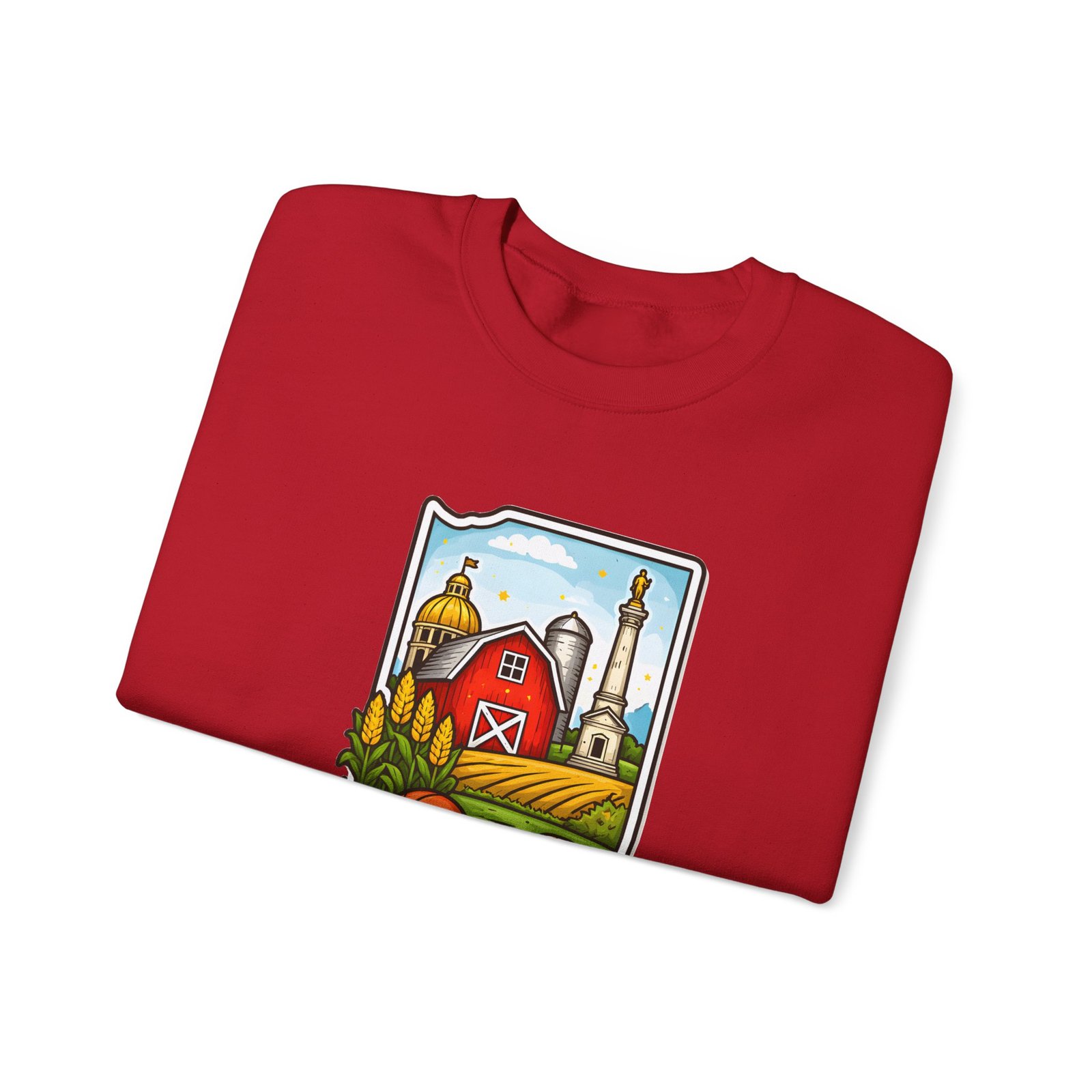 Wrap yourself in a soft, lived-in kind of comfort that feels like home. This cozy crewneck carries a warm, nostalgic illustration of Indiana — red barn, rolling fields, a church steeple, and a basketball — printed on a clean white backdrop. It sits loose but neat, the ribbed collar and double-stitched seams holding their shape through weekend errands, late-night drives, or slow mornings with coffee. Embroidery options at chest or wrists add a handcrafted touch, while tubular knit construction keeps the silhouette smooth and simple. Wear it to honor state roots, cheer on local teams, or bring a quiet piece of country calm to city life.