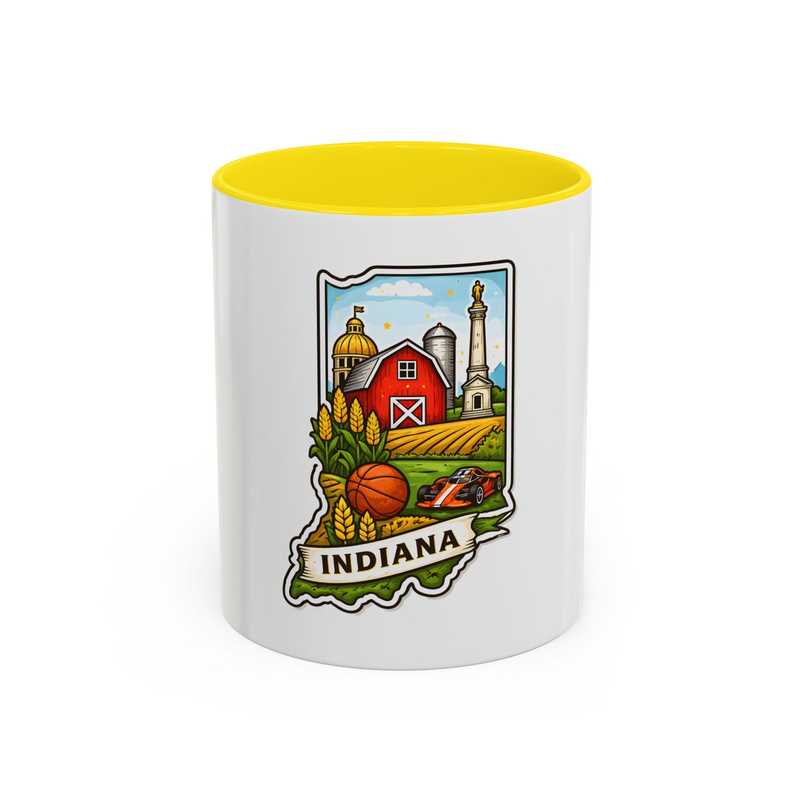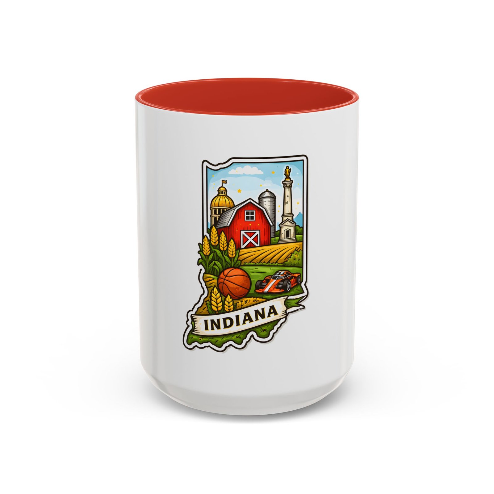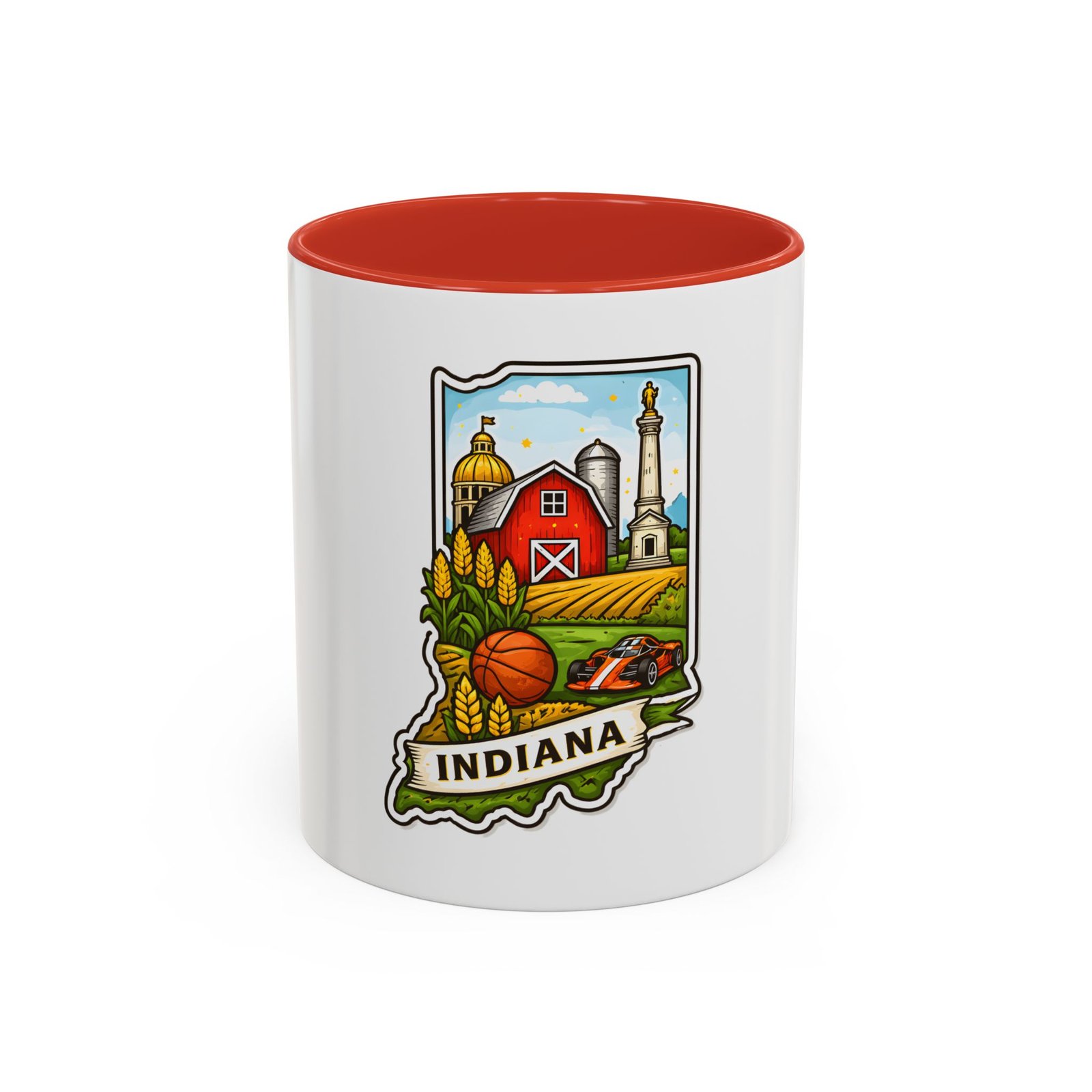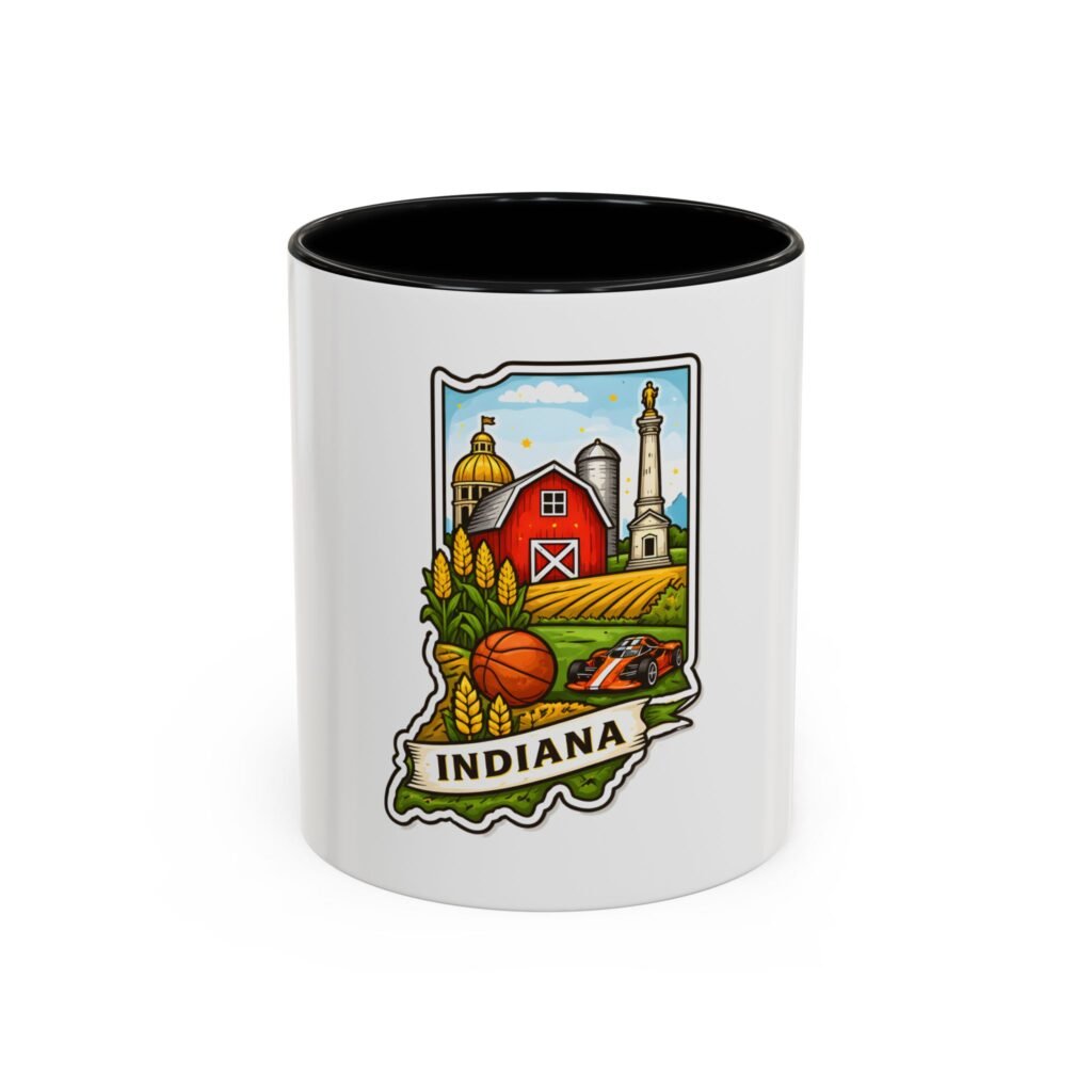 Warm mornings and slow afternoons feel more like home with this ceramic accent mug. The design frames Indiana’s heart—red barn, golden corn, a basketball, and familiar skyline silhouettes—so each sip connects to place and memory. The colored interior and handle add a lively contrast that makes the illustration pop, while the glossy finish keeps colors bright. It’s the kind of mug that sits on a desk or kitchen counter and quietly starts conversations about hometown pride, road trips, and family breakfasts.