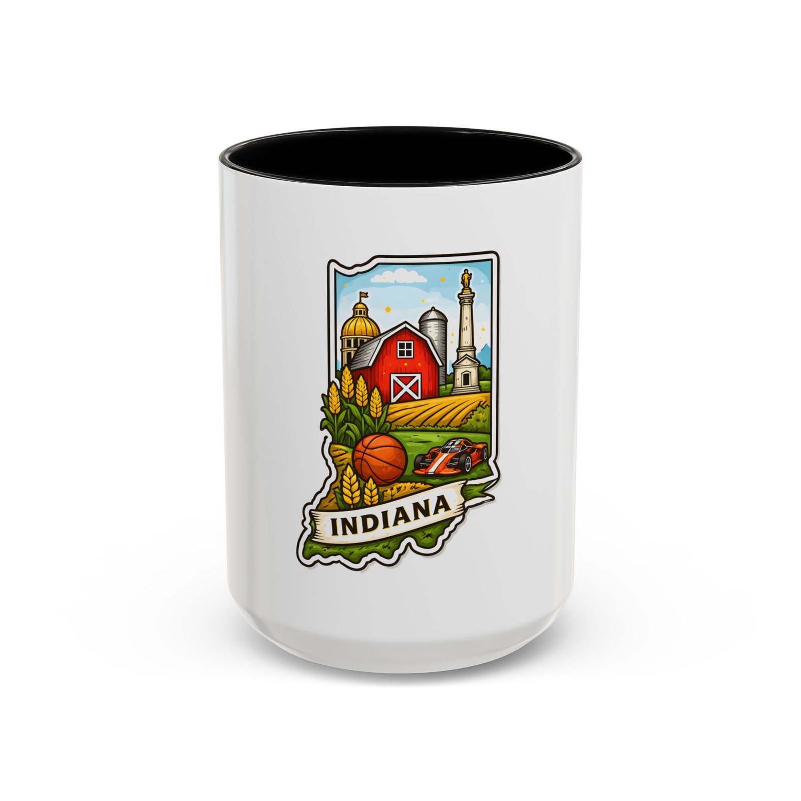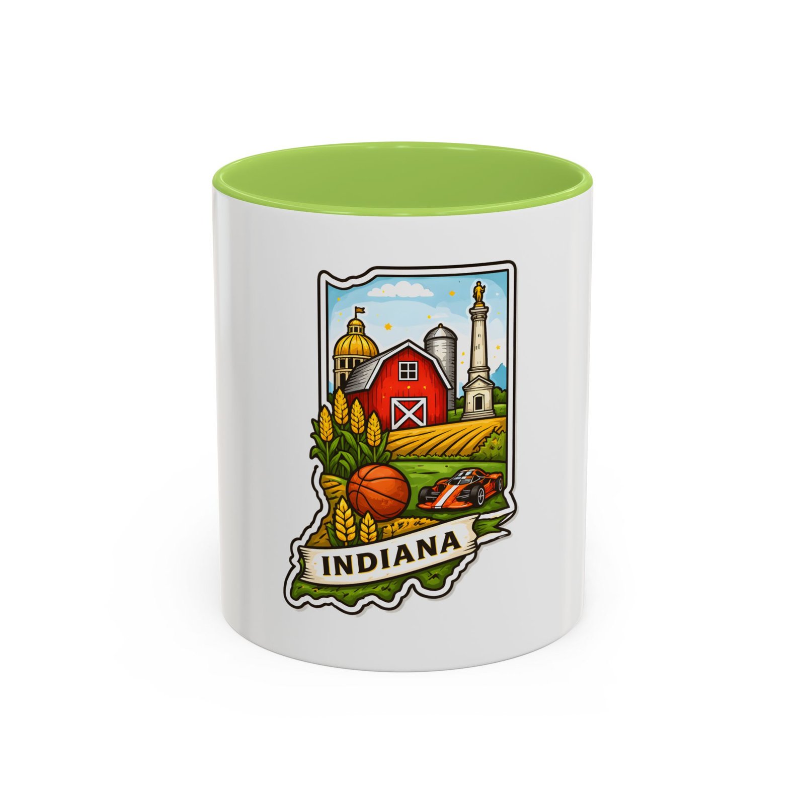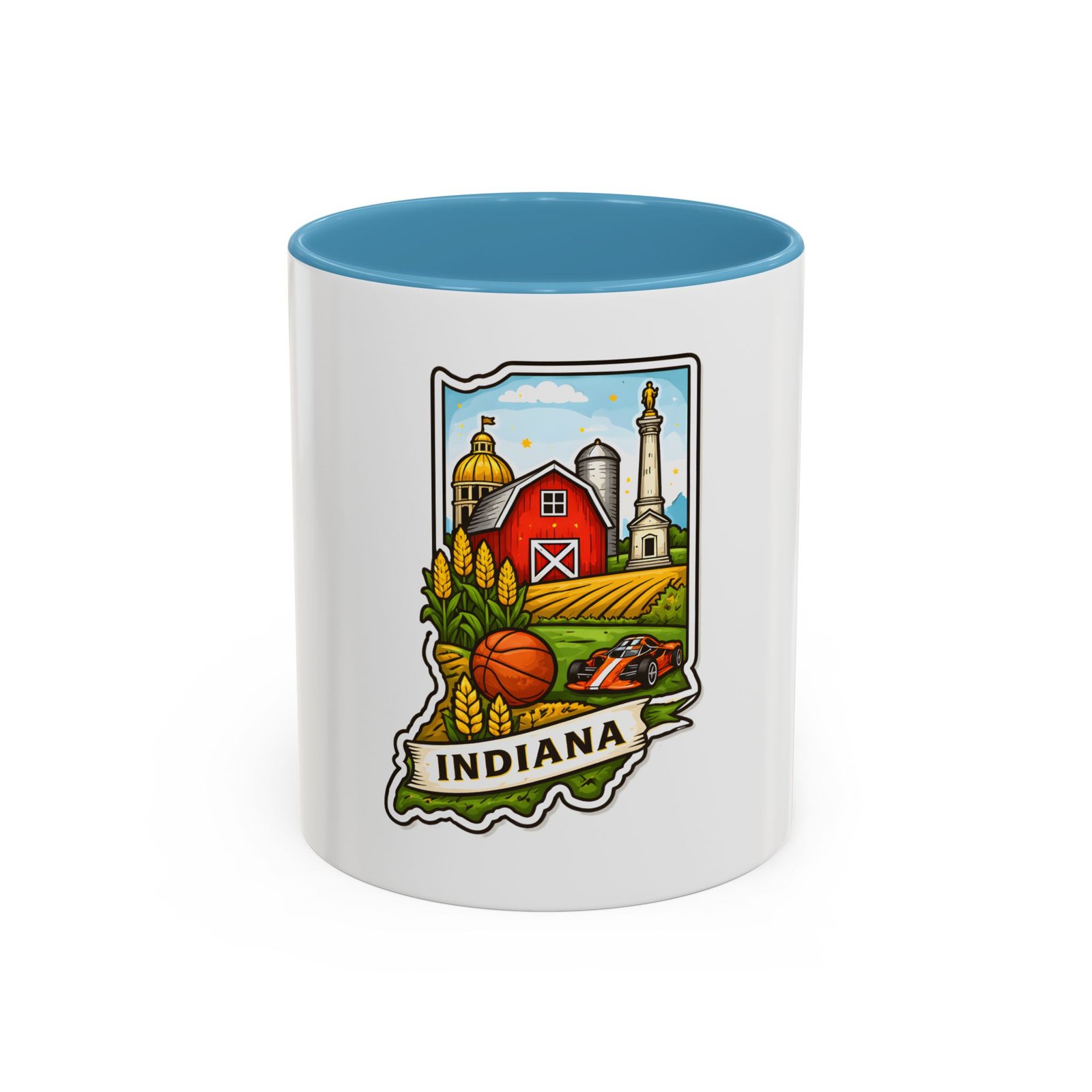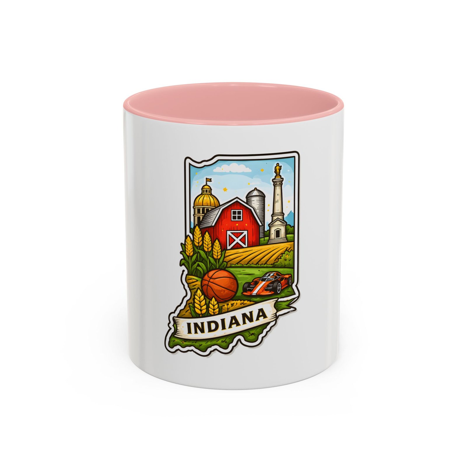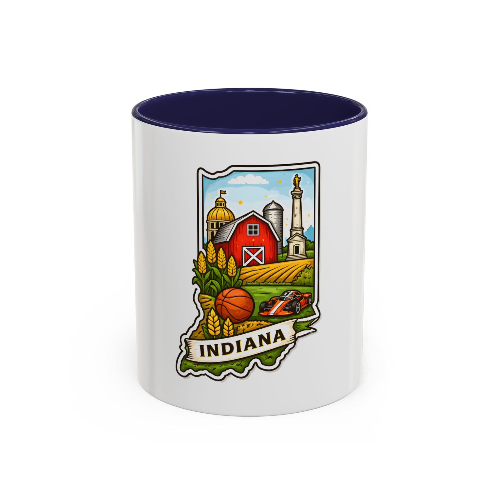 Warm mornings and slow afternoons feel more like home with this ceramic accent mug. The design frames Indiana’s heart—red barn, golden corn, a basketball, and familiar skyline silhouettes—so each sip connects to place and memory. The colored interior and handle add a lively contrast that makes the illustration pop, while the glossy finish keeps colors bright. It’s the kind of mug that sits on a desk or kitchen counter and quietly starts conversations about hometown pride, road trips, and family breakfasts.
