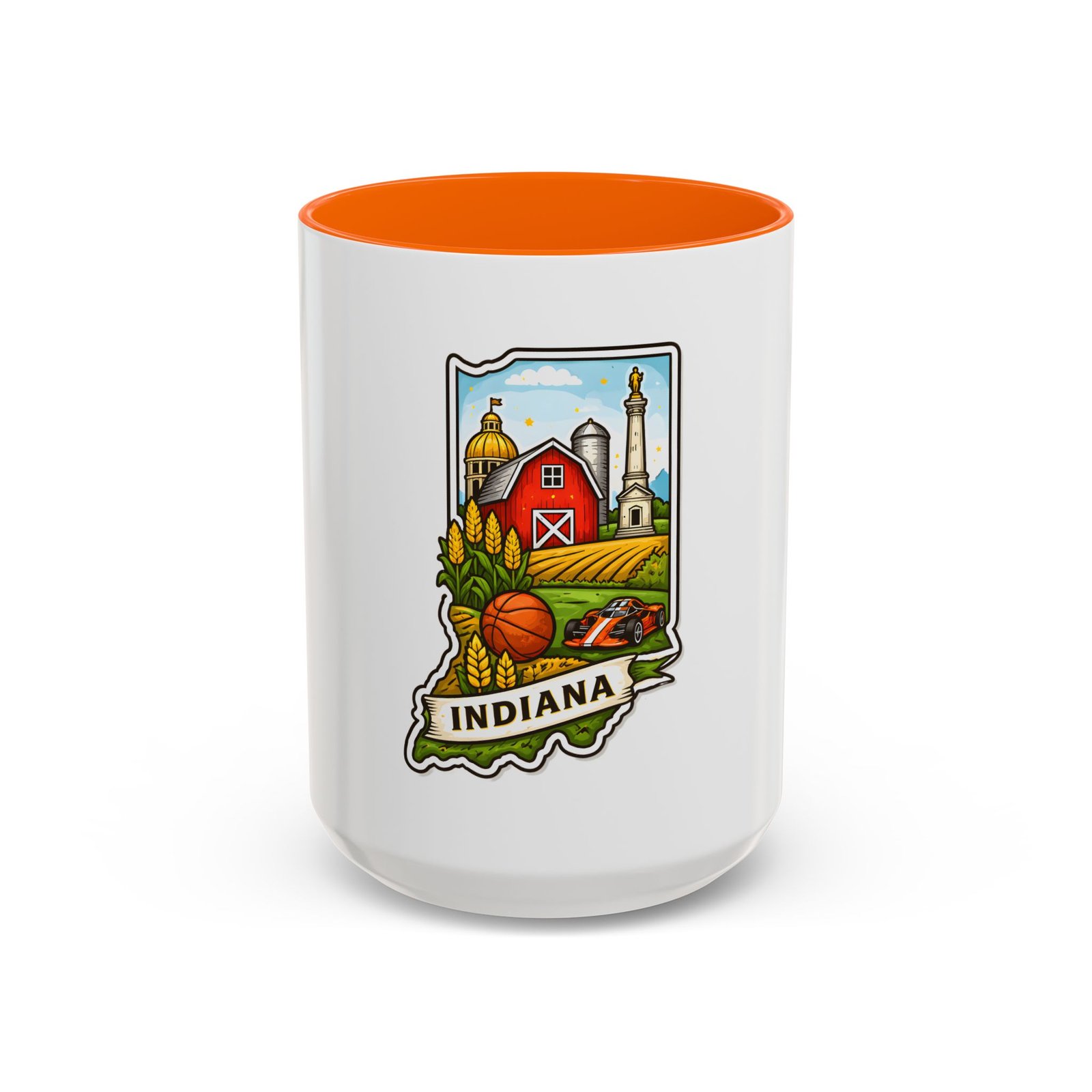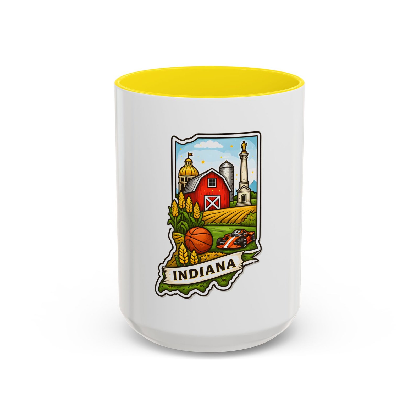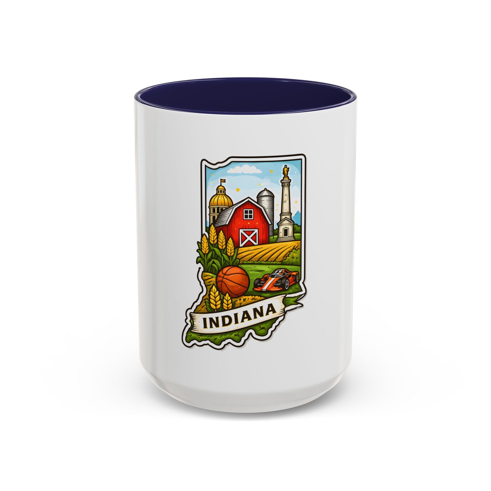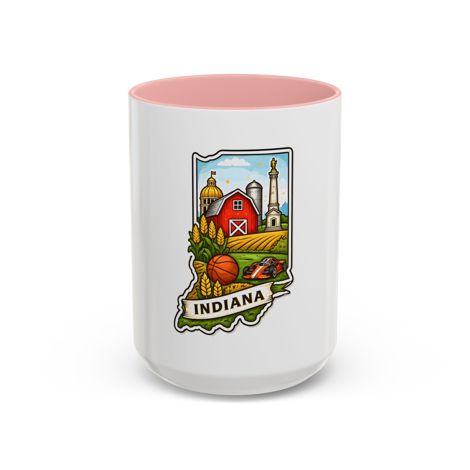Warm mornings and slow afternoons feel more like home with this ceramic accent mug. The design frames Indiana’s heart—red barn, golden corn, a basketball, and familiar skyline silhouettes—so each sip connects to place and memory. The colored interior and handle add a lively contrast that makes the illustration pop, while the glossy finish keeps colors bright. It’s the kind of mug that sits on a desk or kitchen counter and quietly starts conversations about hometown pride, road trips, and family breakfasts.