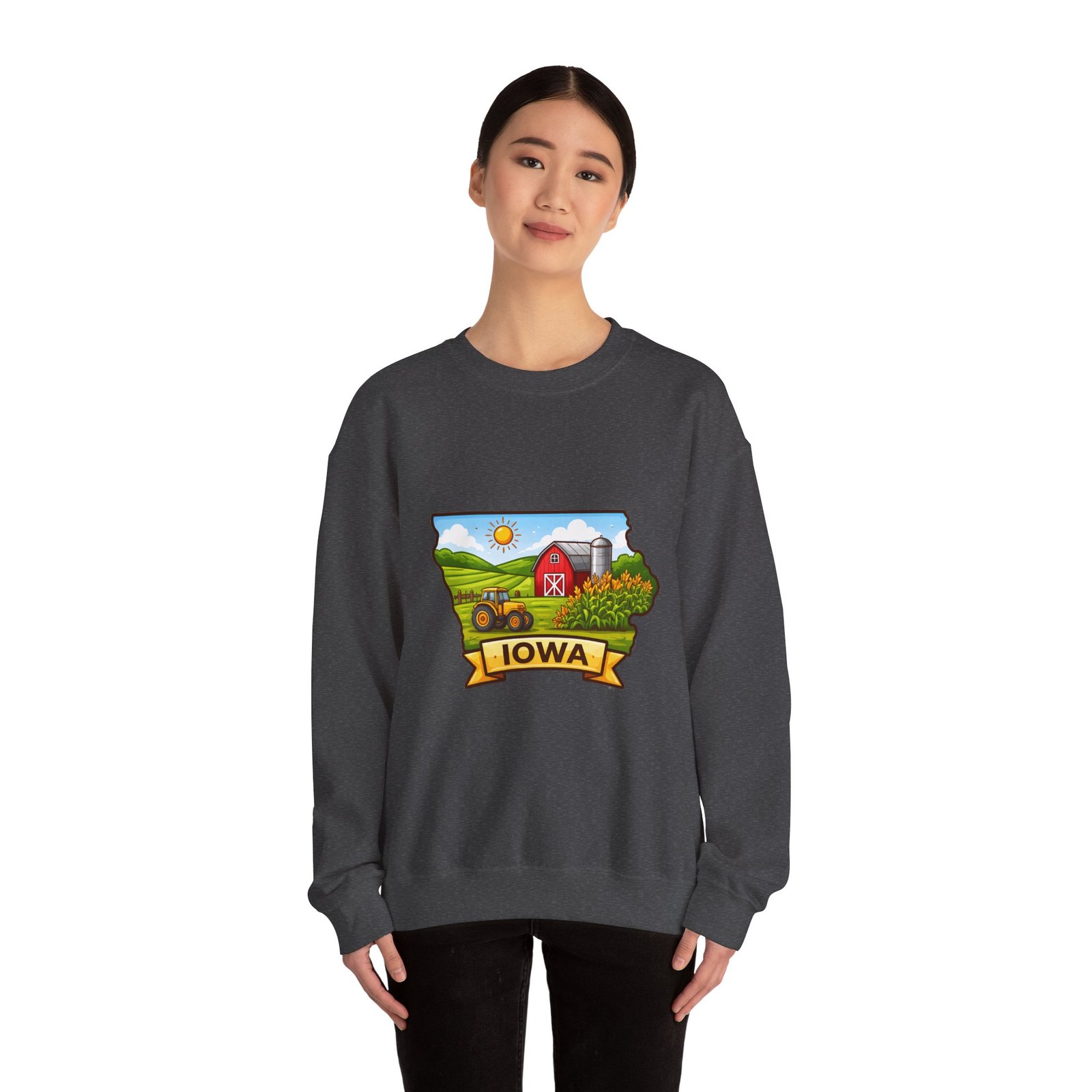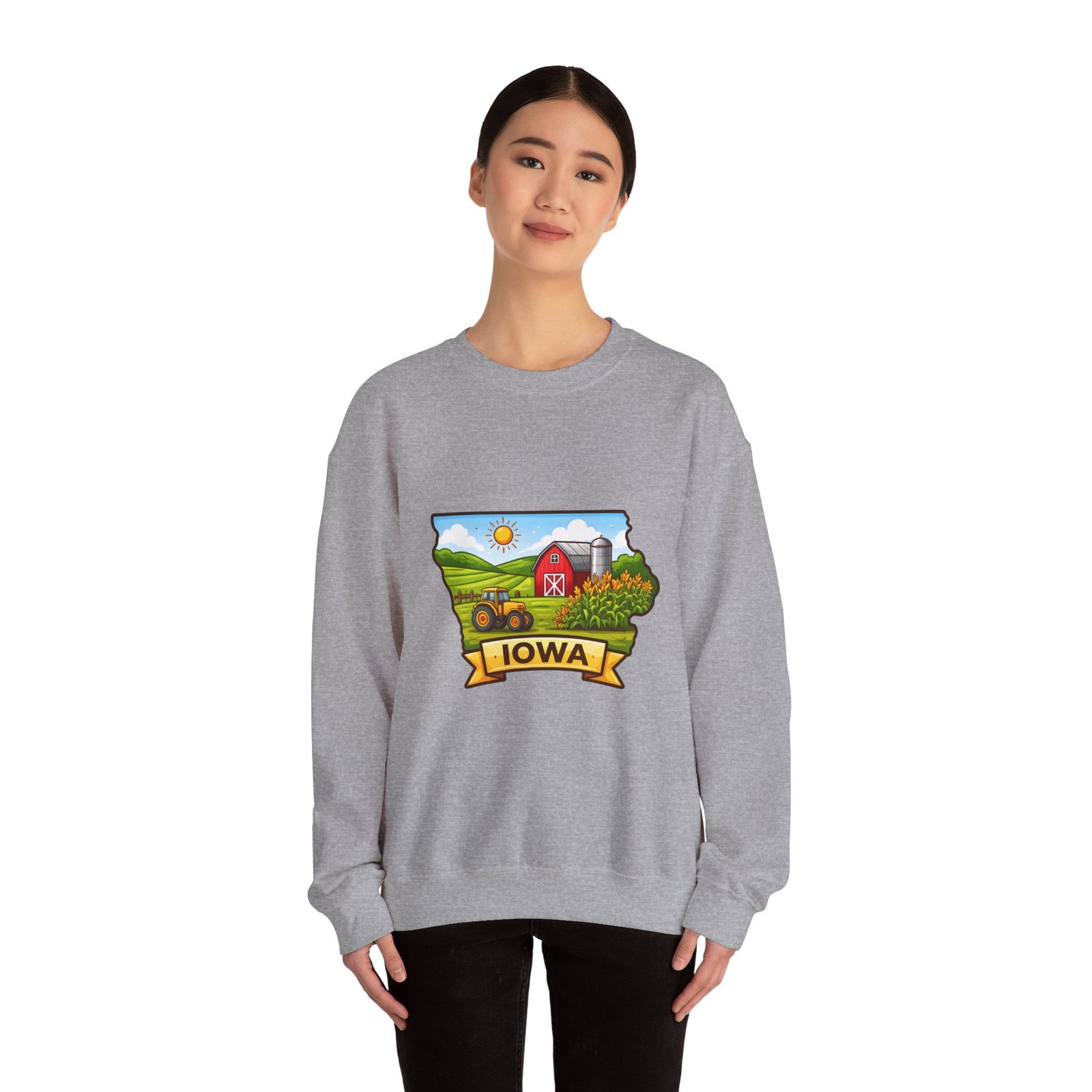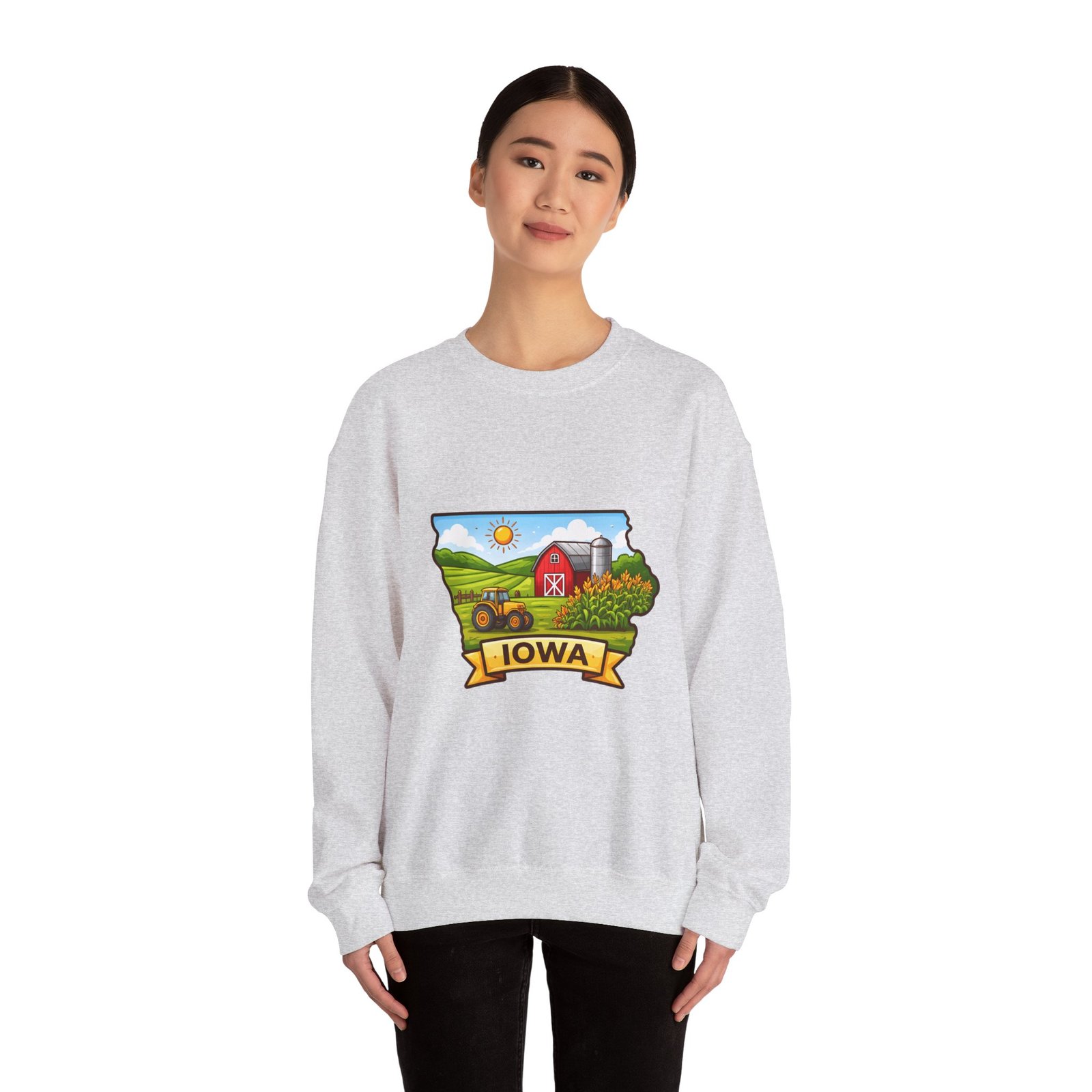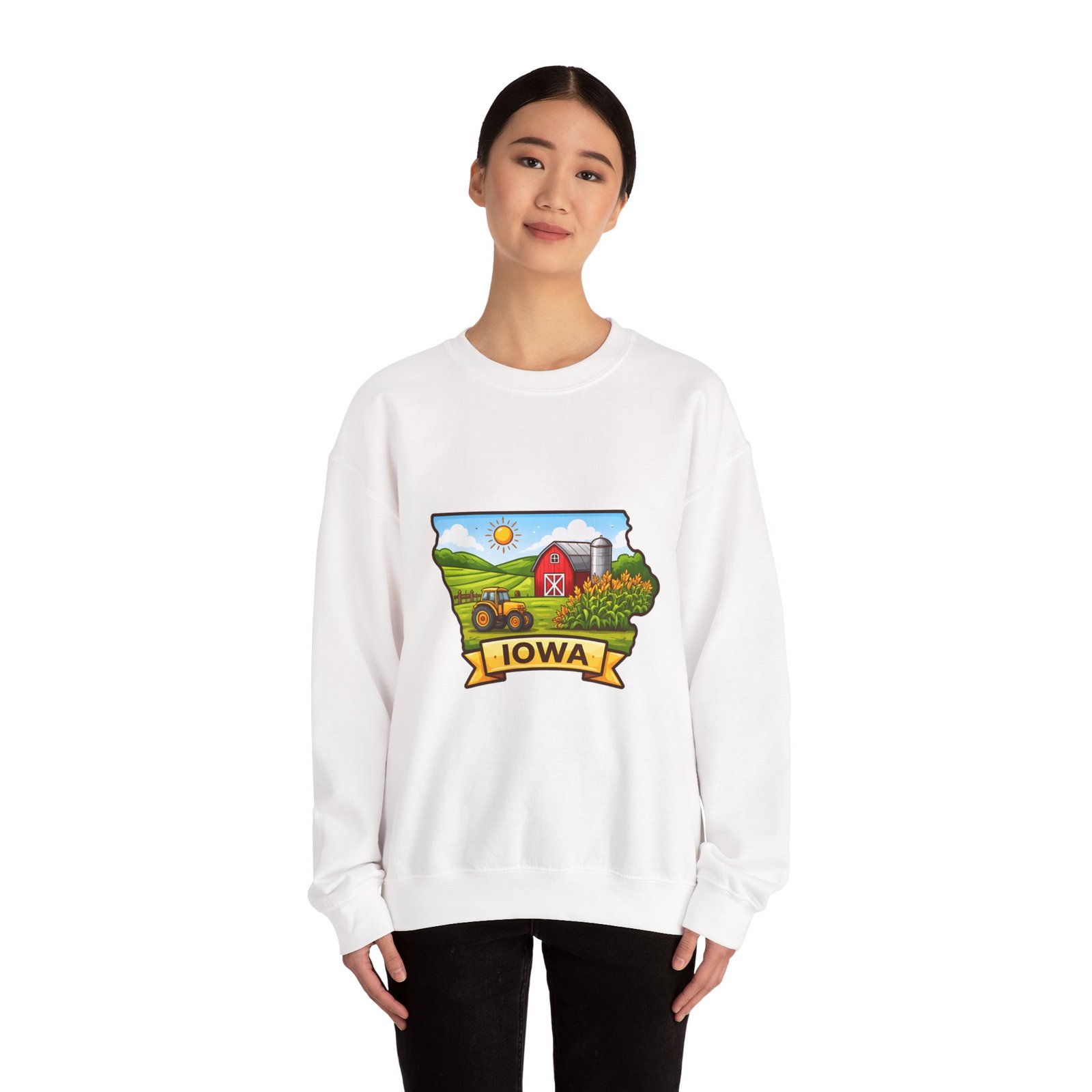 Soft, roomy, and built to last — this crewneck brings a quiet slice of Iowa country right into your everyday rotation. The hand-drawn farm scene sits bright against a clean white backdrop: a red barn, rolling green fields, a silo, and a ribbon banner reading “IOWA.” It feels like a slow Sunday morning on the family farm — warm sun, tractor hum in the distance, and the kind of comfort only familiar places give. Wear it on cool mornings while running errands, at local fairs, or curled up with a mug after a long day in the fields. The breathable cotton-poly blend, ribbed collar, and durable double-needle stitching mean it stays cozy and soft through seasons of wash and wear.