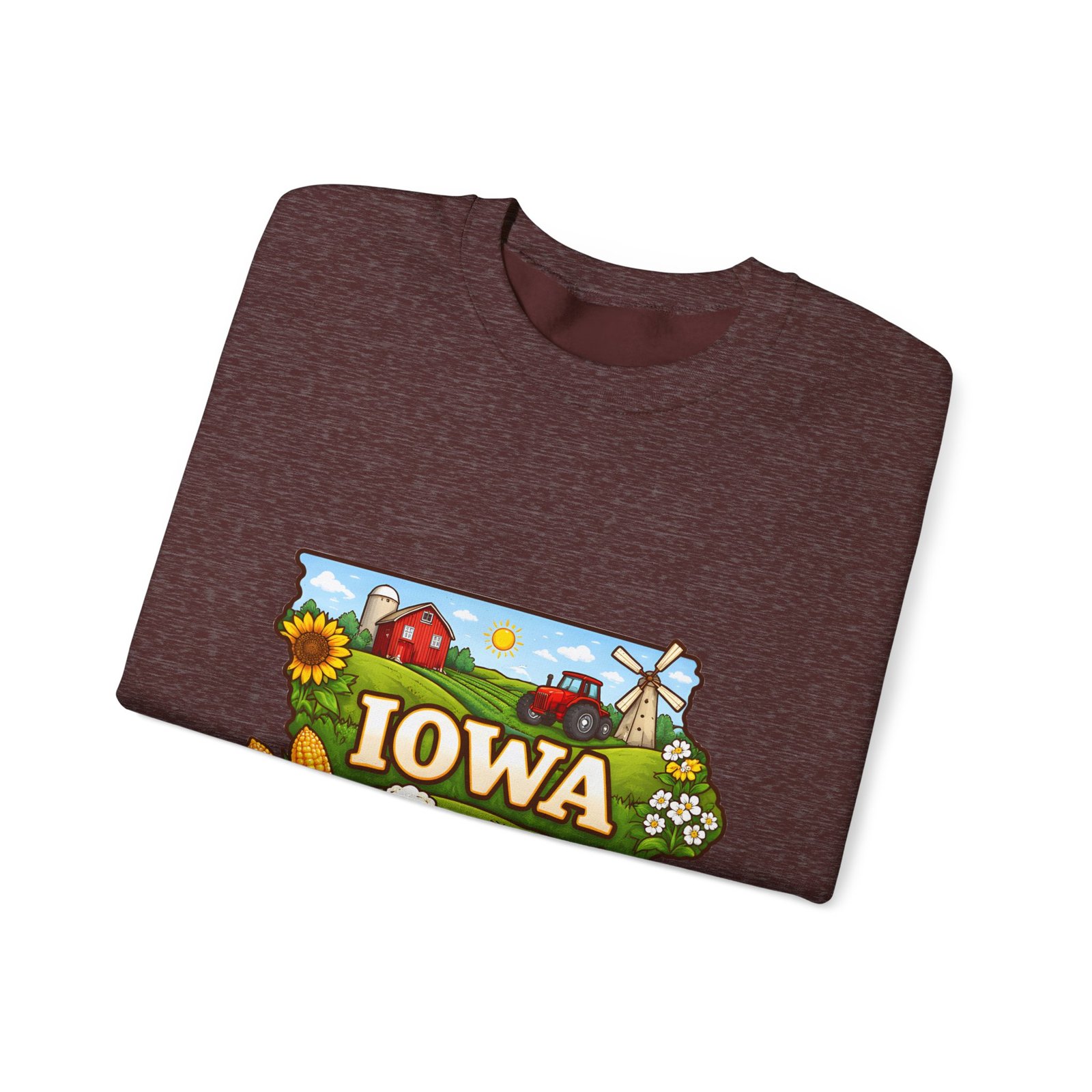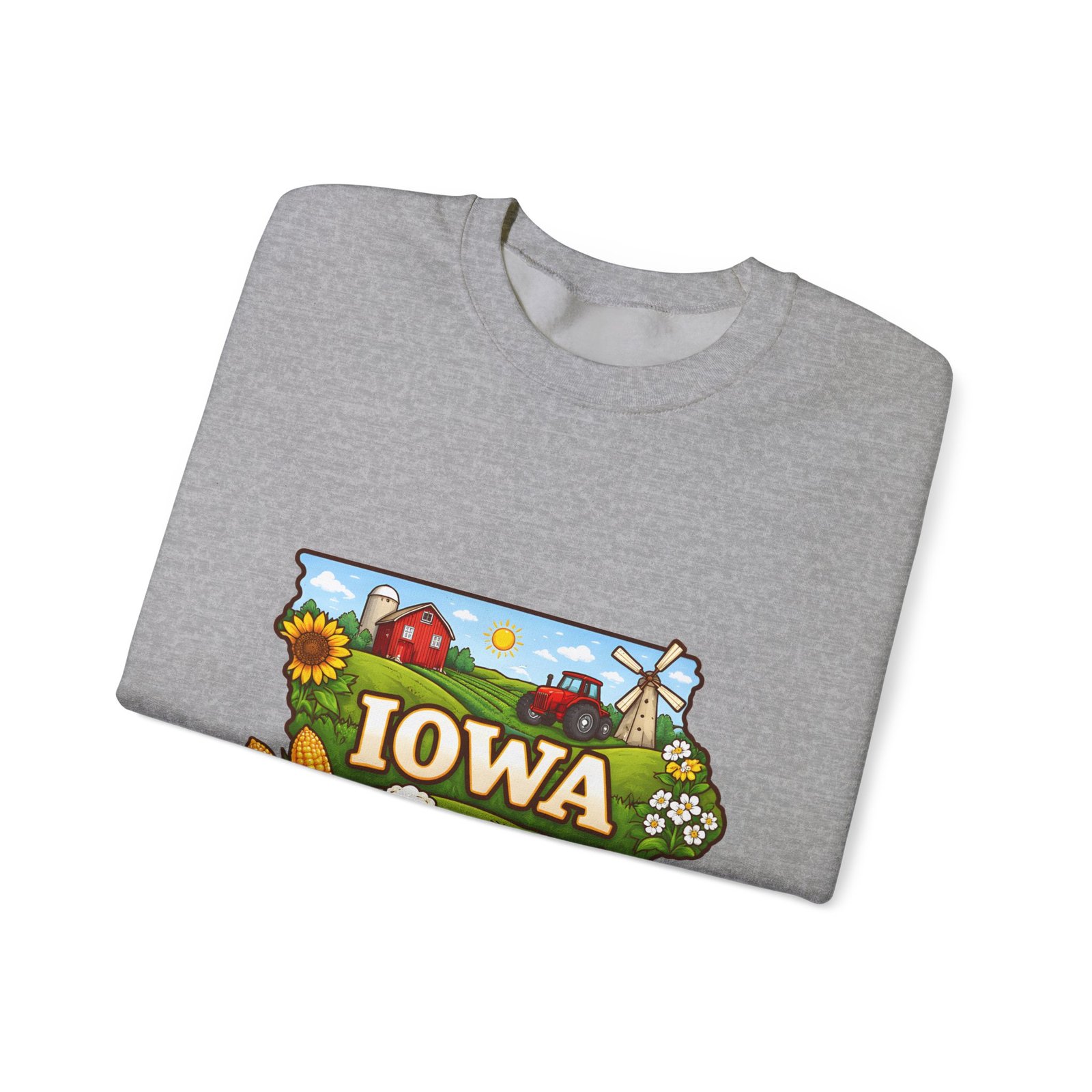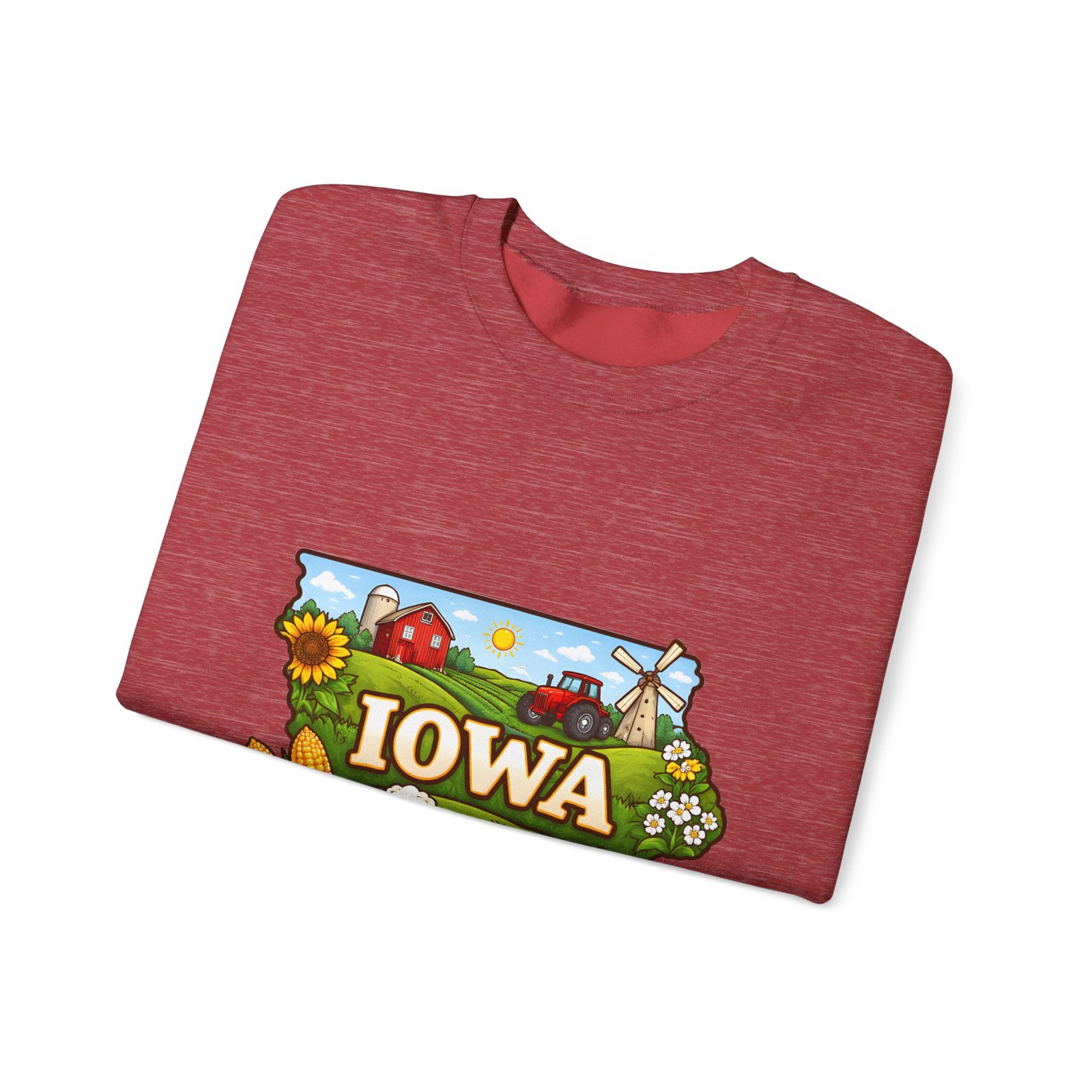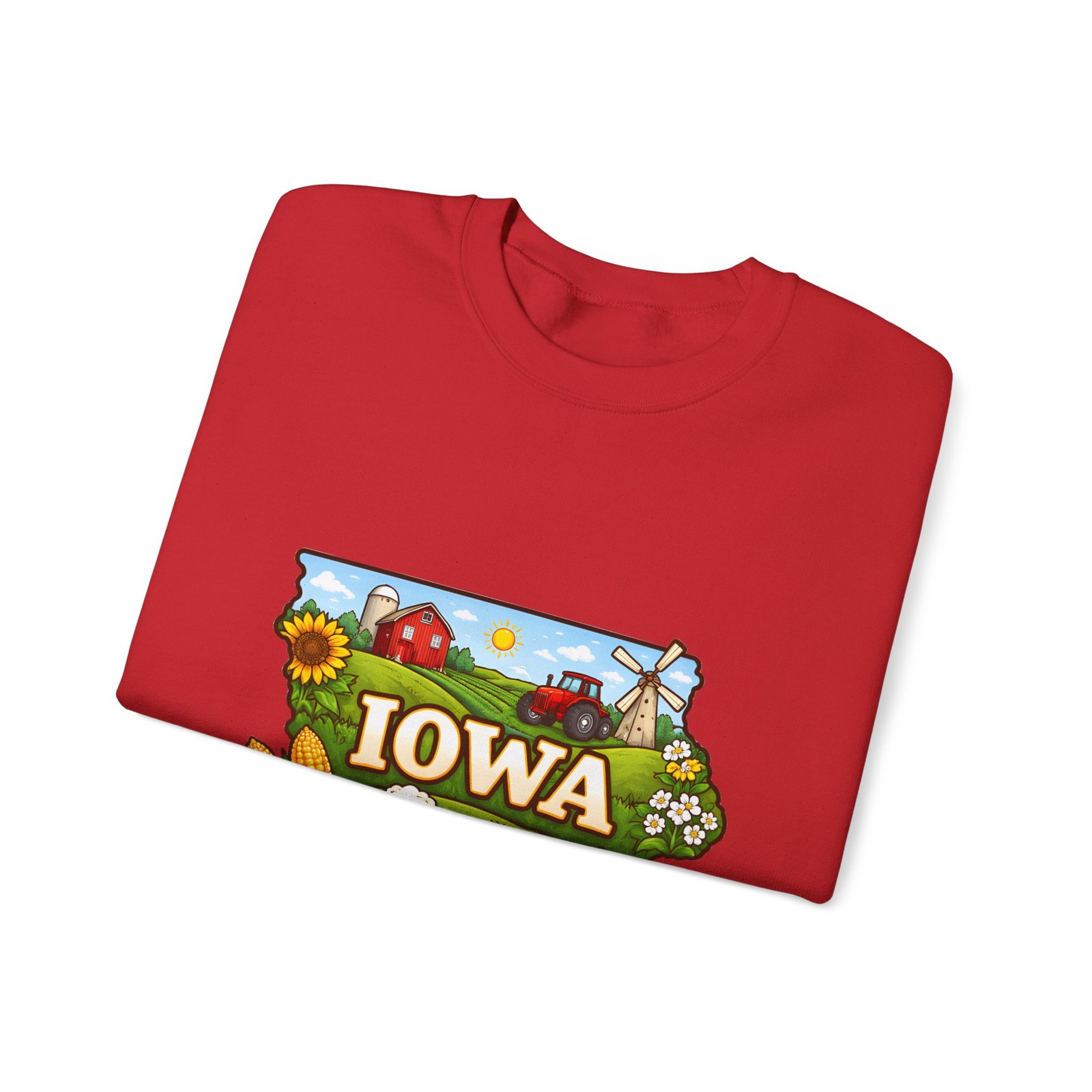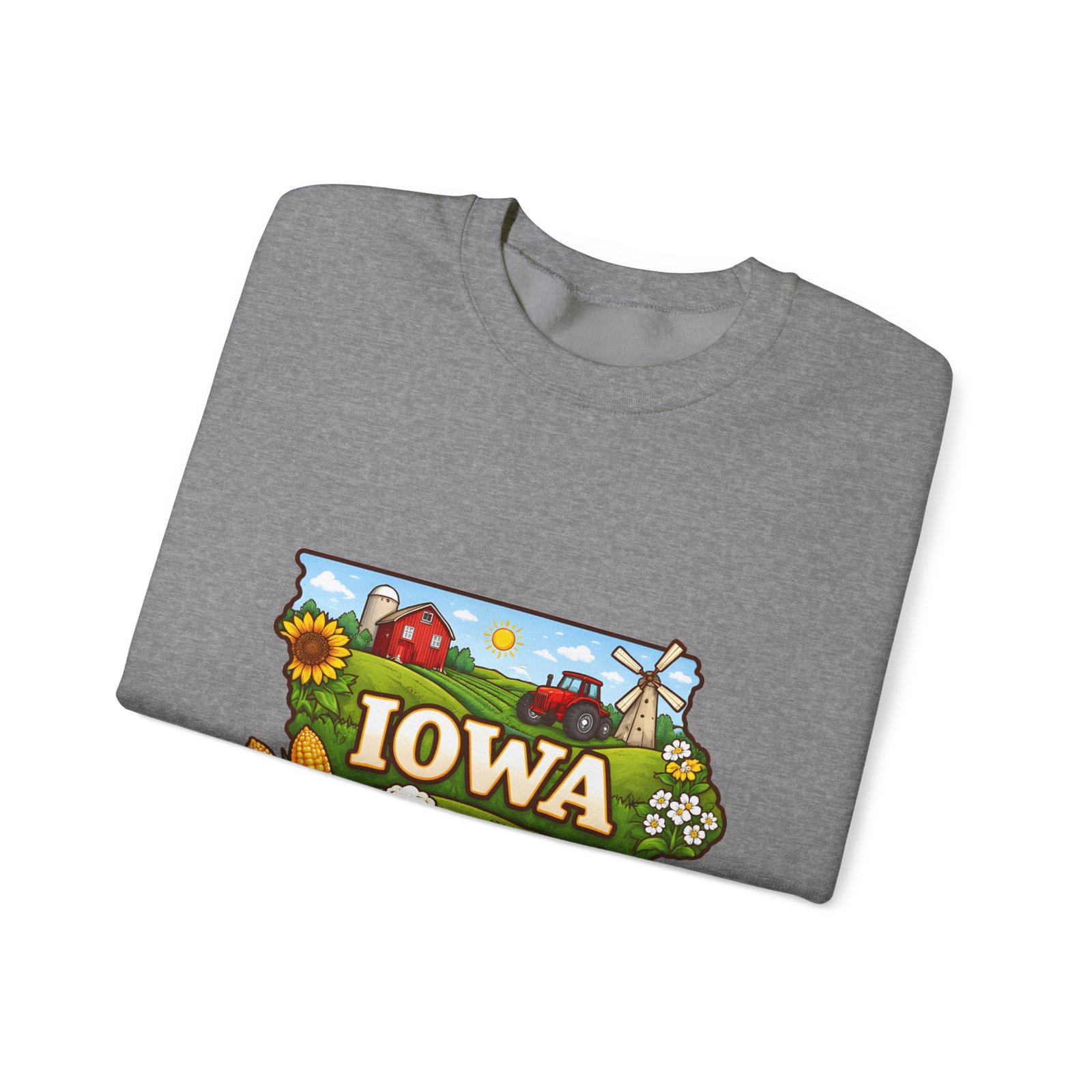 This cozy crewneck celebrates Iowa with a warm, homegrown illustration stitched into the front — barns, corn, a windmill, and friendly farm icons come together in a cheerful map-shaped design. The midweight 50/50 cotton-poly blend feels soft against the skin while the ribbed collar and double-needle stitching keep the silhouette neat wash after wash. Wear it on cool mornings watching the sunrise over the fields, at local fairs, or while showing state pride on casual days out. The embroidered options and printed wrist details add a handcrafted touch that reads like a quiet nod to small-town life and honest, agrarian roots.