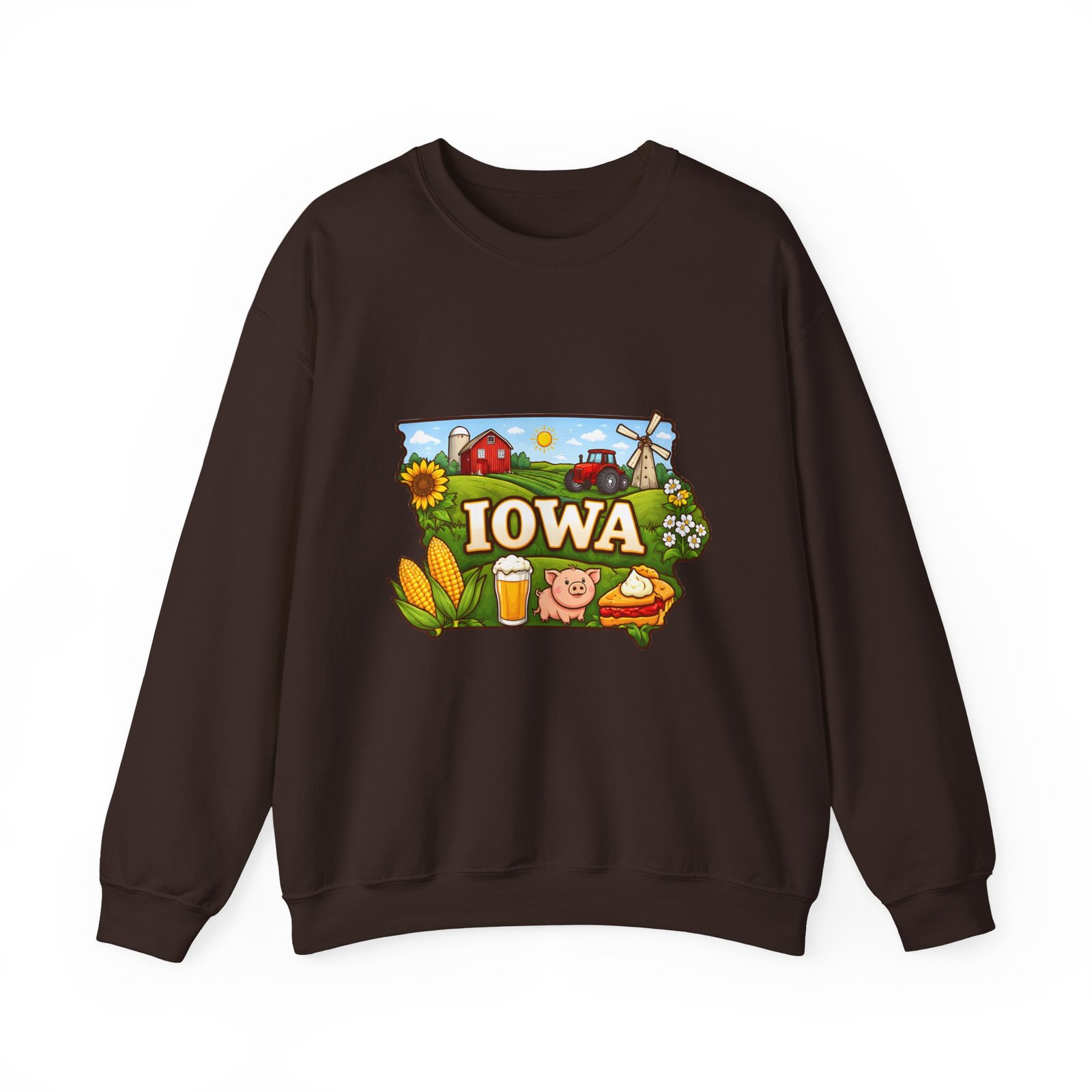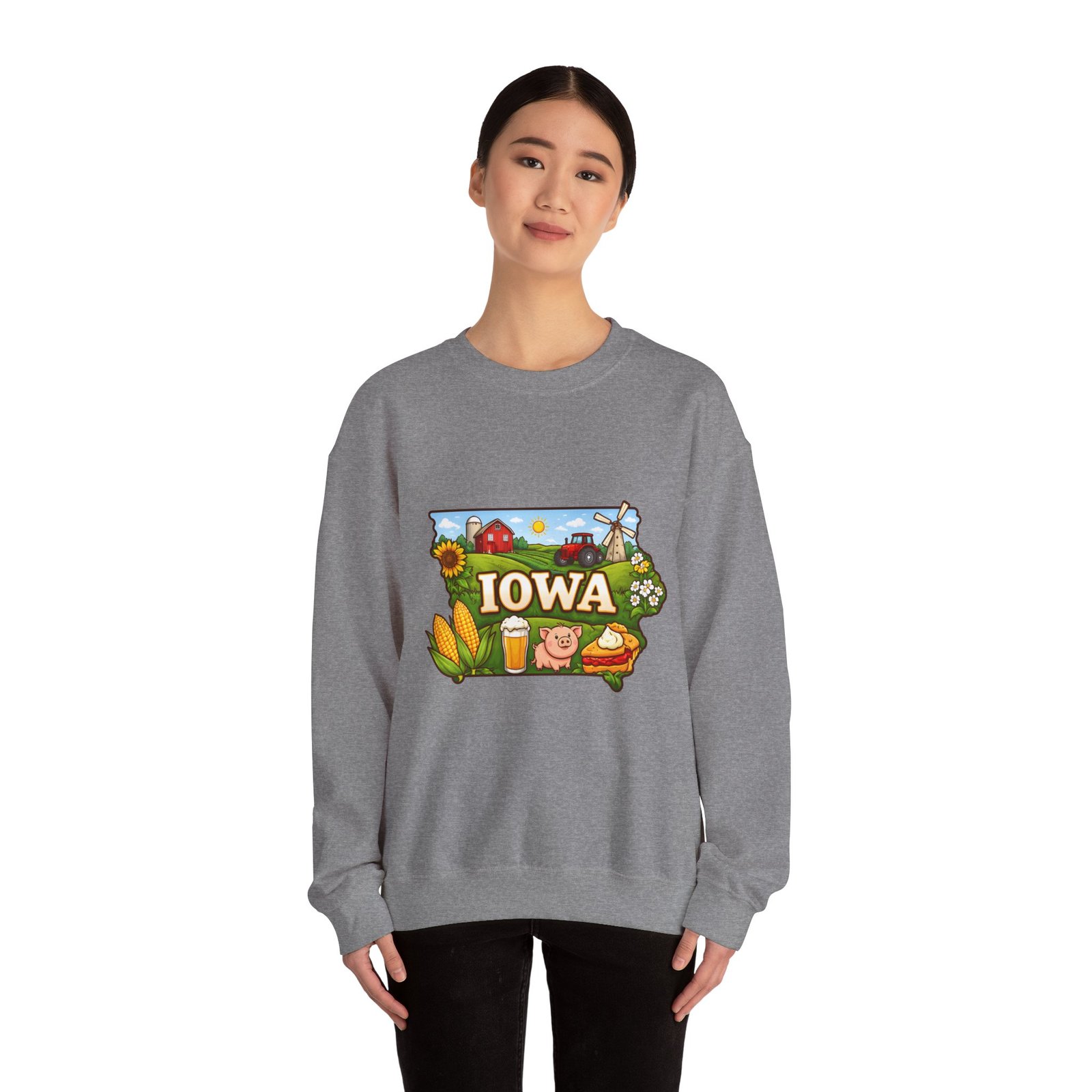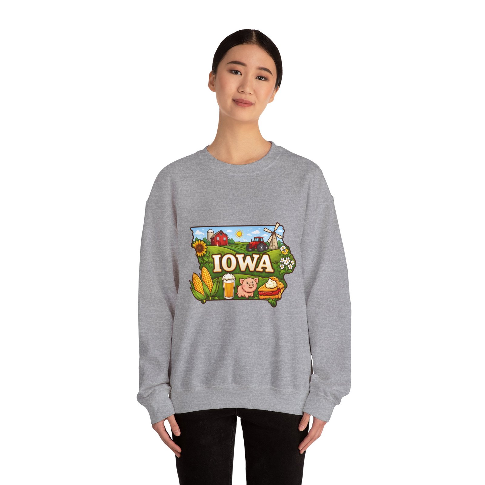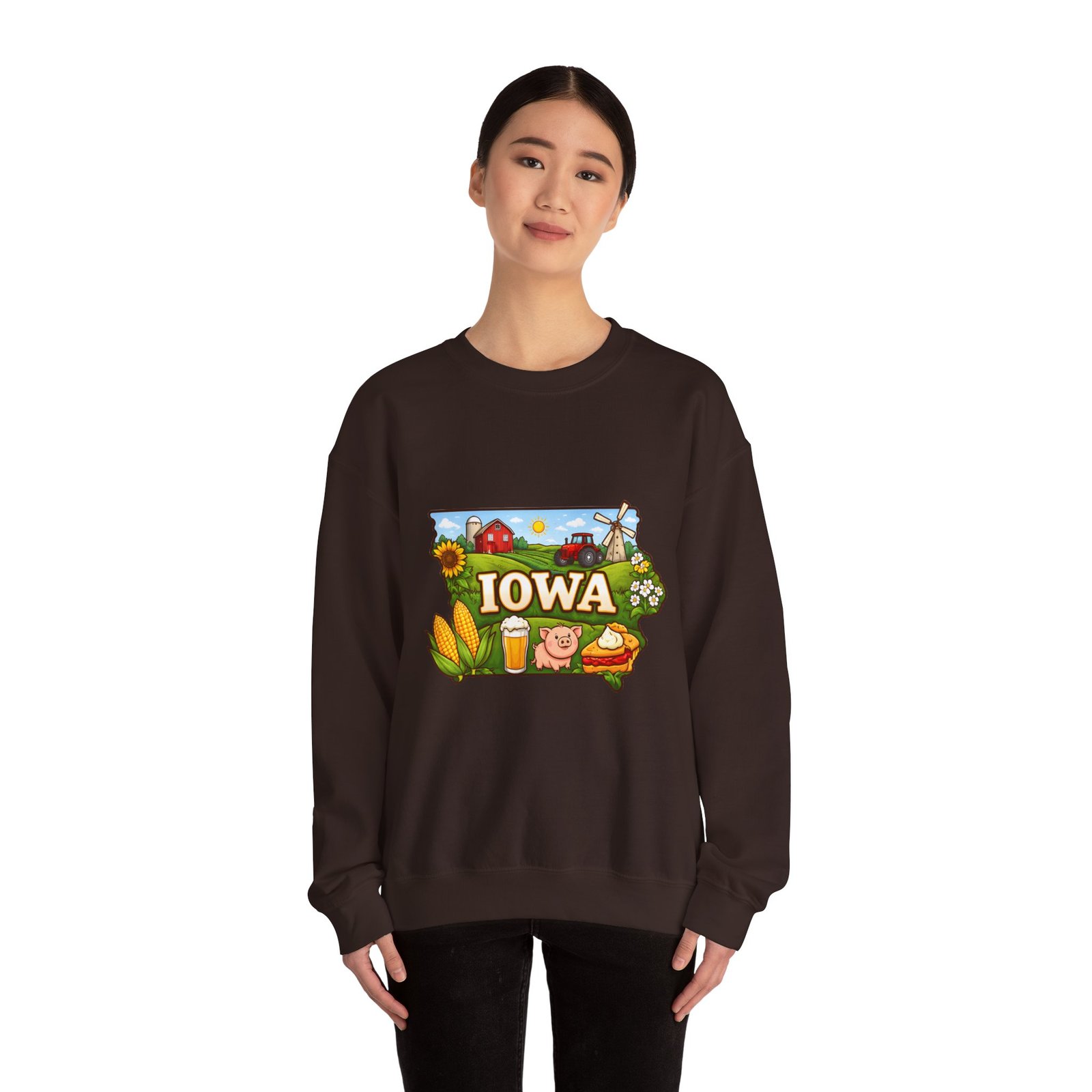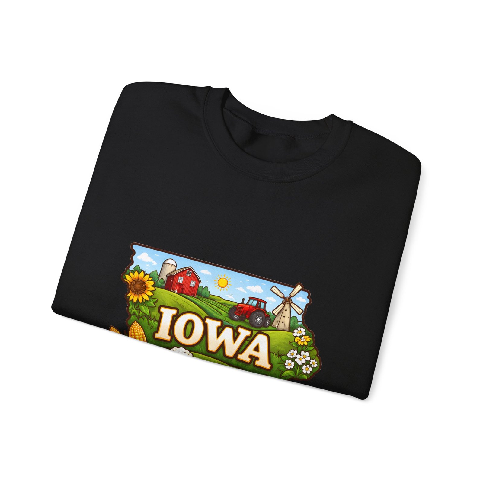 This cozy crewneck celebrates Iowa with a warm, homegrown illustration stitched into the front — barns, corn, a windmill, and friendly farm icons come together in a cheerful map-shaped design. The midweight 50/50 cotton-poly blend feels soft against the skin while the ribbed collar and double-needle stitching keep the silhouette neat wash after wash. Wear it on cool mornings watching the sunrise over the fields, at local fairs, or while showing state pride on casual days out. The embroidered options and printed wrist details add a handcrafted touch that reads like a quiet nod to small-town life and honest, agrarian roots.